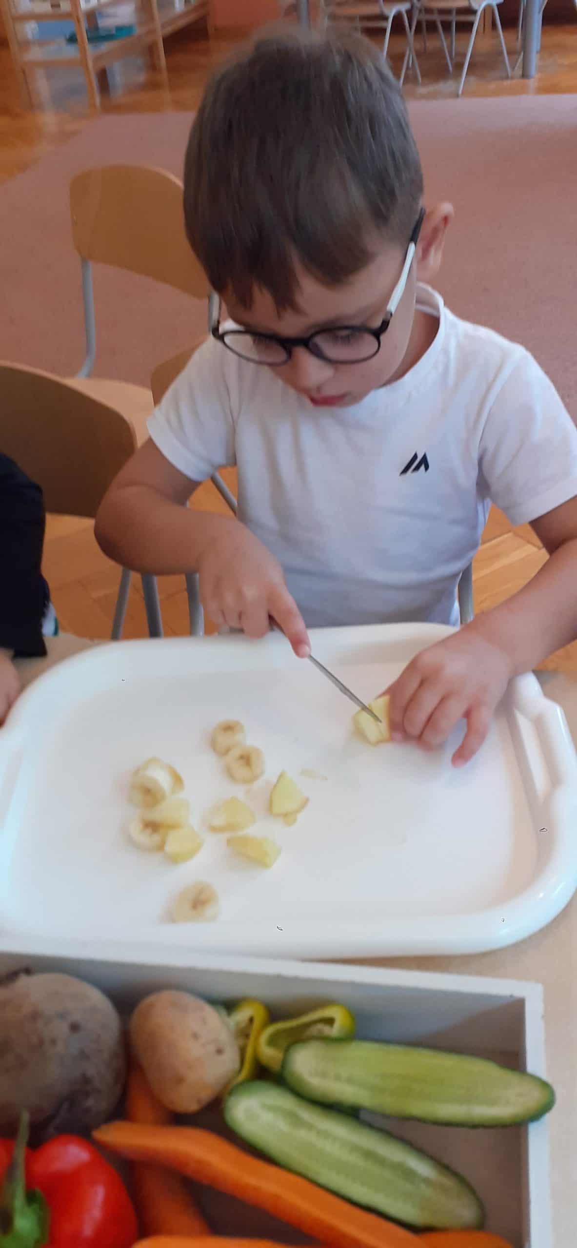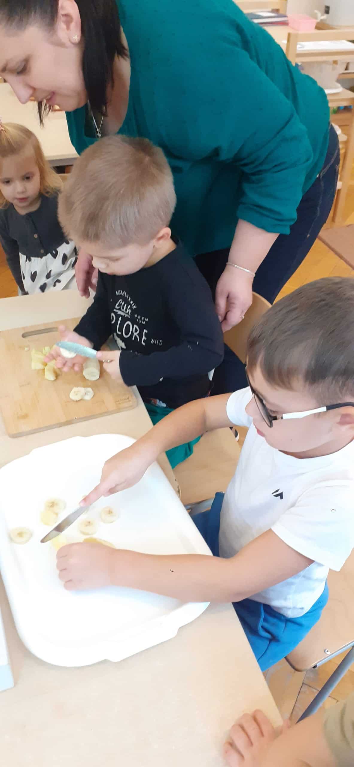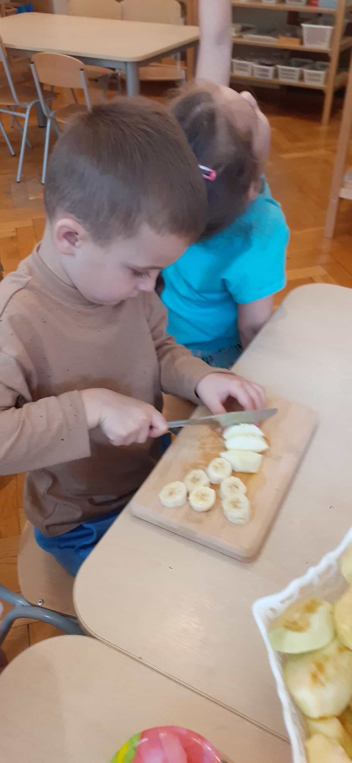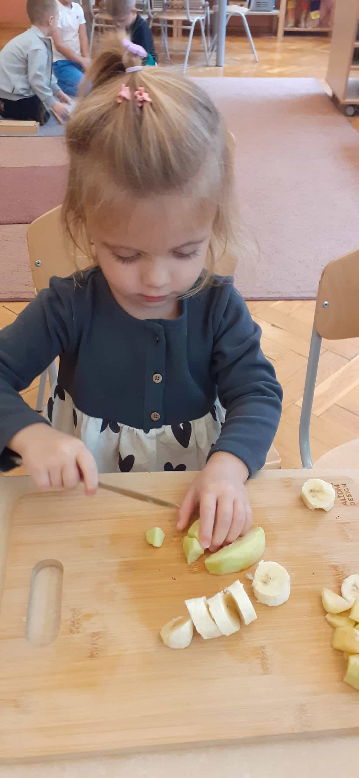 Dzieci z grupy Pomarańczowej z ochotą przystąpiły do wykonania szaszłyków owocowych i soku warzywno – owocowego. Było to podsumowanie wiedzy o darach jesieni pochodzących z sadu i ogrodu warzywnego. Organizowano zróżnicowane sytuacje edukacyjne służące poznaniu roli pestek w owocach i warzywach, poznaniu cyklu produkcyjnego soku i dżemu. Mając pewne doświadczenia dotyczące wzrostu roślin dzieci wskazywały, które dary jesieni rosną na drzewie, na krzewie, nad ziemią i pod ziemią, wskazywały również cześć nadziemną i podziemną. Nie mogło zabraknąć wiedzy na temat wartości odżywczych owoców i warzyw – stąd dzieci podjęły czynności związane z wykonaniem soku owocowo- warzywnego oraz owocowych szaszłyków. Przy okazji doskonaliły czynności dnia codziennego – umiejętność krojenia owoców i warzyw.