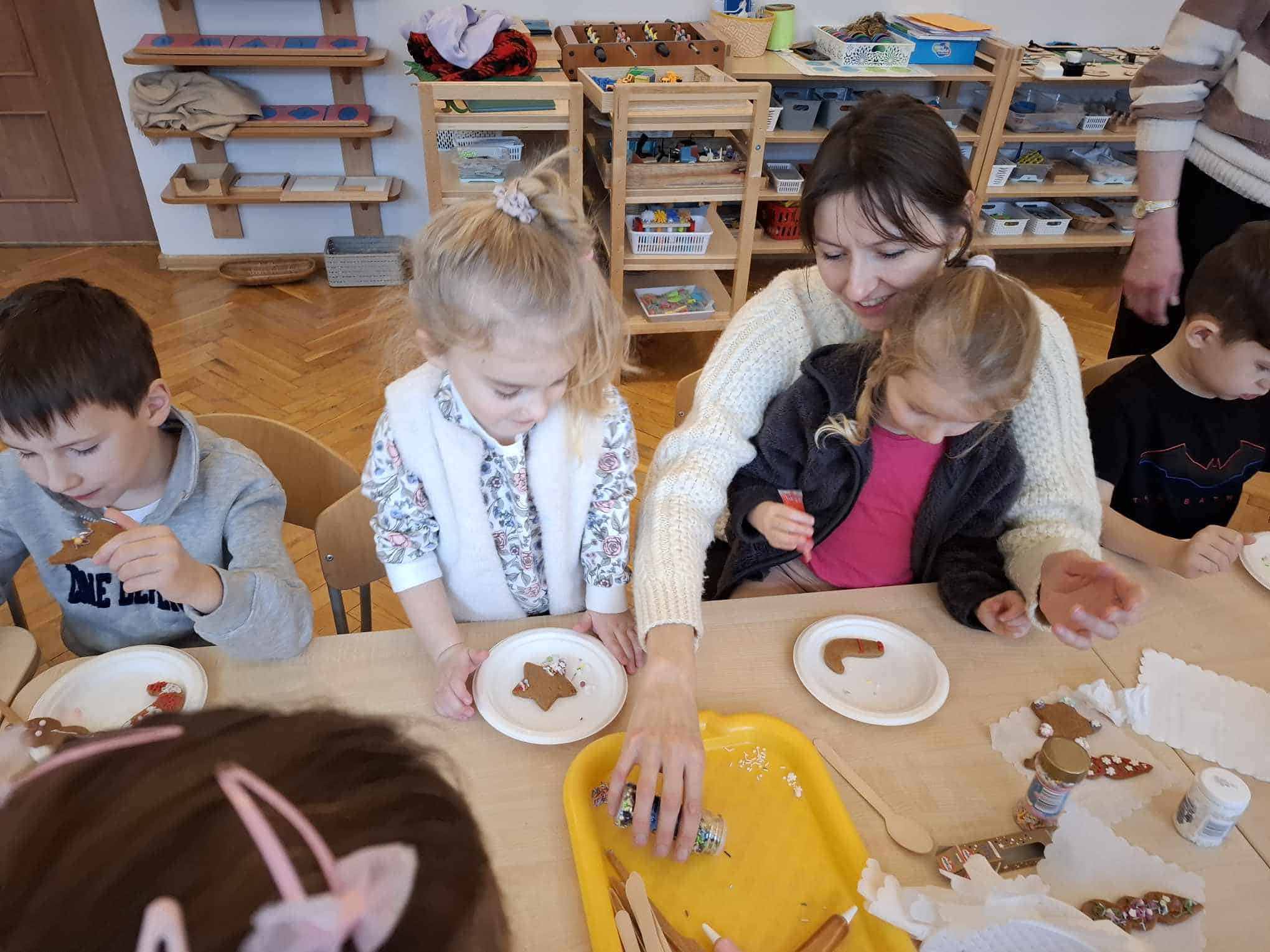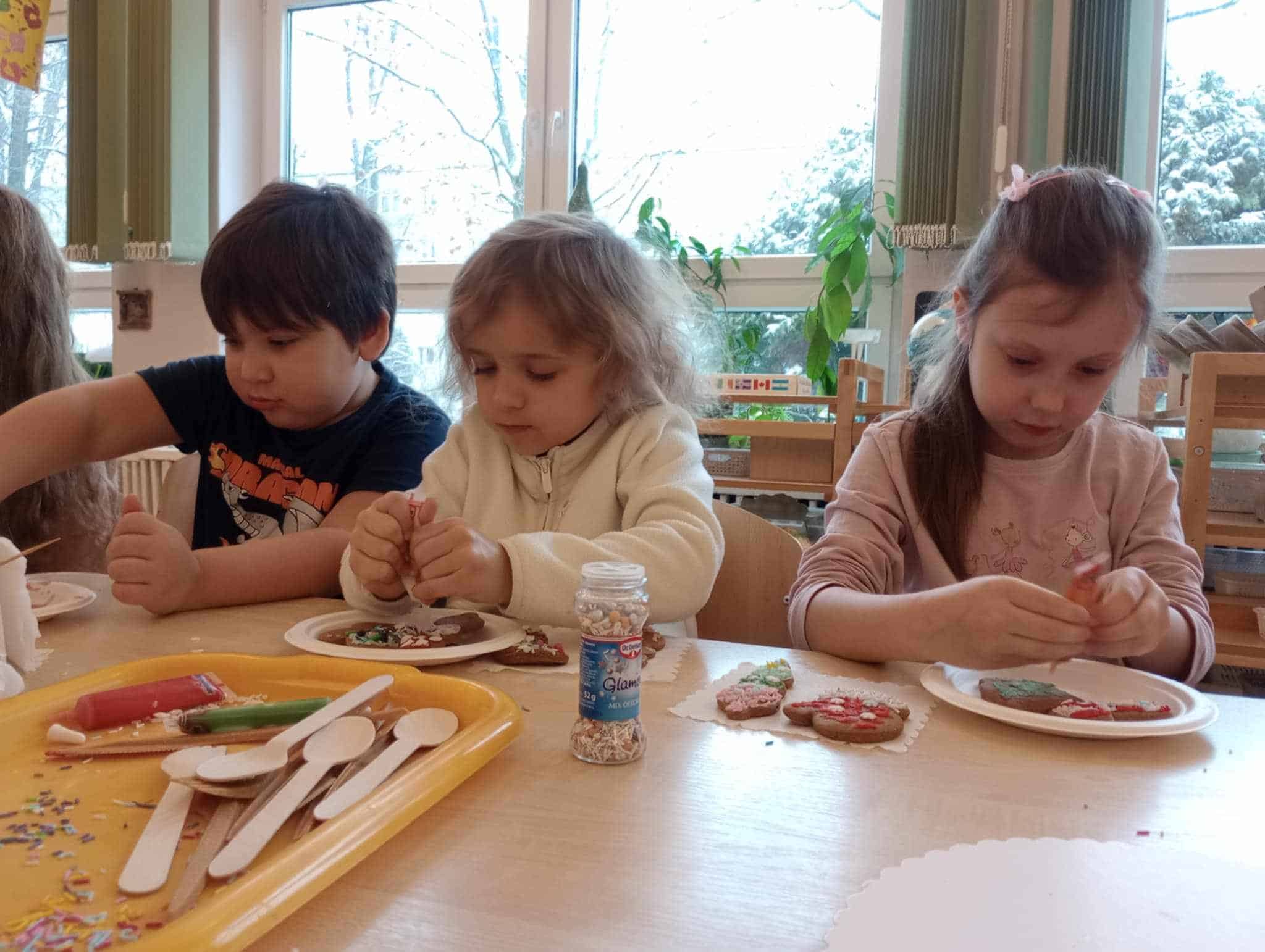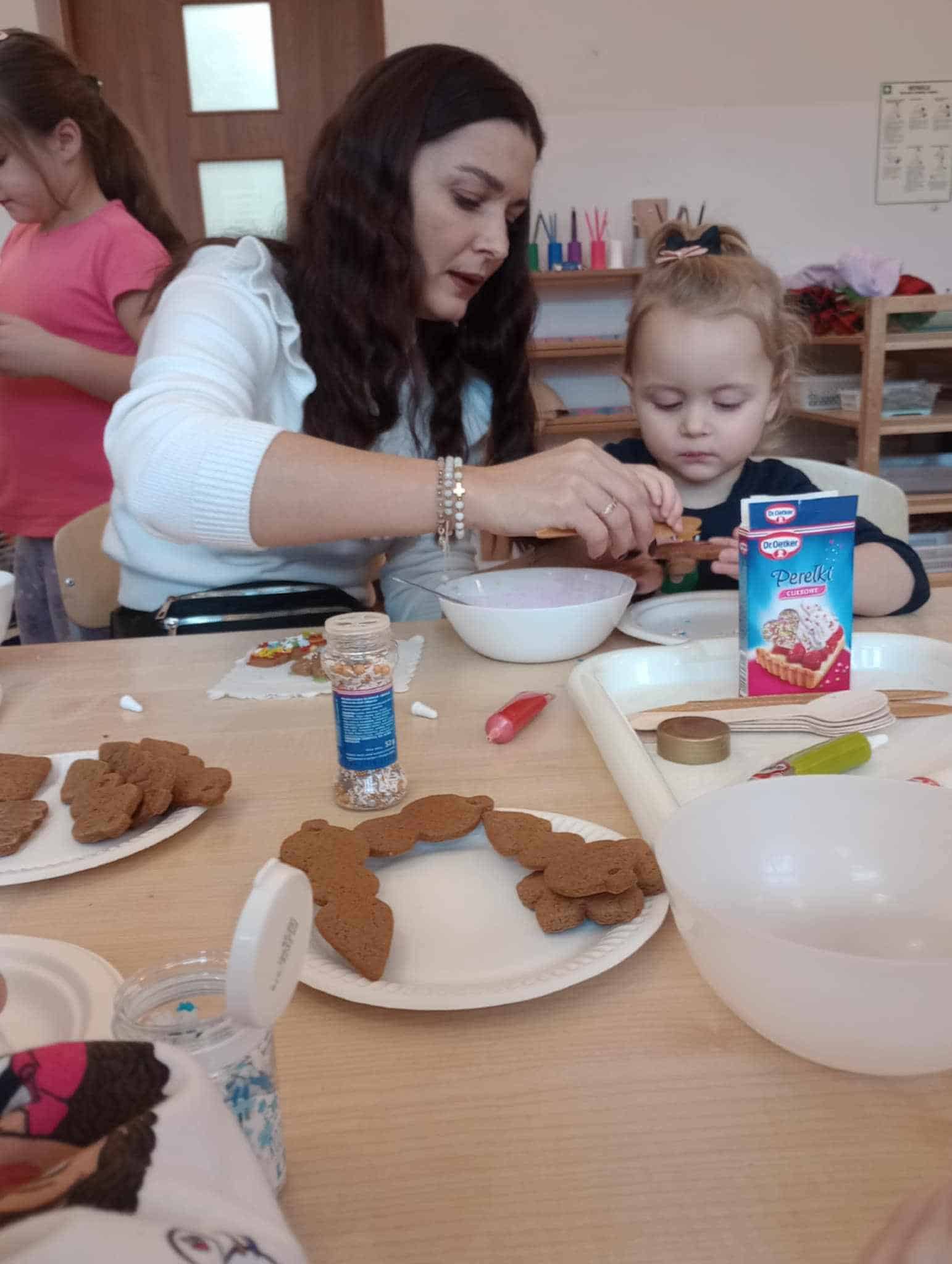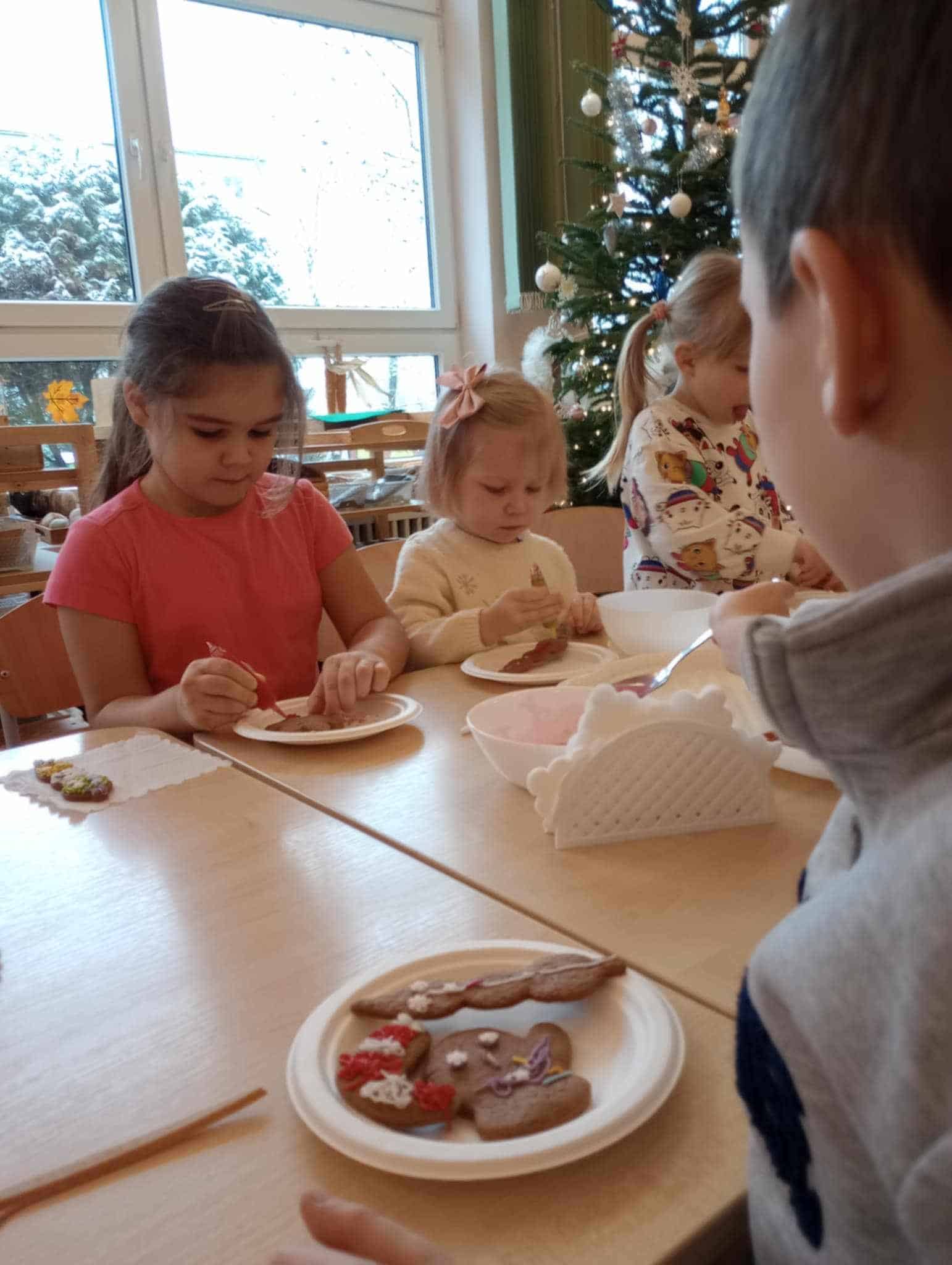 W środę, 11 grudnia, odbyły się w naszej grupie warsztaty świąteczne z udziałem członków rodzin naszych Zieloniuszków. Wszyscy wspólnie, przy dźwiękach kolęd, zdobiliśmy pachnące, różnokształtne pierniczki – symbol świąt bożonarodzeniowych.