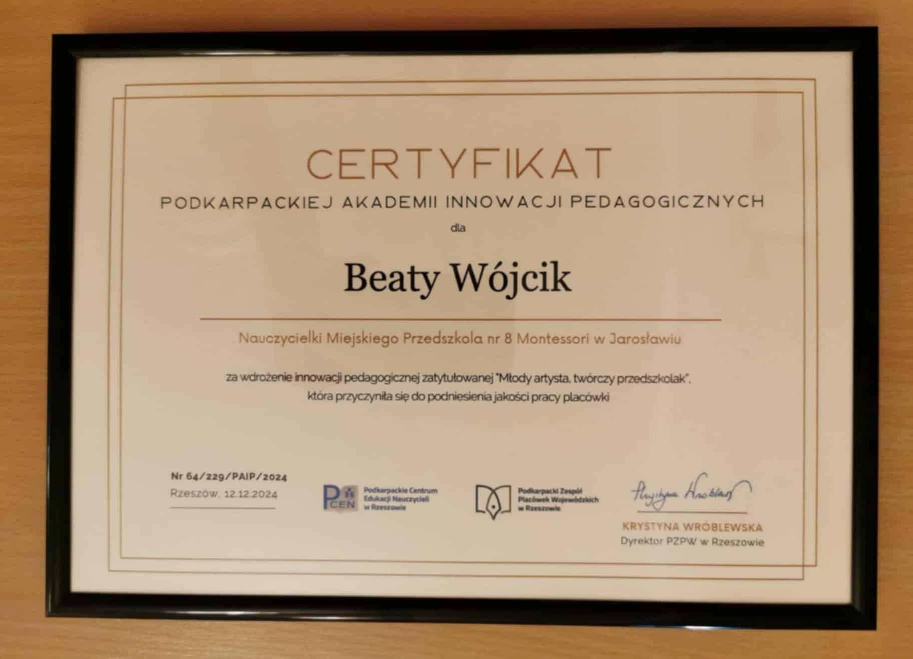 Pani Beata Wójcik za wdrożenie innowacji ,,Młody artysta – twórczy przedszkolak,,