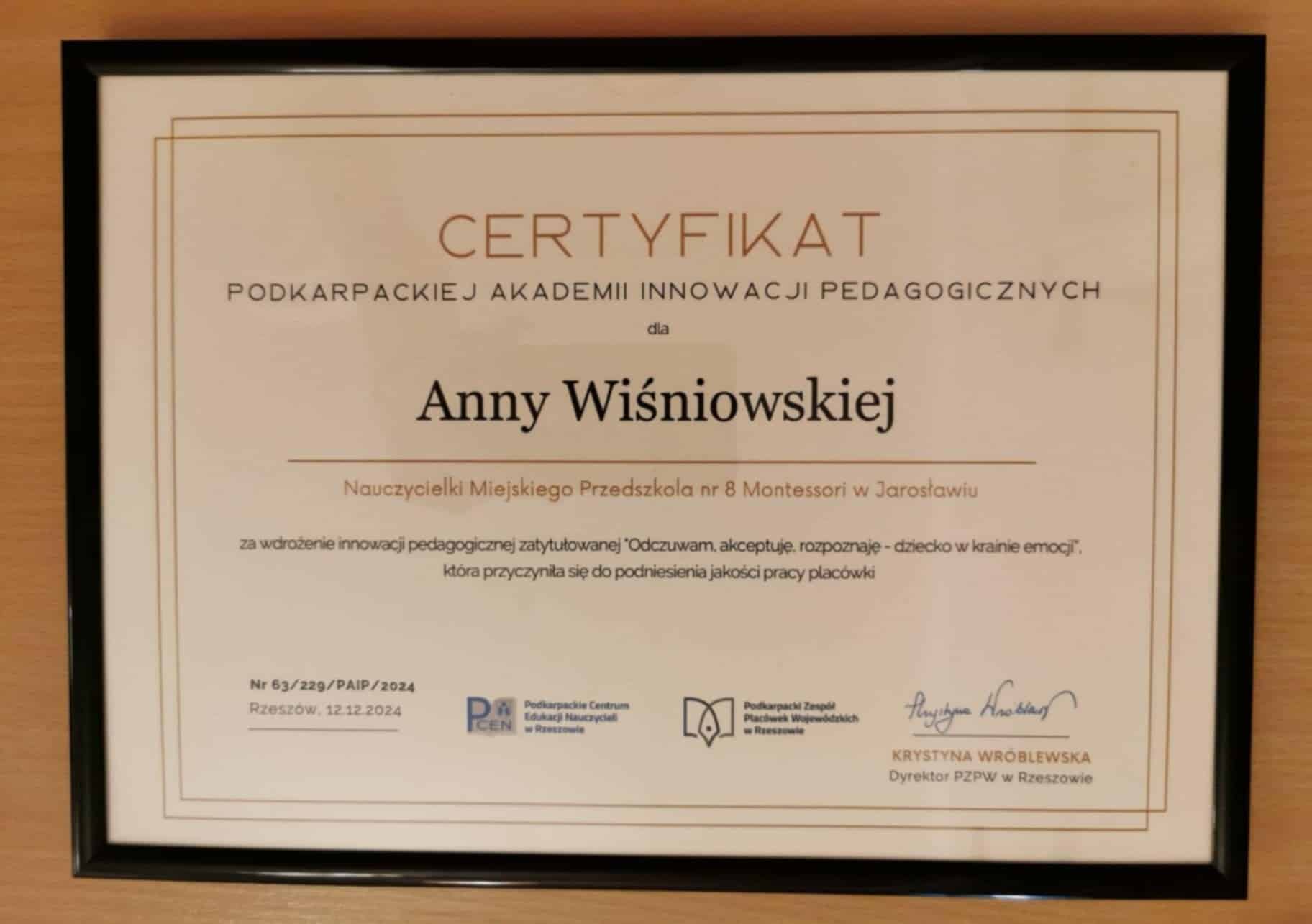 Anna Wiśniowska za innowację ,,Odczuwam, akceptuję, rozpoznaję – dziecko w krainie emocji,,