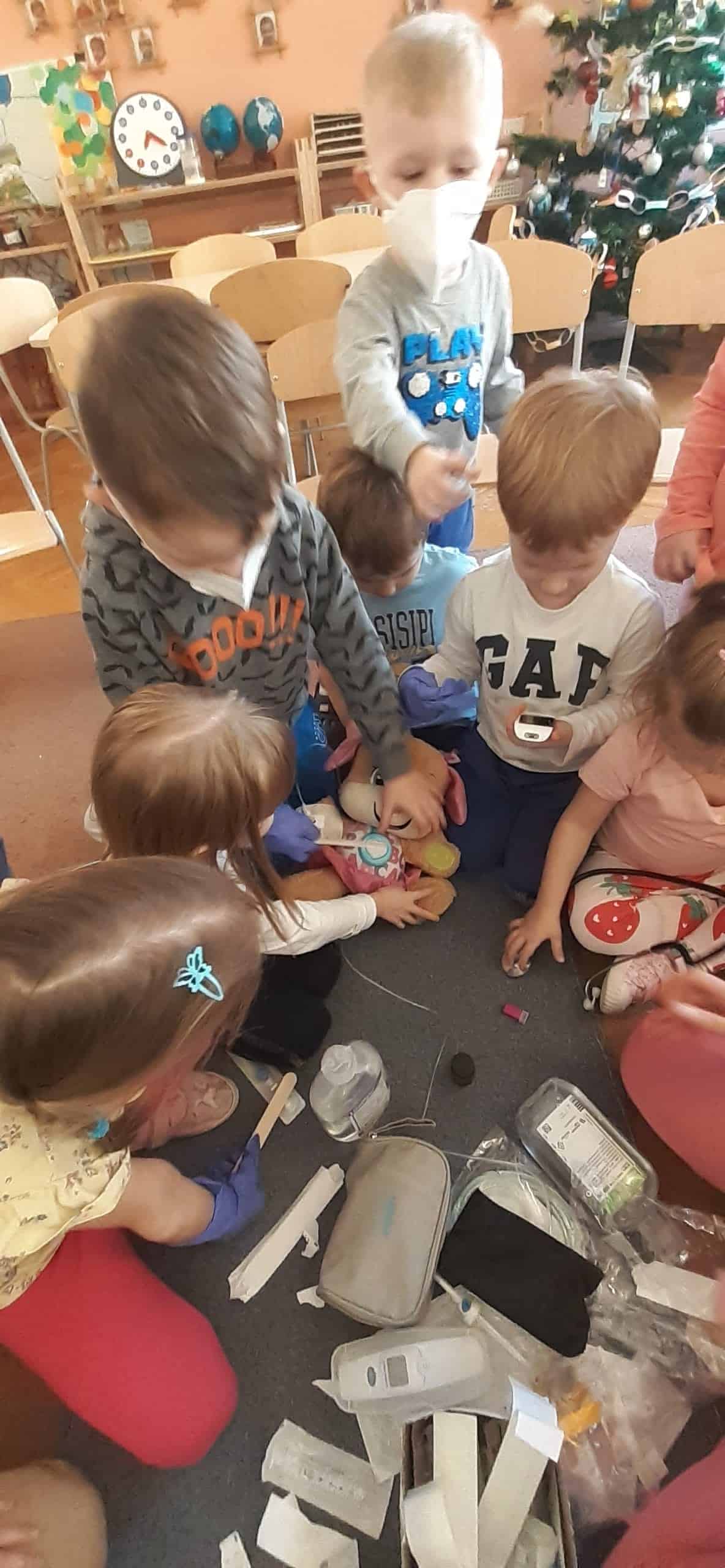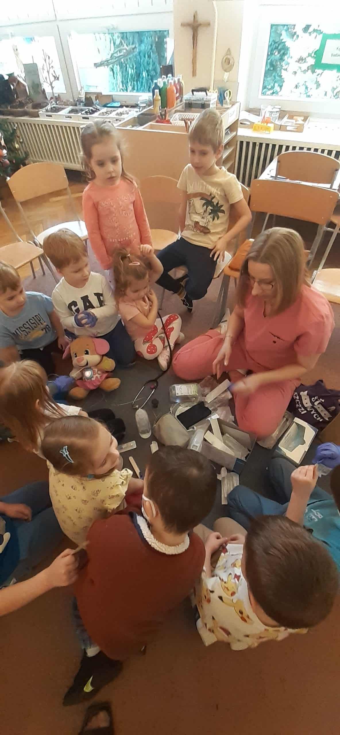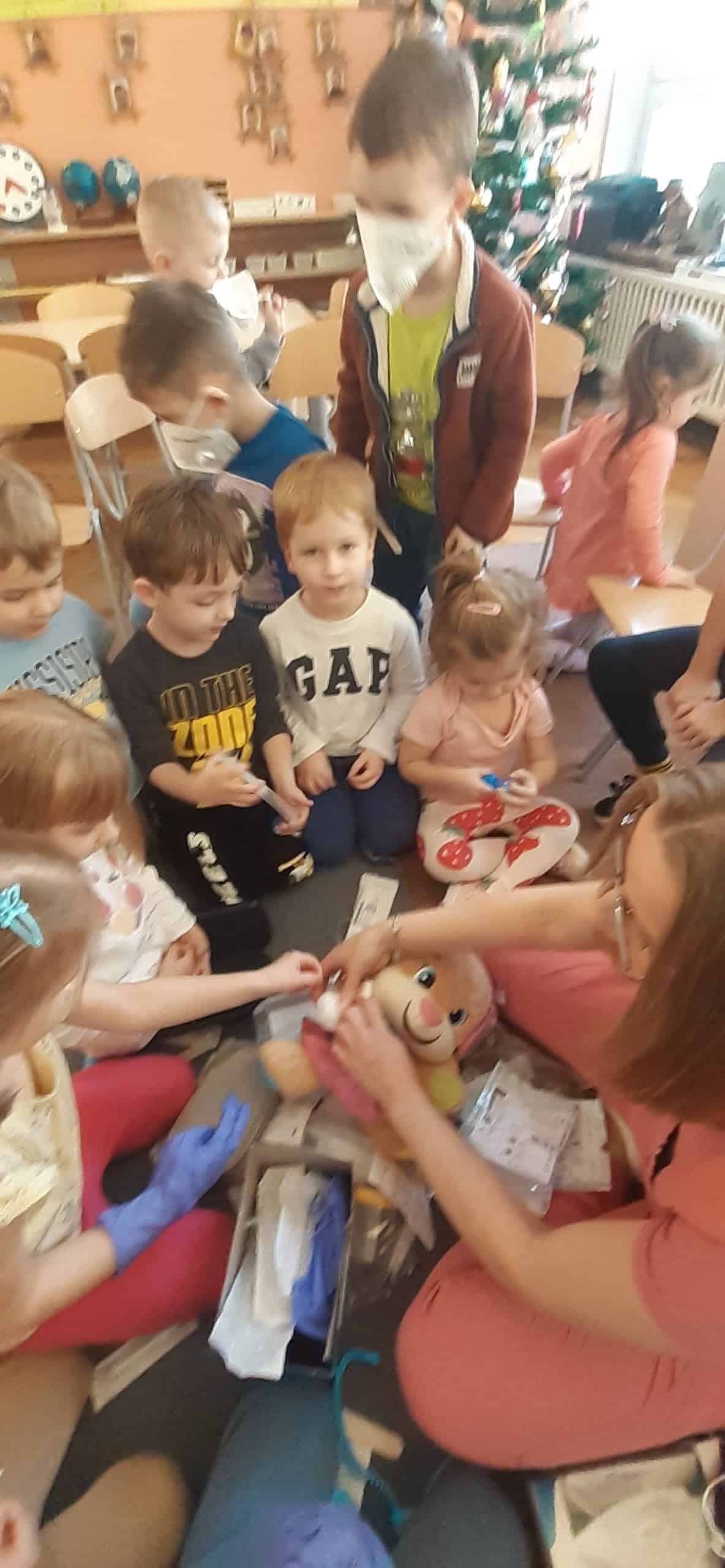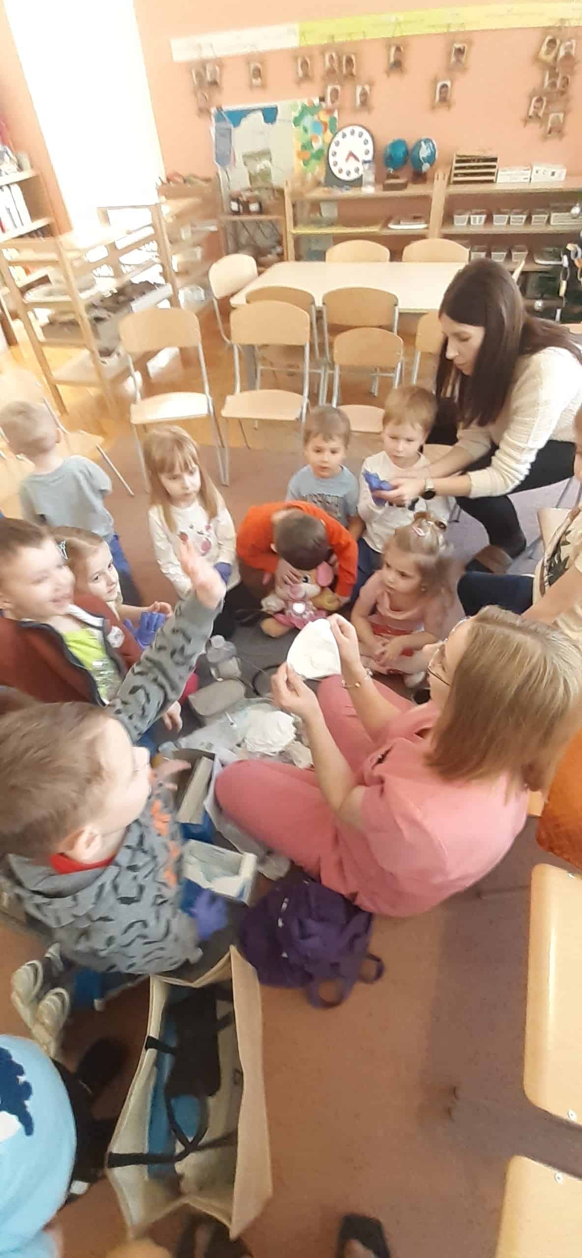 W ramach poznawania świata zawodów i rynku pracy odbyło się spotkanie z mamą Blanki – panią Marzeną, która na co dzień pracuje jako pielęgniarka. Było to wyjątkowo interesujące spotkanie – pani Marzenia przybliżyła dzieciom nie tylko tajniki tego zawodu, ale także zapoznała dzieci ze sprzętem medycznym stosowanym w codziennej pracy pielęgniarki – stetoskop, ciśnieniomierz, glukometr, strzykawki, wenflon, bandaże, plastry z opatrunkiem. Dzieci przy pomocy uroczej maskotki mogły w toku zabawy wykonywać czynności lecznicze np: bandażowanie rany, robienie zastrzyku, mierzenie ciśnienia, czy sprawdzanie stanu gardła i tym samym bliżej poznać zawód pielęgniarki. To były nowe, bardzo ciekawe doświadczenia dzieci.