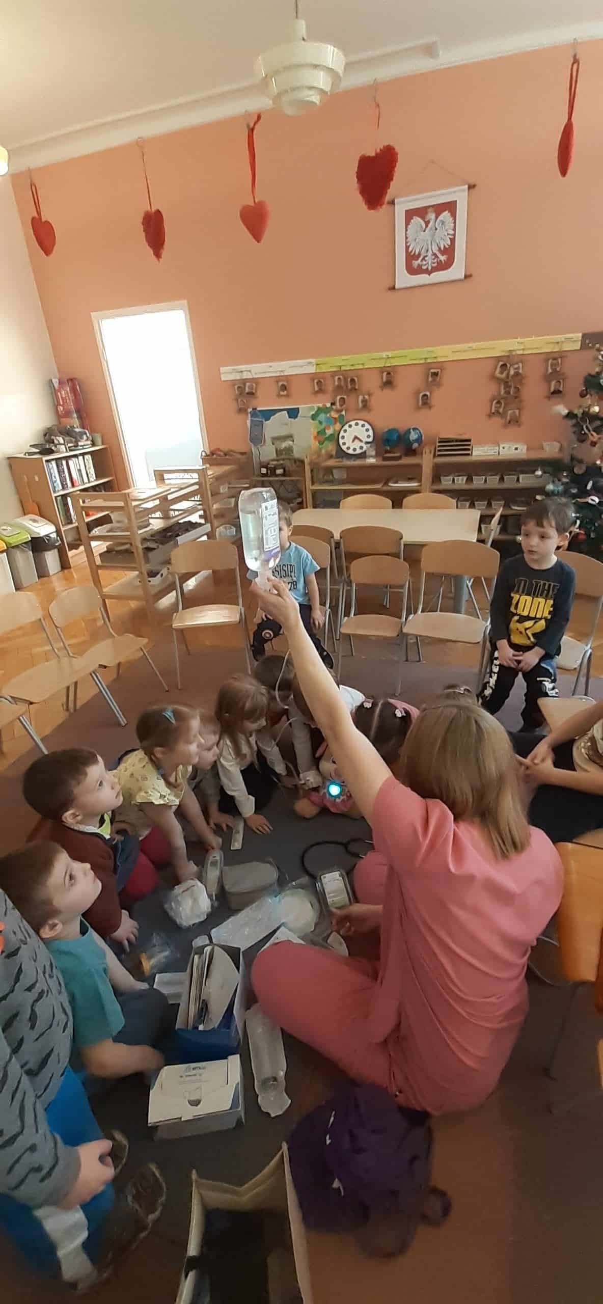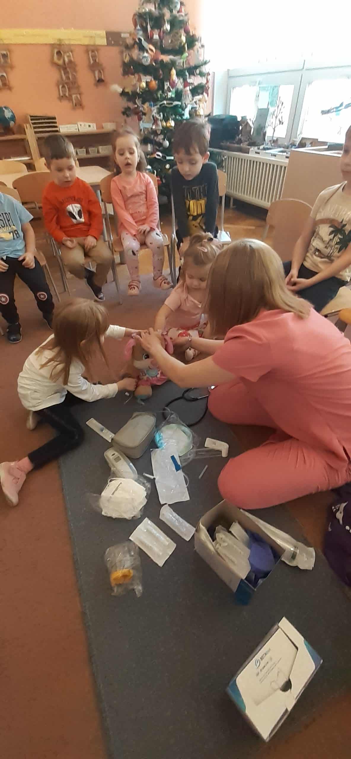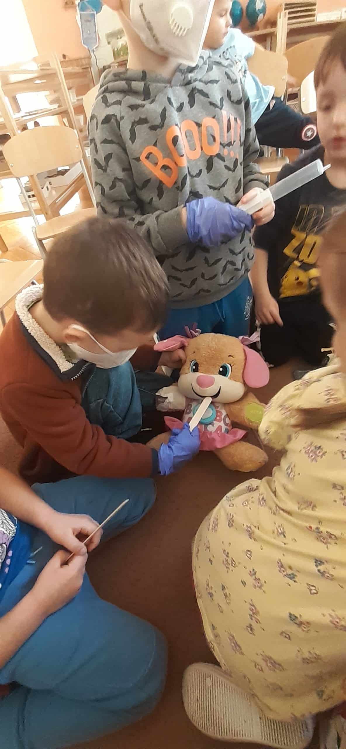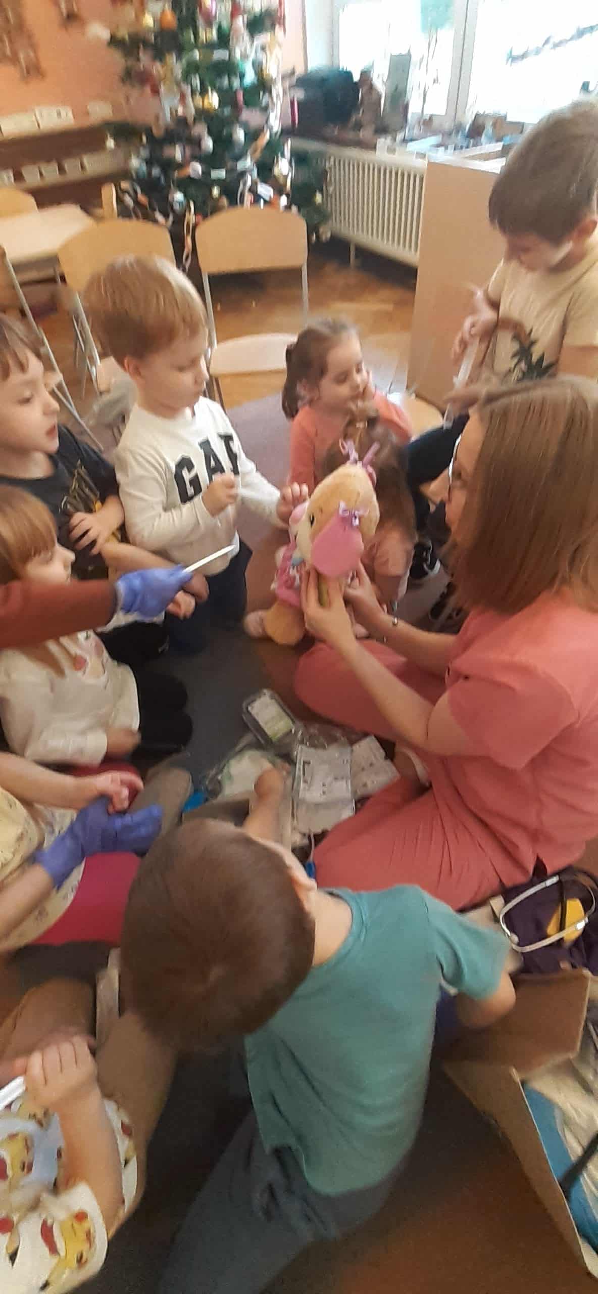 W ramach poznawania świata zawodów i rynku pracy odbyło się spotkanie z mamą Blanki – panią Marzeną, która na co dzień pracuje jako pielęgniarka. Było to wyjątkowo interesujące spotkanie – pani Marzenia przybliżyła dzieciom nie tylko tajniki tego zawodu, ale także zapoznała dzieci ze sprzętem medycznym stosowanym w codziennej pracy pielęgniarki – stetoskop, ciśnieniomierz, glukometr, strzykawki, wenflon, bandaże, plastry z opatrunkiem. Dzieci przy pomocy uroczej maskotki mogły w toku zabawy wykonywać czynności lecznicze np: bandażowanie rany, robienie zastrzyku, mierzenie ciśnienia, czy sprawdzanie stanu gardła i tym samym bliżej poznać zawód pielęgniarki. To były nowe, bardzo ciekawe doświadczenia dzieci.
