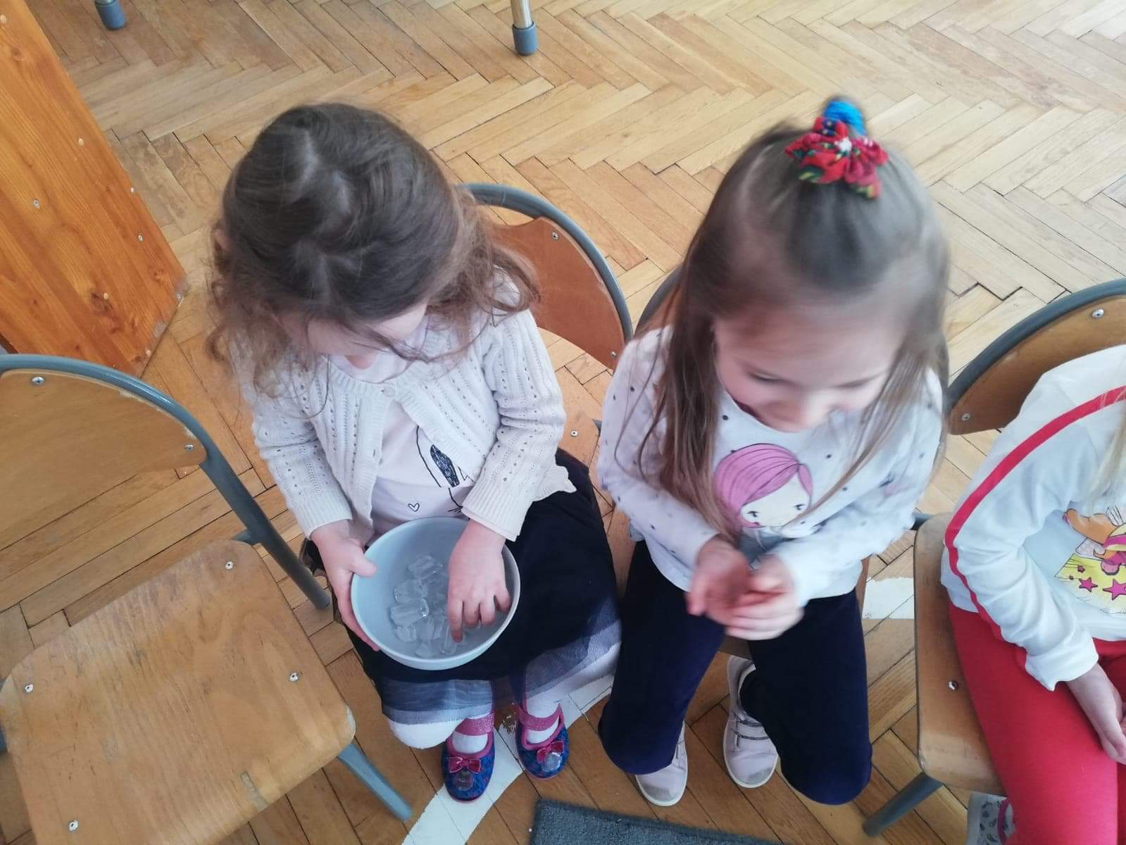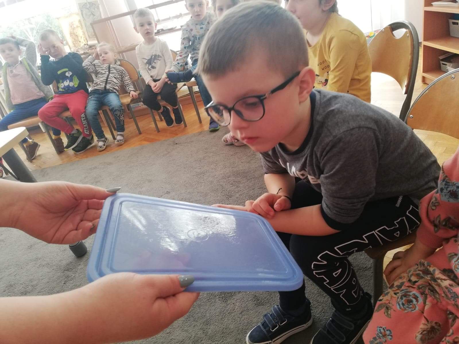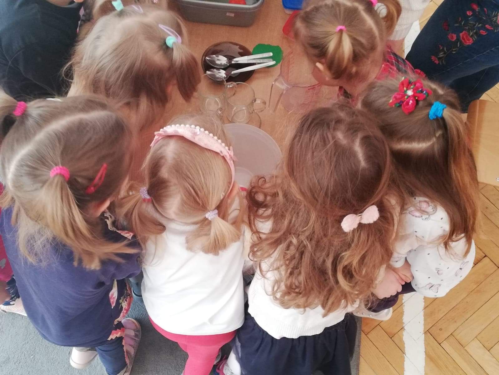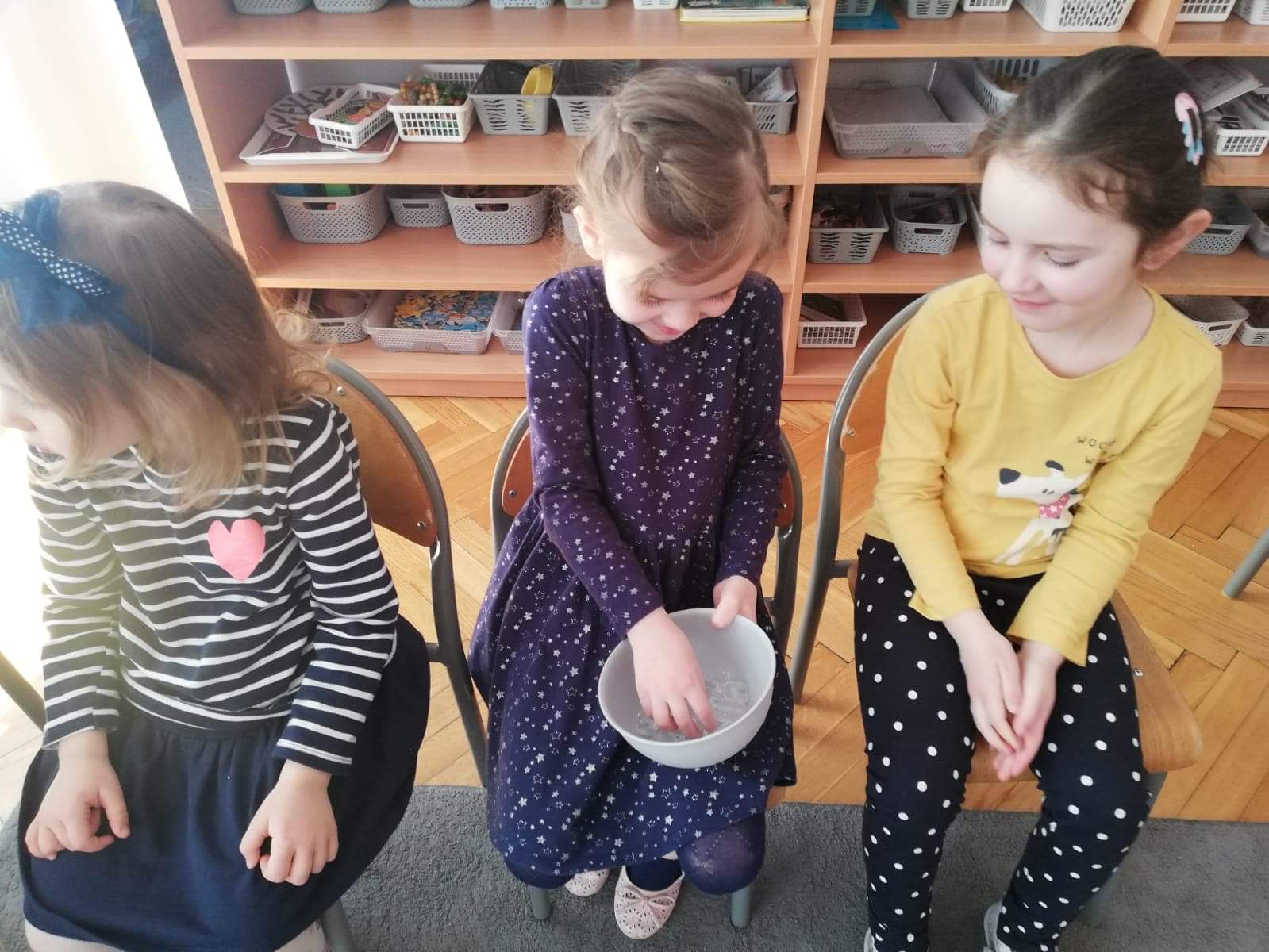 Na początku zajęć puściliśmy iskierkę przyjaźni. Siedząc w kręgu, trzymaliśmy się za ręce, przekazując uścisk dłoni i wypowiadając słowa: Iskierkę przyjaźni puszczam w krąg, niechaj powróci do moich rąk.