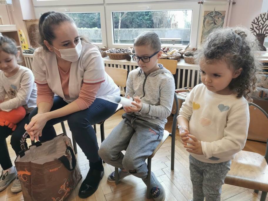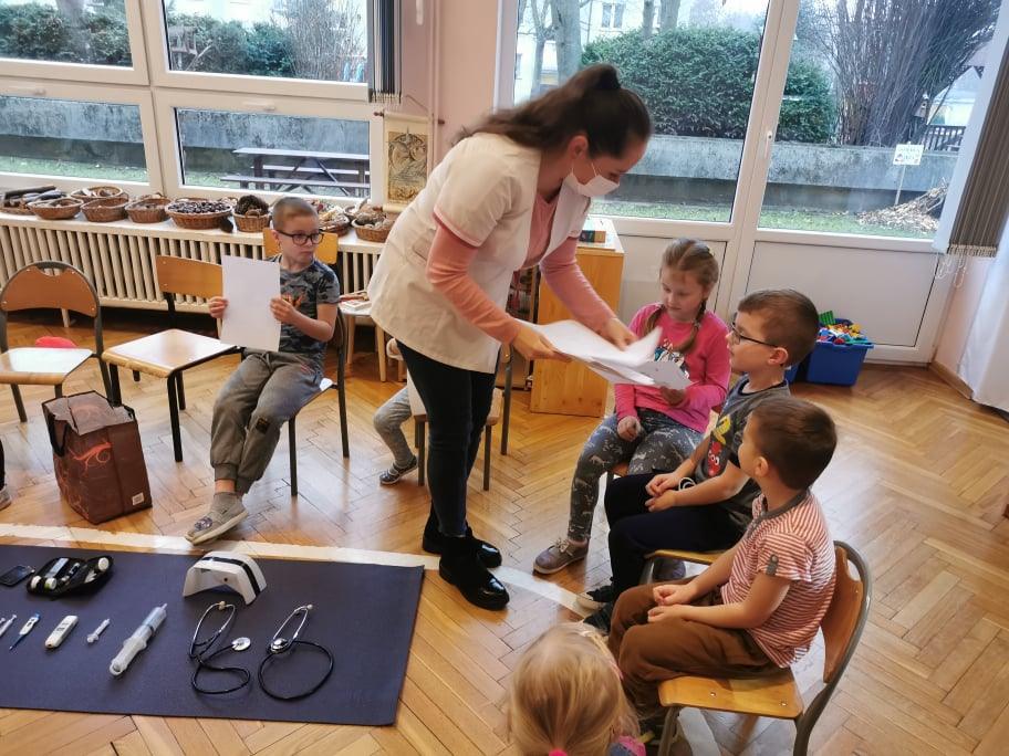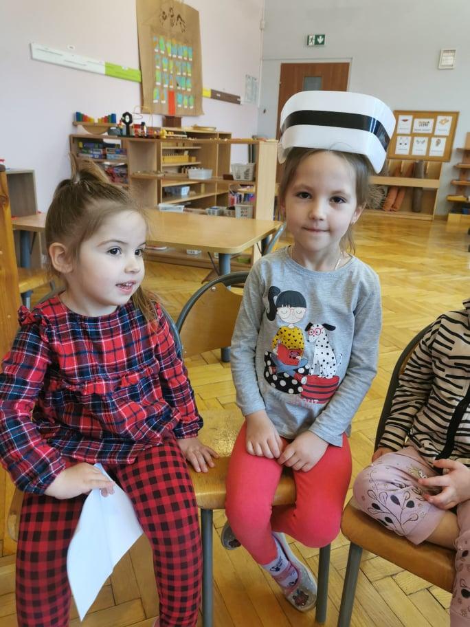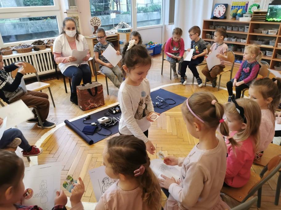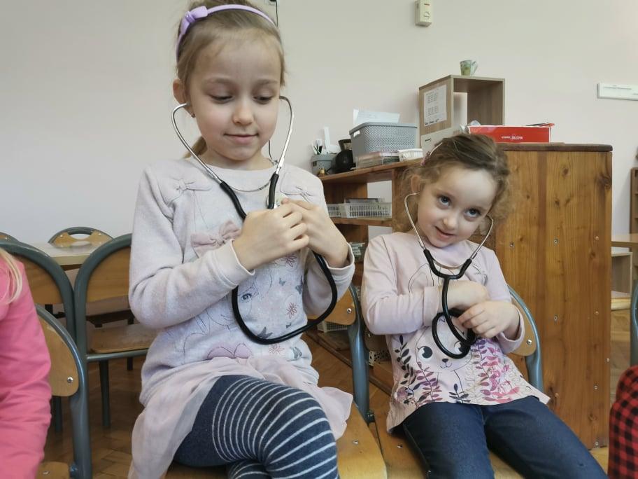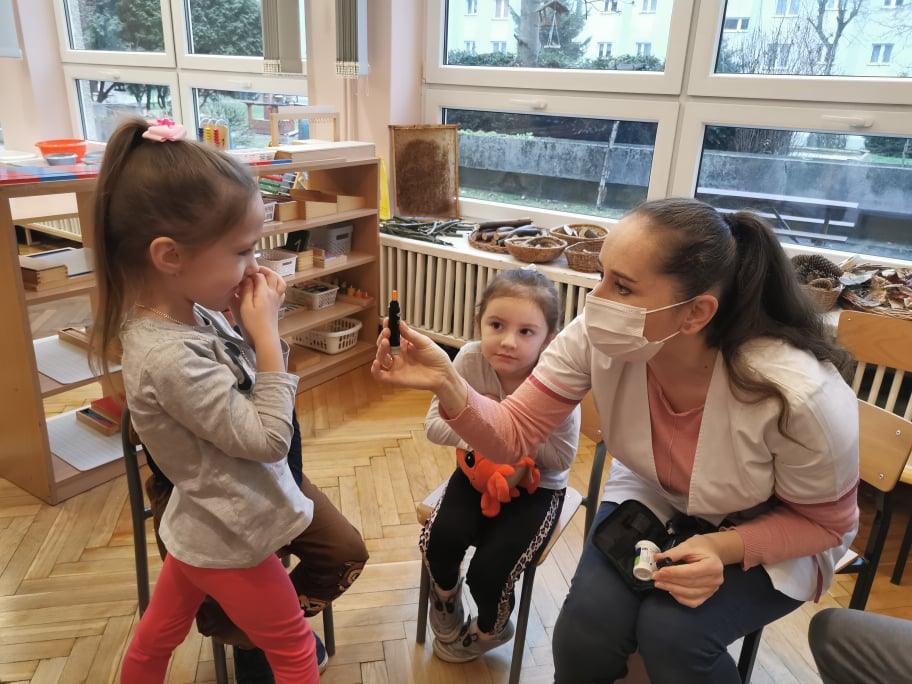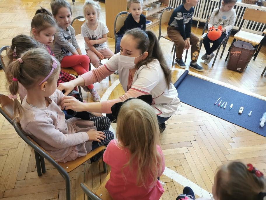 Pani Gosia przyszła ubrana w mundurek, w którym chodzi do pracy. Pokazała dzieciom charakterystyczny biały czepek z czarnym paskiem, który kiedyś nosiły pielęgniarki. Nasze dziewczynki chętnie go przymierzały. Oprócz charakterystycznego czepka pielęgniarki nosiły białe fartuchy teraz zakładają białe albo kolorowe mundurki, dzięki temu wzbudzają zaufanie zwłaszcza wśród najmłodszych pacjentów. Pani Gosia opowiedziała nam o obowiązkach jakie do niej należą. Pokazała strzykawki, probówki laboratoryjne do różnego rodzaju badań, igły, termometr, stetoskop, ciśnieniomierz elektroniczny oraz zegarowy a także glukometr do mierzenia poziomu cukru we krwi. Pani Małgosia przypomniała nam również o konieczności dbania o higienę osobistą, częstym, dokładnym myciu rąk oraz o jedzeniu warzy i owoców, które są cennym źródłem witamin niezbędnych dla naszego zdrowia. Pani Gosia za pomocą eksperymentu pokazała w jaki sposób myć dokładnie ręce. Przedszkolaki również pokazywały jak należy to właściwie robić. Dzieci z zainteresowaniem uczestniczyły w lekcji, zadając pytania, które je nurtowały.