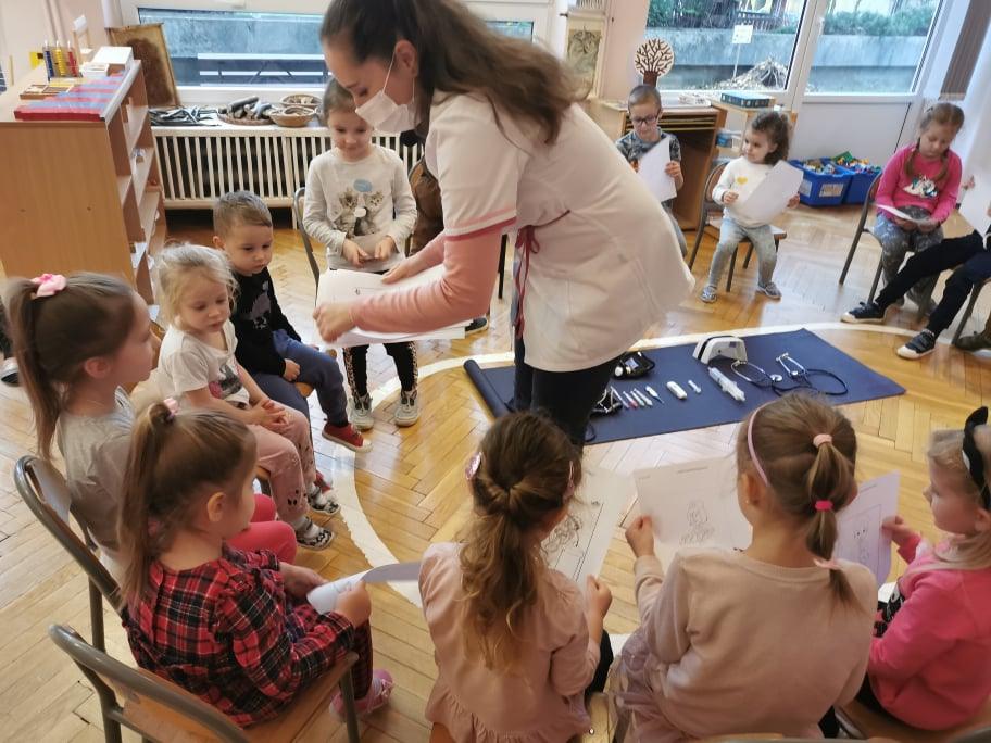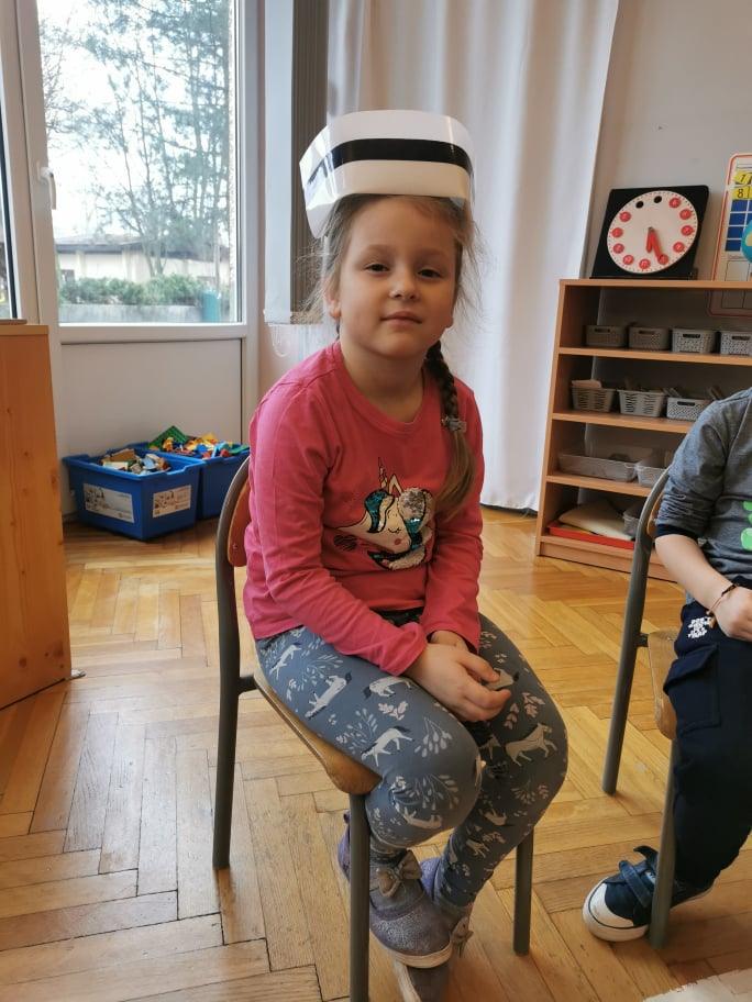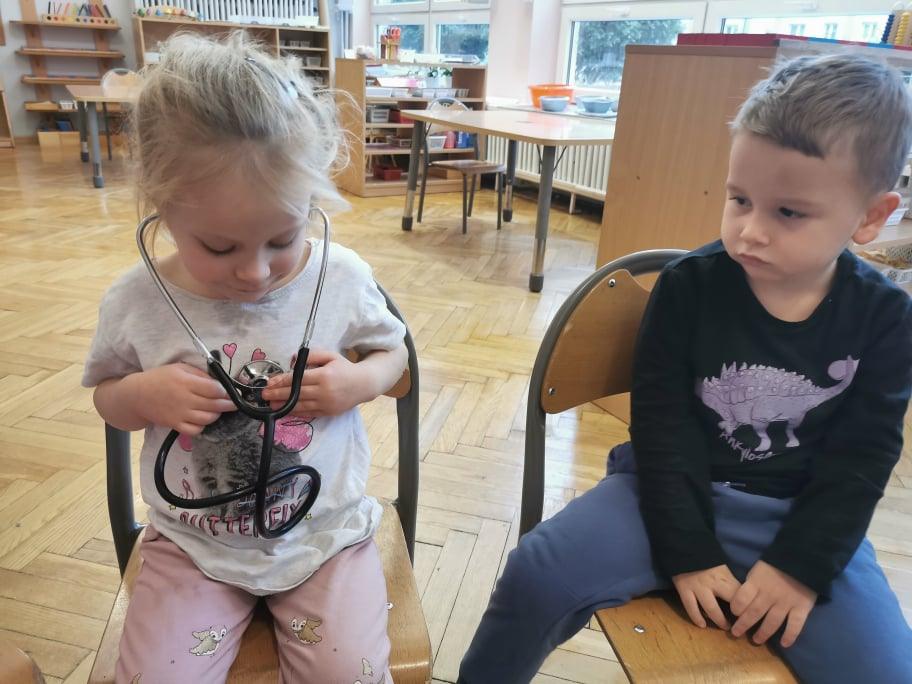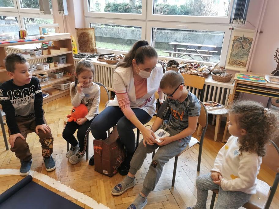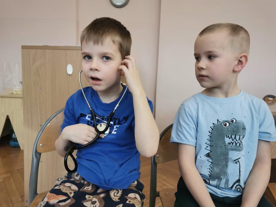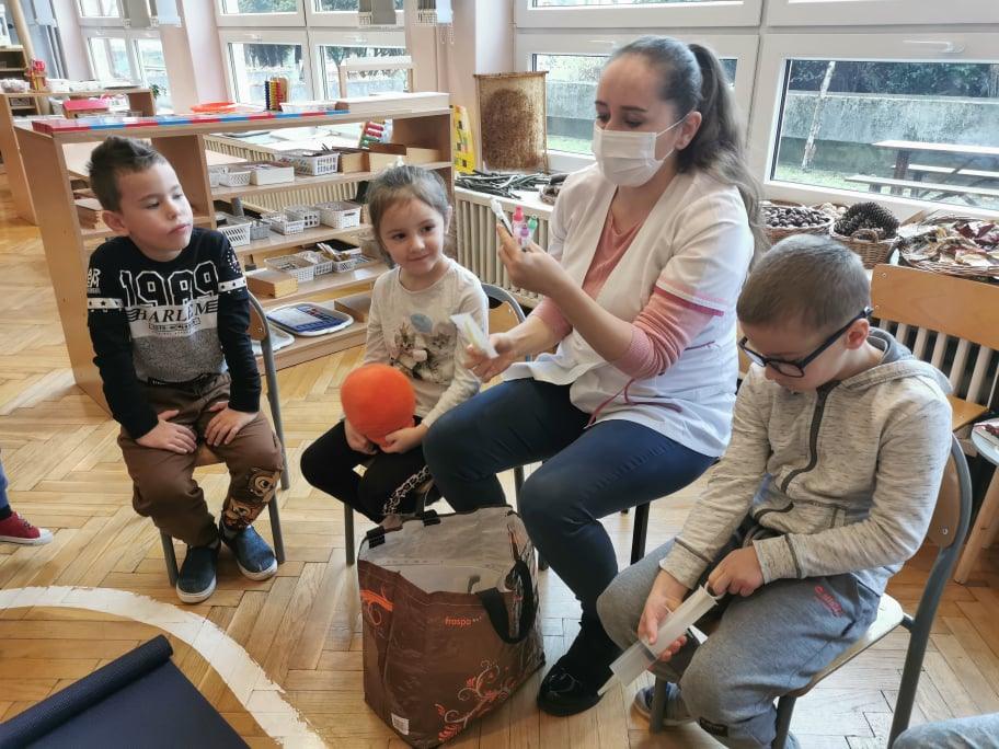 Pani Gosia przyszła ubrana w mundurek, w którym chodzi do pracy. Pokazała dzieciom charakterystyczny biały czepek z czarnym paskiem, który kiedyś nosiły pielęgniarki. Nasze dziewczynki chętnie go przymierzały. Oprócz charakterystycznego czepka pielęgniarki nosiły białe fartuchy teraz zakładają białe albo kolorowe mundurki, dzięki temu wzbudzają zaufanie zwłaszcza wśród najmłodszych pacjentów. Pani Gosia opowiedziała nam o obowiązkach jakie do niej należą. Pokazała strzykawki, probówki laboratoryjne do różnego rodzaju badań, igły, termometr, stetoskop, ciśnieniomierz elektroniczny oraz zegarowy a także glukometr do mierzenia poziomu cukru we krwi. Pani Małgosia przypomniała nam również o konieczności dbania o higienę osobistą, częstym, dokładnym myciu rąk oraz o jedzeniu warzy i owoców, które są cennym źródłem witamin niezbędnych dla naszego zdrowia. Pani Gosia za pomocą eksperymentu pokazała w jaki sposób myć dokładnie ręce. Przedszkolaki również pokazywały jak należy to właściwie robić. Dzieci z zainteresowaniem uczestniczyły w lekcji, zadając pytania, które je nurtowały.