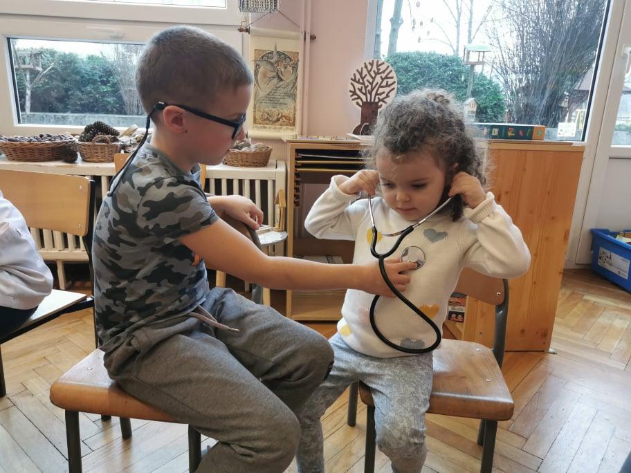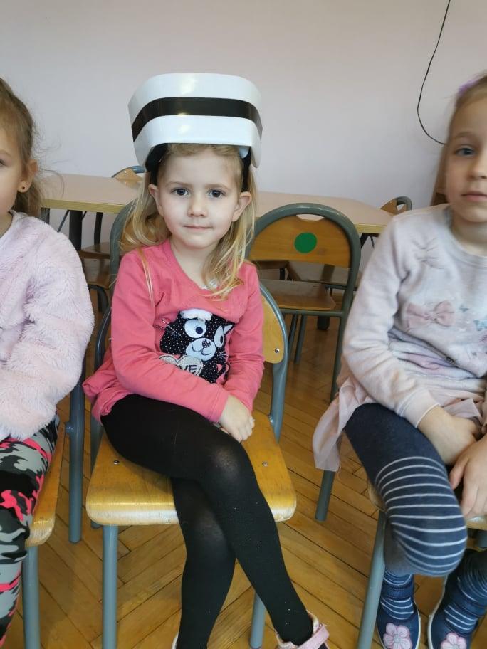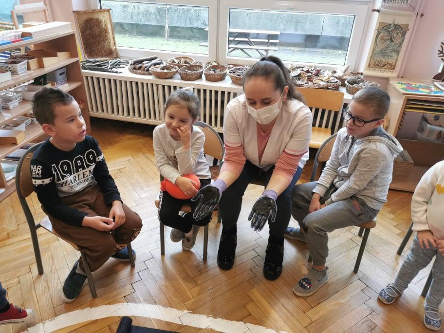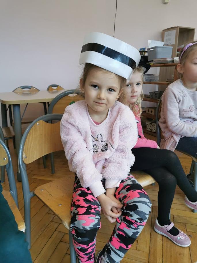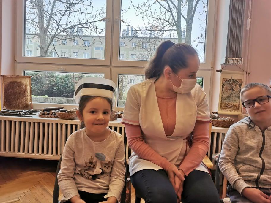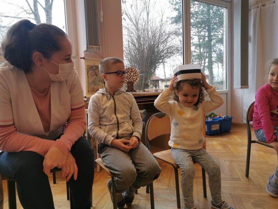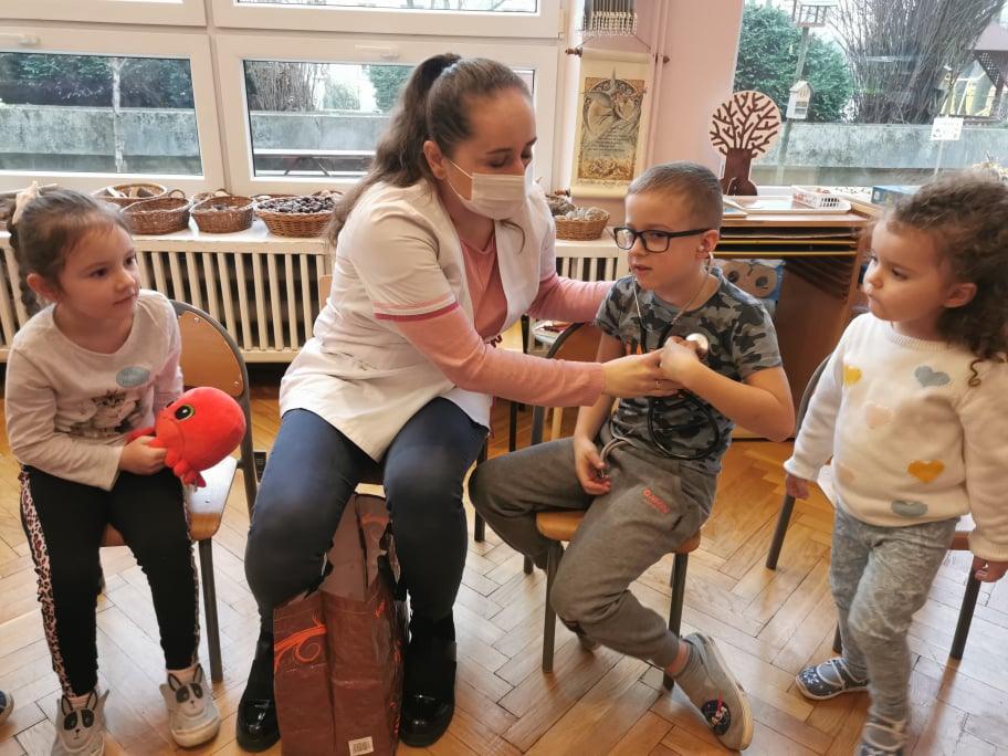 Pani Gosia przyszła ubrana w mundurek, w którym chodzi do pracy. Pokazała dzieciom charakterystyczny biały czepek z czarnym paskiem, który kiedyś nosiły pielęgniarki. Nasze dziewczynki chętnie go przymierzały. Oprócz charakterystycznego czepka pielęgniarki nosiły białe fartuchy teraz zakładają białe albo kolorowe mundurki, dzięki temu wzbudzają zaufanie zwłaszcza wśród najmłodszych pacjentów. Pani Gosia opowiedziała nam o obowiązkach jakie do niej należą. Pokazała strzykawki, probówki laboratoryjne do różnego rodzaju badań, igły, termometr, stetoskop, ciśnieniomierz elektroniczny oraz zegarowy a także glukometr do mierzenia poziomu cukru we krwi. Pani Małgosia przypomniała nam również o konieczności dbania o higienę osobistą, częstym, dokładnym myciu rąk oraz o jedzeniu warzy i owoców, które są cennym źródłem witamin niezbędnych dla naszego zdrowia. Pani Gosia za pomocą eksperymentu pokazała w jaki sposób myć dokładnie ręce. Przedszkolaki również pokazywały jak należy to właściwie robić. Dzieci z zainteresowaniem uczestniczyły w lekcji, zadając pytania, które je nurtowały.