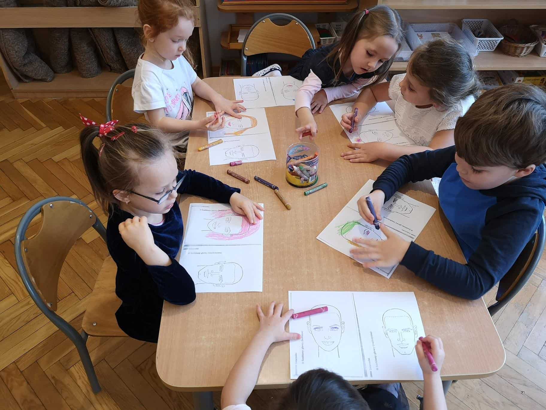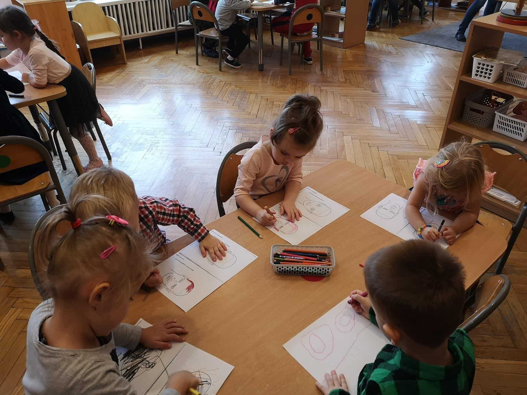 Następnie mamusia Amelki rozdała dzieciom kolorowanki: głowy kobiety i mężczyzny. Zadaniem dzieci było zaprojektowanie fryzury damskiej i męskiej. Dzieci wykazały się dużą kreatywnością tworząc własne projekty.