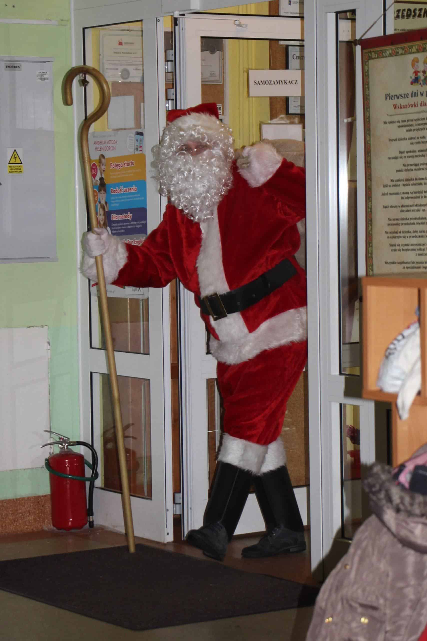 Gdy wreszcie nadszedł ten długo oczekiwany dzień, zebraliśmy się wszyscy w holu i z niecierpliwością czekaliśmy na Gościa z Dalekiej Północy. Aż wreszcie… za oknem ukazał się On – nasz ukochany Św. Mikołaj. Radość dzieci była ogromna, uśmiechy nie znikały z ich twarzy. Po wspólnych zabawach Mikołaj wędrował od grupy do grupy.