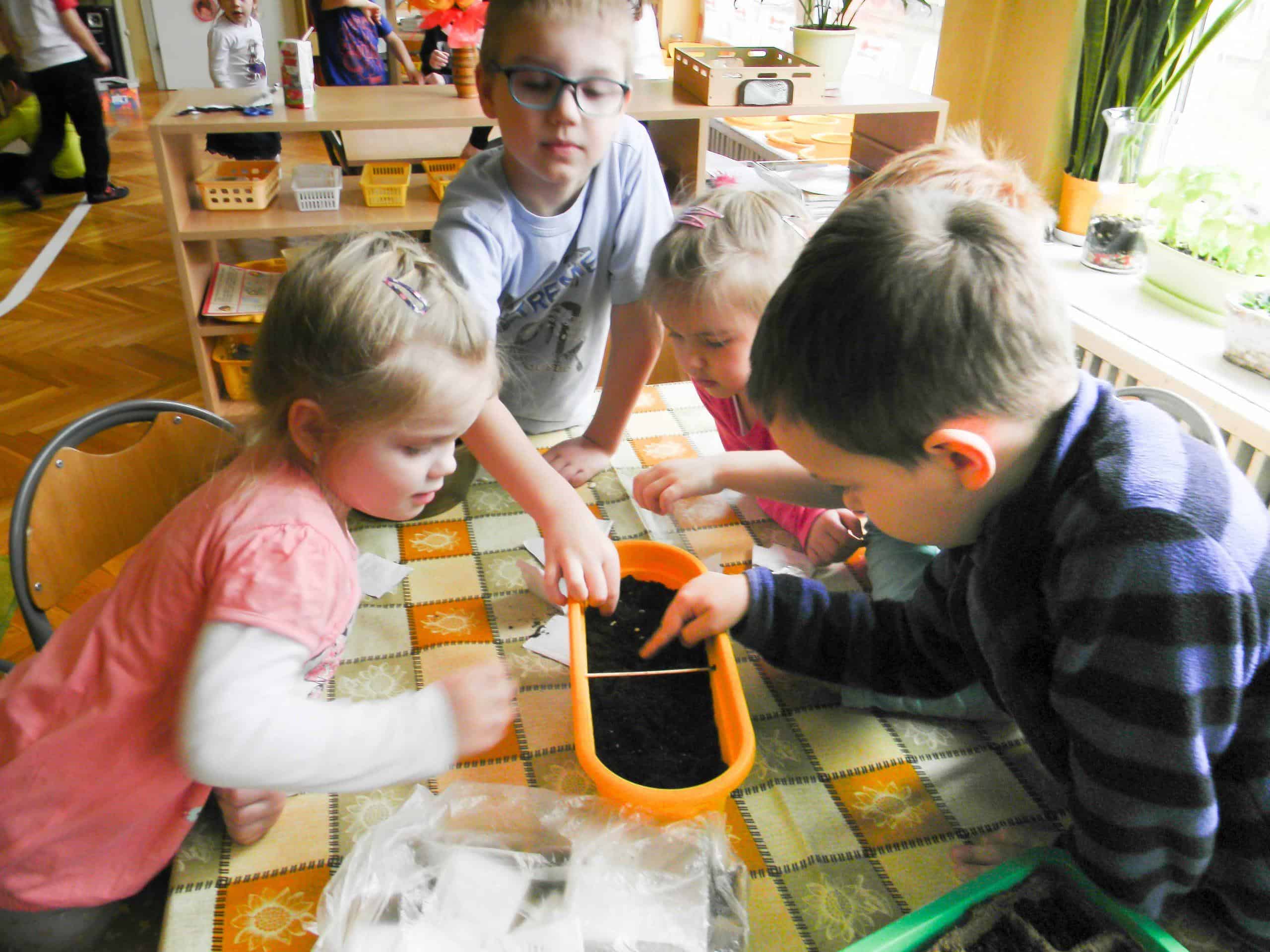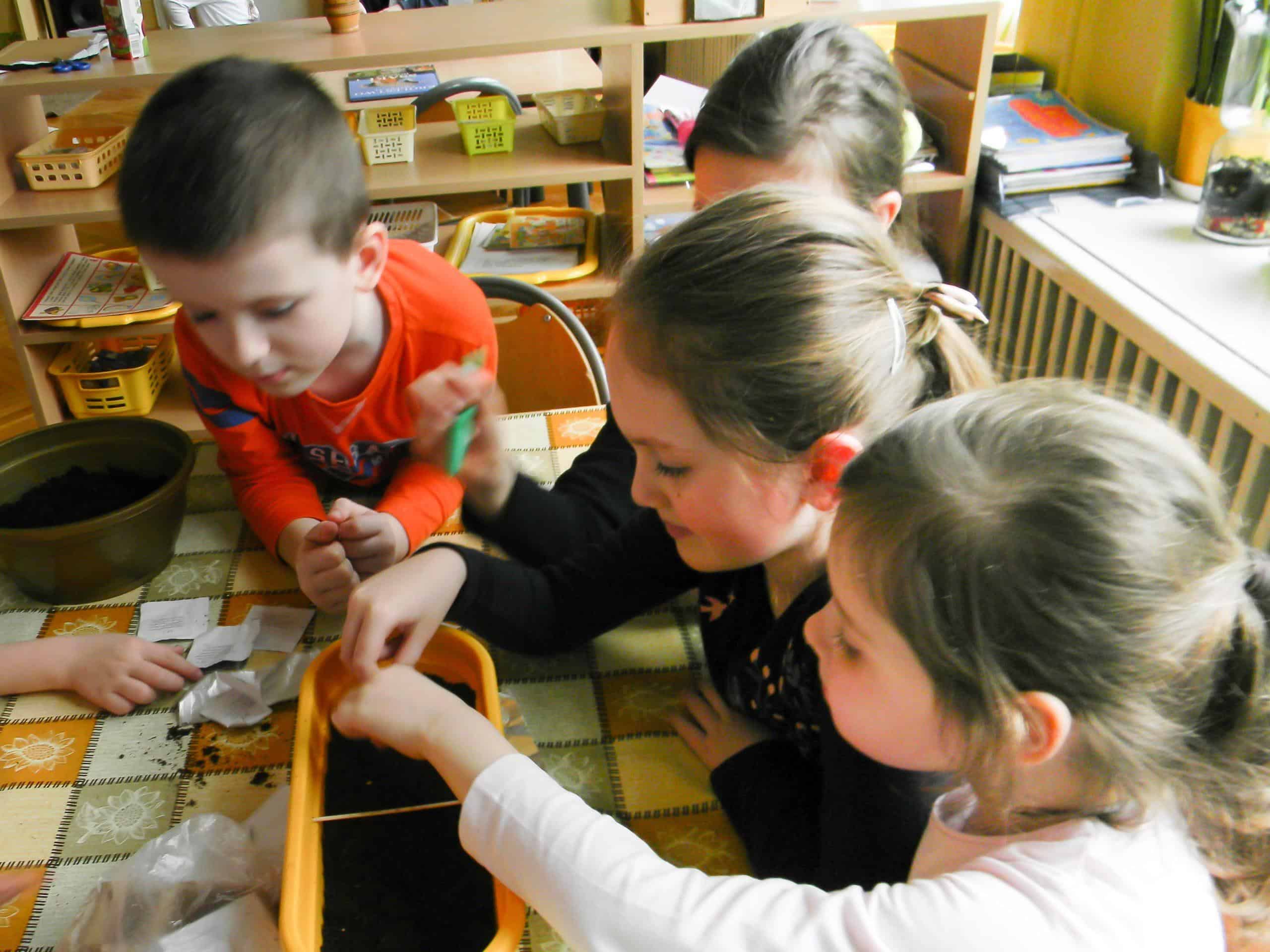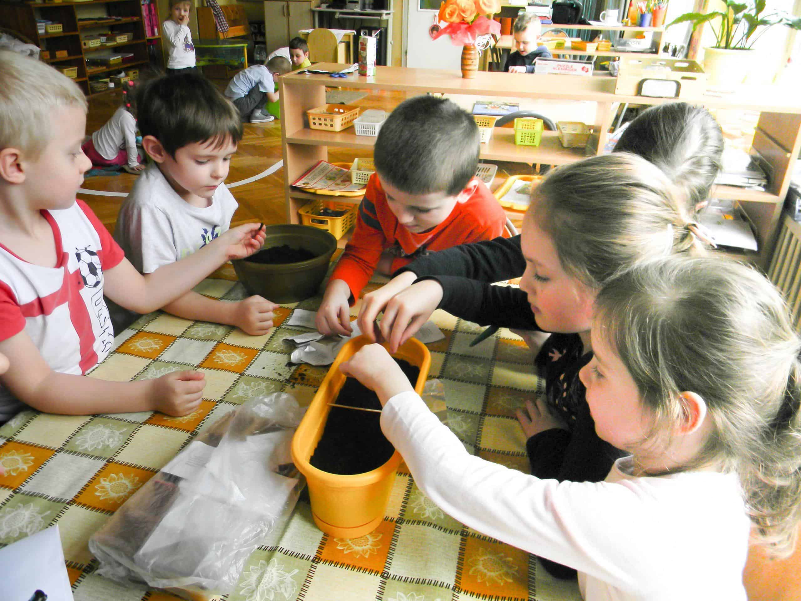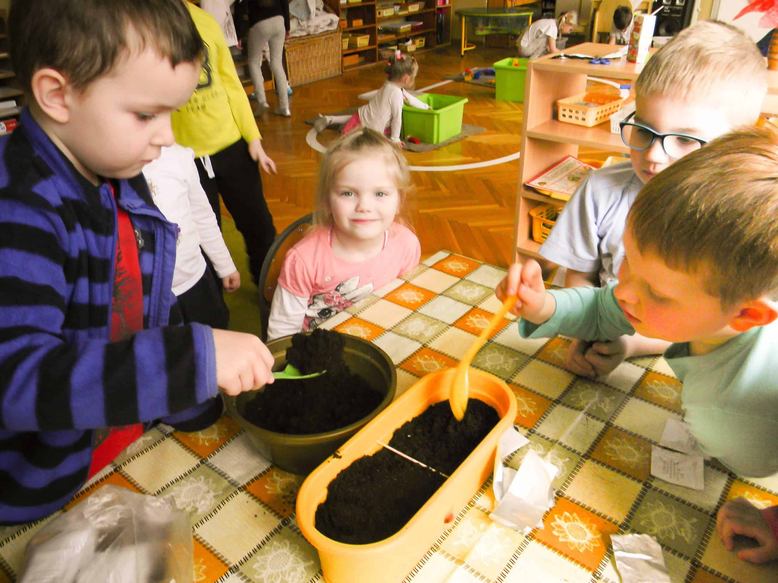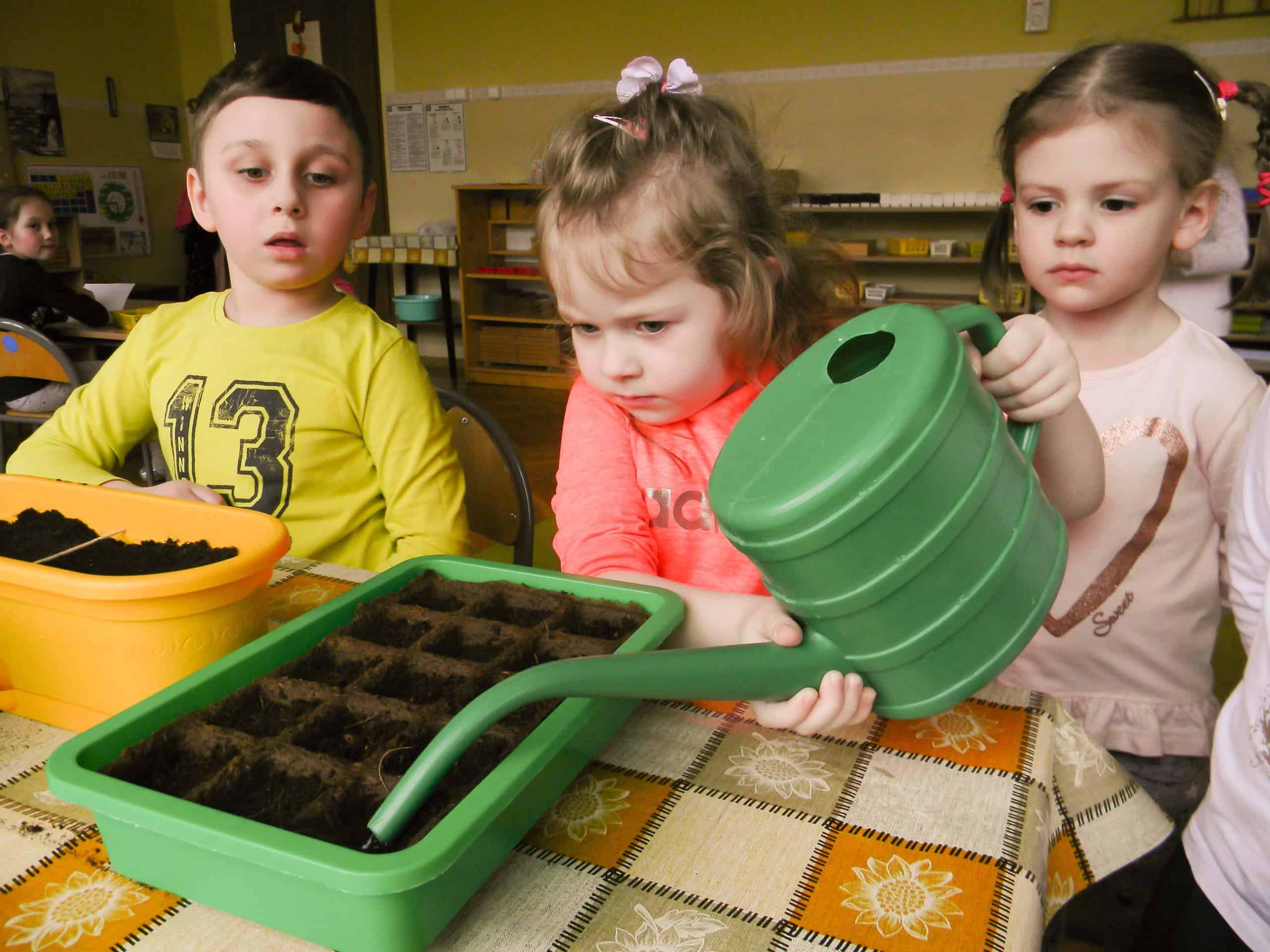 Zbliża się wiosna, a wraz z nią rozpoczną się prace na grządkach przyrodniczej ścieżki ekologicznej. Jak co roku postanowiliśmy samodzielnie przygotować sadzonki warzyw, ziół i kwiatów. Dzieci z dużym zaangażowaniem przystąpiły do sporządzenia rozsad. W tym celu, w kąciku przyrody zgromadziliśmy doniczki z ziemią, do których wysialiśmy nasiona: pomidorów, ogórków, papryki, słonecznika, cukinii, pietruszki, czosnku, fasoli, bazylii i melisy oraz posadziliśmy naszczepki pelargonii i mięty. Zajęcia przybliżyły dzieciom podstawy prac ogrodniczych, oraz nauczyły je rozróżniać różnego rodzaju nasiona i rozsady. Będziemy systematycznie pielęgnować nasze rośliny oraz obserwować ich wzrost i rozwój.