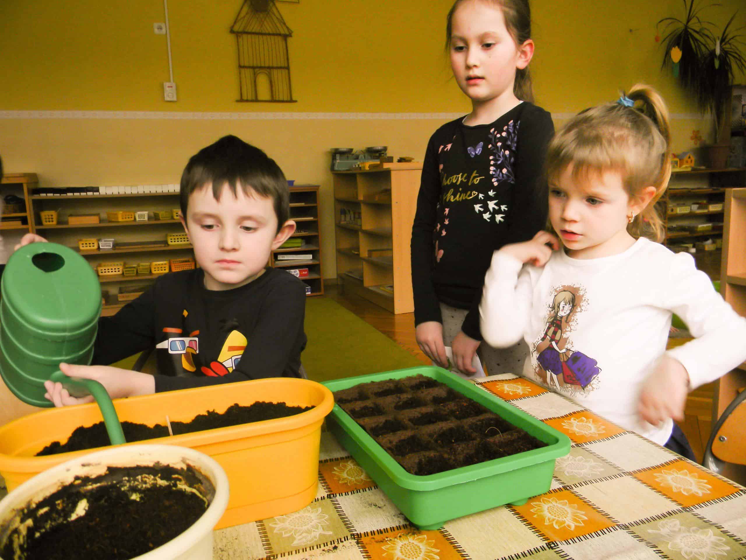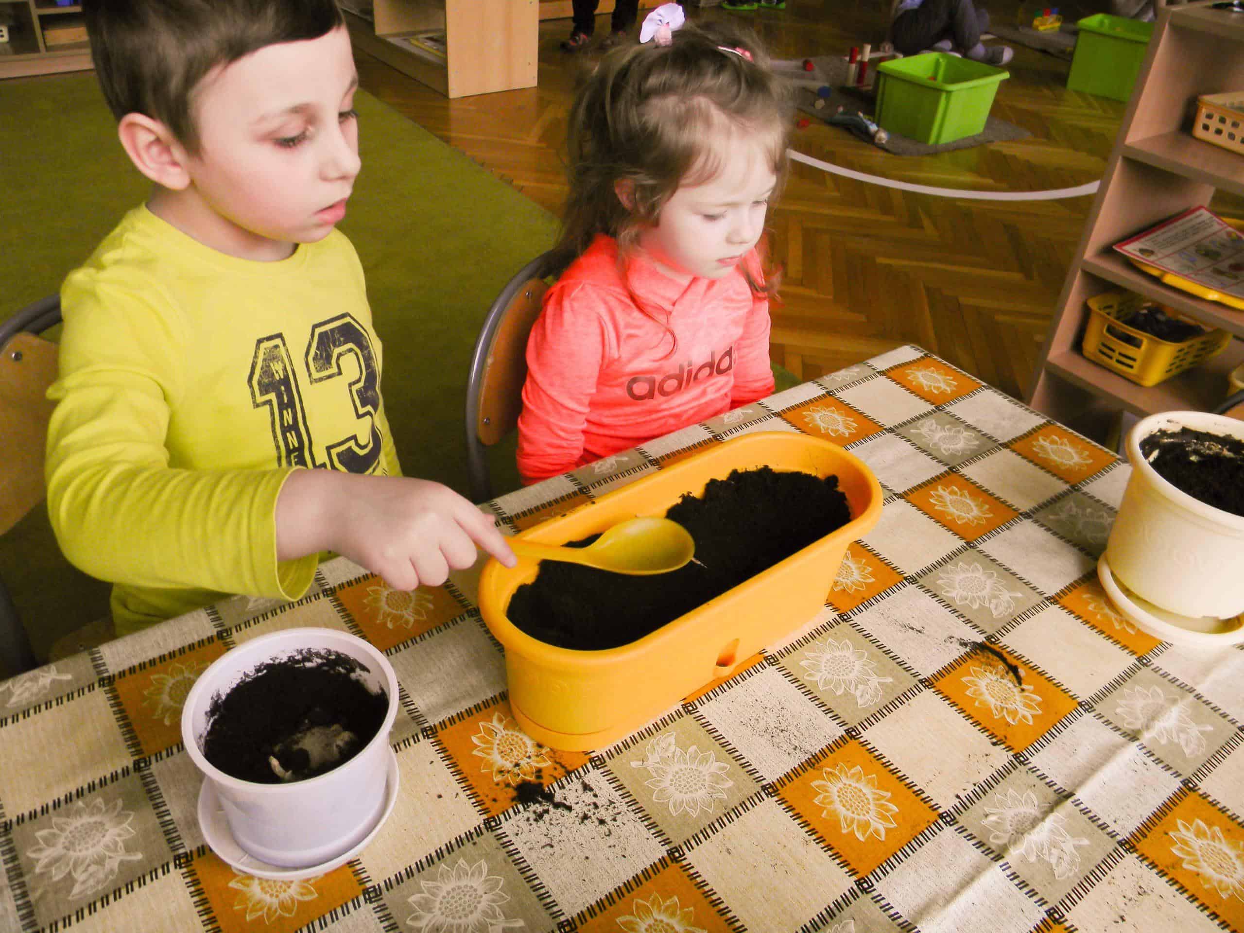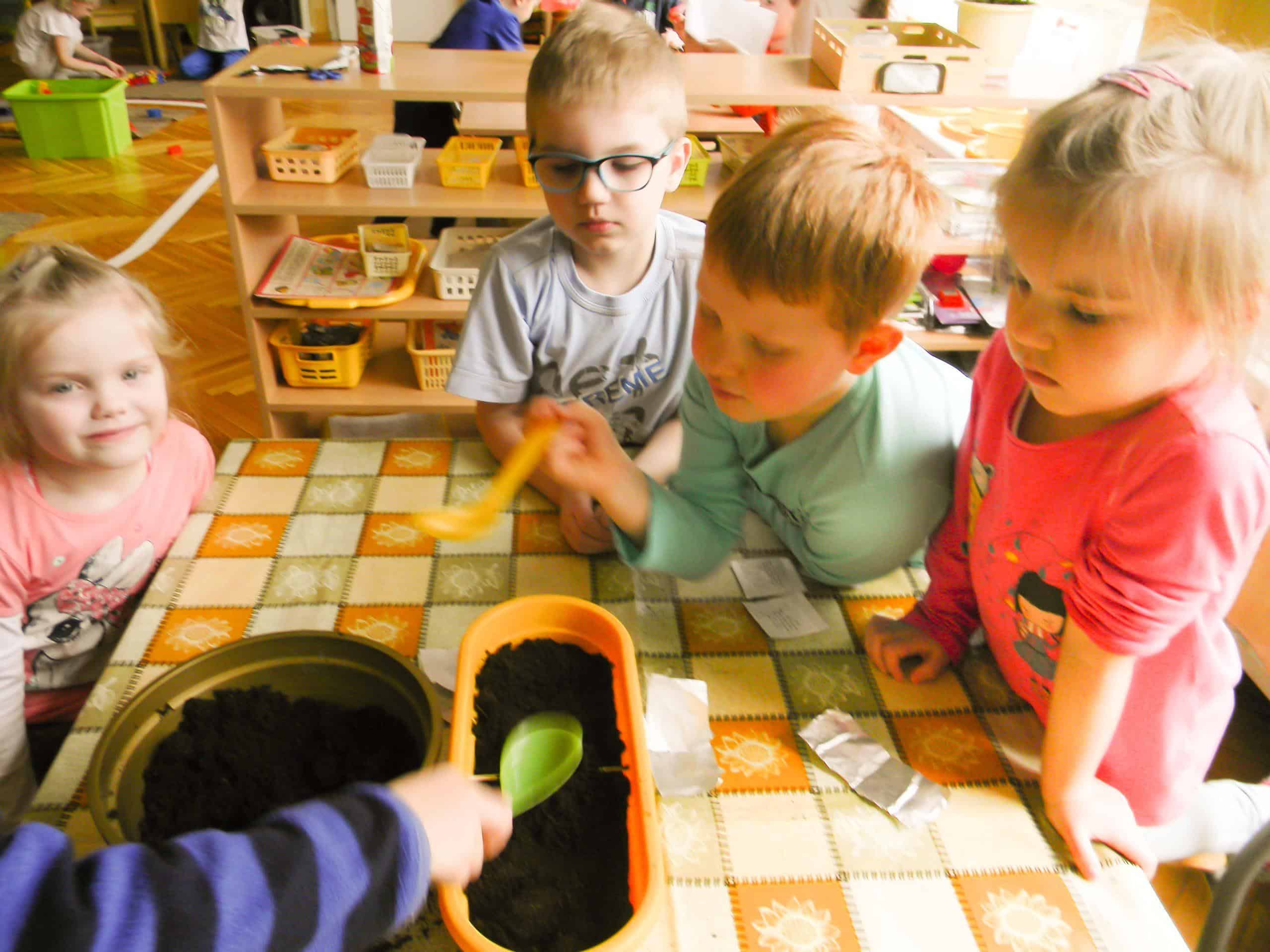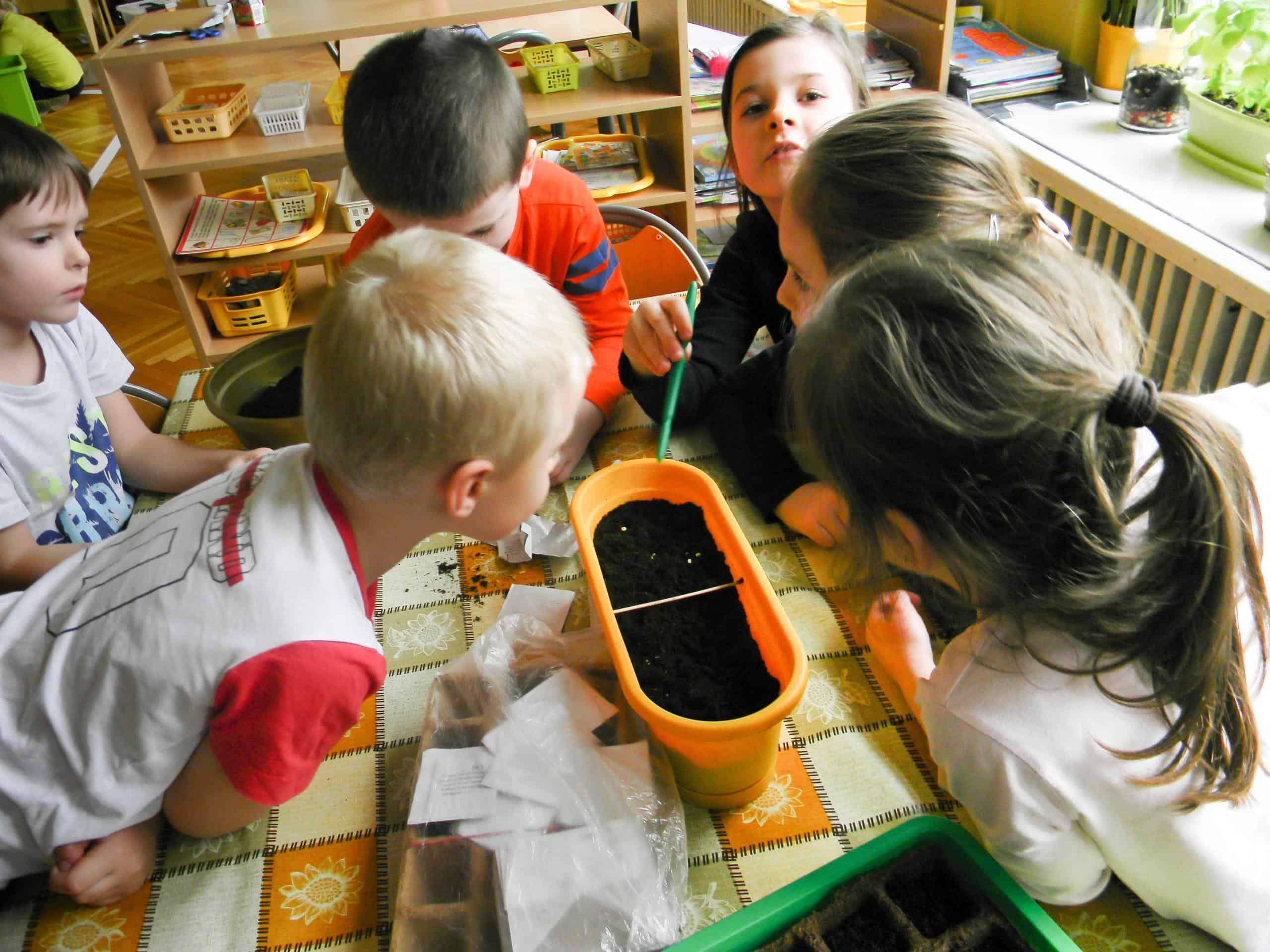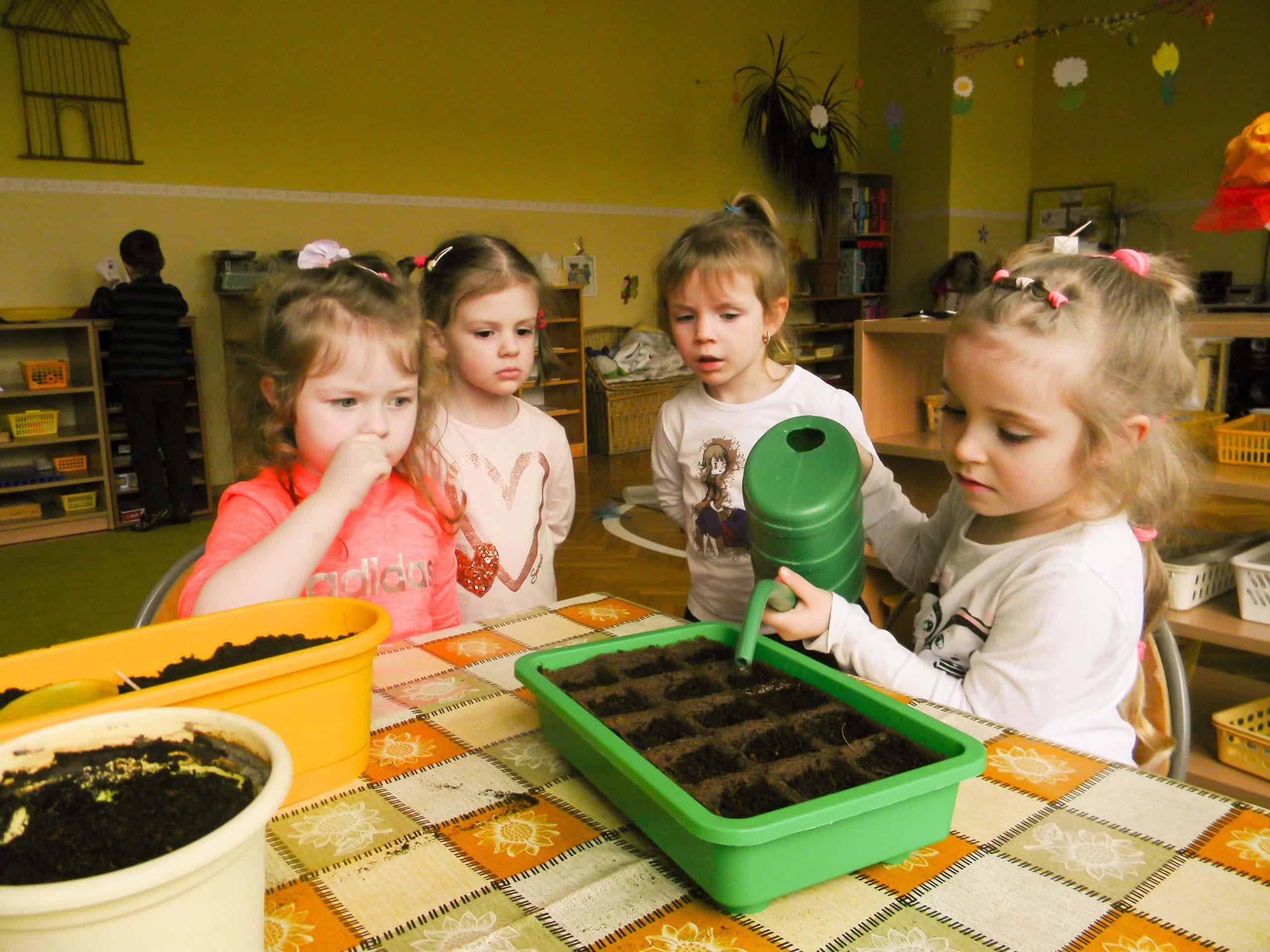 Zbliża się wiosna, a wraz z nią rozpoczną się prace na grządkach przyrodniczej ścieżki ekologicznej. Jak co roku postanowiliśmy samodzielnie przygotować sadzonki warzyw, ziół i kwiatów. Dzieci z dużym zaangażowaniem przystąpiły do sporządzenia rozsad. W tym celu, w kąciku przyrody zgromadziliśmy doniczki z ziemią, do których wysialiśmy nasiona: pomidorów, ogórków, papryki, słonecznika, cukinii, pietruszki, czosnku, fasoli, bazylii i melisy oraz posadziliśmy naszczepki pelargonii i mięty. Zajęcia przybliżyły dzieciom podstawy prac ogrodniczych, oraz nauczyły je rozróżniać różnego rodzaju nasiona i rozsady. Będziemy systematycznie pielęgnować nasze rośliny oraz obserwować ich wzrost i rozwój.