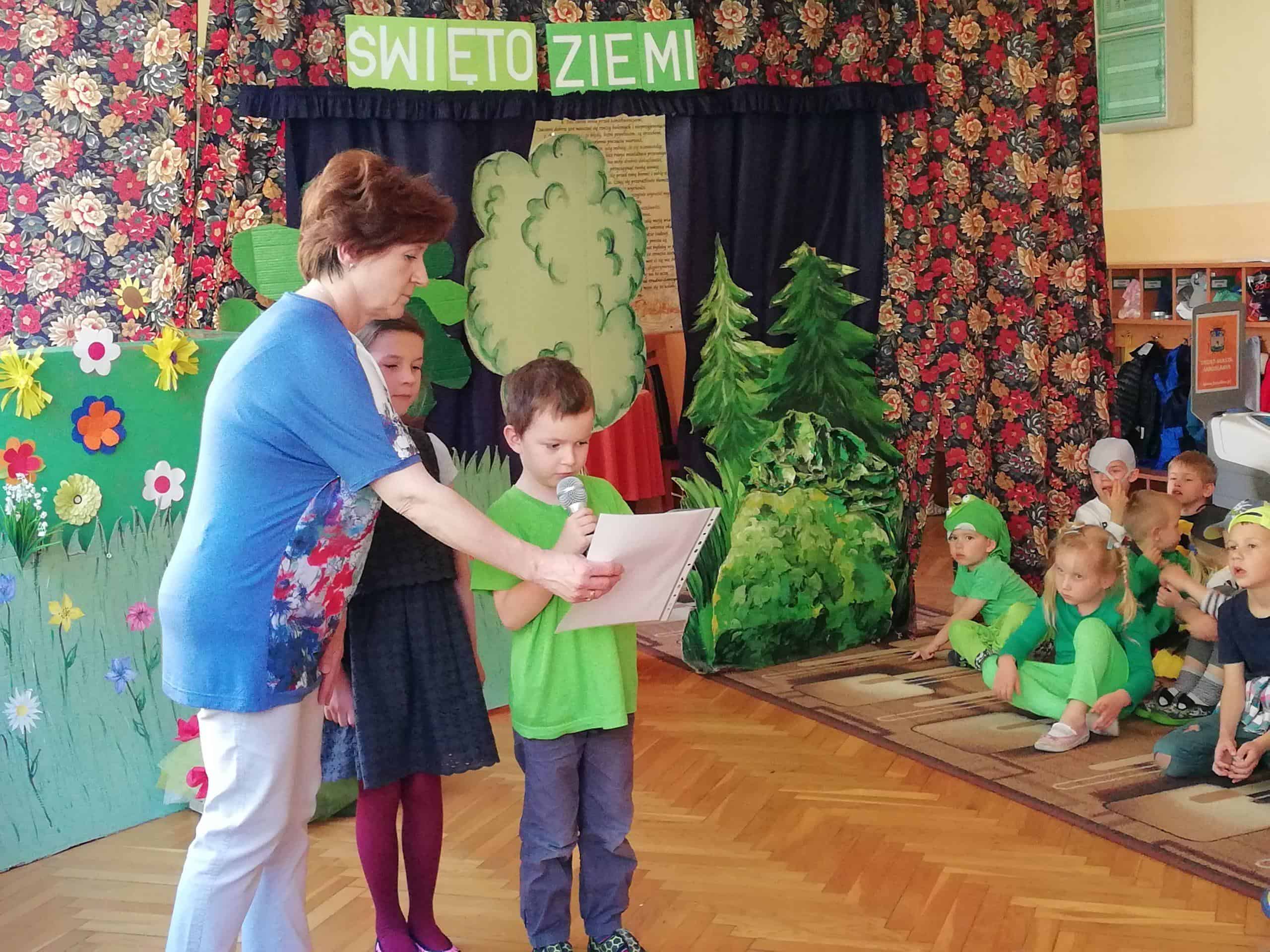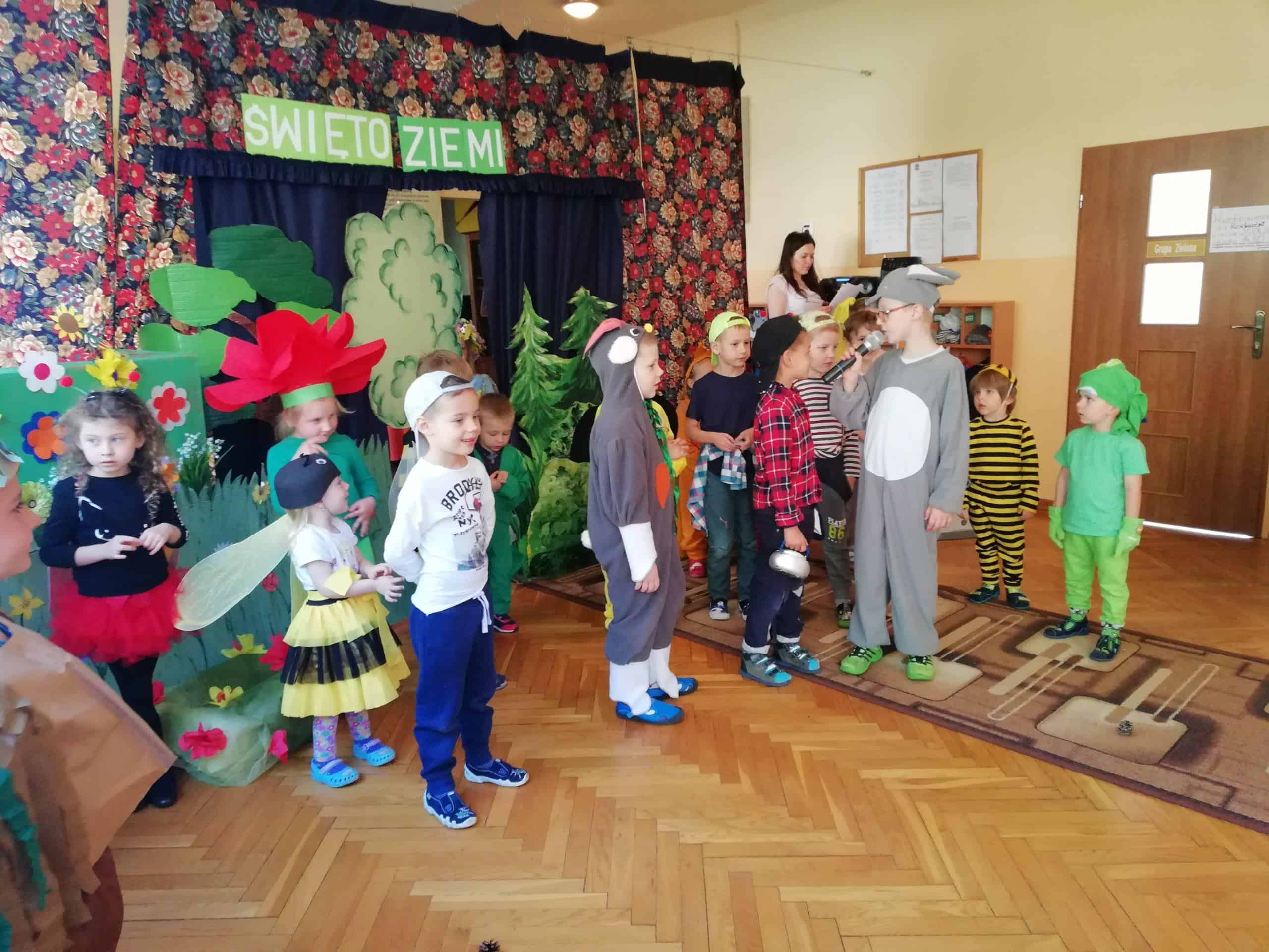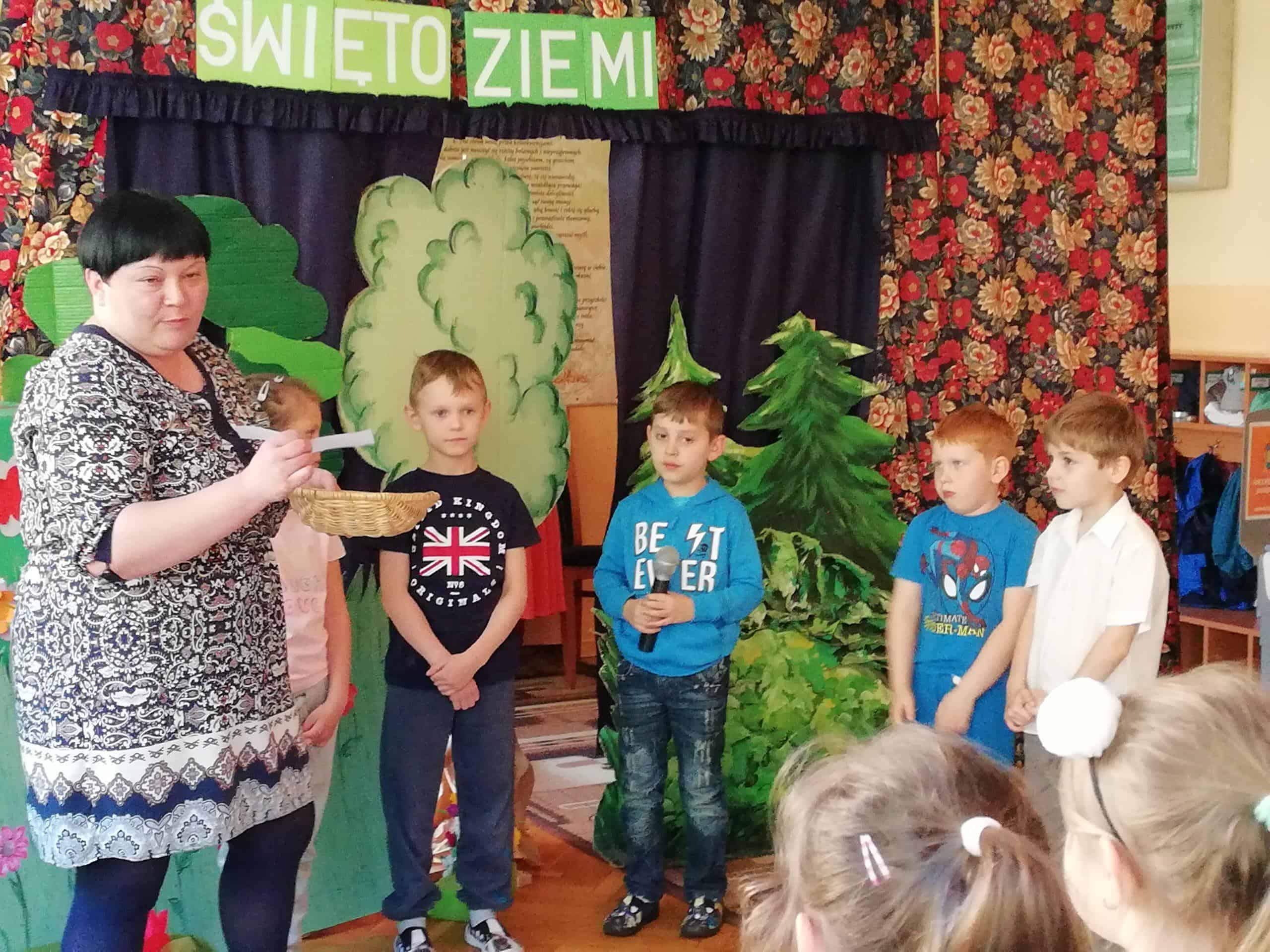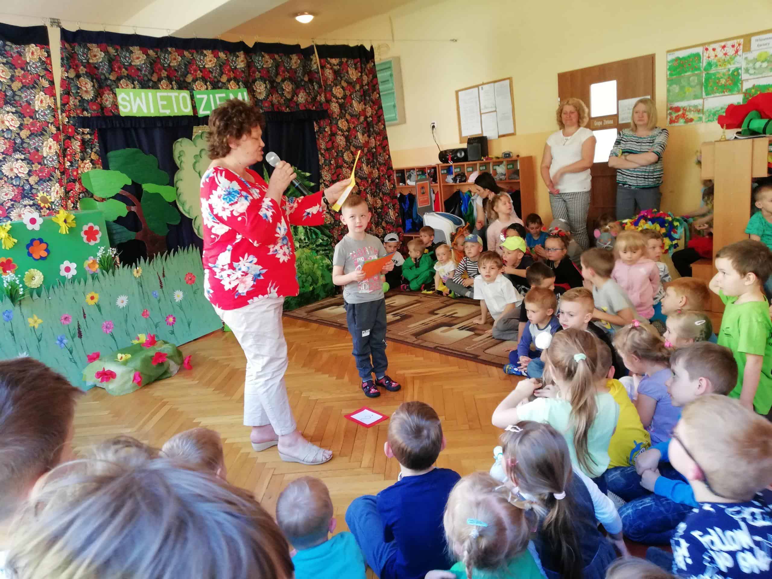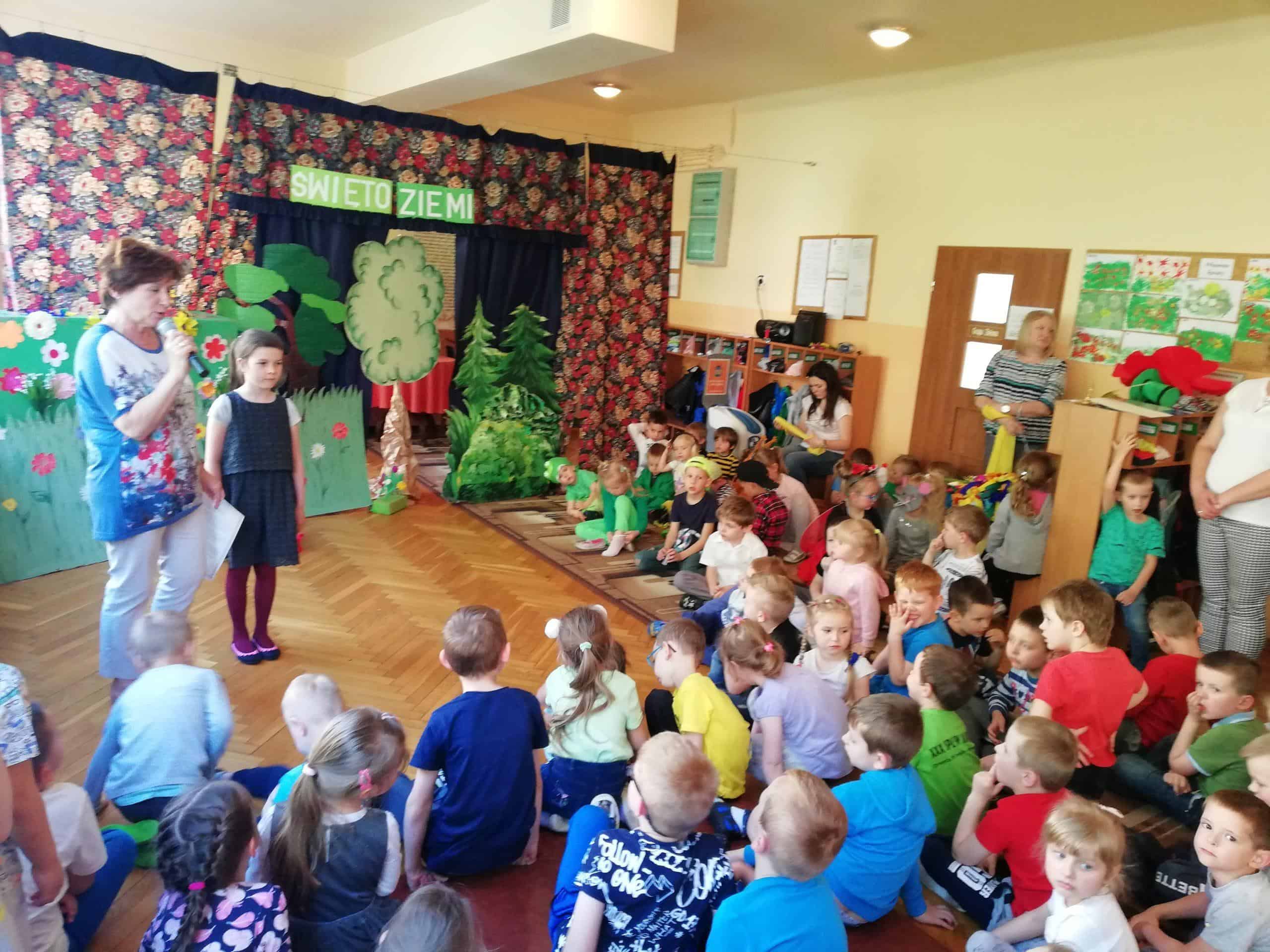 23 kwietnia obchodziliśmy w naszym przedszkolu Święto Ziemi. W tym roku każda grupa przedstawiła swój program o tematyce ekologicznej. Uroczystość rozpoczęła się inscenizacją „Ratujmy wiosnę” w wykonaniu grupy Zielonej, nad którą opiekę sprawuje pani Lidka. Dzieci pięknie ubrane, w ciekawej scenografii, udowodniły, że los przyrody nie jest im obojętny. Następnie pani Ania z grupy Czerwonej przeprowadziła grę planszową „Co wiesz o ekologii”. W tej grze zwycięzcami zostali wszyscy uczestnicy, dowodząc, że zagadnienia związane z tematem przeprowadzonych zajęć nie są im obce. Pani Renata z grupy Niebieskiej przeprowadziła quiz, podczas którego wszystkie dzieci wykazały się obszerną wiedzą ekologiczną. Pani Basia z grupy Pomarańczowej zapoznała nas z ekosystemem łąki, dzięki czemu poznaliśmy wiele żyjących na niej zwierząt i owadów, oraz występujących tam roślin. Dzieci z grupy Żółtej, pod opieką pani Marty, odczytały list Ziemi do dzieci, w którym nasza planeta żaliła się na krzywdy, jakie wyrządzają jej ludzie. Następnie przedszkolaki złożyły ślubowanie „miłośników przyrody”. Na zakończenie spotkania wszystkie grupy otrzymały dyplomy za wiedzę o tematyce ekologicznej oraz podziękowania za włączenie się do obchodów Święta Ziemi.