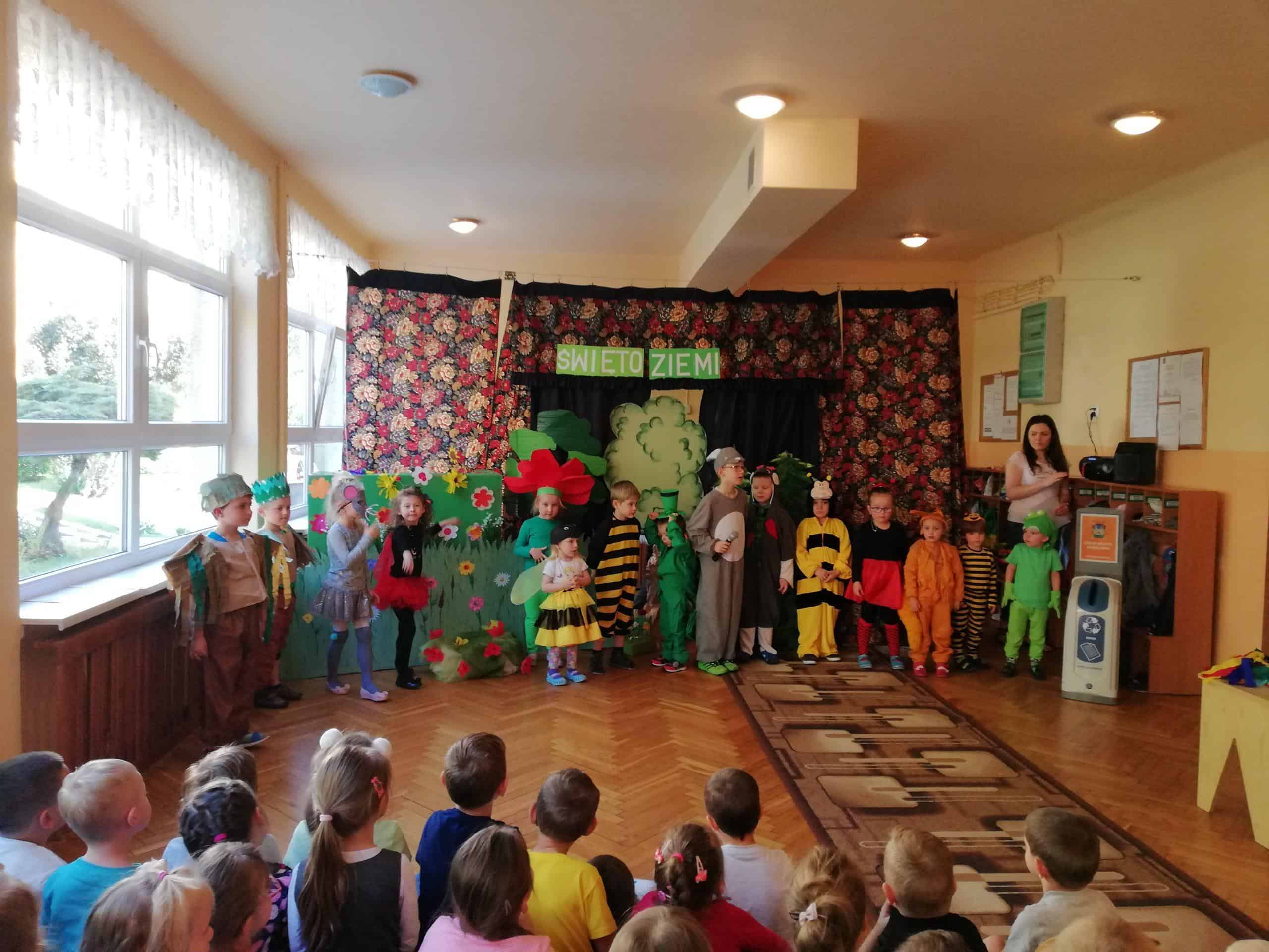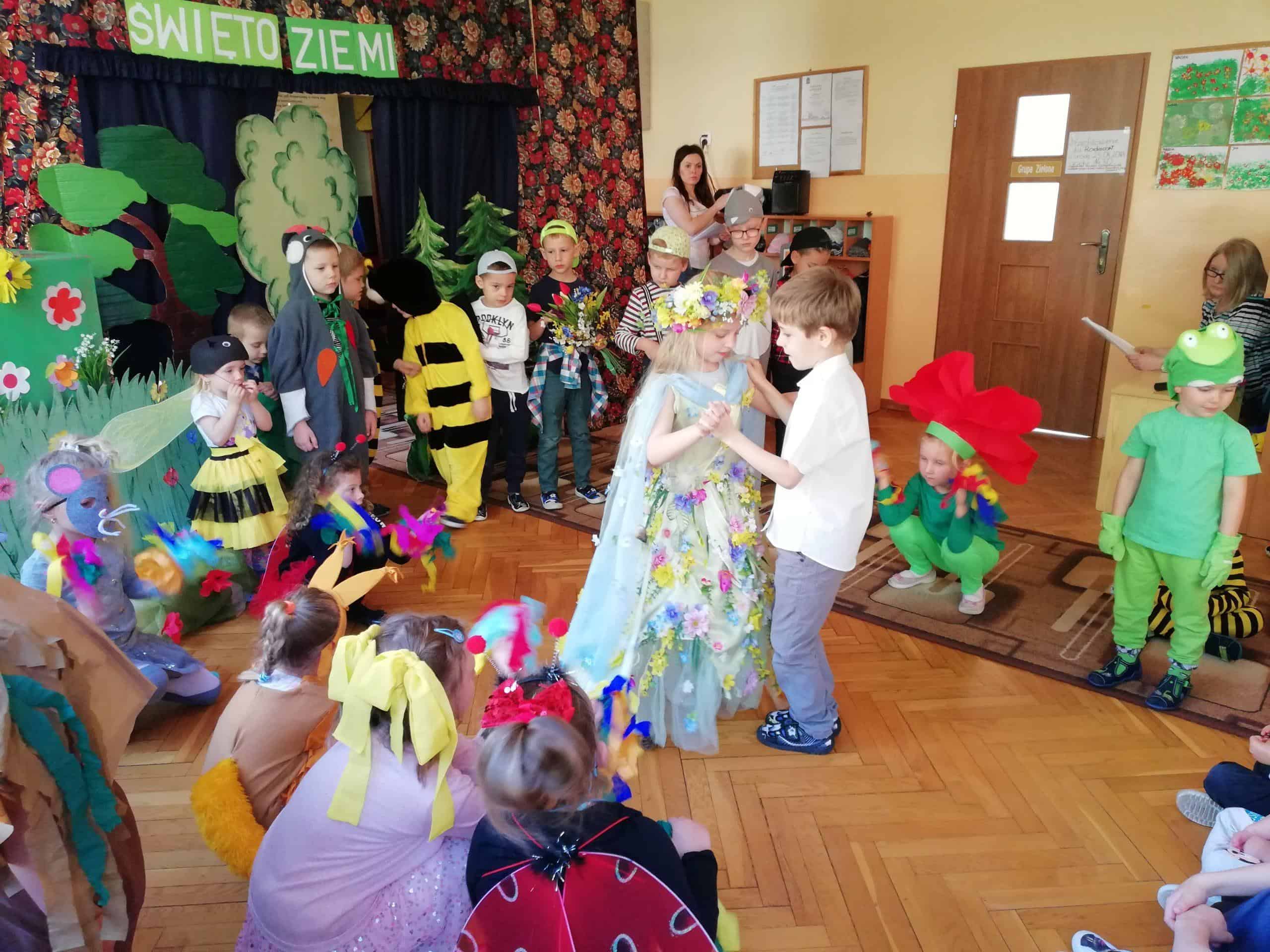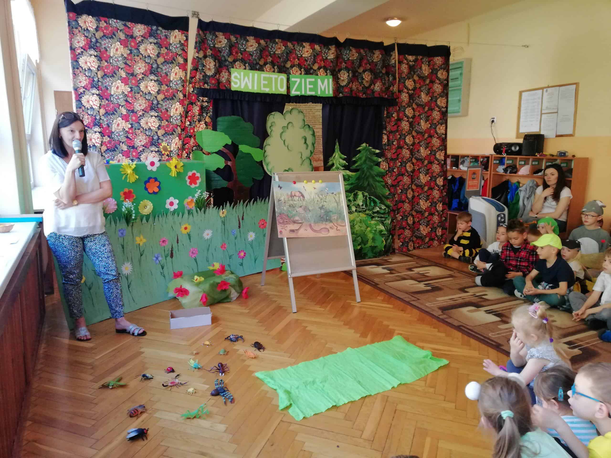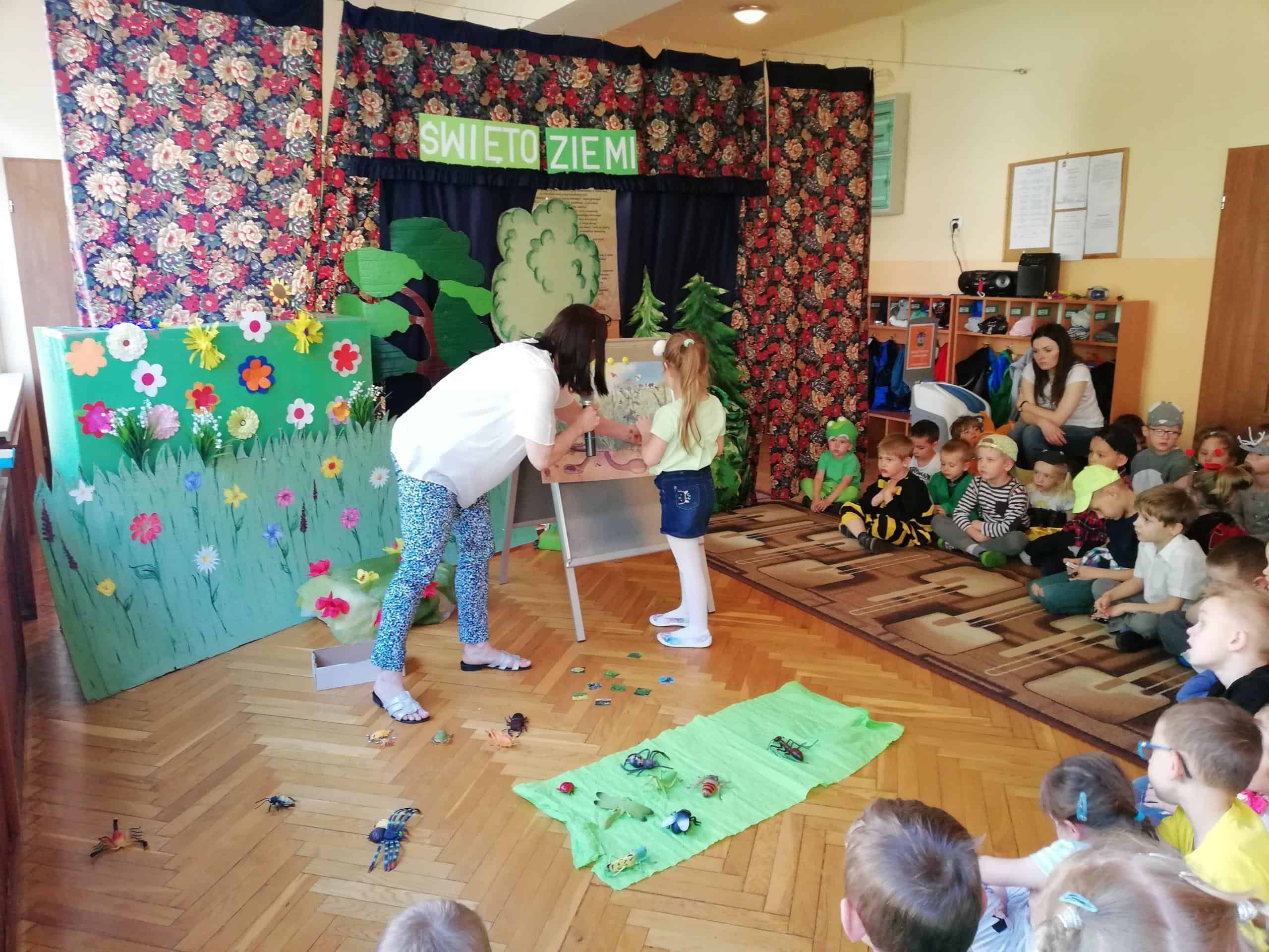 23 kwietnia obchodziliśmy w naszym przedszkolu Święto Ziemi. W tym roku każda grupa przedstawiła swój program o tematyce ekologicznej. Uroczystość rozpoczęła się inscenizacją „Ratujmy wiosnę” w wykonaniu grupy Zielonej, nad którą opiekę sprawuje pani Lidka. Dzieci pięknie ubrane, w ciekawej scenografii, udowodniły, że los przyrody nie jest im obojętny. Następnie pani Ania z grupy Czerwonej przeprowadziła grę planszową „Co wiesz o ekologii”. W tej grze zwycięzcami zostali wszyscy uczestnicy, dowodząc, że zagadnienia związane z tematem przeprowadzonych zajęć nie są im obce. Pani Renata z grupy Niebieskiej przeprowadziła quiz, podczas którego wszystkie dzieci wykazały się obszerną wiedzą ekologiczną. Pani Basia z grupy Pomarańczowej zapoznała nas z ekosystemem łąki, dzięki czemu poznaliśmy wiele żyjących na niej zwierząt i owadów, oraz występujących tam roślin. Dzieci z grupy Żółtej, pod opieką pani Marty, odczytały list Ziemi do dzieci, w którym nasza planeta żaliła się na krzywdy, jakie wyrządzają jej ludzie. Następnie przedszkolaki złożyły ślubowanie „miłośników przyrody”. Na zakończenie spotkania wszystkie grupy otrzymały dyplomy za wiedzę o tematyce ekologicznej oraz podziękowania za włączenie się do obchodów Święta Ziemi.