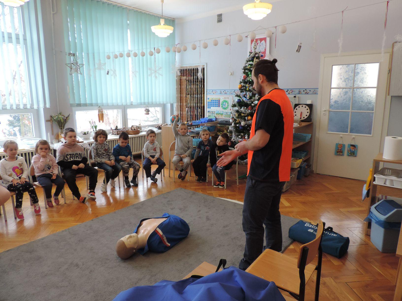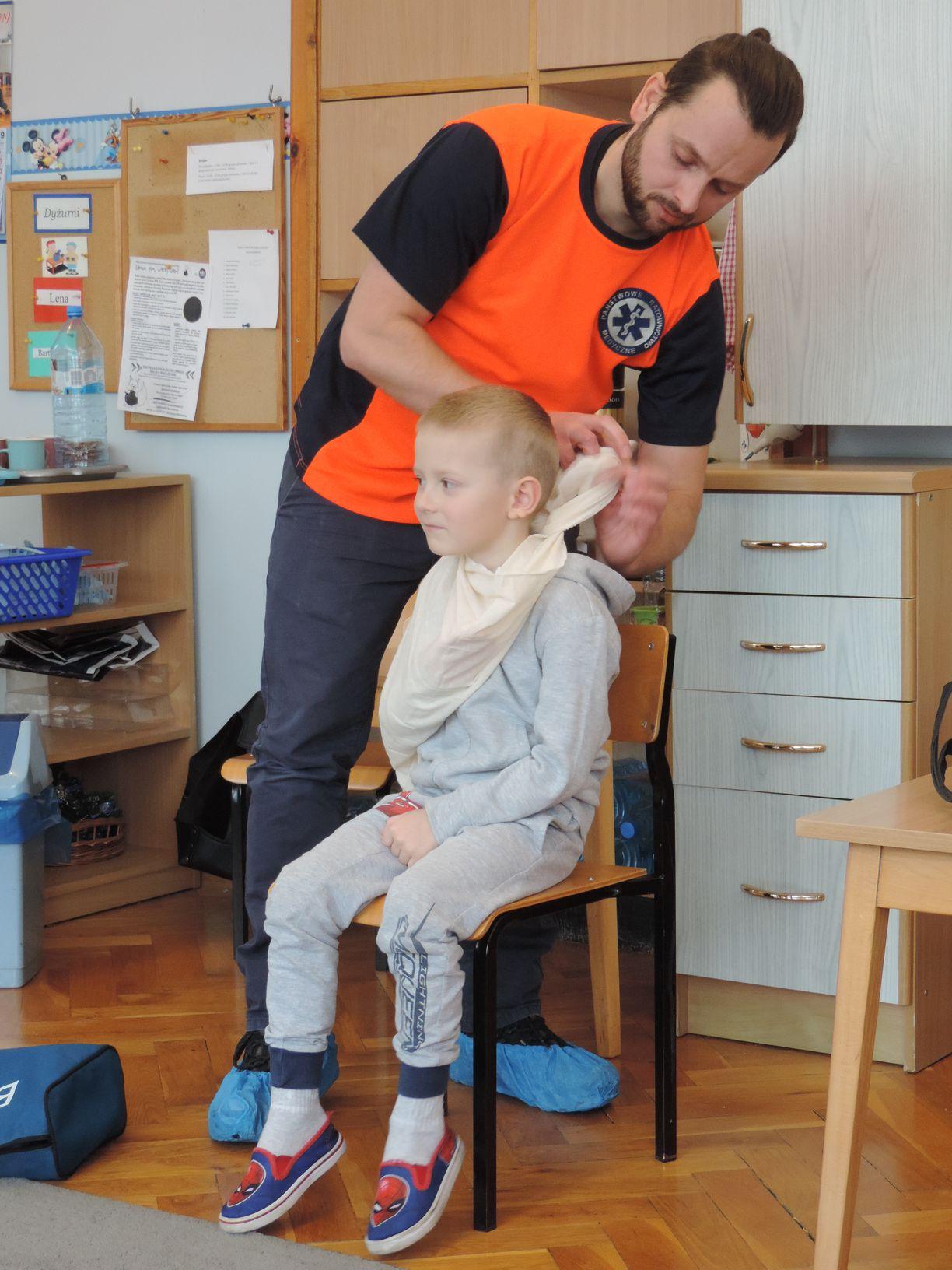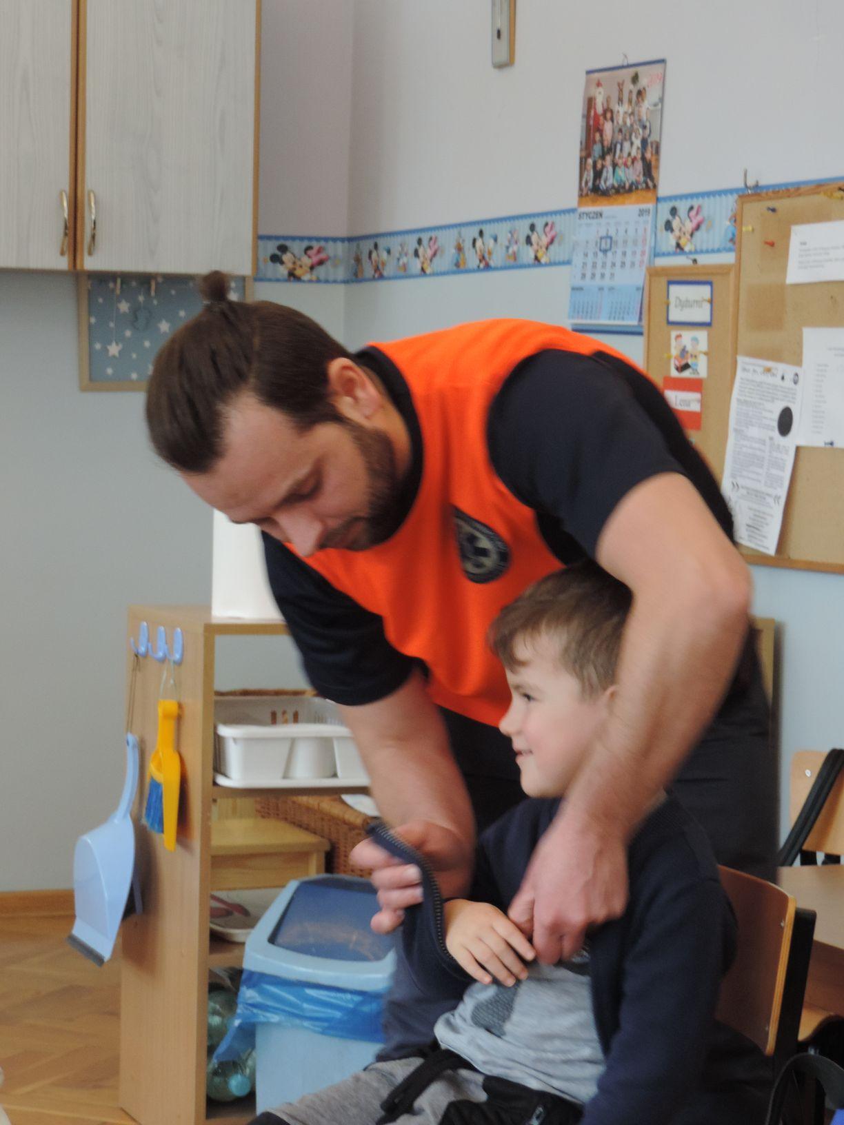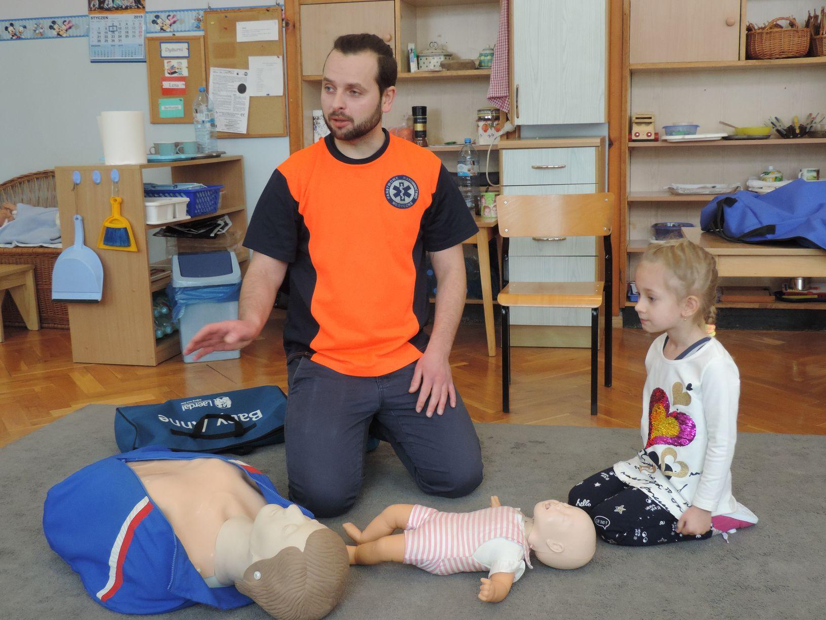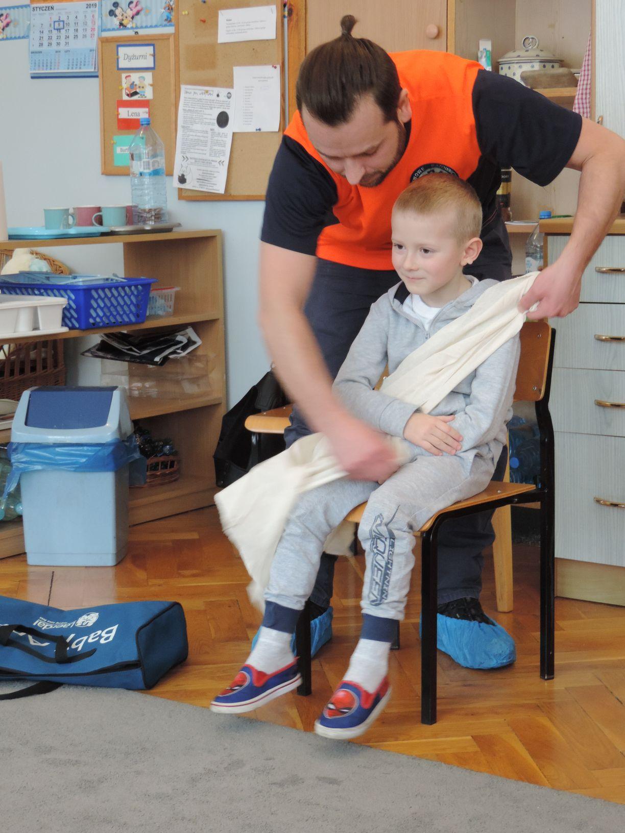 Coraz częściej słyszy się o odpowiedzialnych postawach dzieci w sytuacjach zagrożeń zdrowia innych osób. To efekt edukacji w zakresie niesienia pomocy. Istnieje powszechne przekonanie o potrzebie stwarzania sytuacji, w których najmłodsi mogą poznać zagadnienia związane z ratownictwem. Jeśli treści teoretyczne przekazywane przez dorosłych zostają wzbogacone o pokaz, dzieci łatwiej je zapamiętują. Stąd spotkanie dzieci z grupy Niebieskiej z ratownikiem medycznym, panem Arturem Kitlińskim.