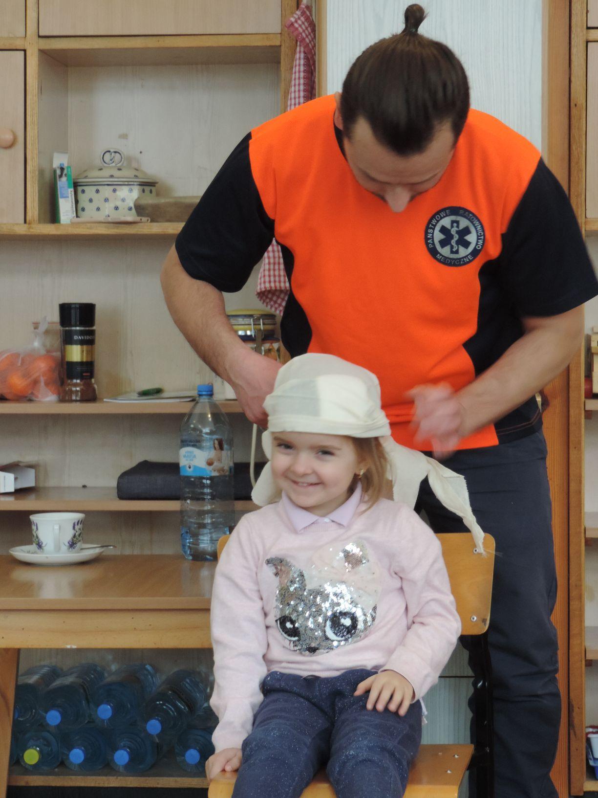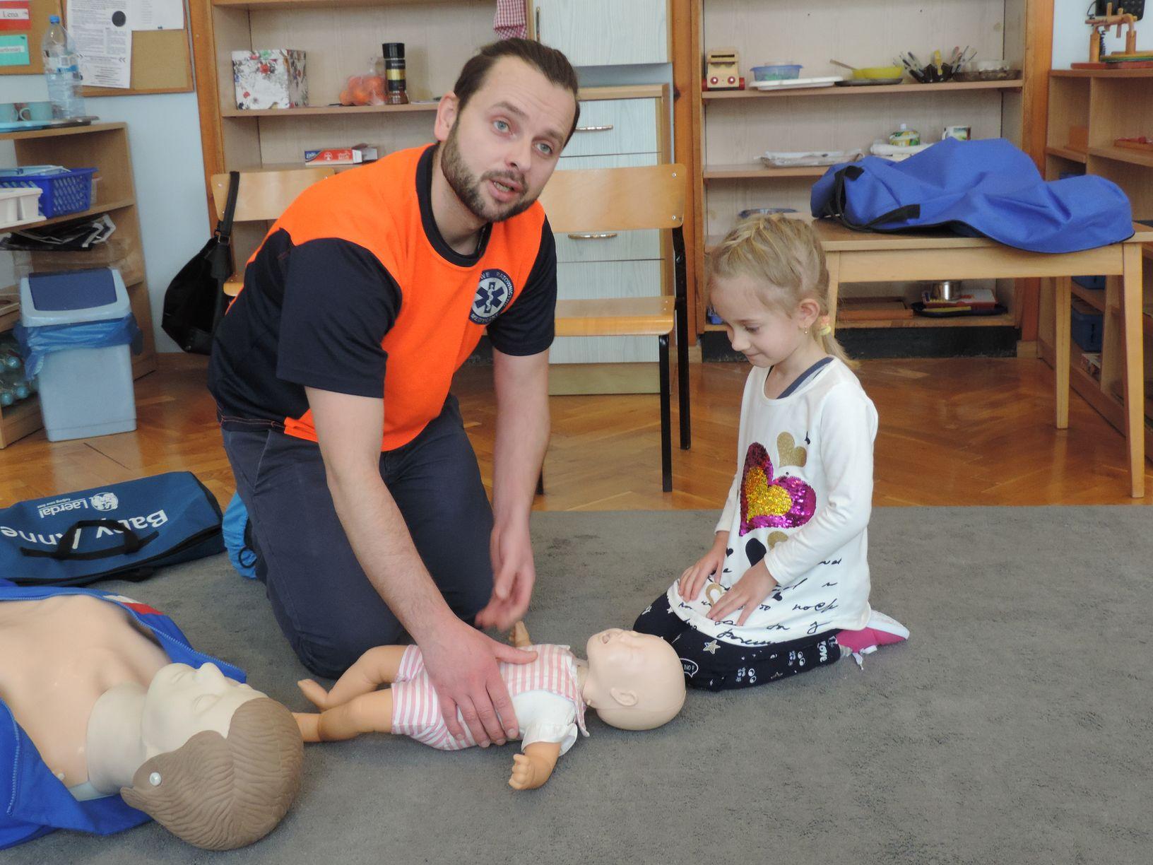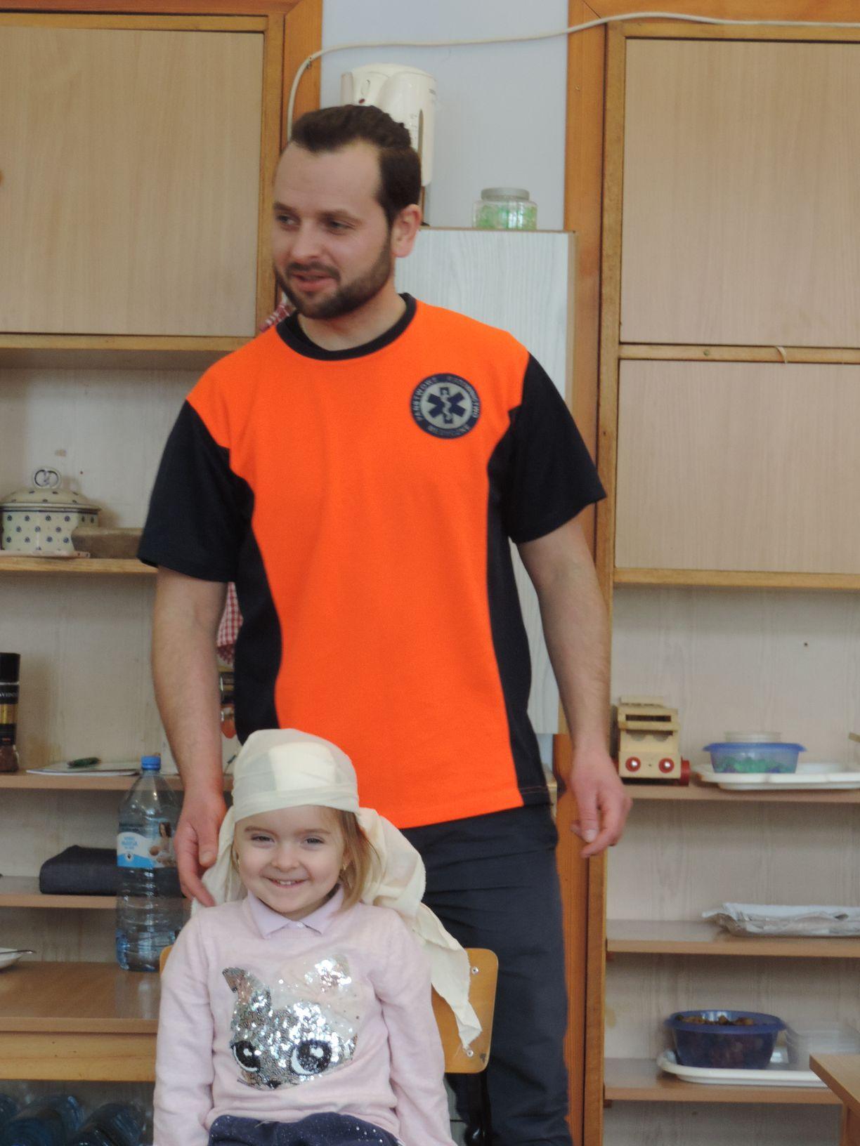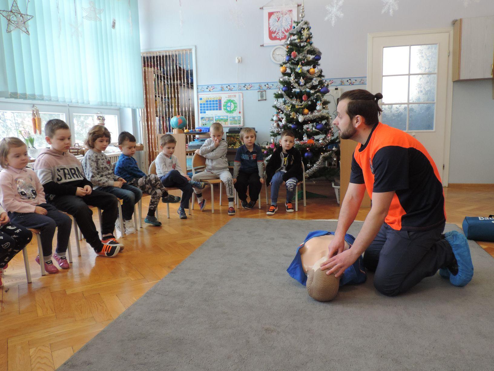 Coraz częściej słyszy się o odpowiedzialnych postawach dzieci w sytuacjach zagrożeń zdrowia innych osób. To efekt edukacji w zakresie niesienia pomocy. Istnieje powszechne przekonanie o potrzebie stwarzania sytuacji, w których najmłodsi mogą poznać zagadnienia związane z ratownictwem. Jeśli treści teoretyczne przekazywane przez dorosłych zostają wzbogacone o pokaz, dzieci łatwiej je zapamiętują. Stąd spotkanie dzieci z grupy Niebieskiej z ratownikiem medycznym, panem Arturem Kitlińskim.