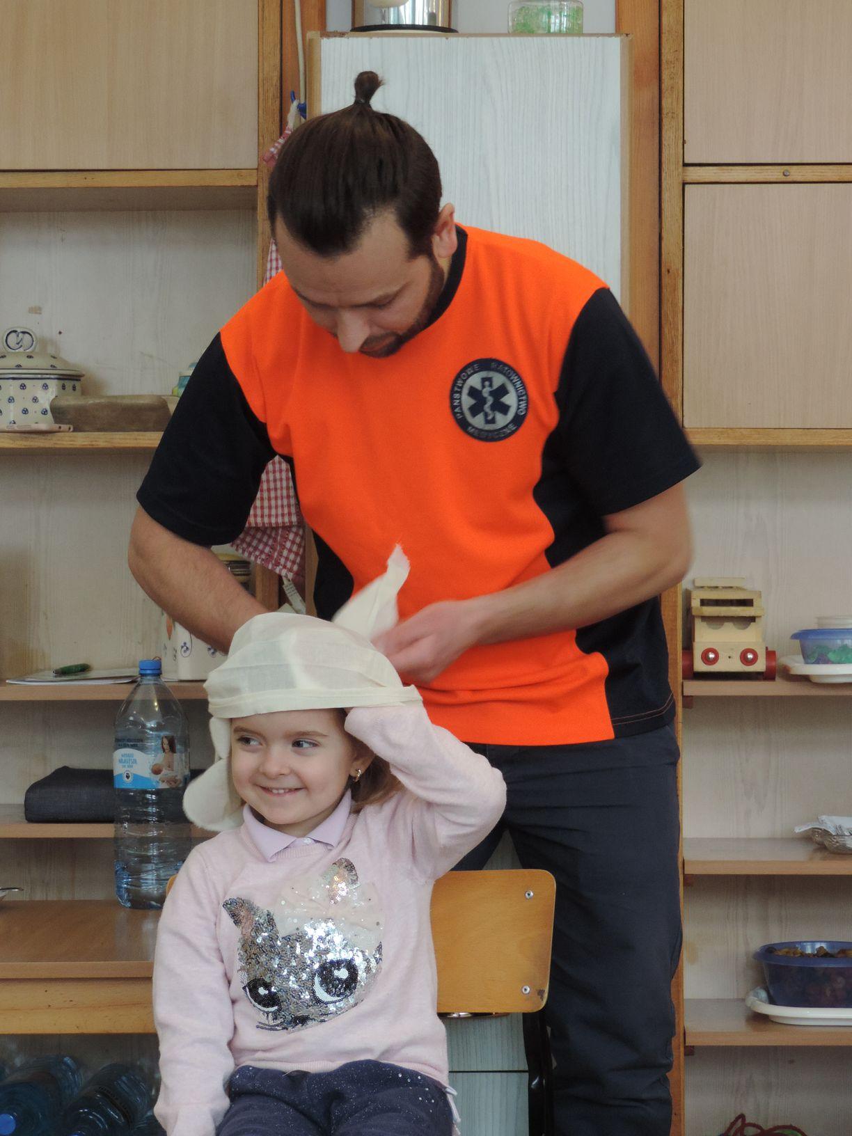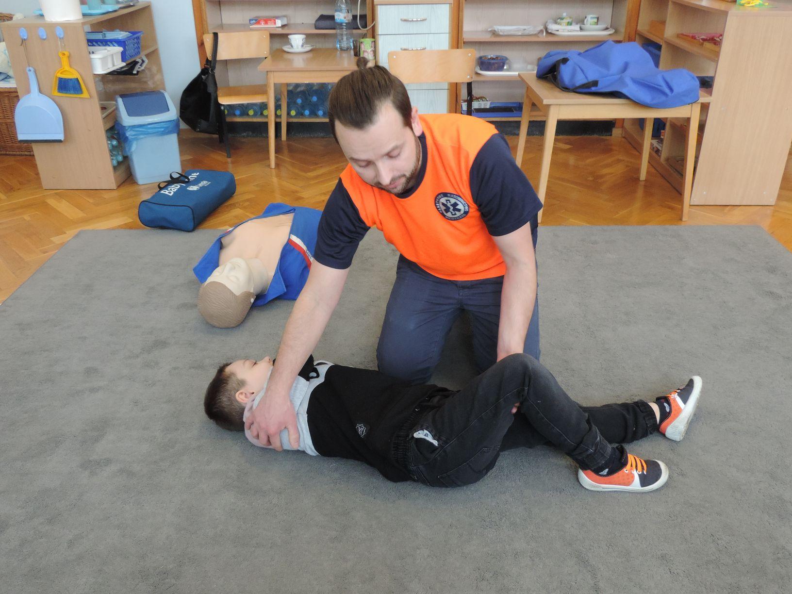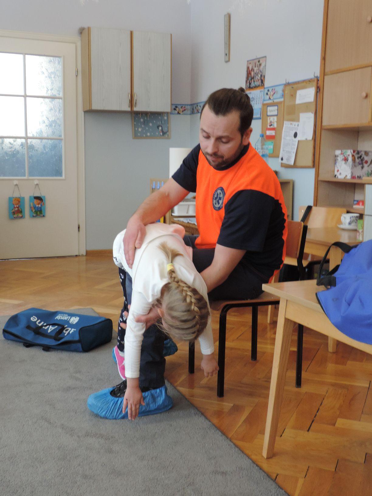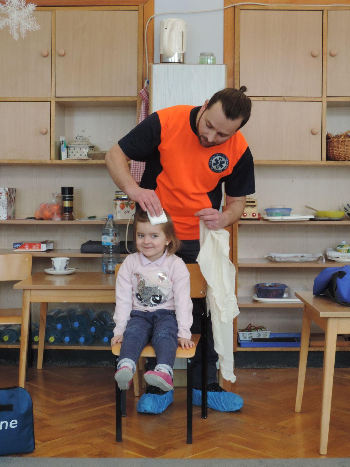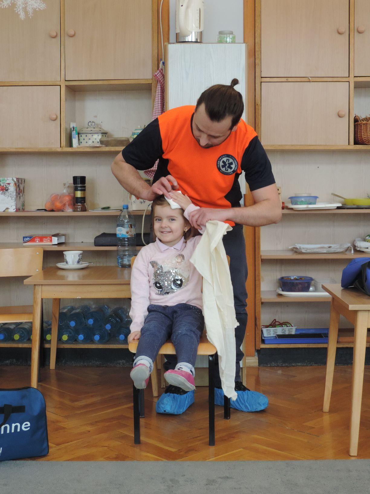 Coraz częściej słyszy się o odpowiedzialnych postawach dzieci w sytuacjach zagrożeń zdrowia innych osób. To efekt edukacji w zakresie niesienia pomocy. Istnieje powszechne przekonanie o potrzebie stwarzania sytuacji, w których najmłodsi mogą poznać zagadnienia związane z ratownictwem. Jeśli treści teoretyczne przekazywane przez dorosłych zostają wzbogacone o pokaz, dzieci łatwiej je zapamiętują. Stąd spotkanie dzieci z grupy Niebieskiej z ratownikiem medycznym, panem Arturem Kitlińskim.