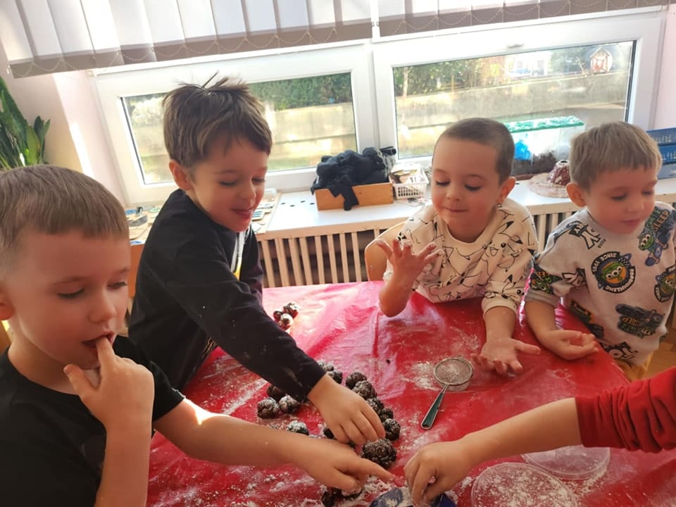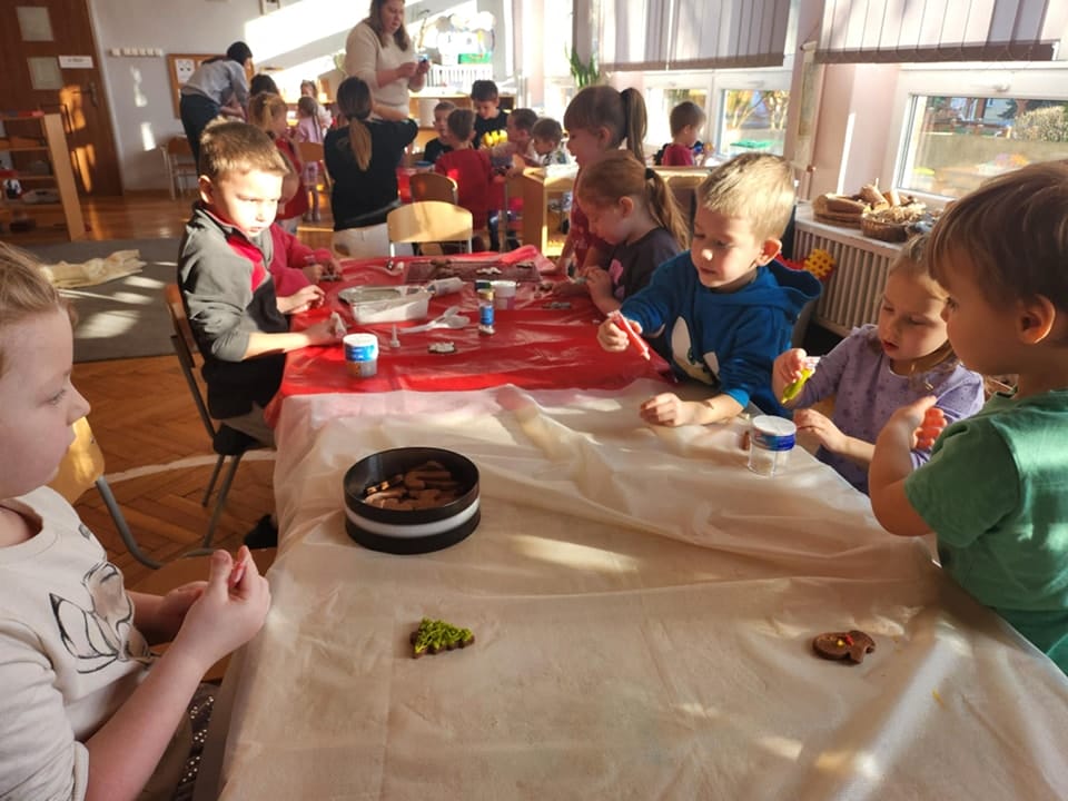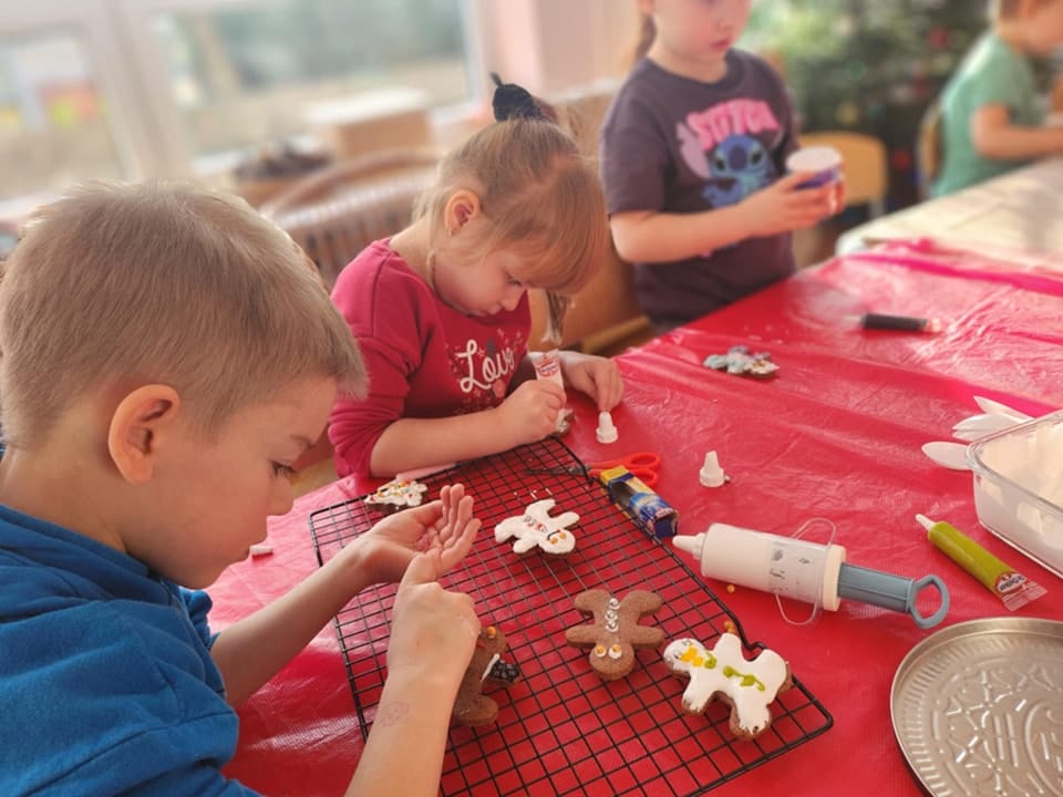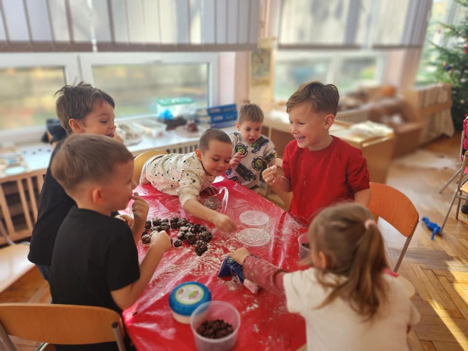 Pani Ewa w bardzo przemyślany sposób zorganizowała stanowiska pracy. Dzieci podzielone były na zespoły. Jedna grupa dekorowała już upieczone pierniczki. Druga robiła czekoladowe szyszki, a trzecia grupa orzeszki. Zajęcia cukiernicze sprawiły dzieciom dużo radości. To było bardzo pracowite przedpołudnie. Zarówno dziewczynki jak i chłopcy byli bardzo zaangażowani w proponowane działania. Wykonane ciasteczka będą słodkim poczęstunkiem na grupowej Wigilii. Pani Ewo dziękujemy za wspaniale przygotowane warsztaty.