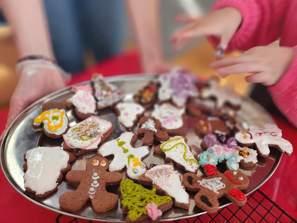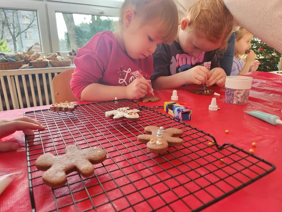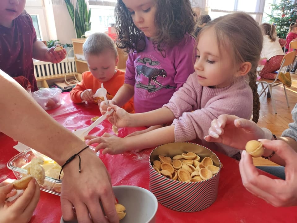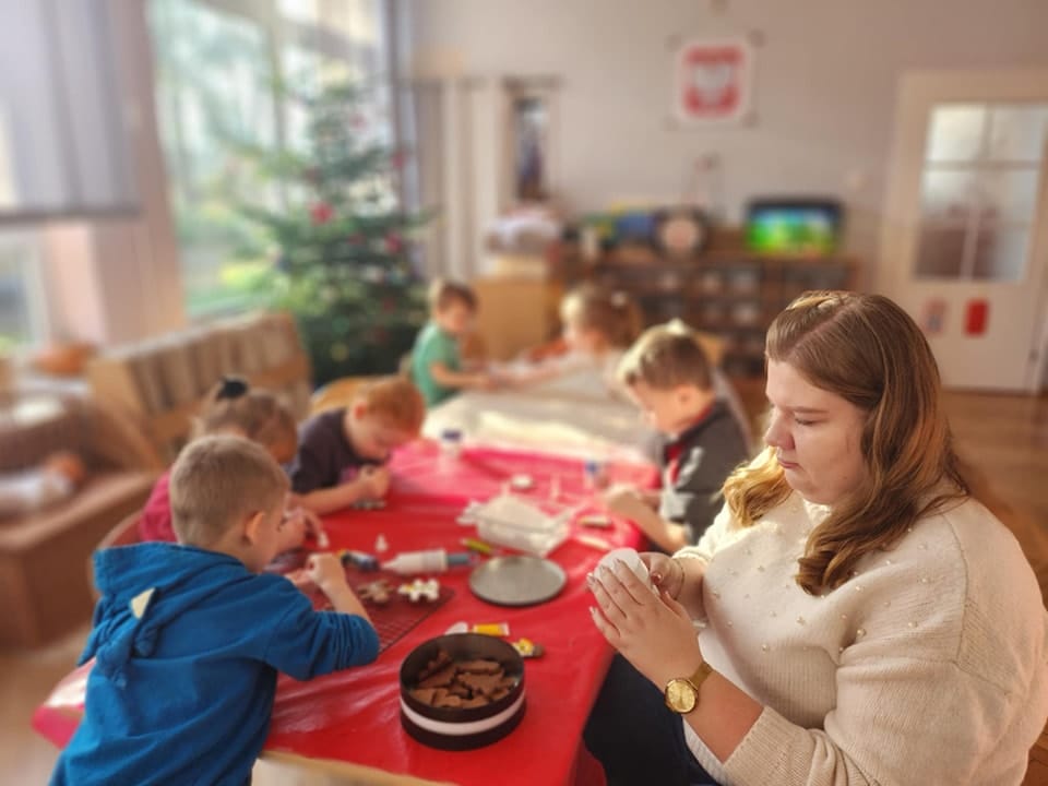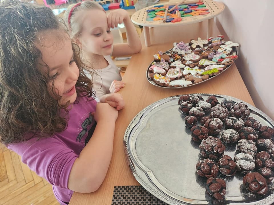 Pani Ewa w bardzo przemyślany sposób zorganizowała stanowiska pracy. Dzieci podzielone były na zespoły. Jedna grupa dekorowała już upieczone pierniczki. Druga robiła czekoladowe szyszki, a trzecia grupa orzeszki. Zajęcia cukiernicze sprawiły dzieciom dużo radości. To było bardzo pracowite przedpołudnie. Zarówno dziewczynki jak i chłopcy byli bardzo zaangażowani w proponowane działania. Wykonane ciasteczka będą słodkim poczęstunkiem na grupowej Wigilii. Pani Ewo dziękujemy za wspaniale przygotowane warsztaty.
