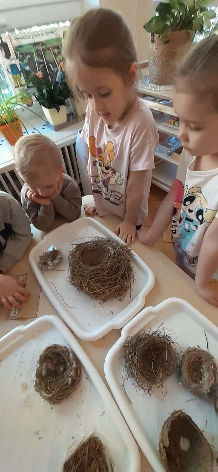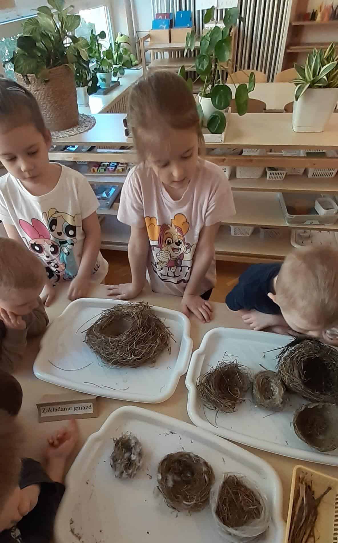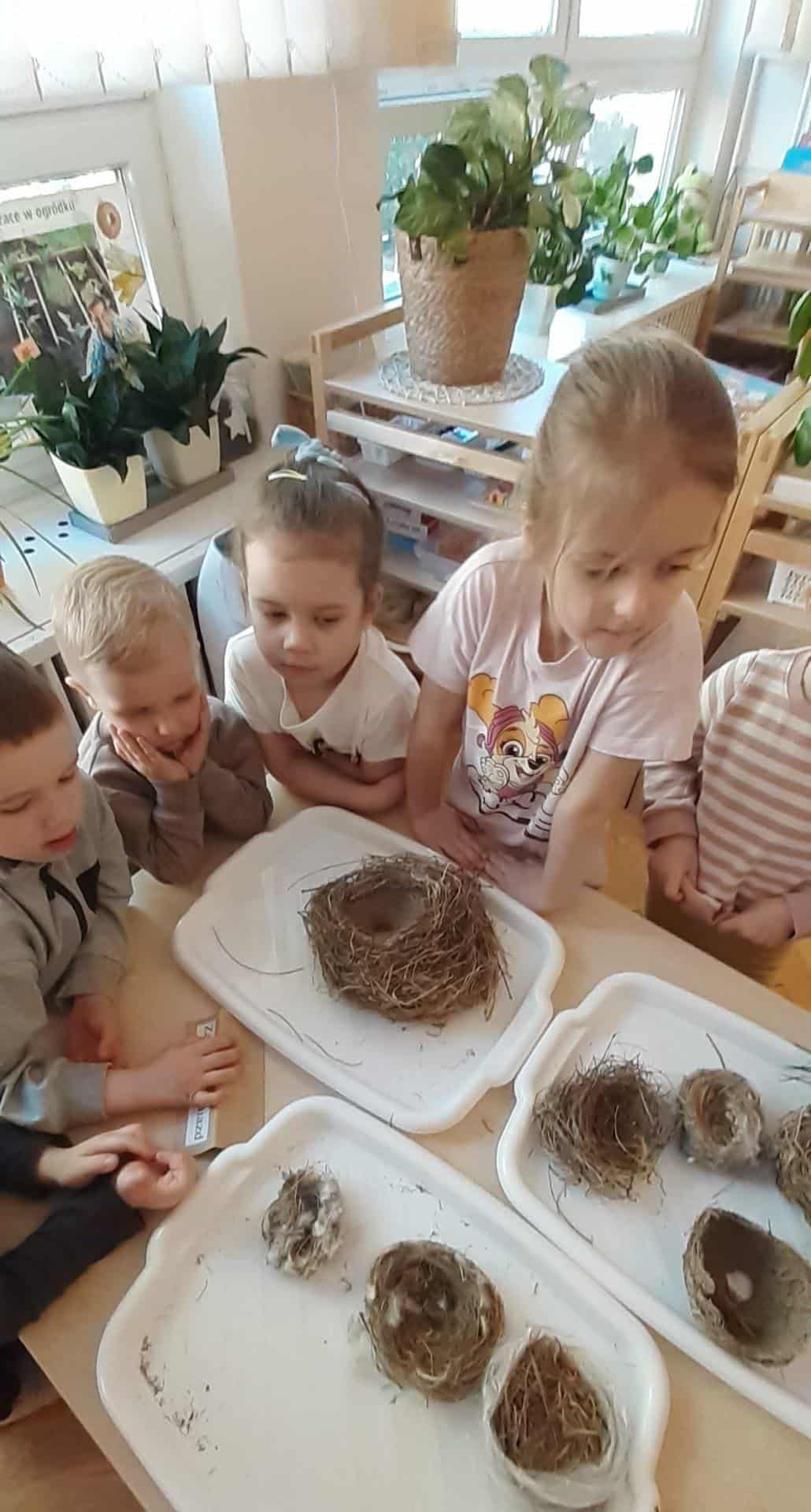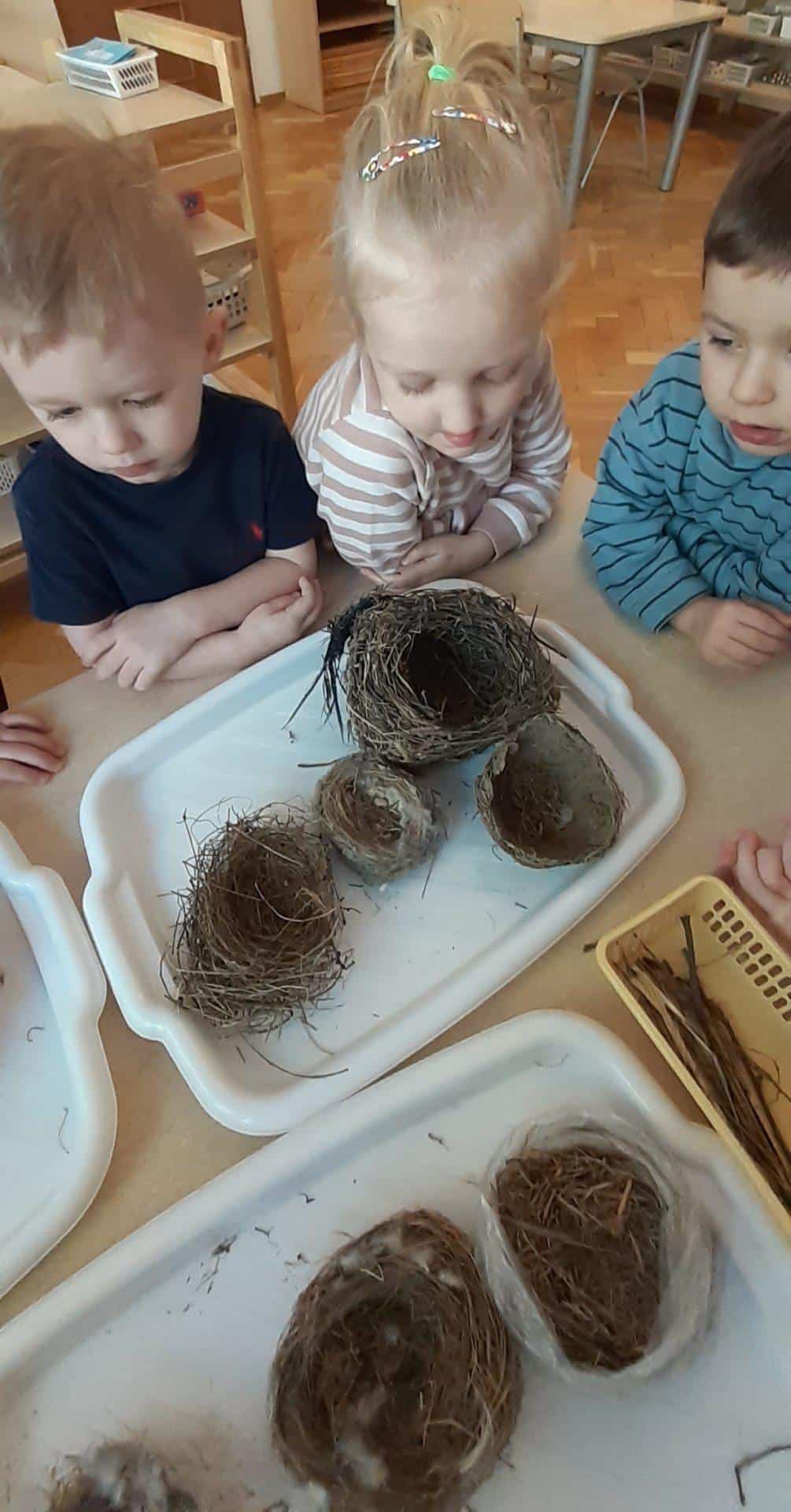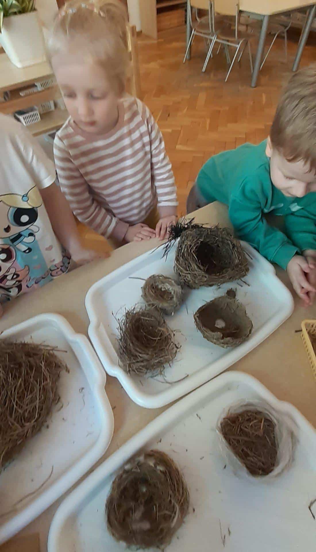 Gromadzenie wiedzy o ptakach przylatujących na wiosnę, o okresie godowym, opiece nad potomstwem i nauce latania. Budowa gniazda i oglądanie kolekcji autentycznych gniazd różnych gatunków ptaków. Ciekawostki o ptasich jajach i aktywność plastyczna „Siedzi ptaszek na gałązce…” inspirowana wierszem i doświadczeniami dzieci z ornitologicznych obserwacji.