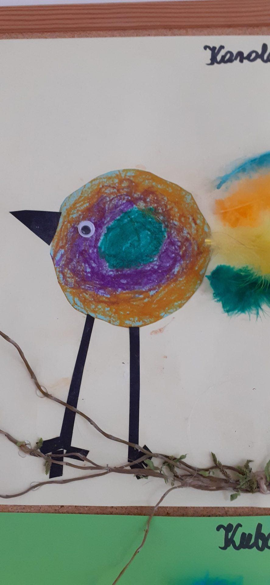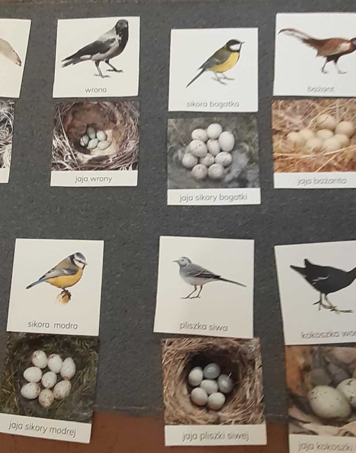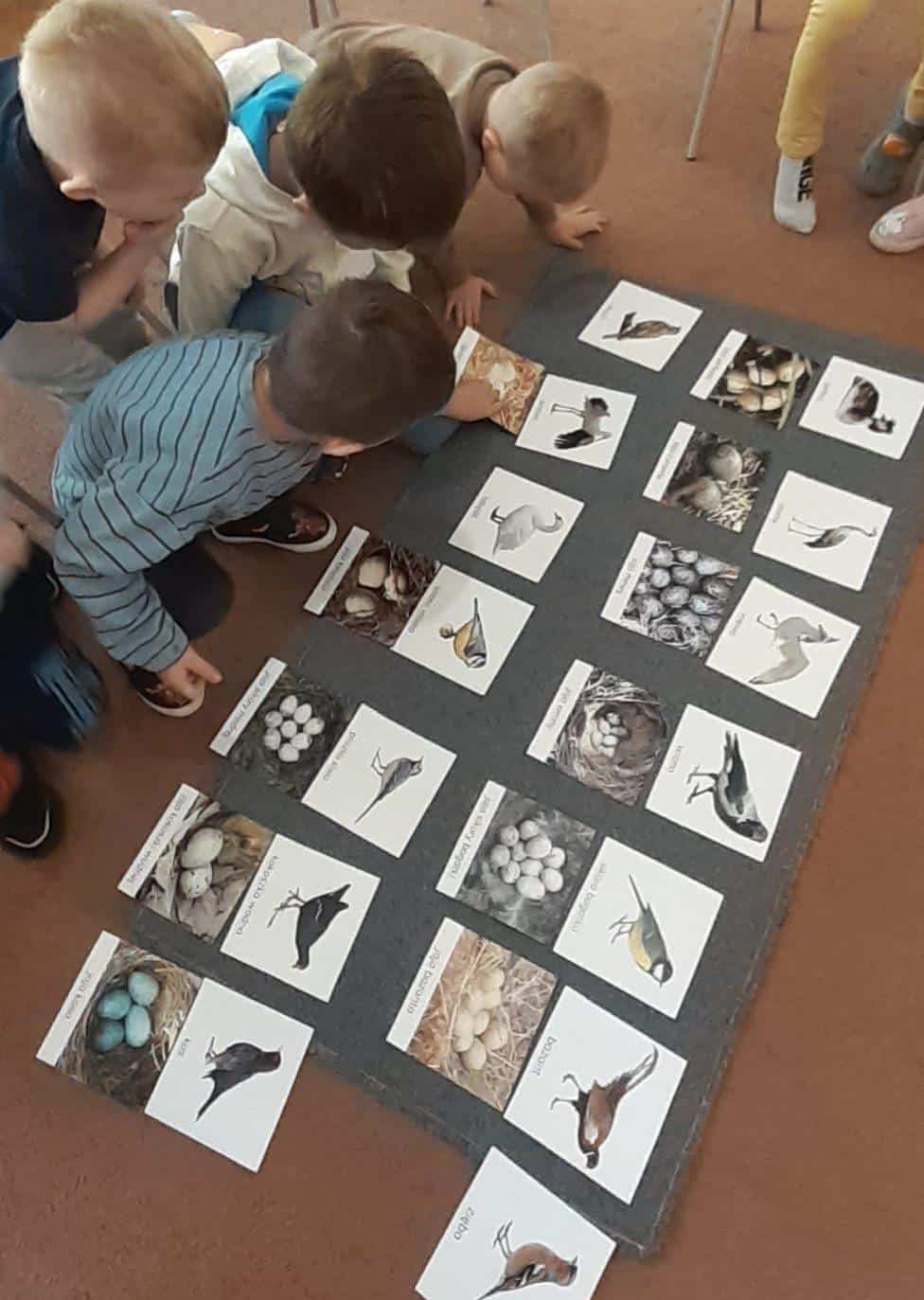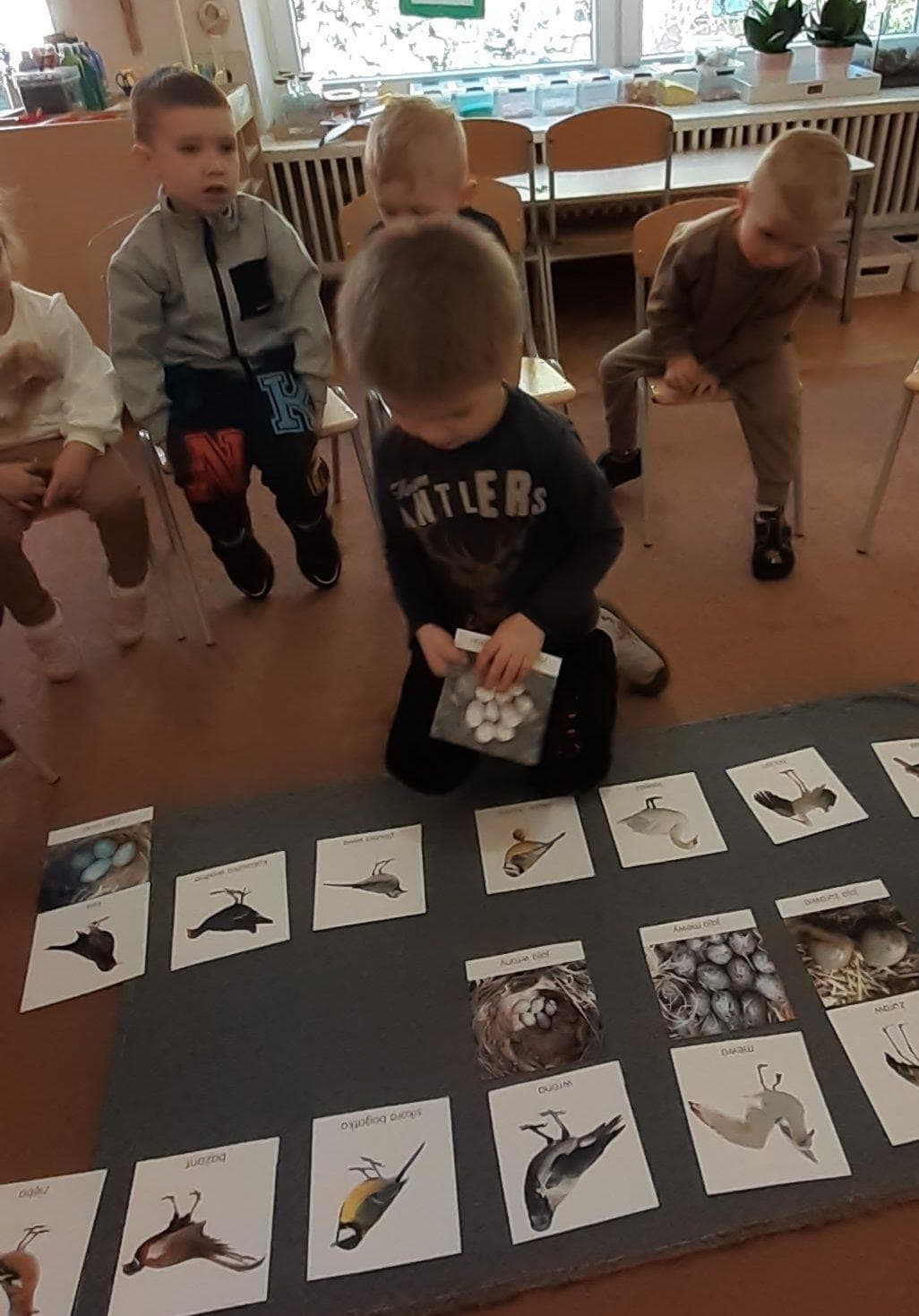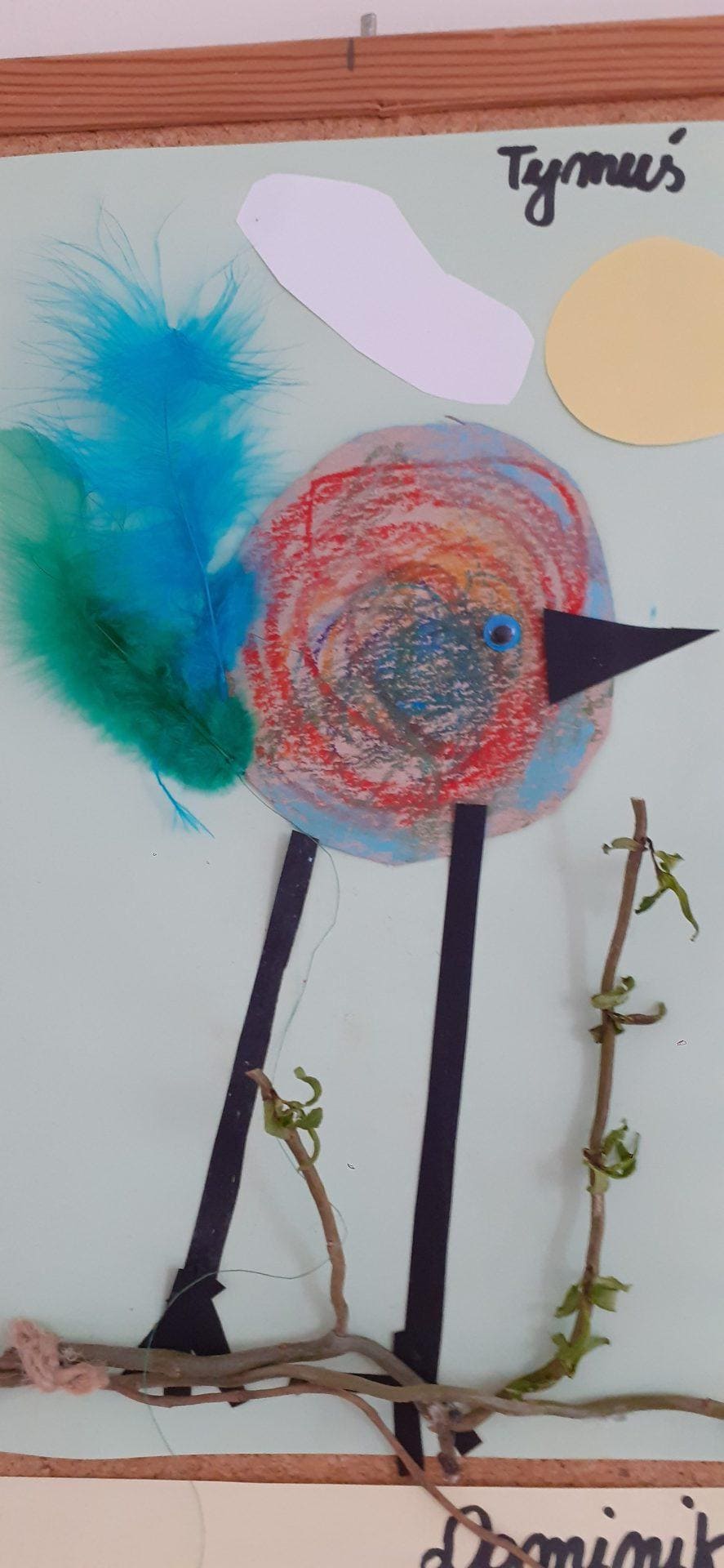 Gromadzenie wiedzy o ptakach przylatujących na wiosnę, o okresie godowym, opiece nad potomstwem i nauce latania. Budowa gniazda i oglądanie kolekcji autentycznych gniazd różnych gatunków ptaków. Ciekawostki o ptasich jajach i aktywność plastyczna „Siedzi ptaszek na gałązce…” inspirowana wierszem i doświadczeniami dzieci z ornitologicznych obserwacji.