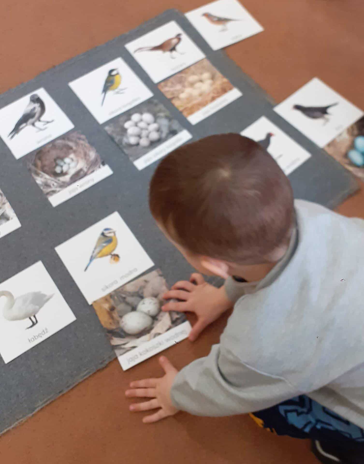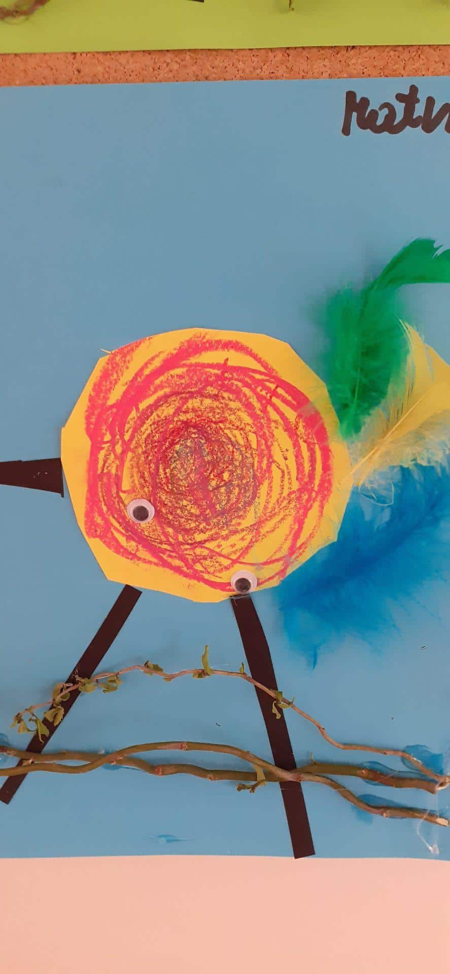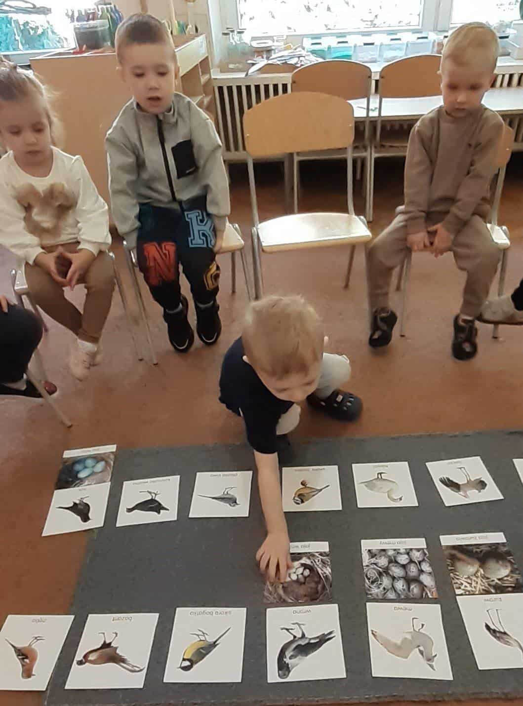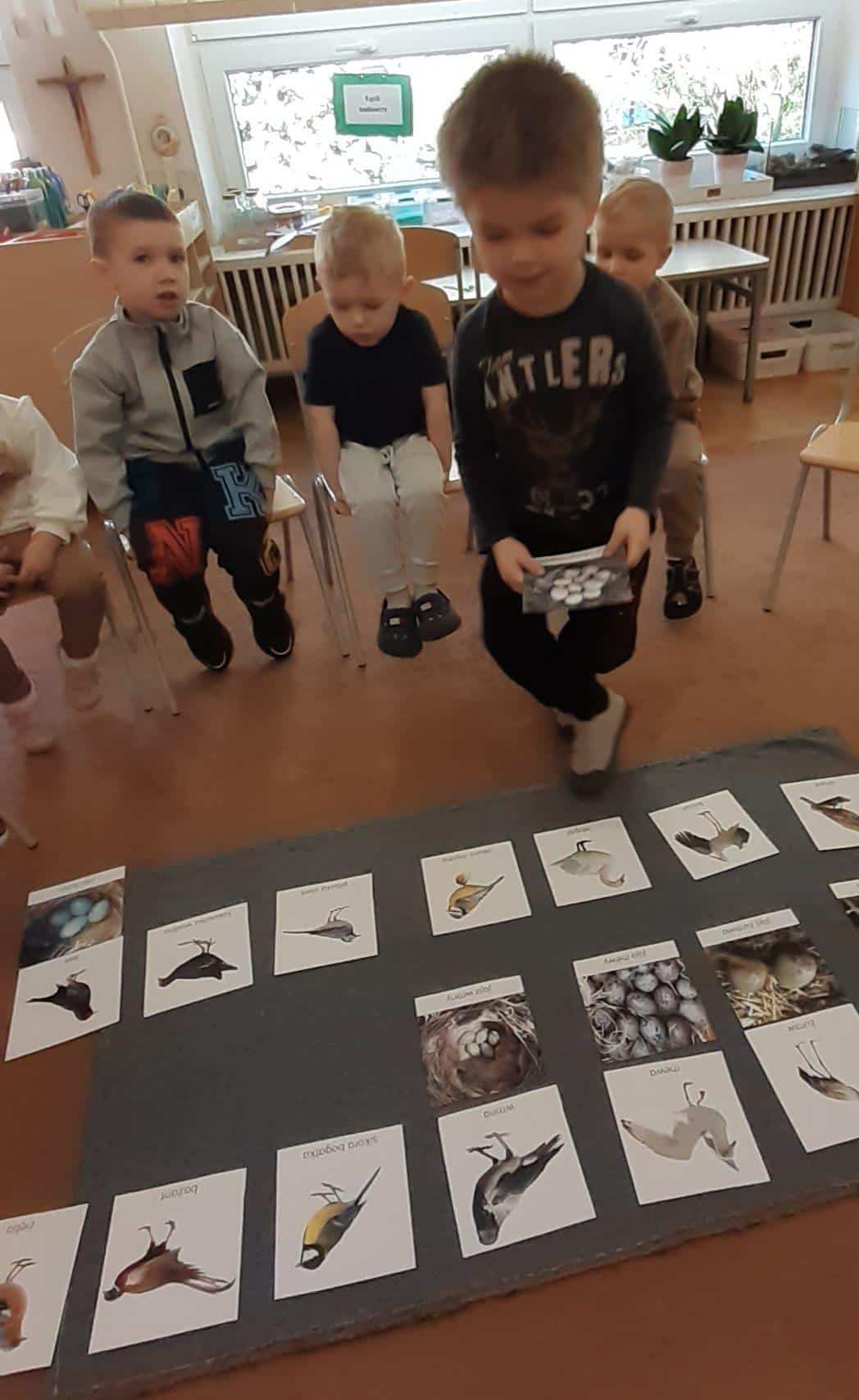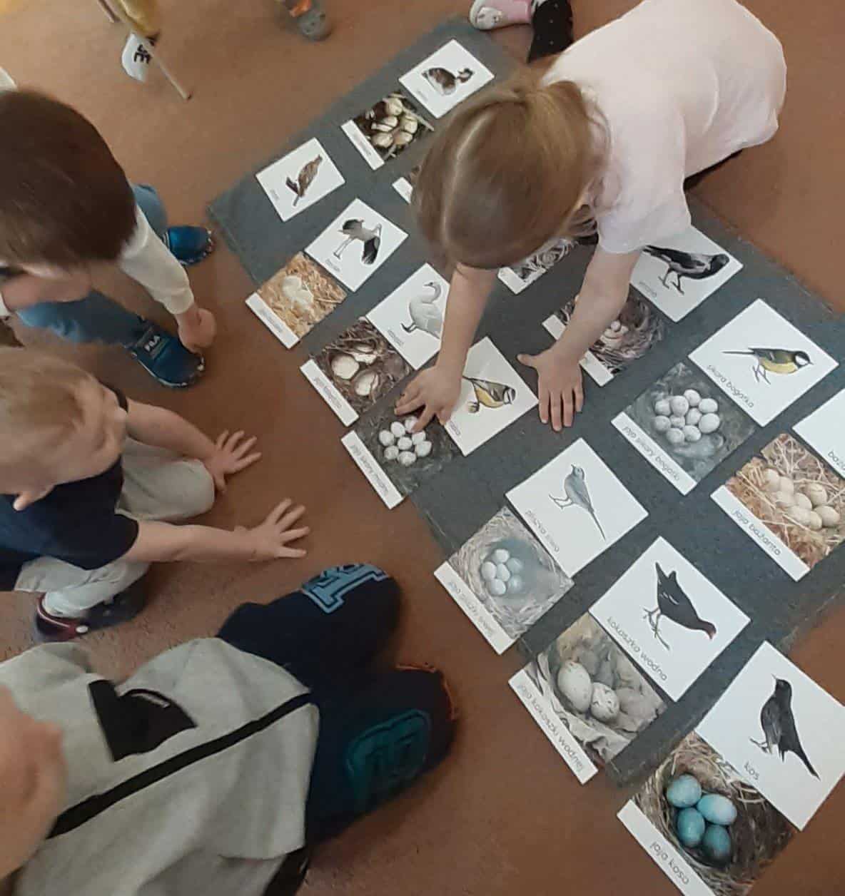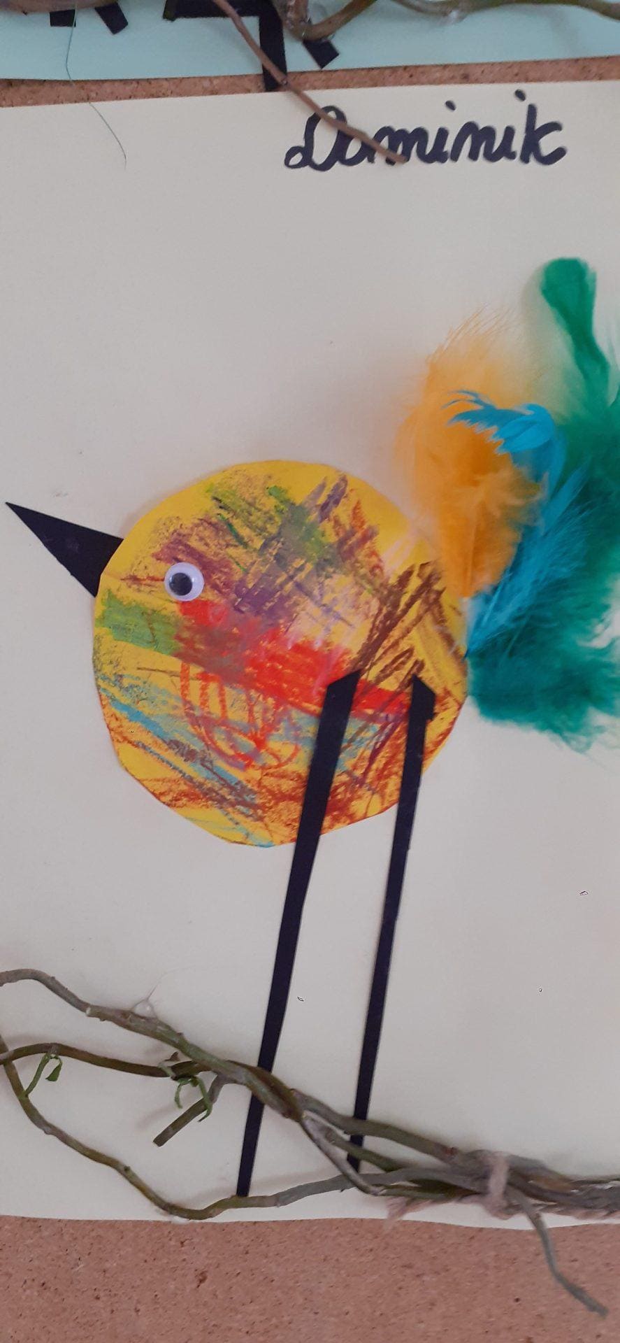 Gromadzenie wiedzy o ptakach przylatujących na wiosnę, o okresie godowym, opiece nad potomstwem i nauce latania. Budowa gniazda i oglądanie kolekcji autentycznych gniazd różnych gatunków ptaków. Ciekawostki o ptasich jajach i aktywność plastyczna „Siedzi ptaszek na gałązce…” inspirowana wierszem i doświadczeniami dzieci z ornitologicznych obserwacji.