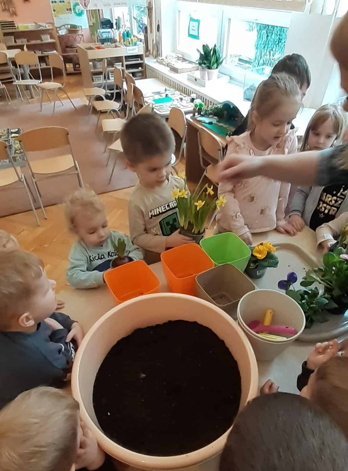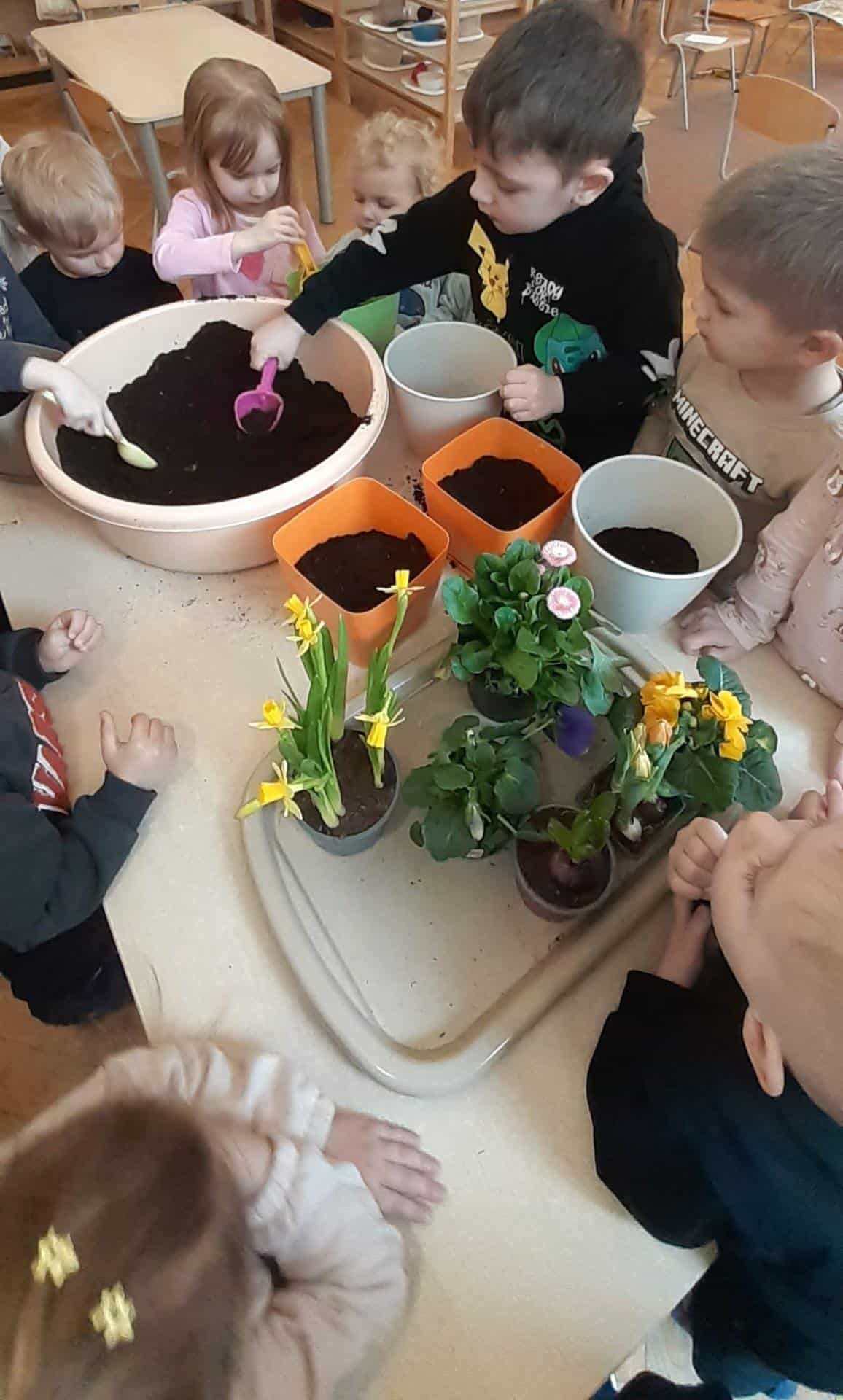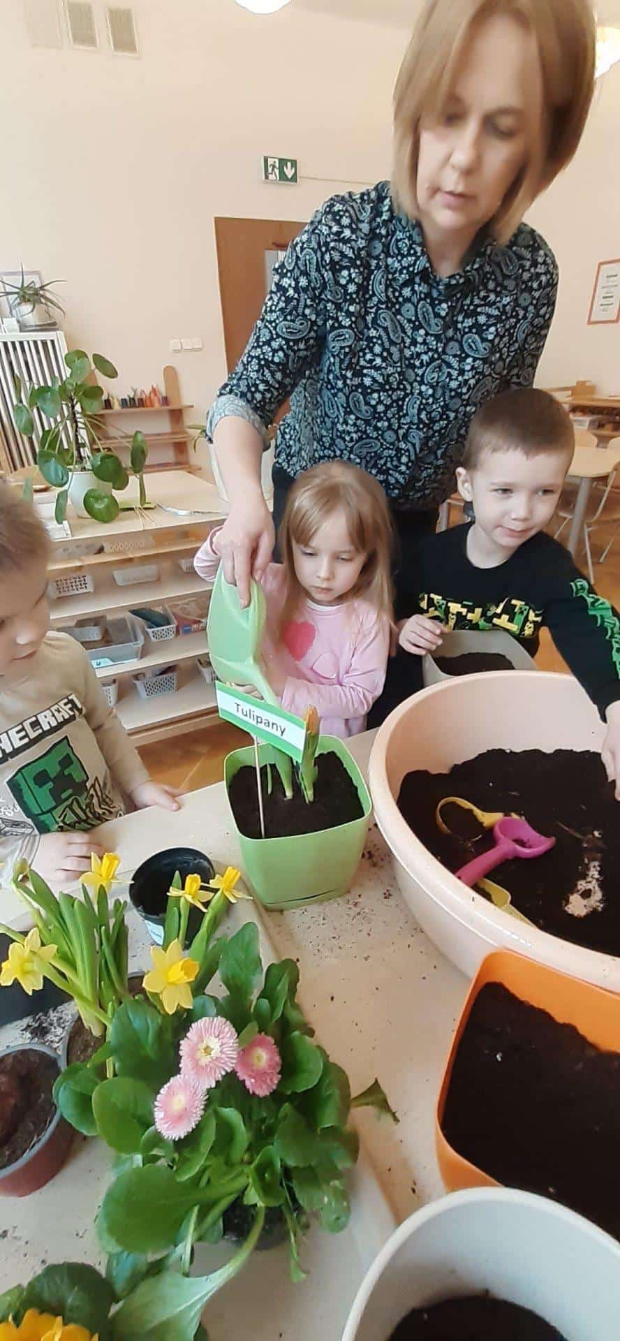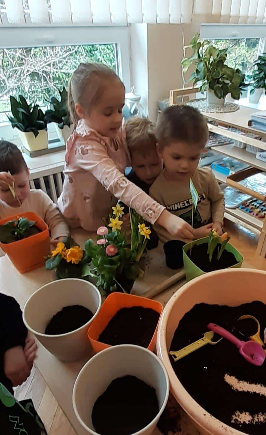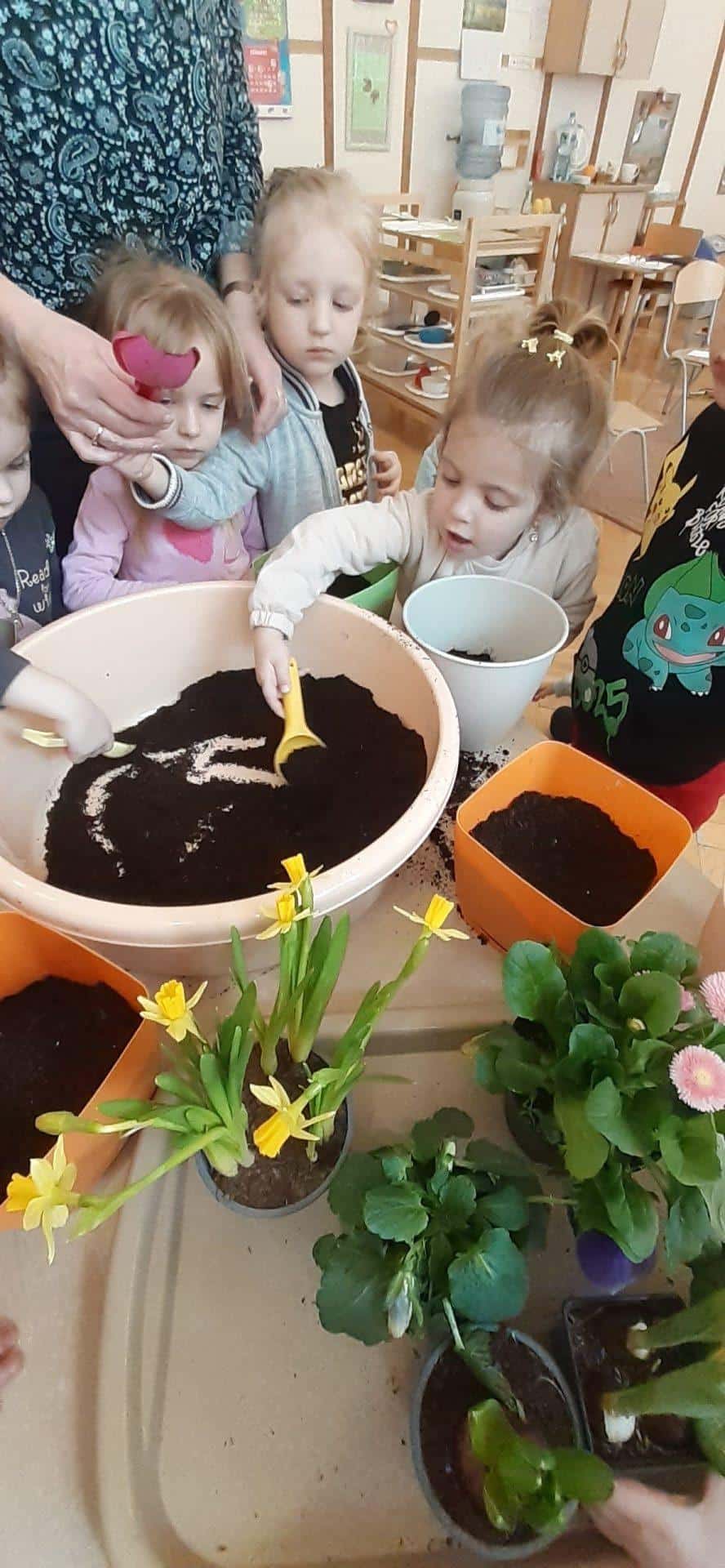 Wiosenne przebudzenie było inspiracją do założenia w sali zajęć wiosennego ogródka kwiatowego z tulipanami, żonkilami, hiacyntami, stokrotkami, pierwiosnkami. Przy okazji dzieci poznały kwiaty, które wyrastają z cebulki kwiatowej, budowę bryły korzeniowej oraz potrzeby roślin w okresie wzrostu. Kwiaty na pewno odwdzięczą się pięknym wyglądem i zapachem. Na końcu wykonano tabliczki znamionowe z nazwami kwiatów wiosennych.