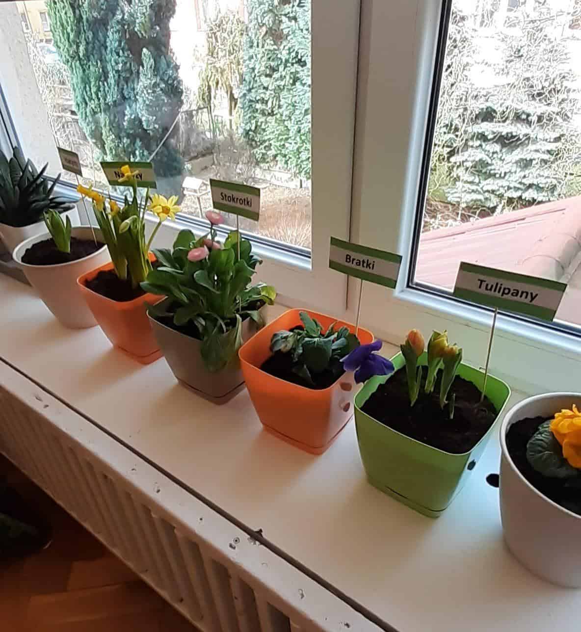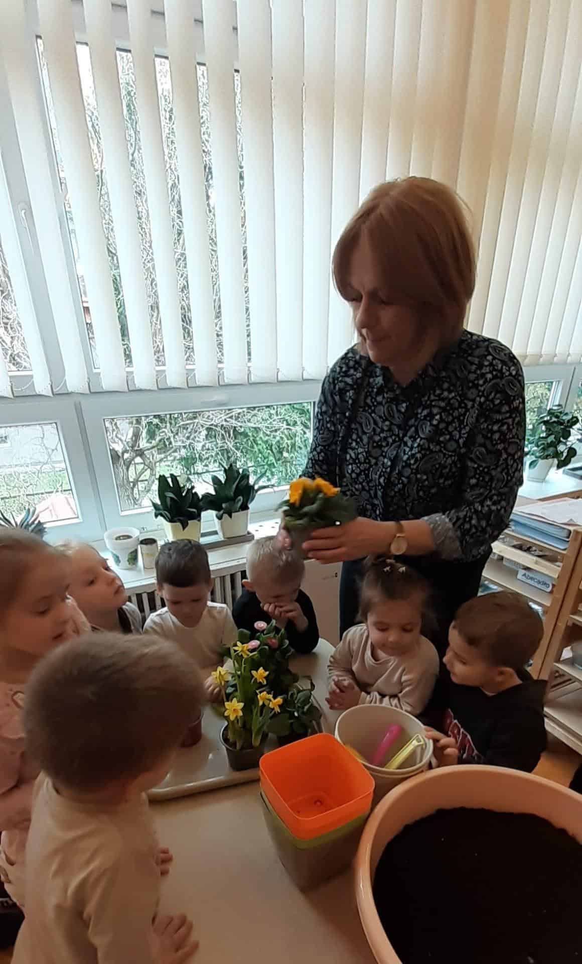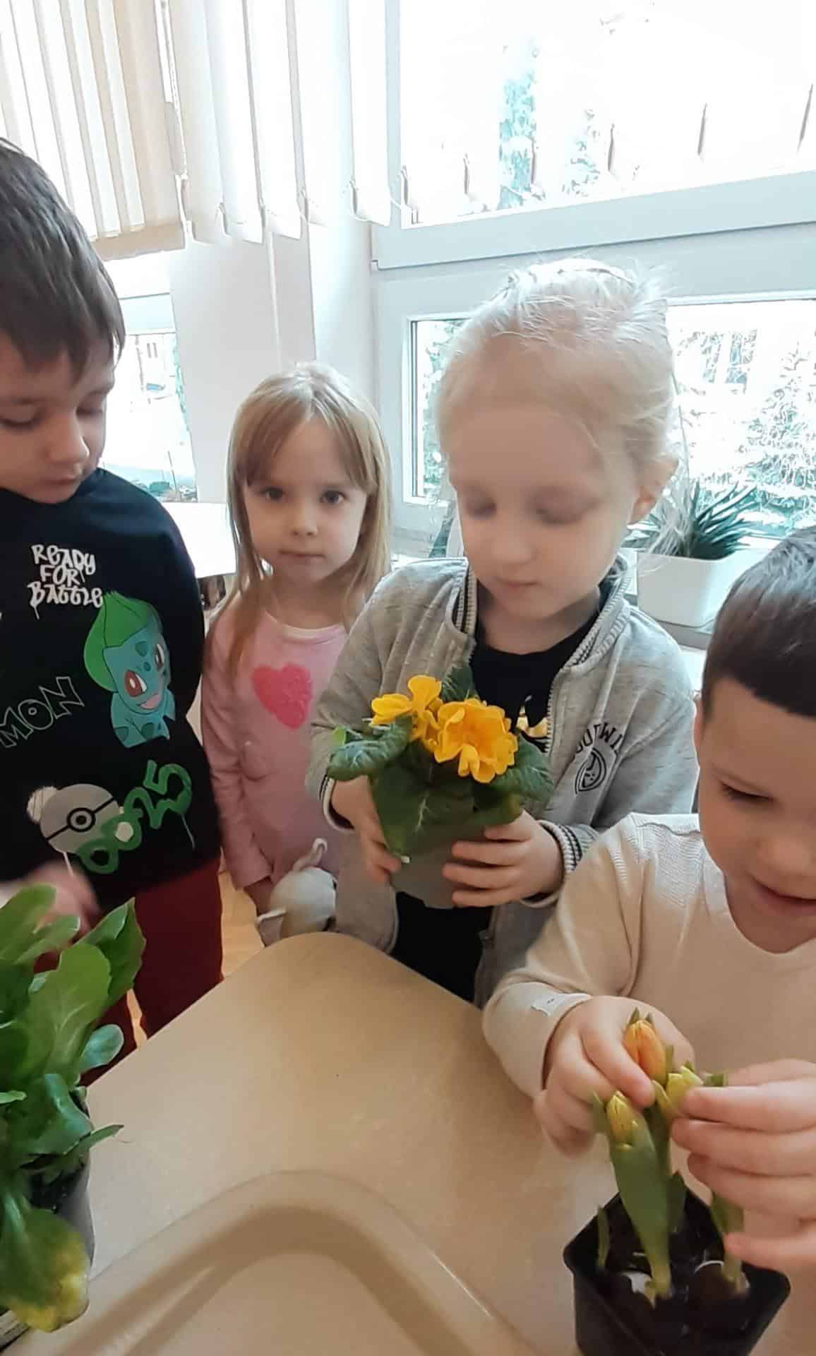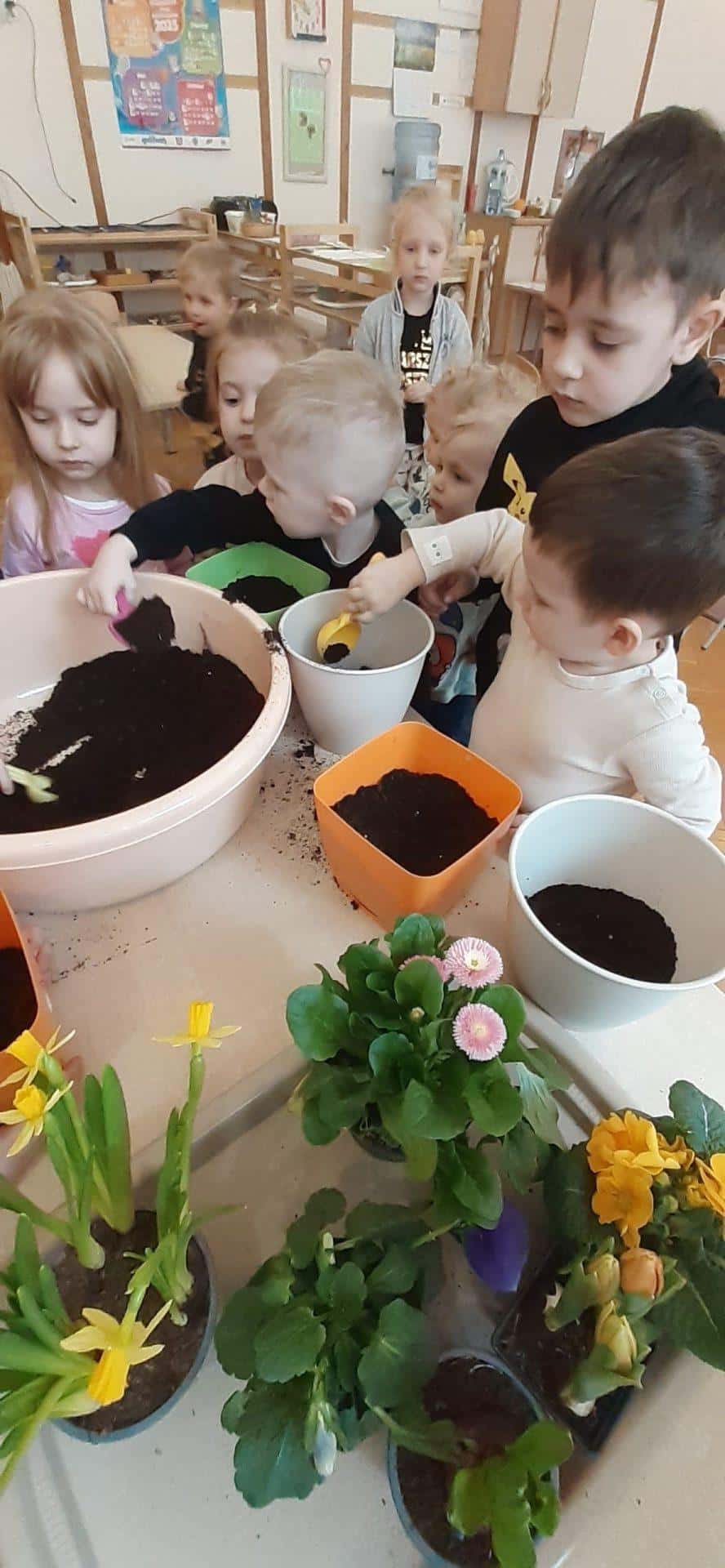 Wiosenne przebudzenie było inspiracją do założenia w sali zajęć wiosennego ogródka kwiatowego z tulipanami, żonkilami, hiacyntami, stokrotkami, pierwiosnkami. Przy okazji dzieci poznały kwiaty, które wyrastają z cebulki kwiatowej, budowę bryły korzeniowej oraz potrzeby roślin w okresie wzrostu. Kwiaty na pewno odwdzięczą się pięknym wyglądem i zapachem. Na końcu wykonano tabliczki znamionowe z nazwami kwiatów wiosennych.