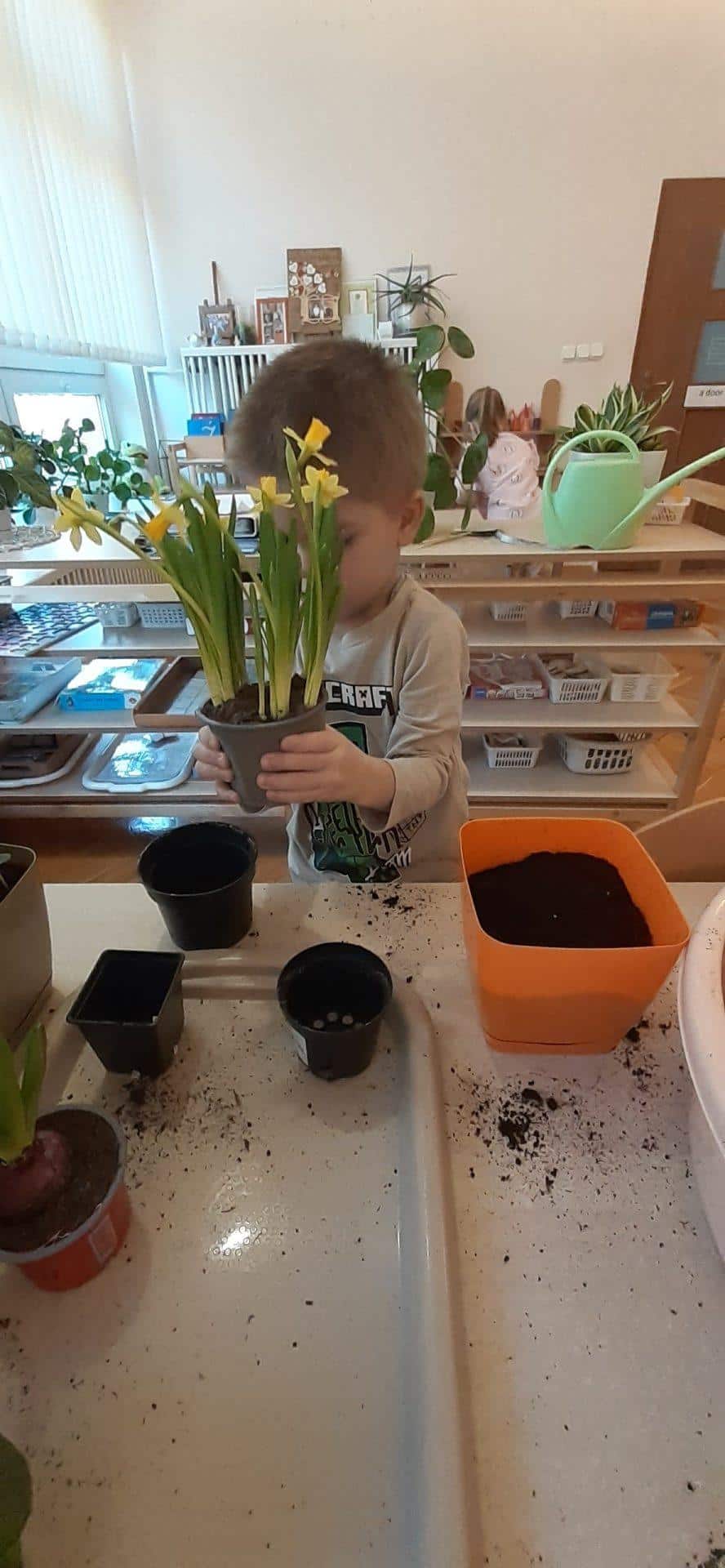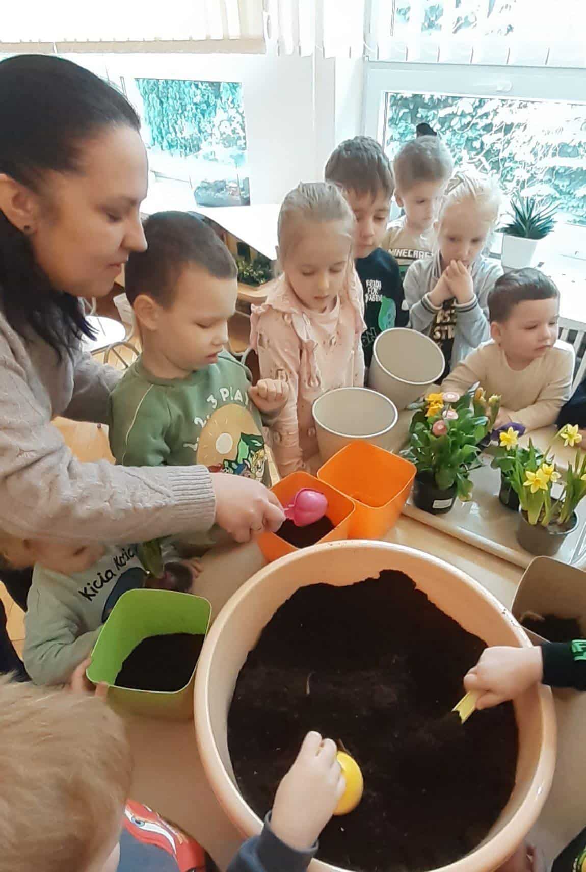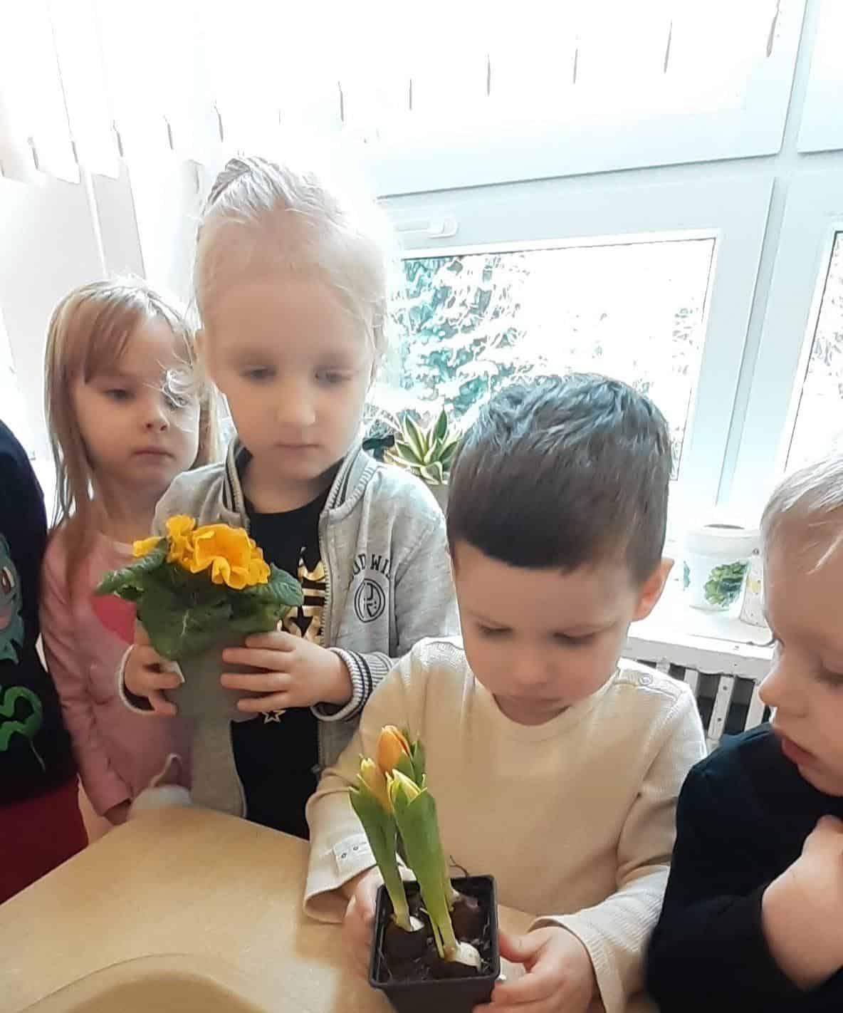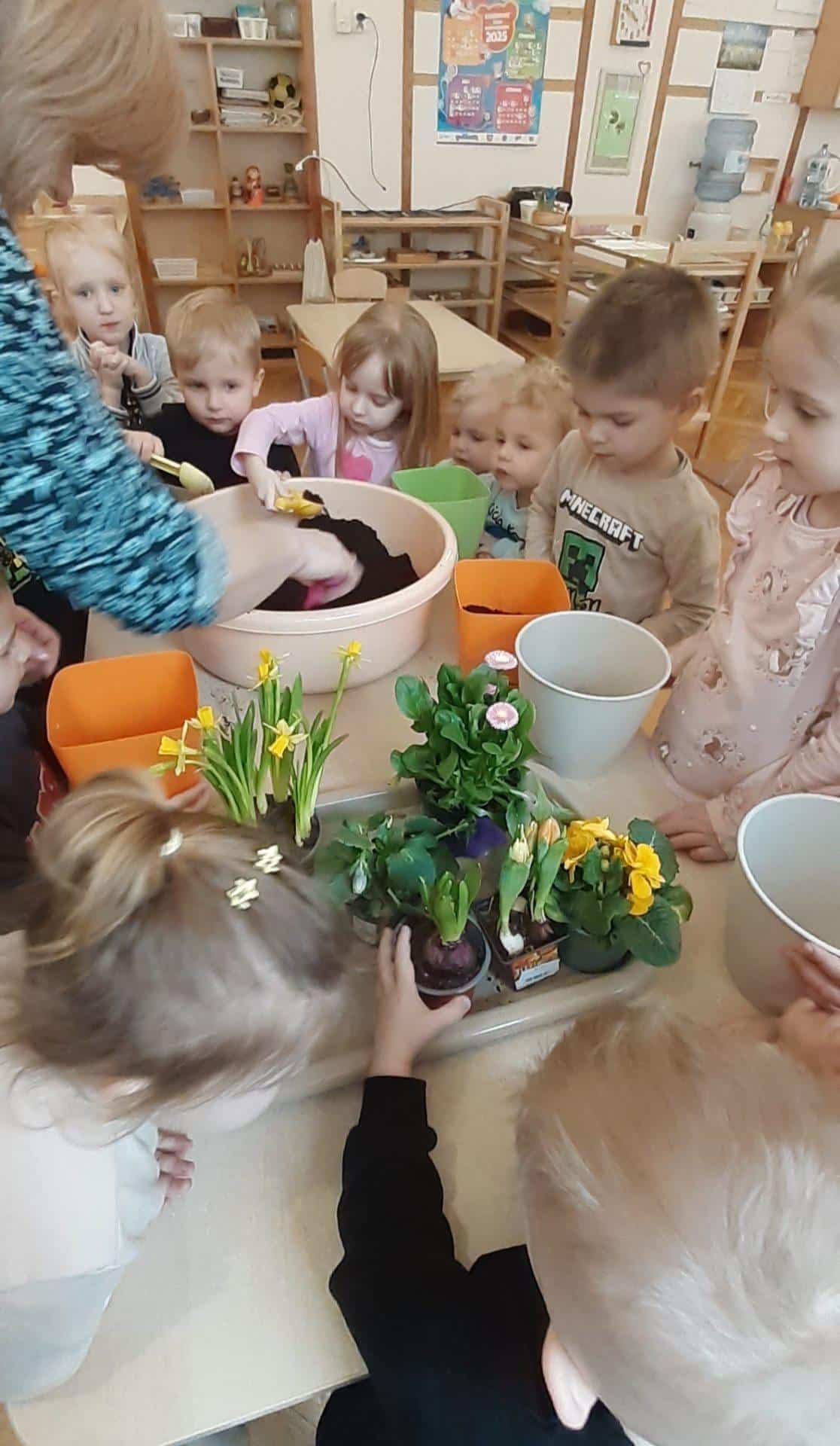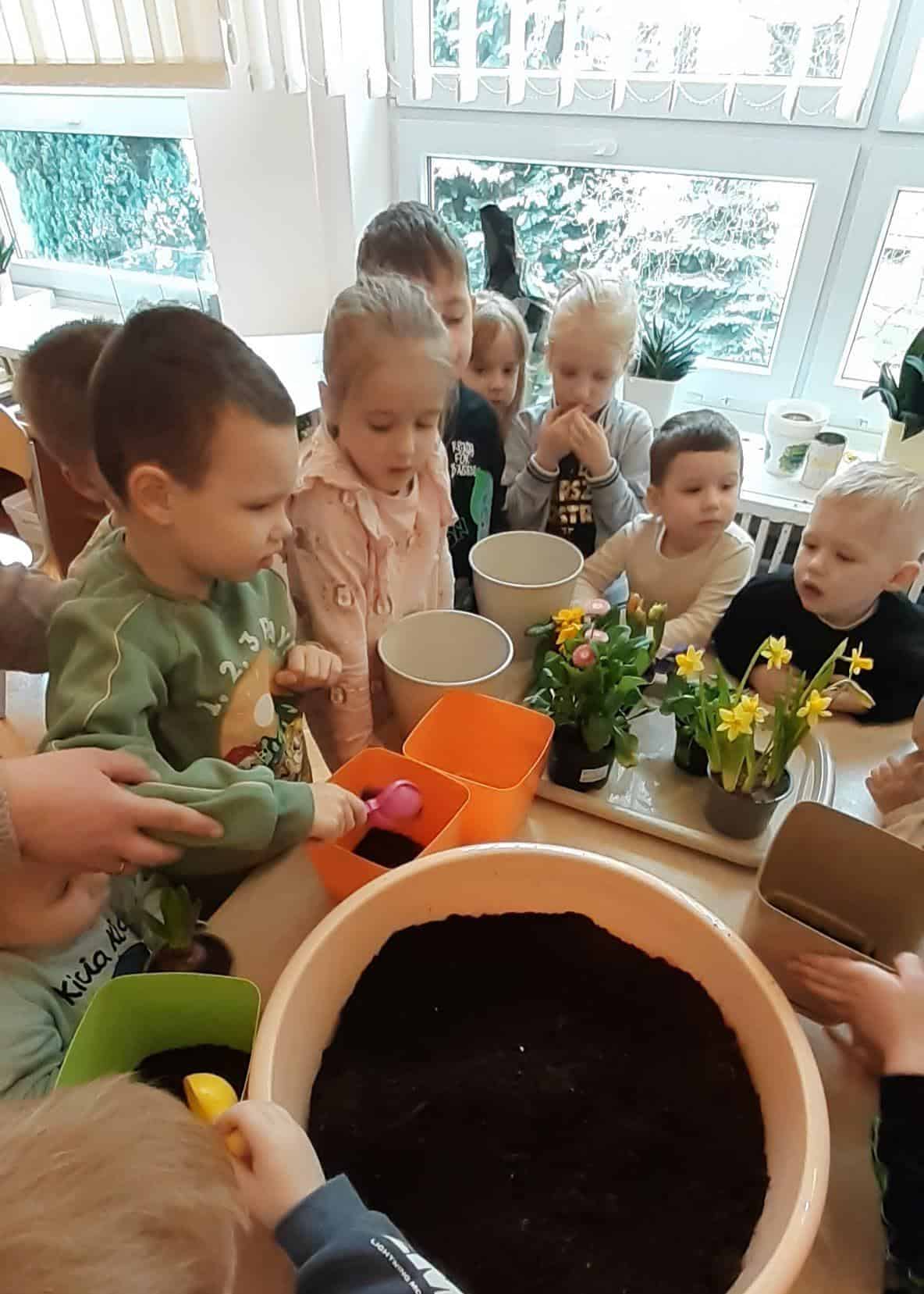 Wiosenne przebudzenie było inspiracją do założenia w sali zajęć wiosennego ogródka kwiatowego z tulipanami, żonkilami, hiacyntami, stokrotkami, pierwiosnkami. Przy okazji dzieci poznały kwiaty, które wyrastają z cebulki kwiatowej, budowę bryły korzeniowej oraz potrzeby roślin w okresie wzrostu. Kwiaty na pewno odwdzięczą się pięknym wyglądem i zapachem. Na końcu wykonano tabliczki znamionowe z nazwami kwiatów wiosennych.