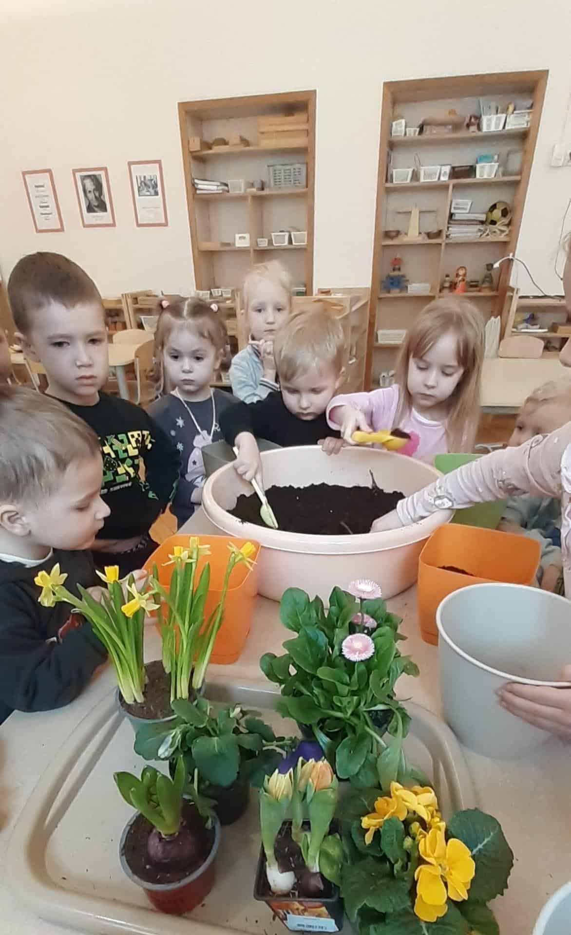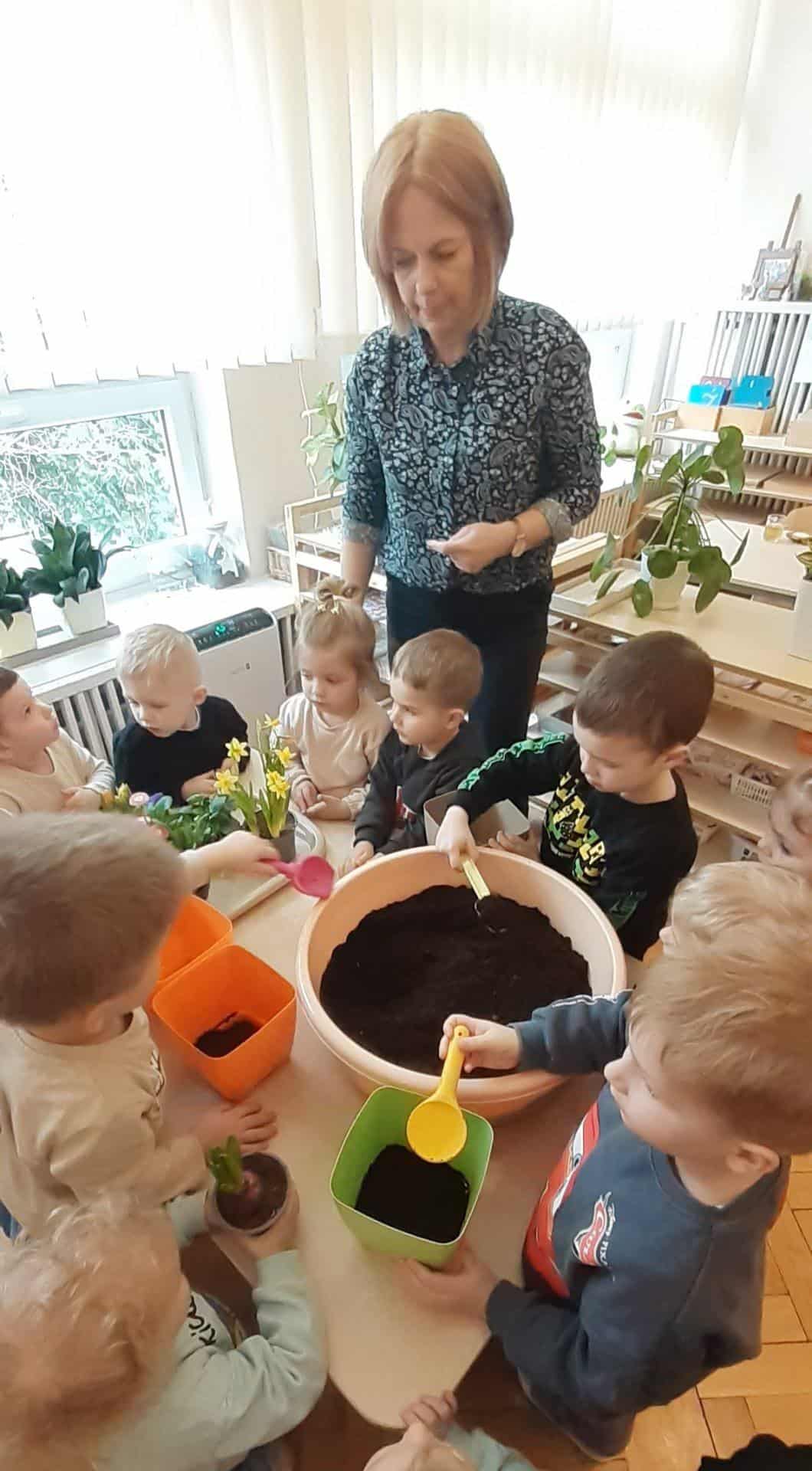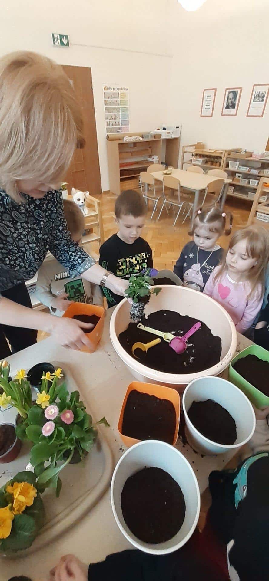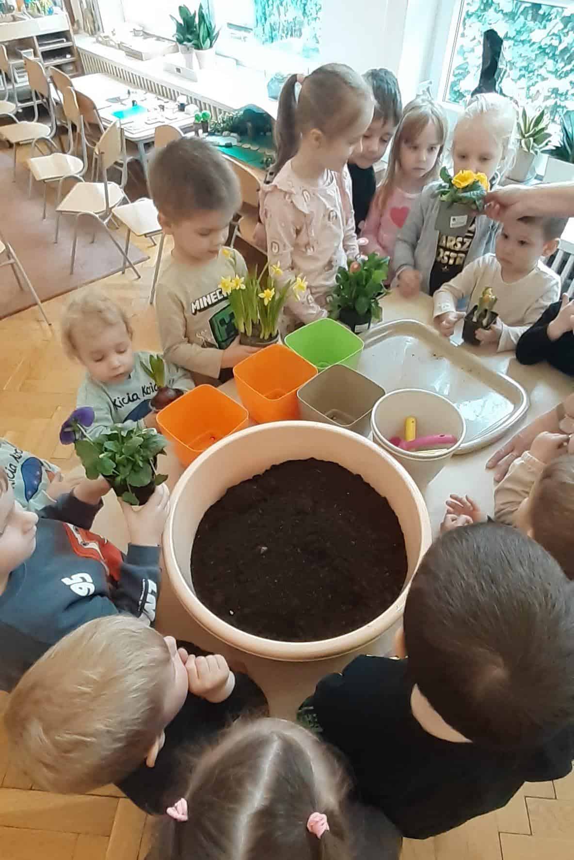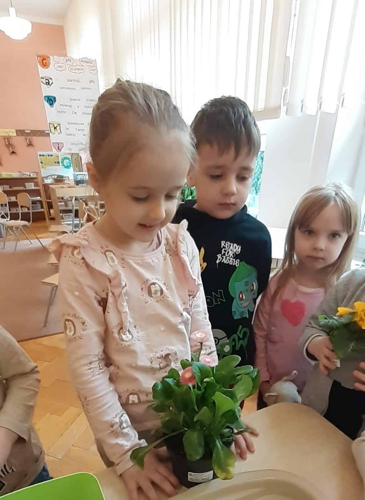 Wiosenne przebudzenie było inspiracją do założenia w sali zajęć wiosennego ogródka kwiatowego z tulipanami, żonkilami, hiacyntami, stokrotkami, pierwiosnkami. Przy okazji dzieci poznały kwiaty, które wyrastają z cebulki kwiatowej, budowę bryły korzeniowej oraz potrzeby roślin w okresie wzrostu. Kwiaty na pewno odwdzięczą się pięknym wyglądem i zapachem. Na końcu wykonano tabliczki znamionowe z nazwami kwiatów wiosennych.
