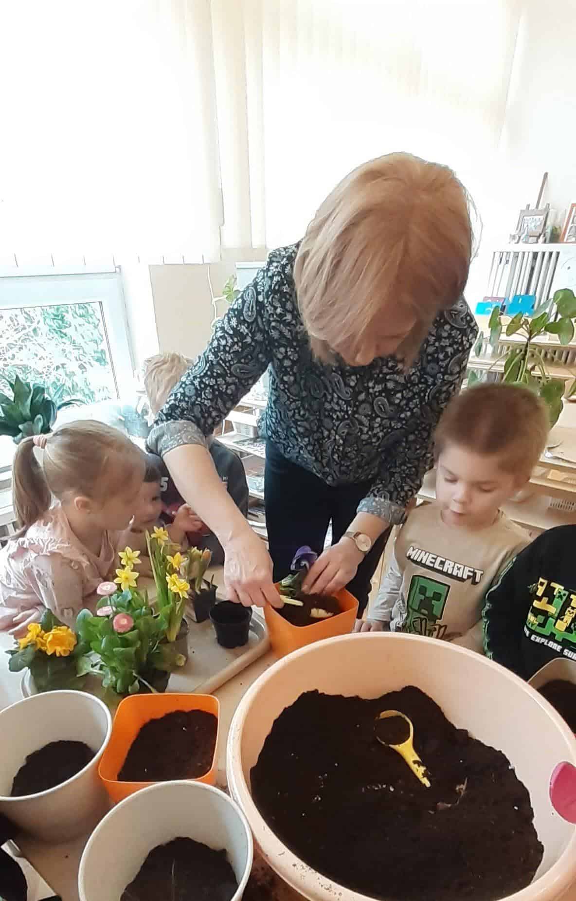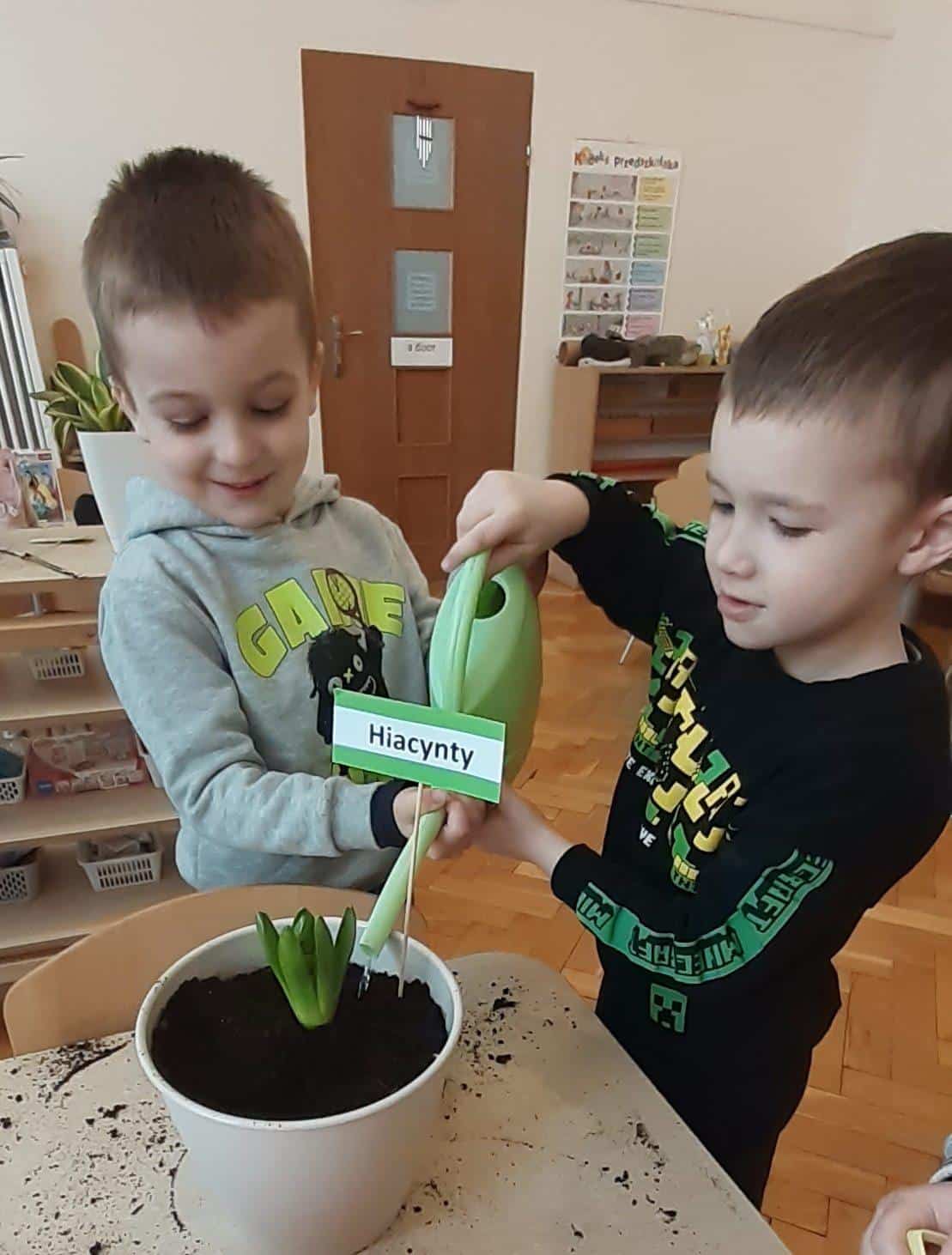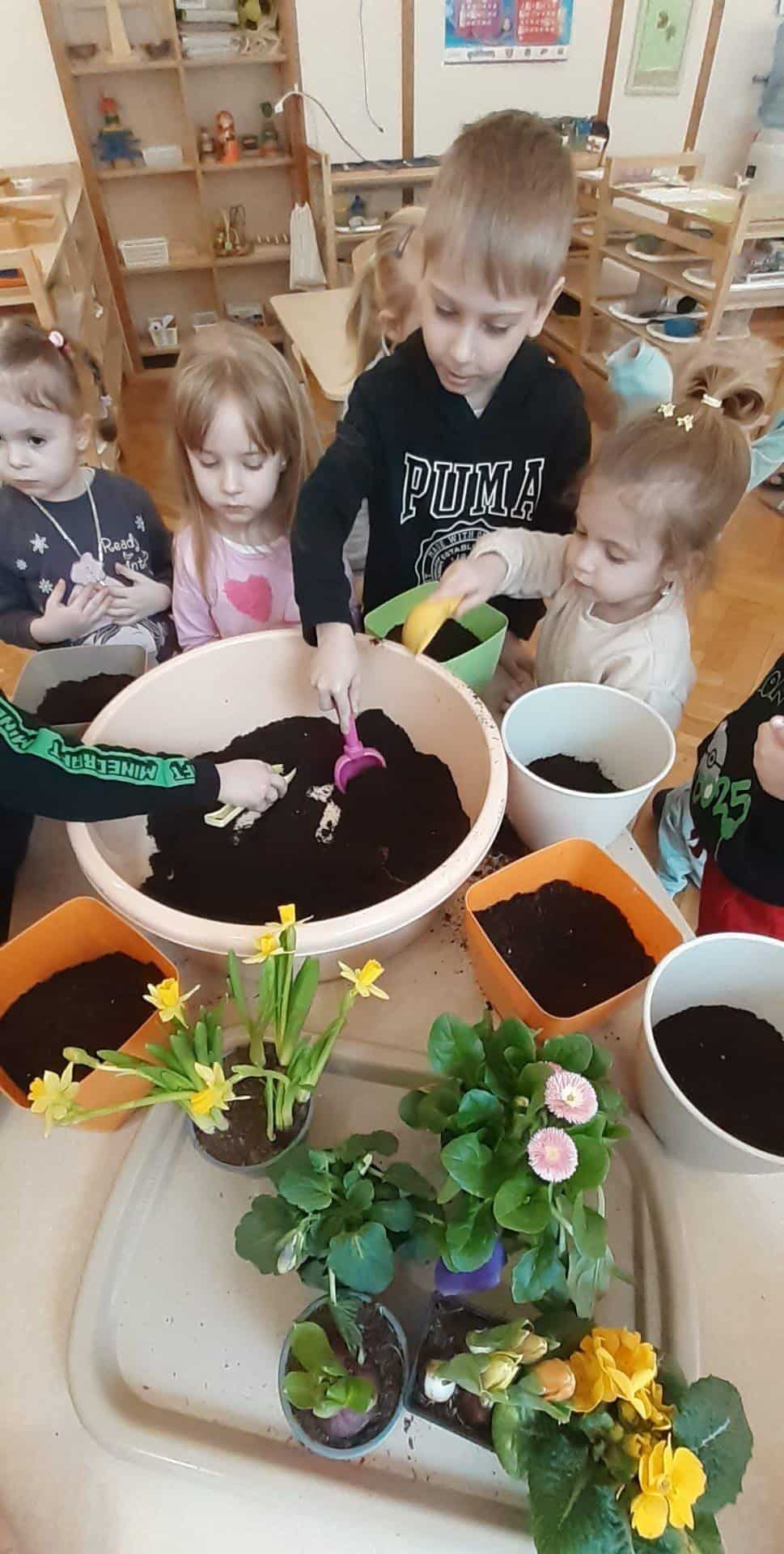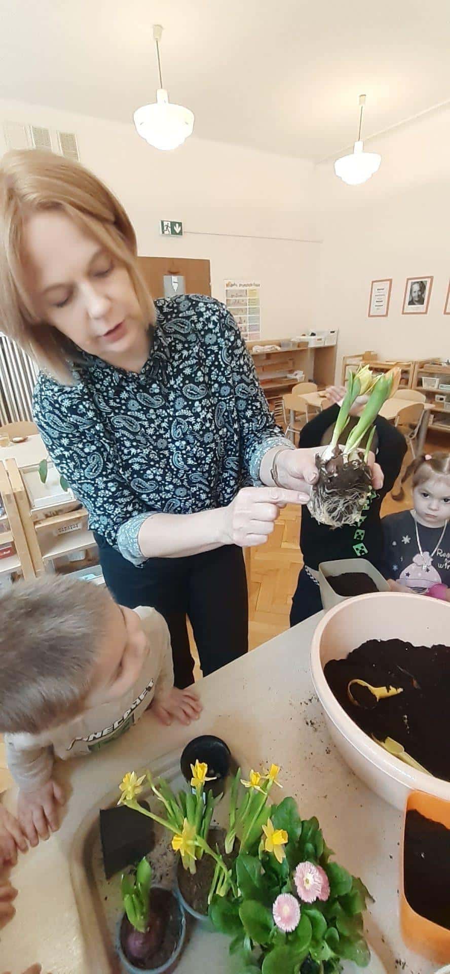 Wiosenne przebudzenie było inspiracją do założenia w sali zajęć wiosennego ogródka kwiatowego z tulipanami, żonkilami, hiacyntami, stokrotkami, pierwiosnkami. Przy okazji dzieci poznały kwiaty, które wyrastają z cebulki kwiatowej, budowę bryły korzeniowej oraz potrzeby roślin w okresie wzrostu. Kwiaty na pewno odwdzięczą się pięknym wyglądem i zapachem. Na końcu wykonano tabliczki znamionowe z nazwami kwiatów wiosennych.