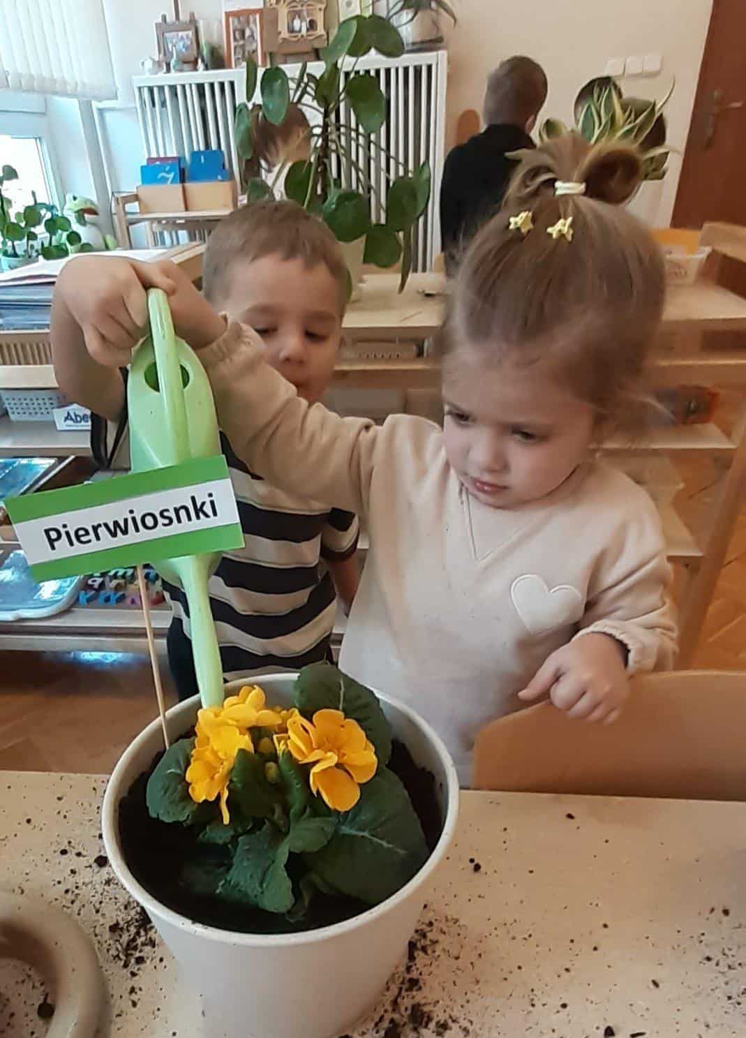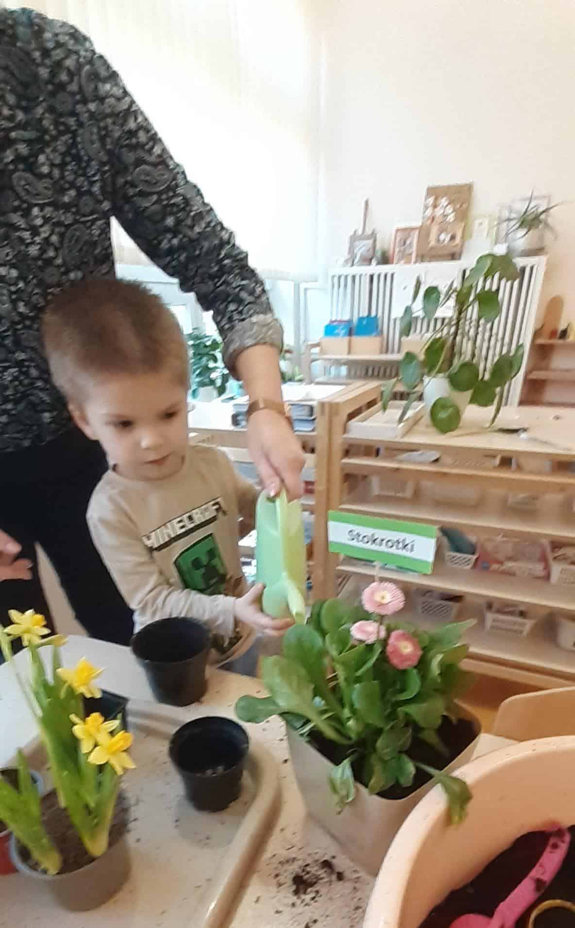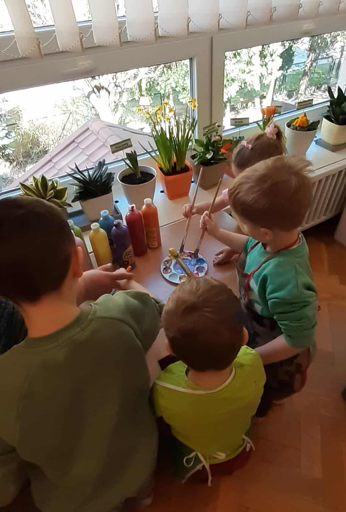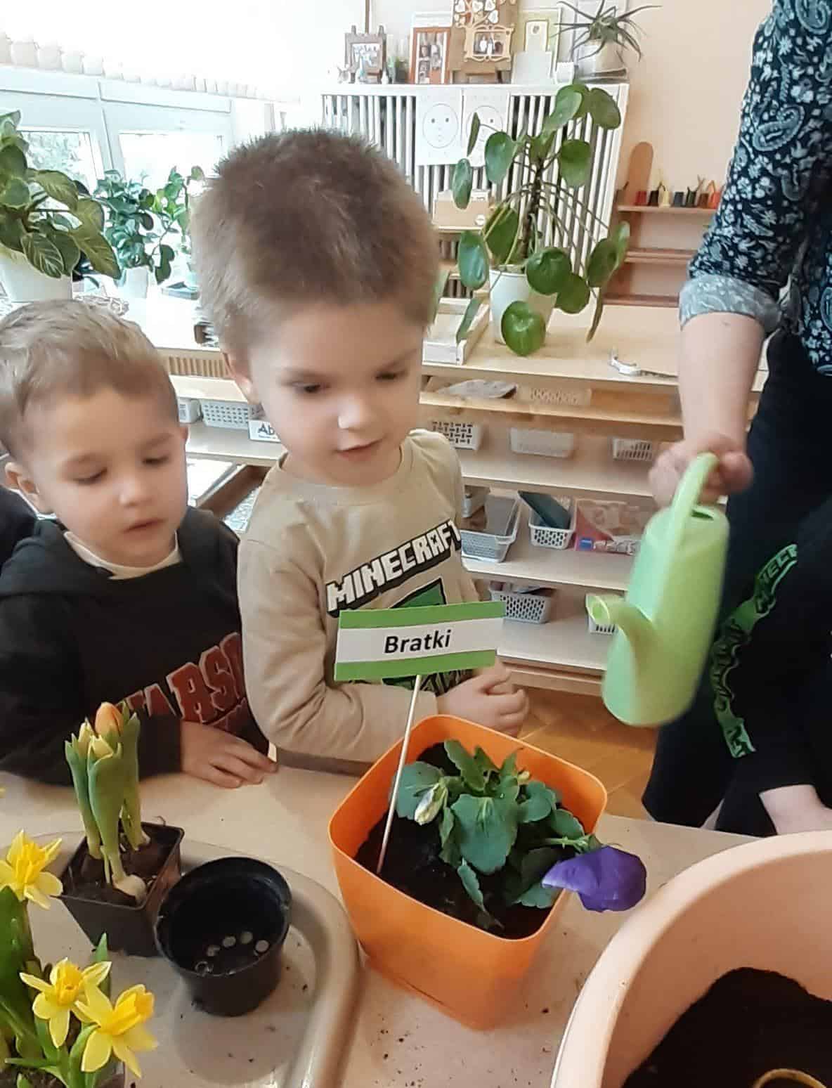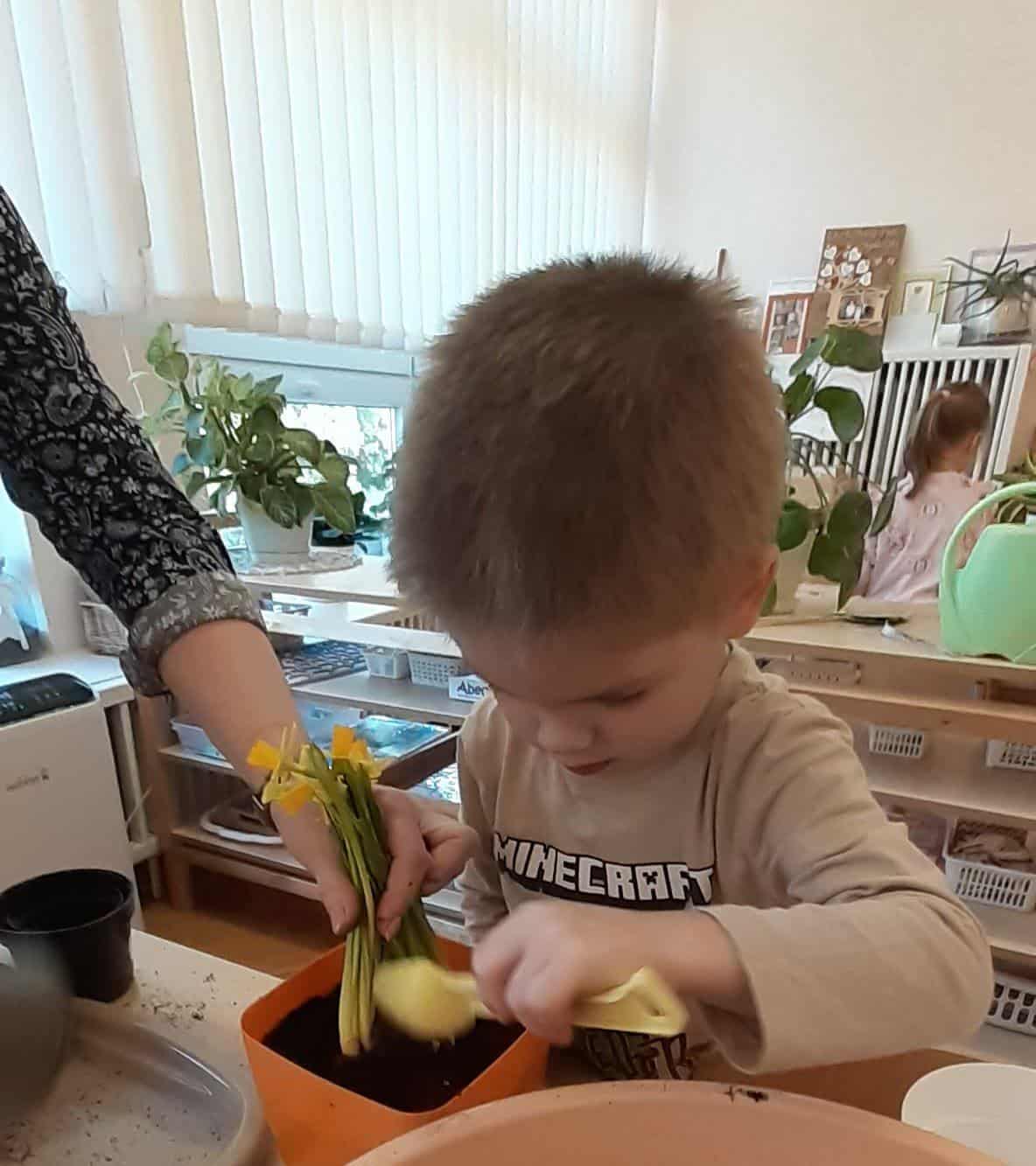 Wiosenne przebudzenie było inspiracją do założenia w sali zajęć wiosennego ogródka kwiatowego z tulipanami, żonkilami, hiacyntami, stokrotkami, pierwiosnkami. Przy okazji dzieci poznały kwiaty, które wyrastają z cebulki kwiatowej, budowę bryły korzeniowej oraz potrzeby roślin w okresie wzrostu. Kwiaty na pewno odwdzięczą się pięknym wyglądem i zapachem. Na końcu wykonano tabliczki znamionowe z nazwami kwiatów wiosennych.