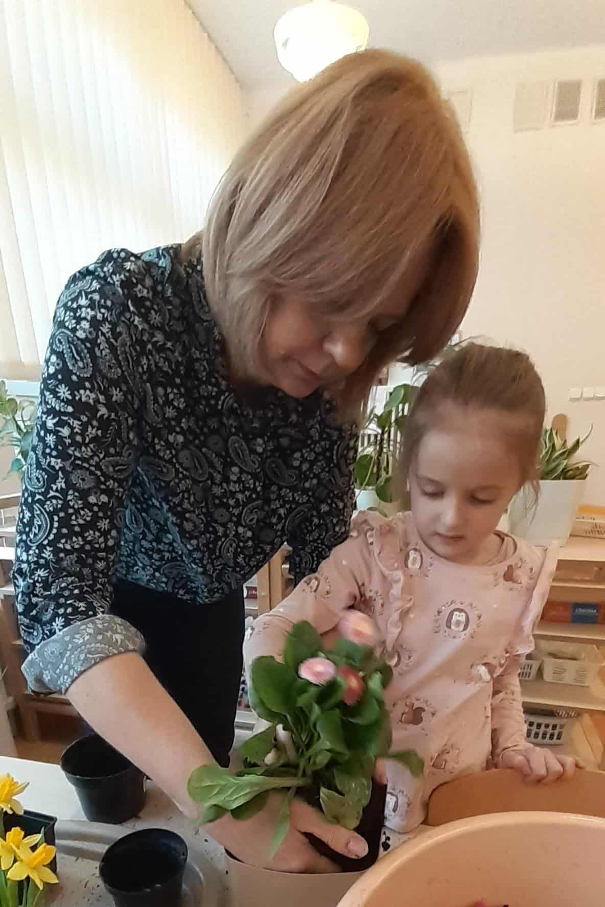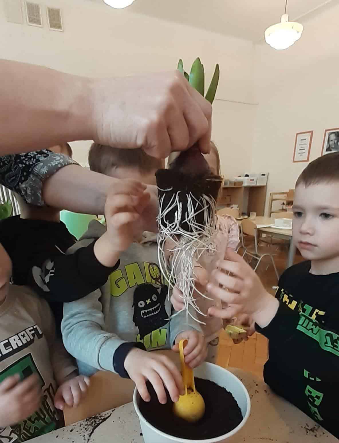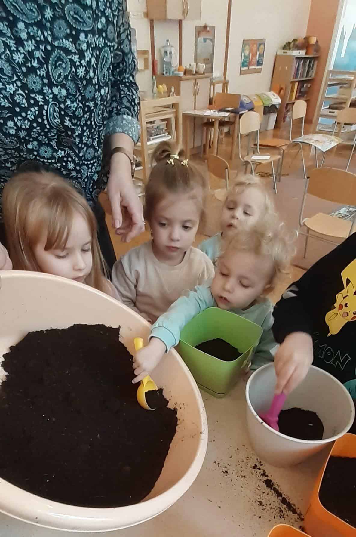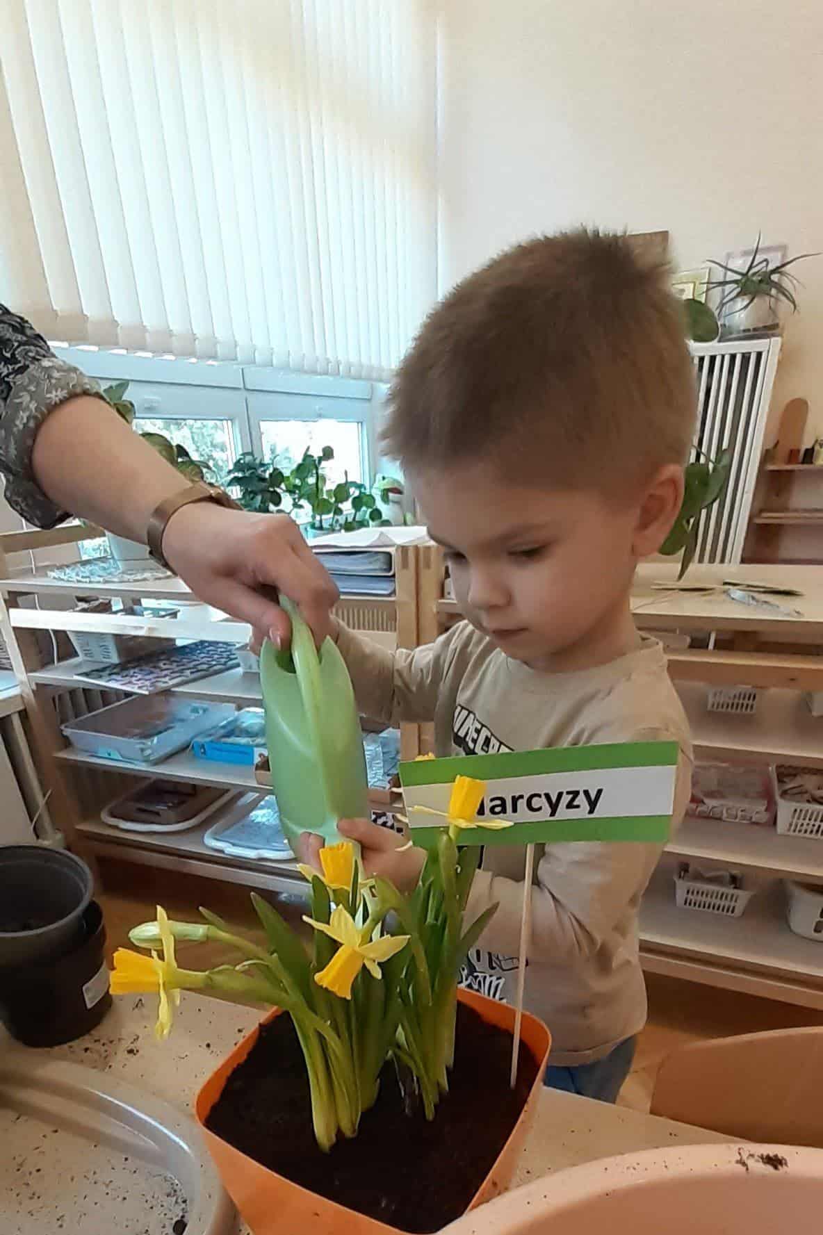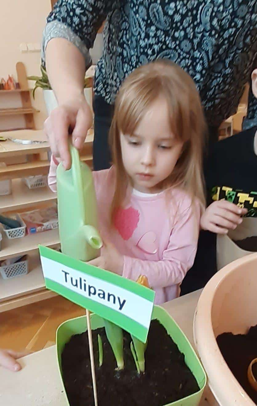 Wiosenne przebudzenie było inspiracją do założenia w sali zajęć wiosennego ogródka kwiatowego z tulipanami, żonkilami, hiacyntami, stokrotkami, pierwiosnkami. Przy okazji dzieci poznały kwiaty, które wyrastają z cebulki kwiatowej, budowę bryły korzeniowej oraz potrzeby roślin w okresie wzrostu. Kwiaty na pewno odwdzięczą się pięknym wyglądem i zapachem. Na końcu wykonano tabliczki znamionowe z nazwami kwiatów wiosennych.