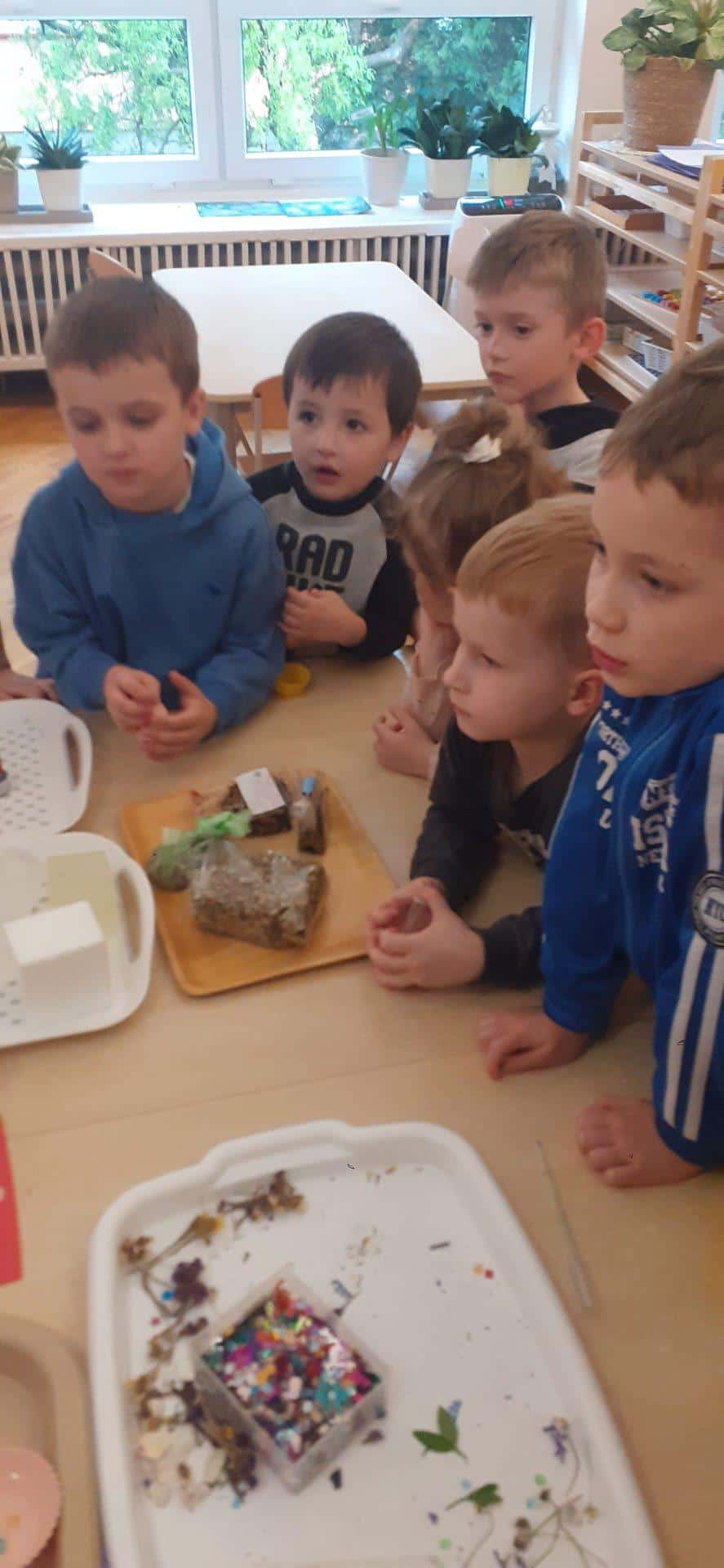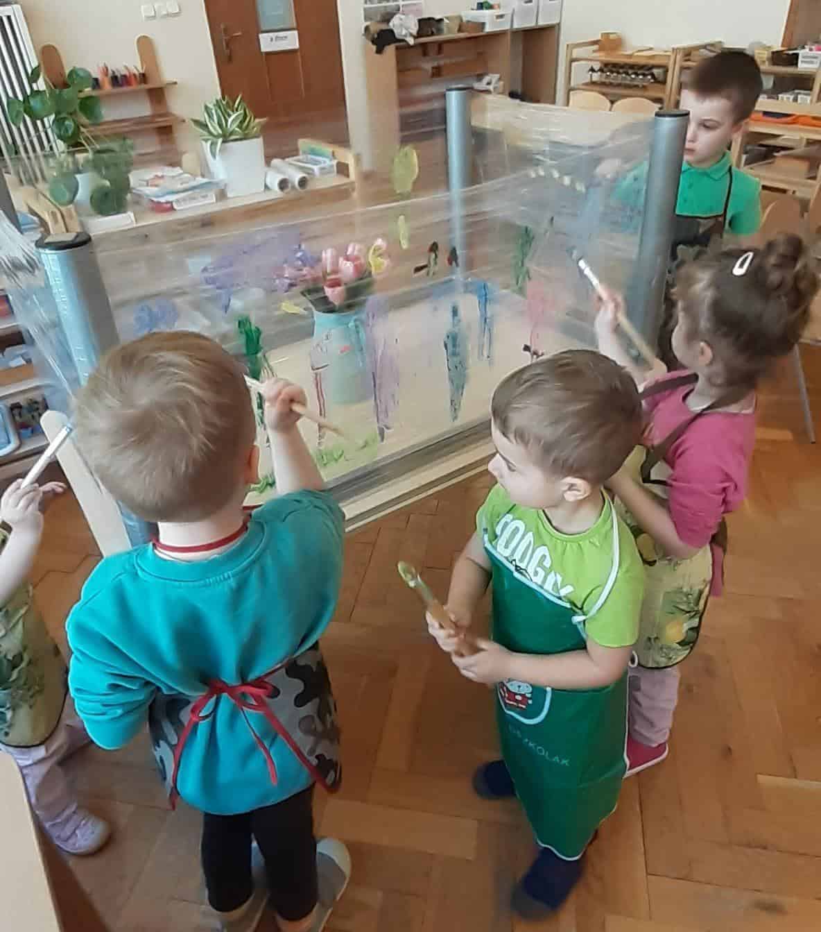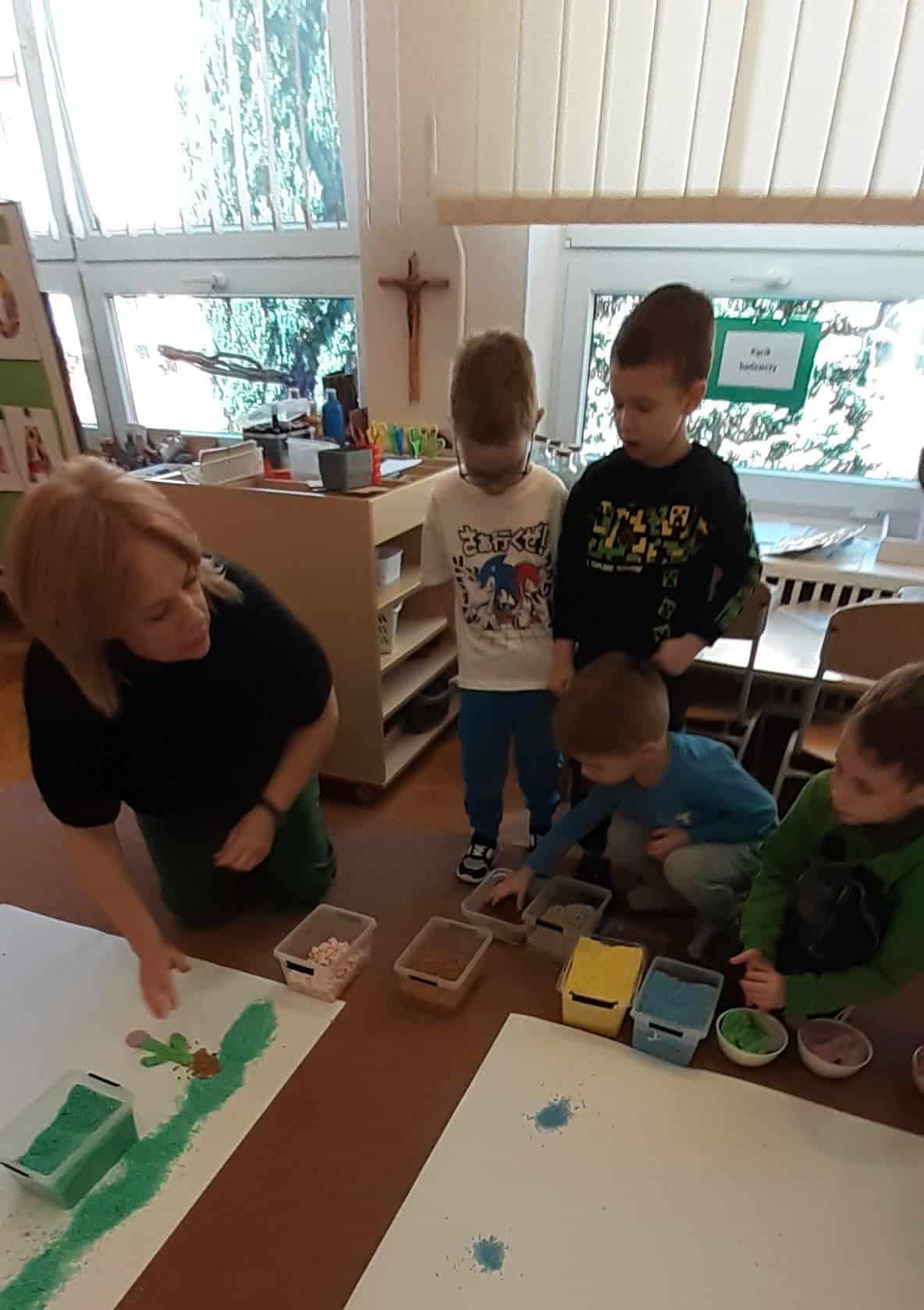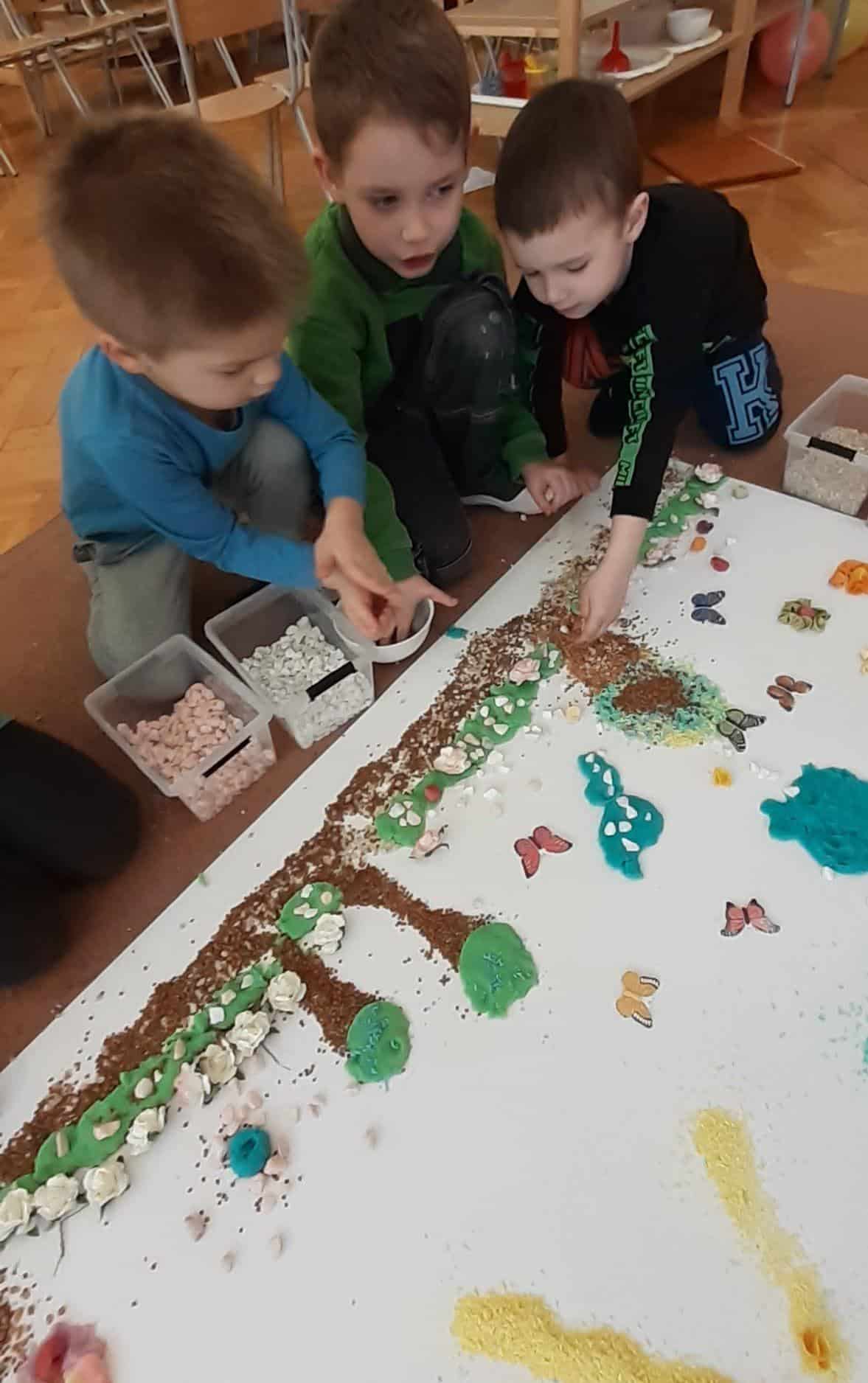 Wiosenne przebudzenie było inspiracją do założenia w sali zajęć wiosennego ogródka kwiatowego z tulipanami, żonkilami, hiacyntami, stokrotkami, pierwiosnkami. Przy okazji dzieci poznały kwiaty, które wyrastają z cebulki kwiatowej, budowę bryły korzeniowej oraz potrzeby roślin w okresie wzrostu. Kwiaty na pewno odwdzięczą się pięknym wyglądem i zapachem. Na końcu wykonano tabliczki znamionowe z nazwami kwiatów wiosennych.