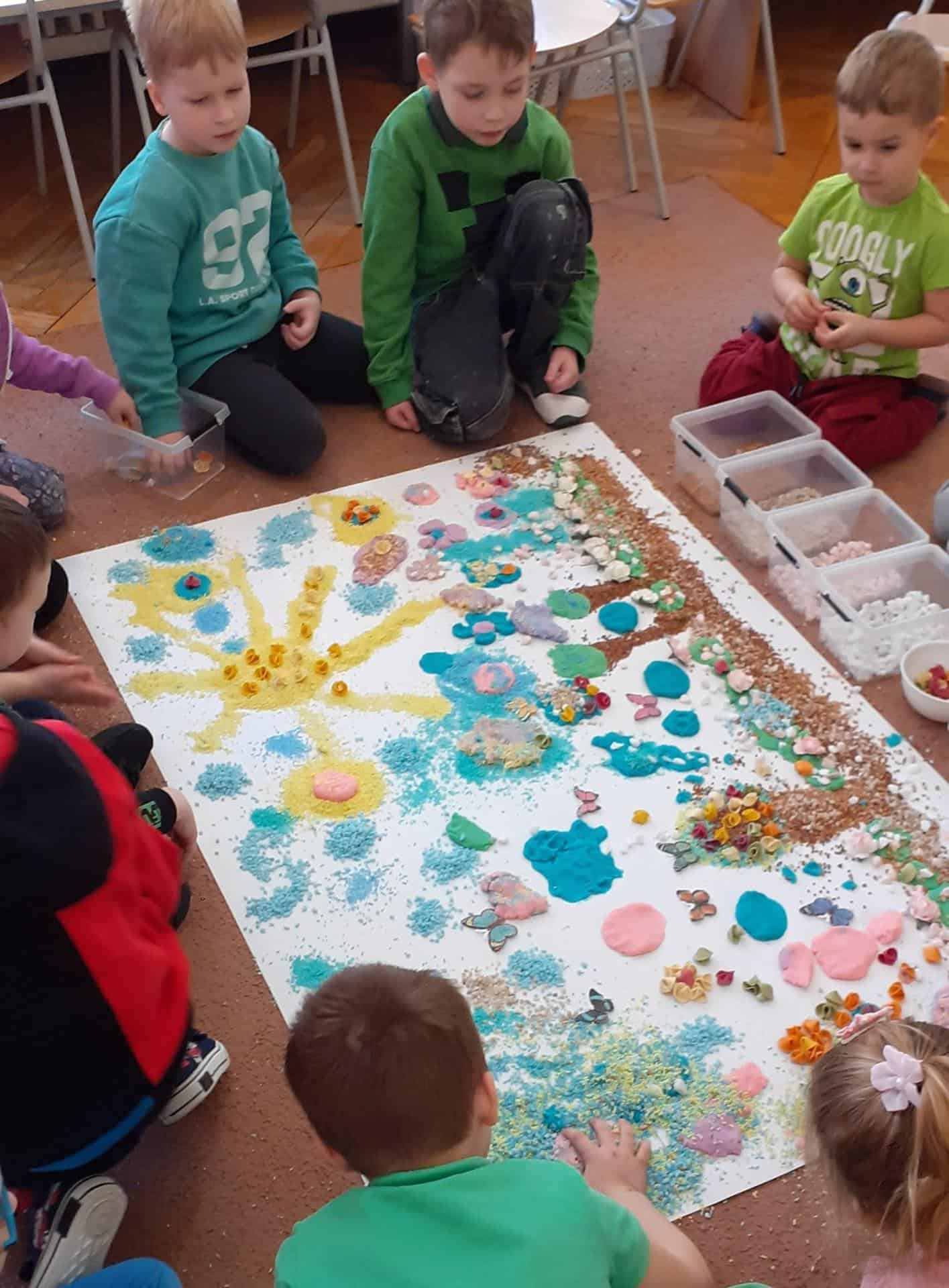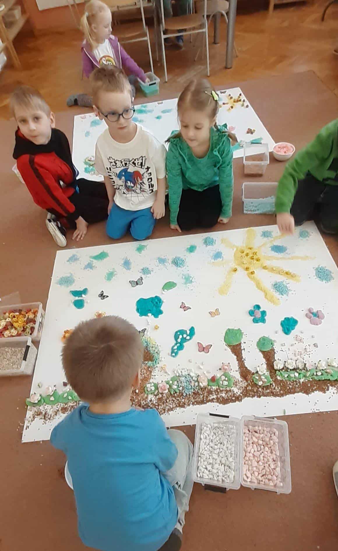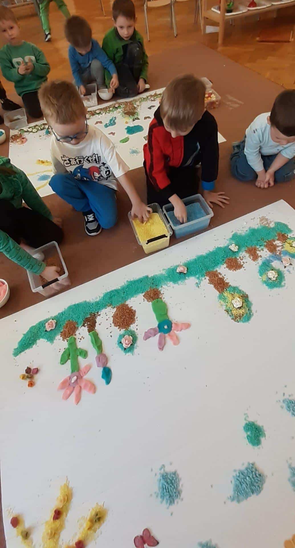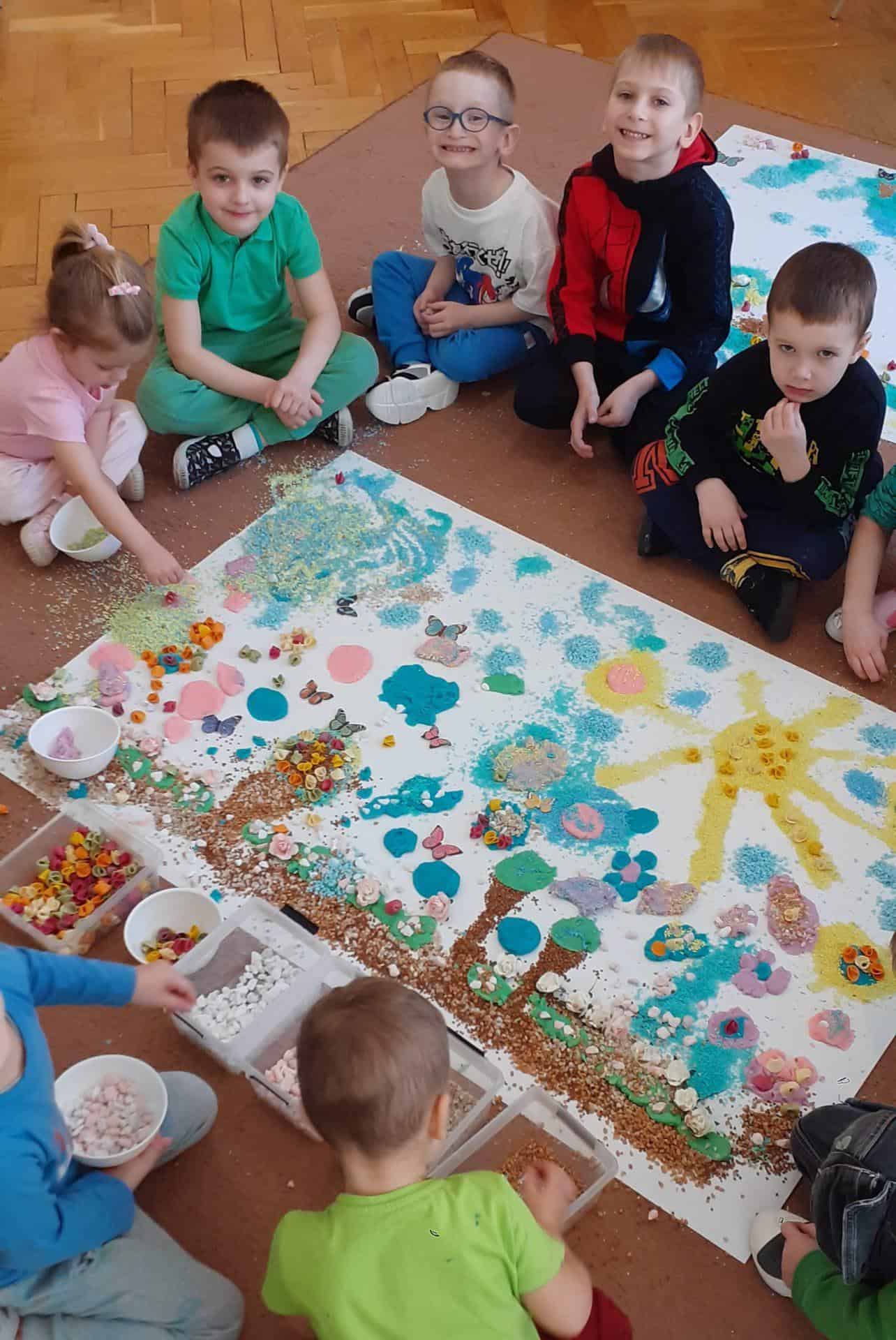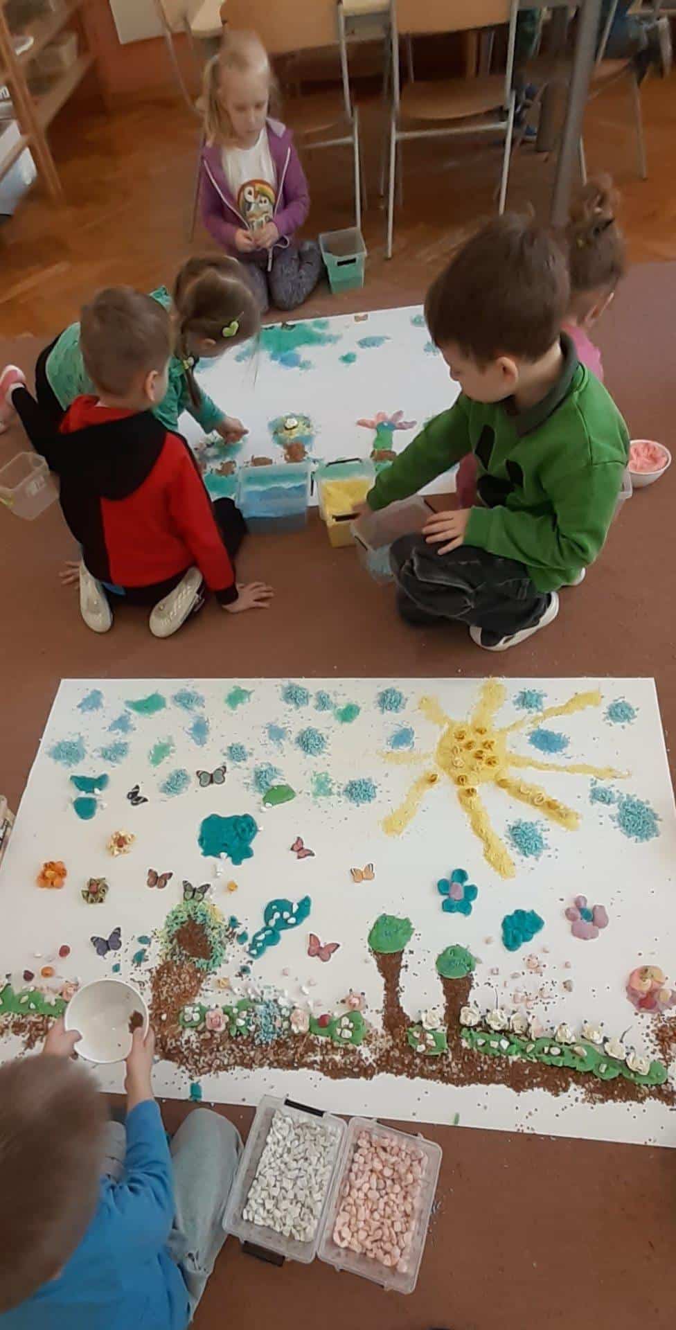 Kreatywne powitanie wiosny z wykorzystaniem kamyczków, makaronu, barwionego ryżu, kaszy i ciastoliny. Dzieci rozwijając swoją kreatywność stworzyły piękny obraz wiosny. Brawo!