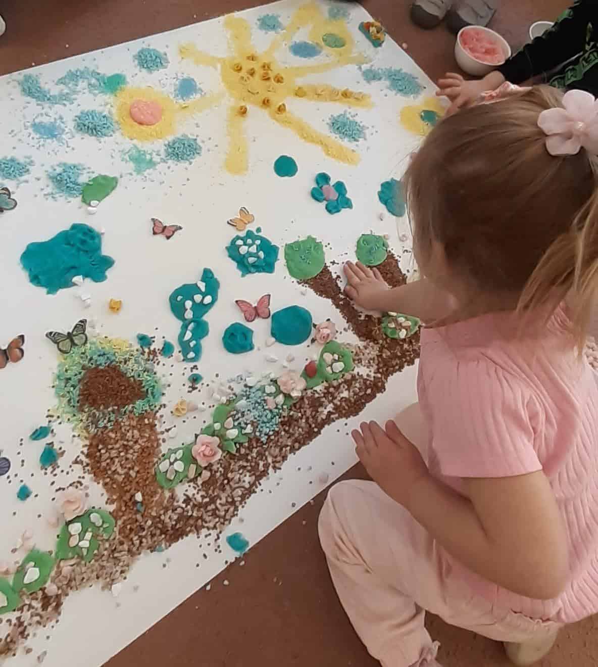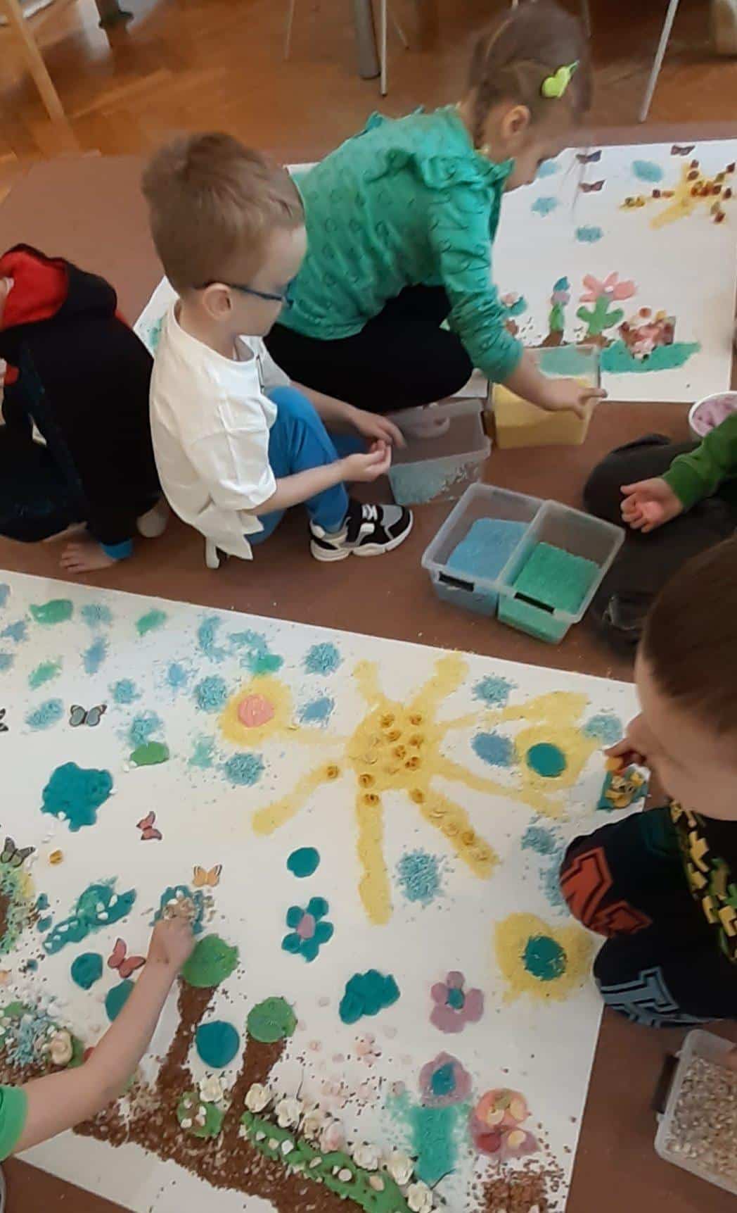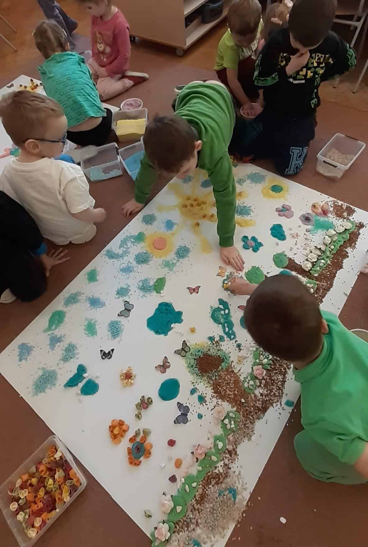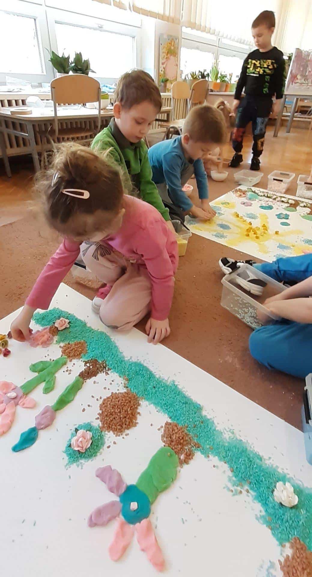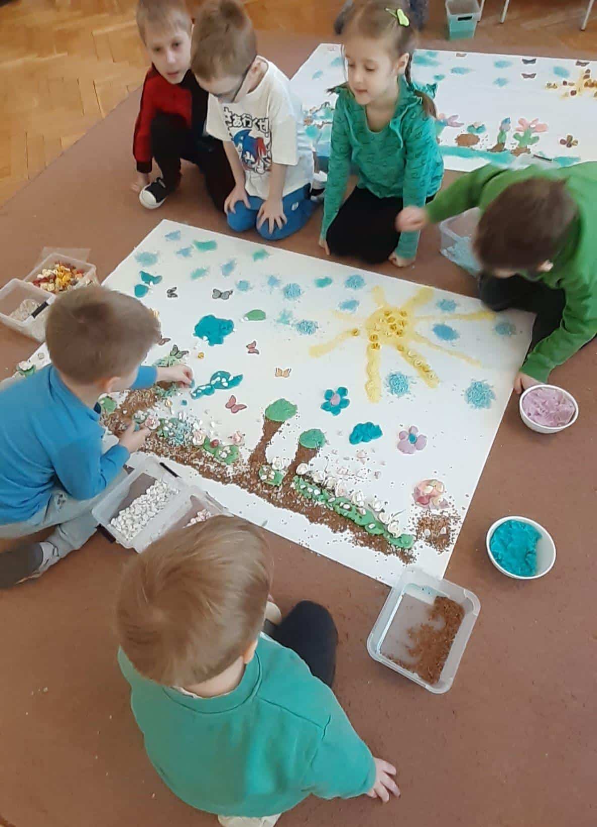 Kreatywne powitanie wiosny z wykorzystaniem kamyczków, makaronu, barwionego ryżu, kaszy i ciastoliny. Dzieci rozwijając swoją kreatywność stworzyły piękny obraz wiosny. Brawo!