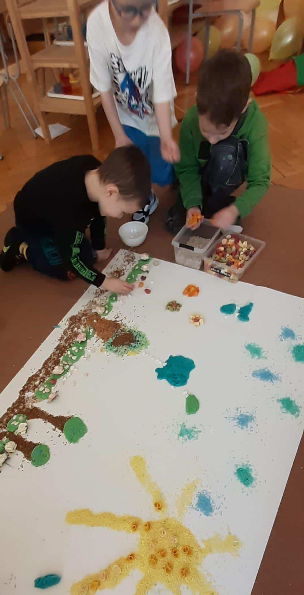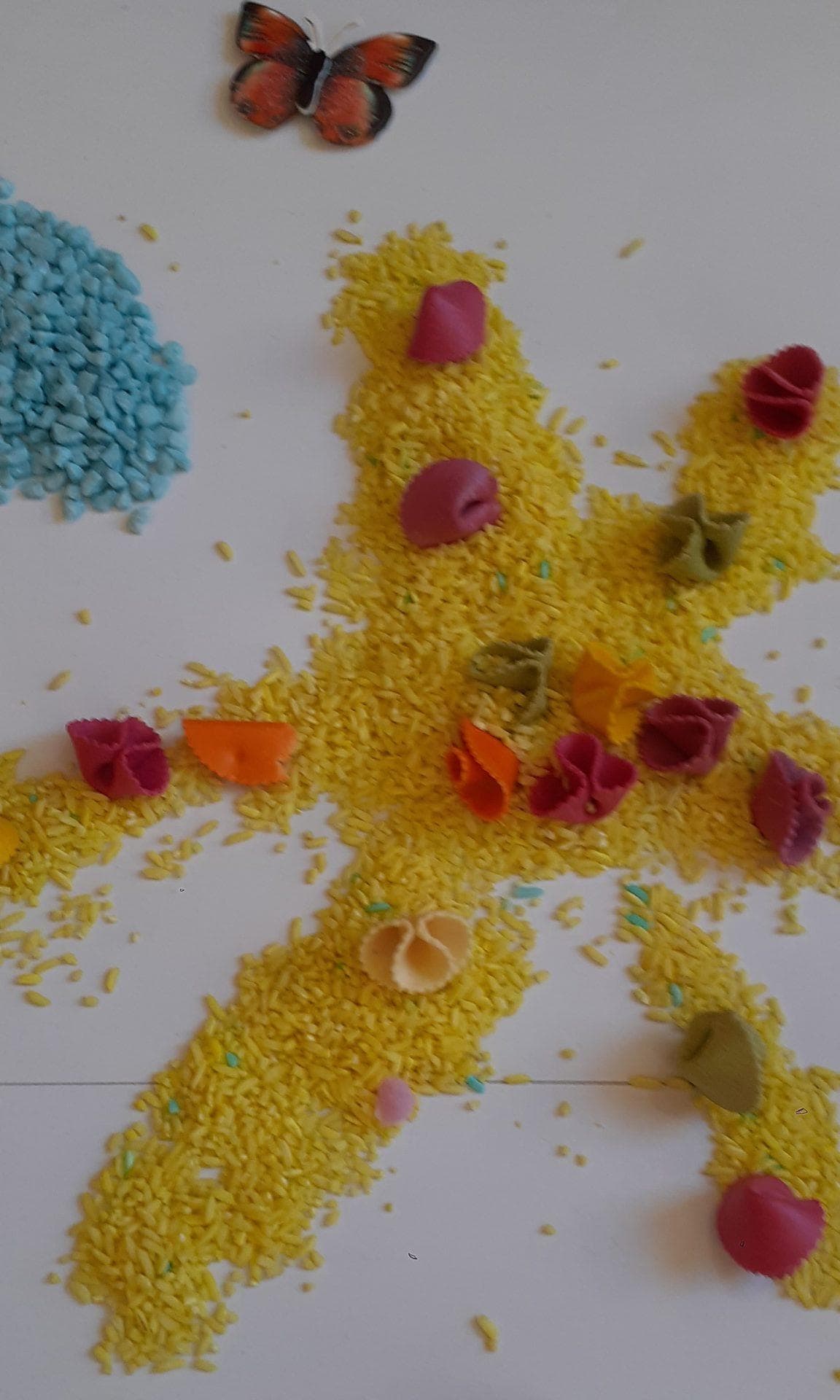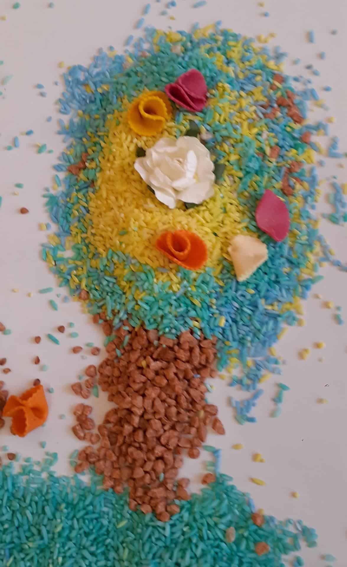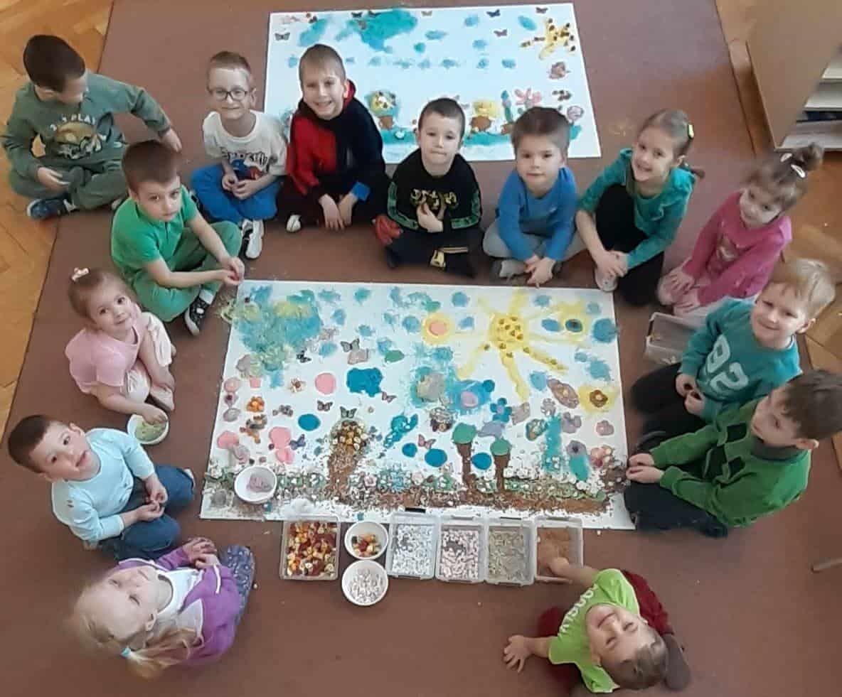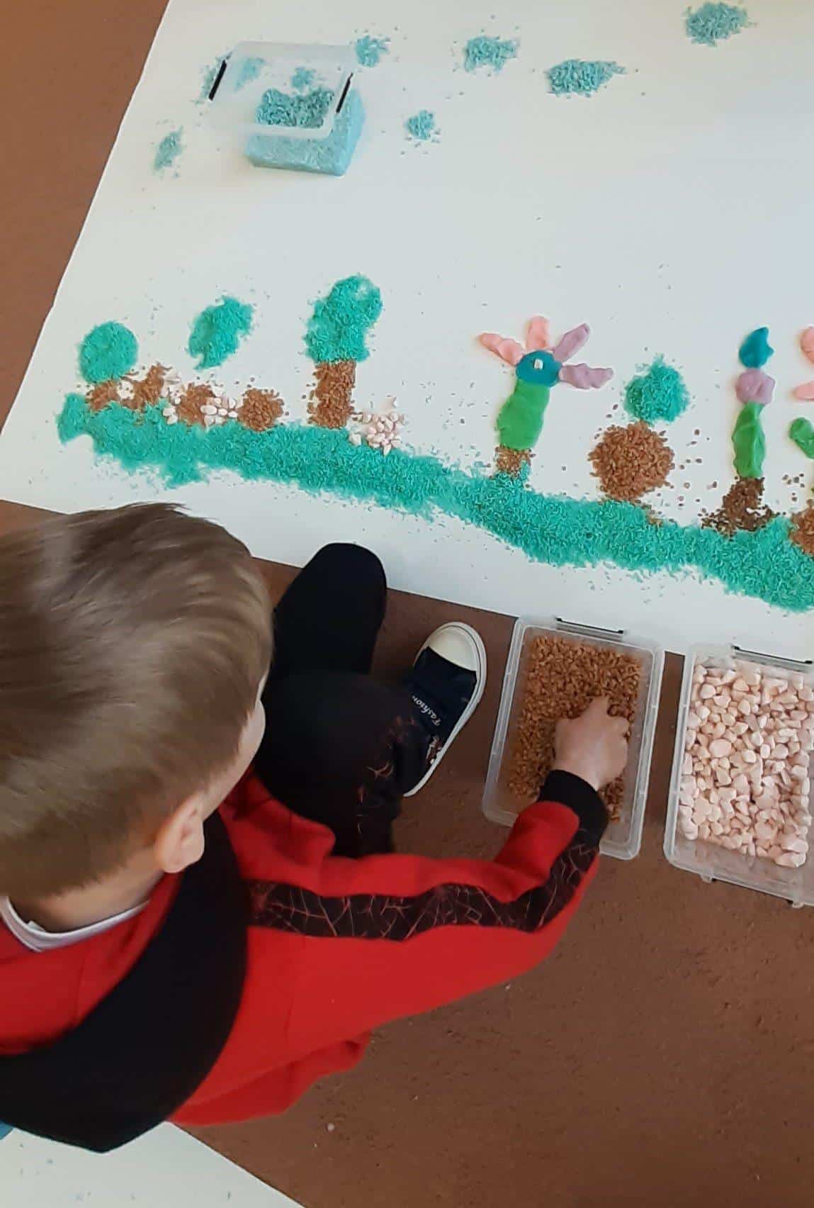 Kreatywne powitanie wiosny z wykorzystaniem kamyczków, makaronu, barwionego ryżu, kaszy i ciastoliny. Dzieci rozwijając swoją kreatywność stworzyły piękny obraz wiosny. Brawo!