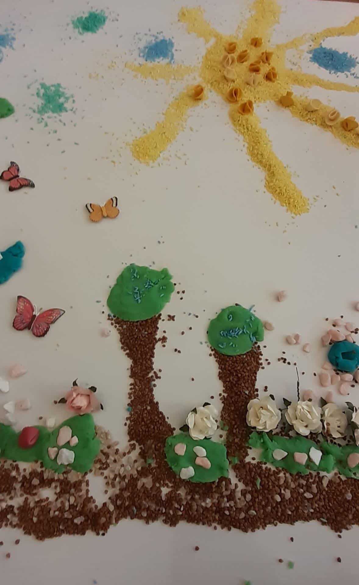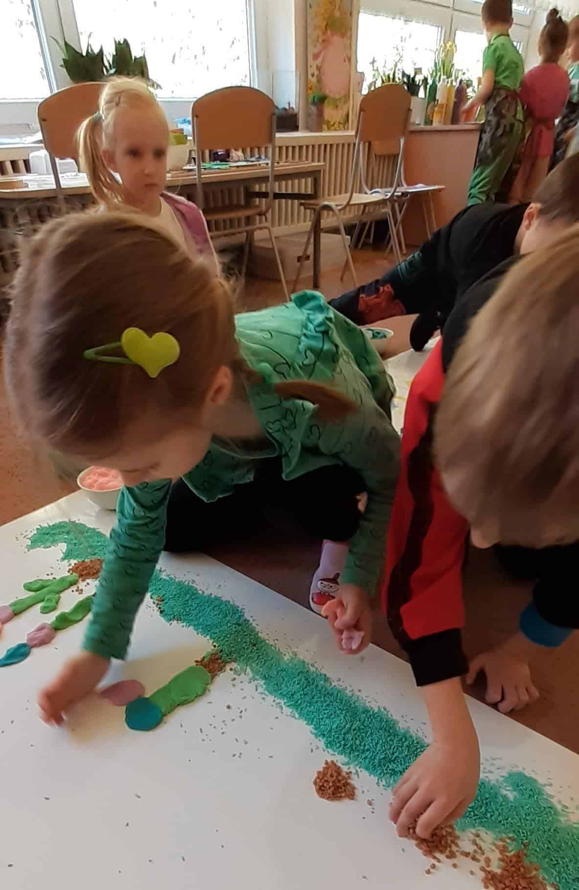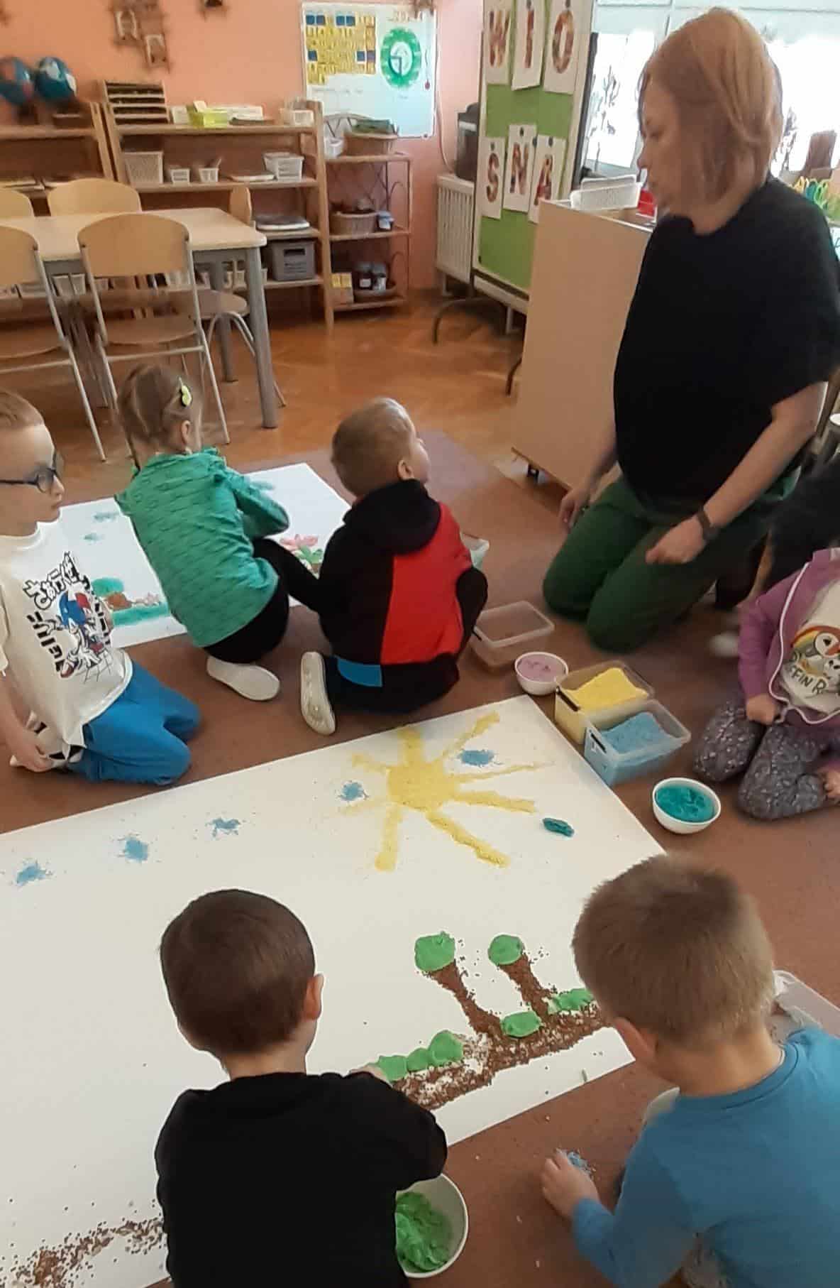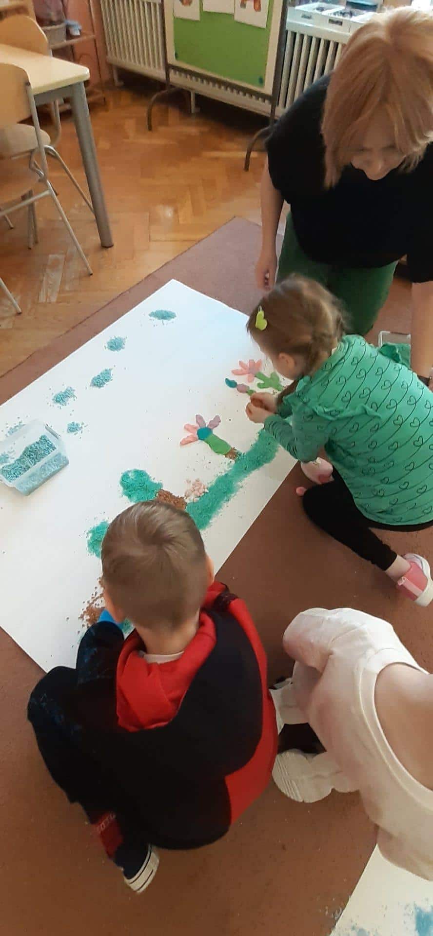 Kreatywne powitanie wiosny z wykorzystaniem kamyczków, makaronu, barwionego ryżu, kaszy i ciastoliny. Dzieci rozwijając swoją kreatywność stworzyły piękny obraz wiosny. Brawo!