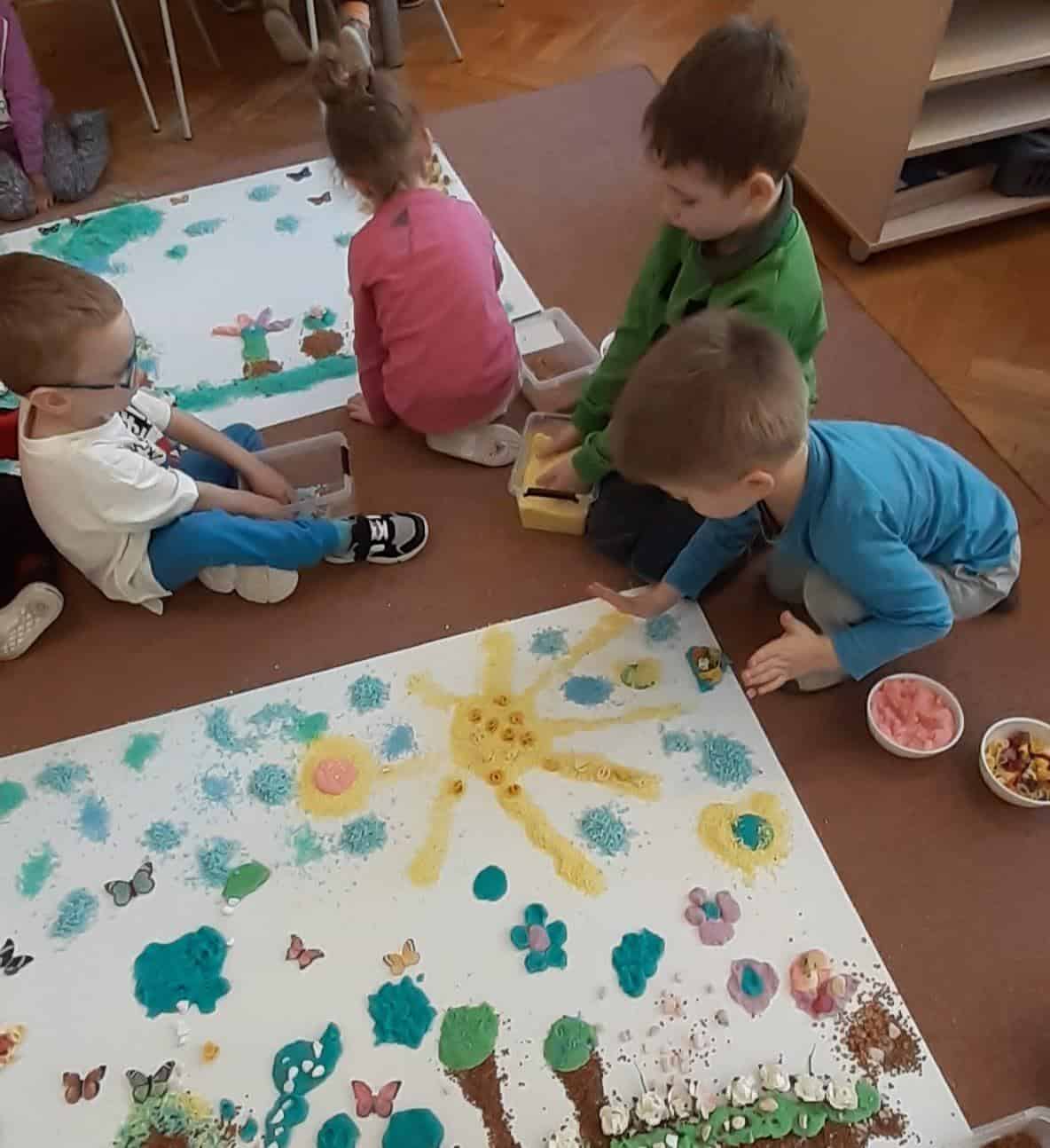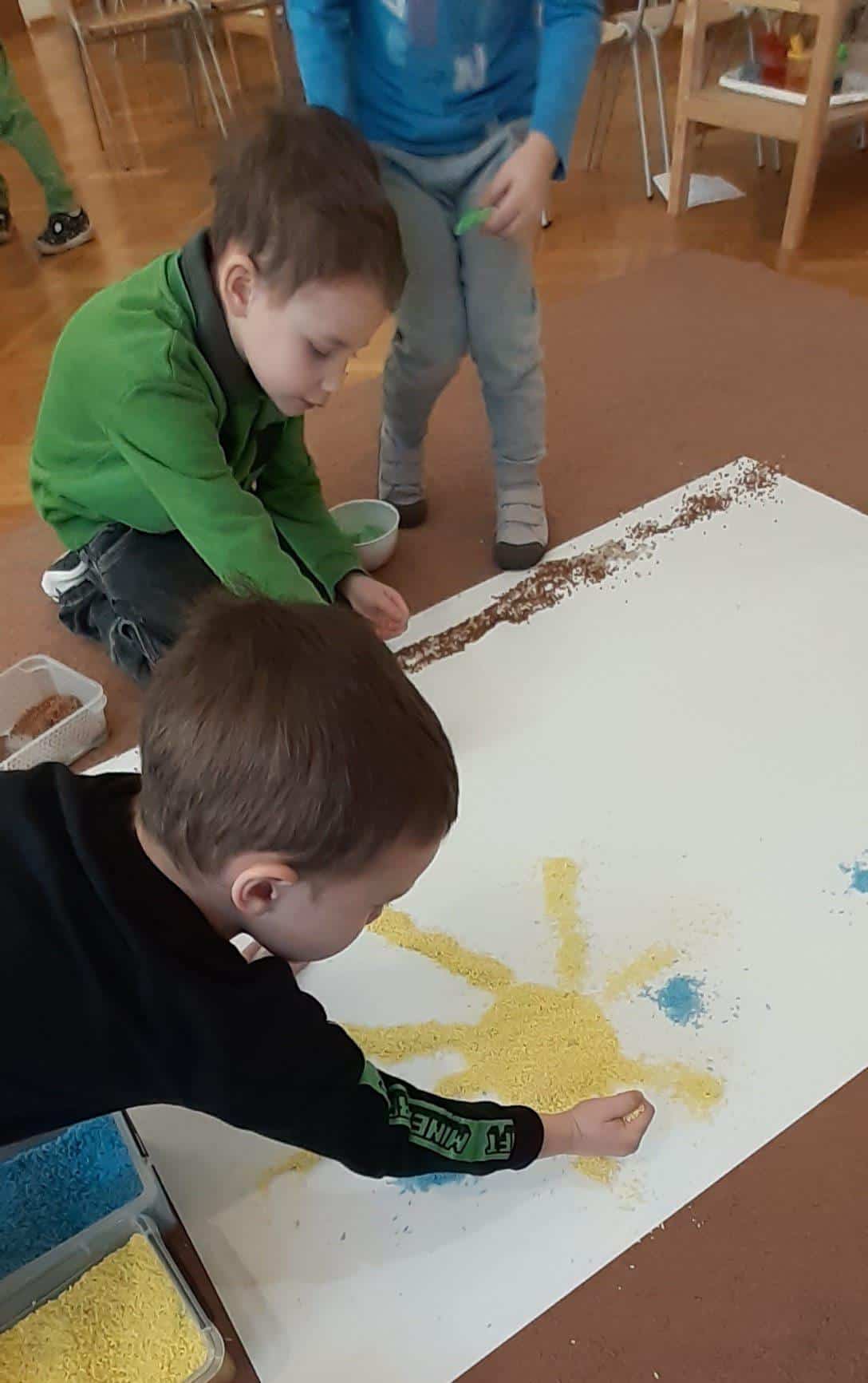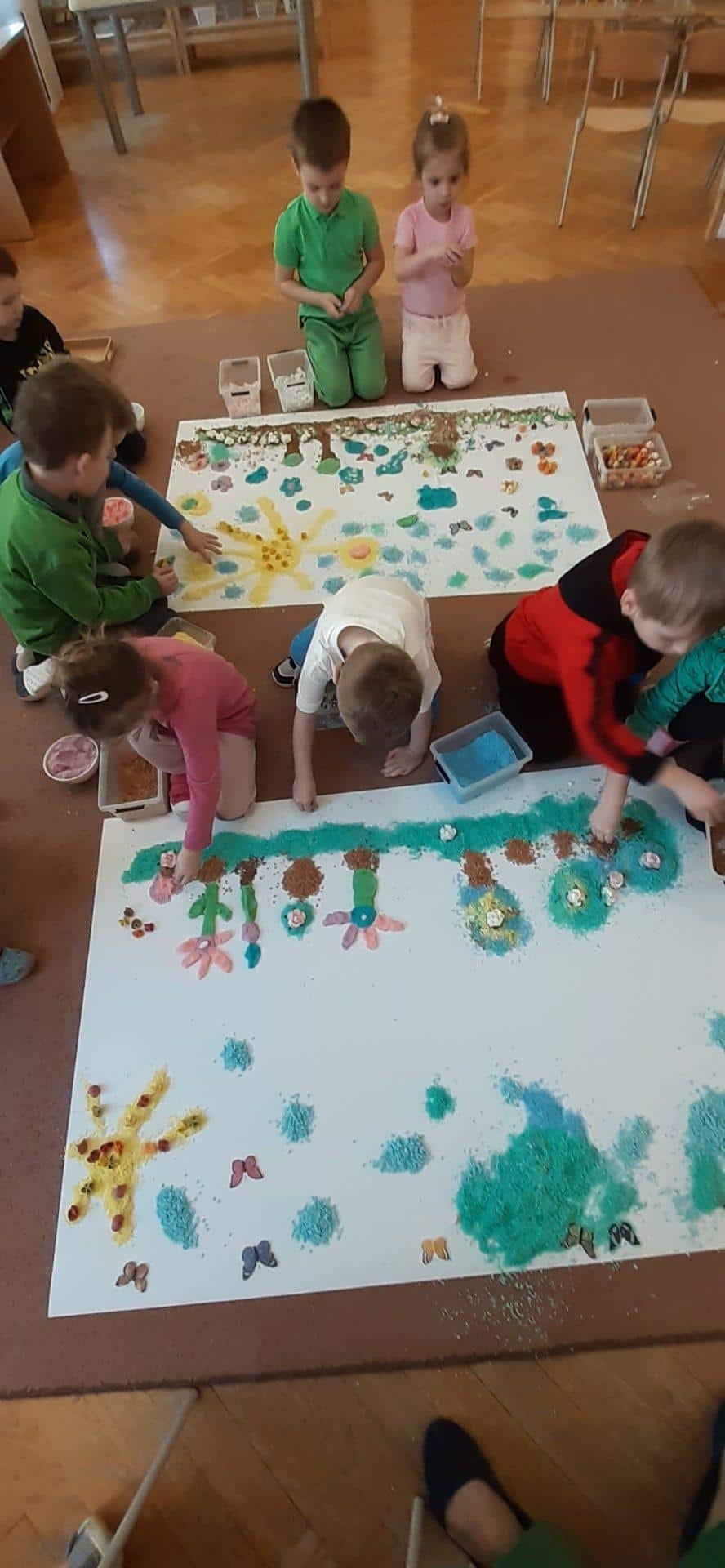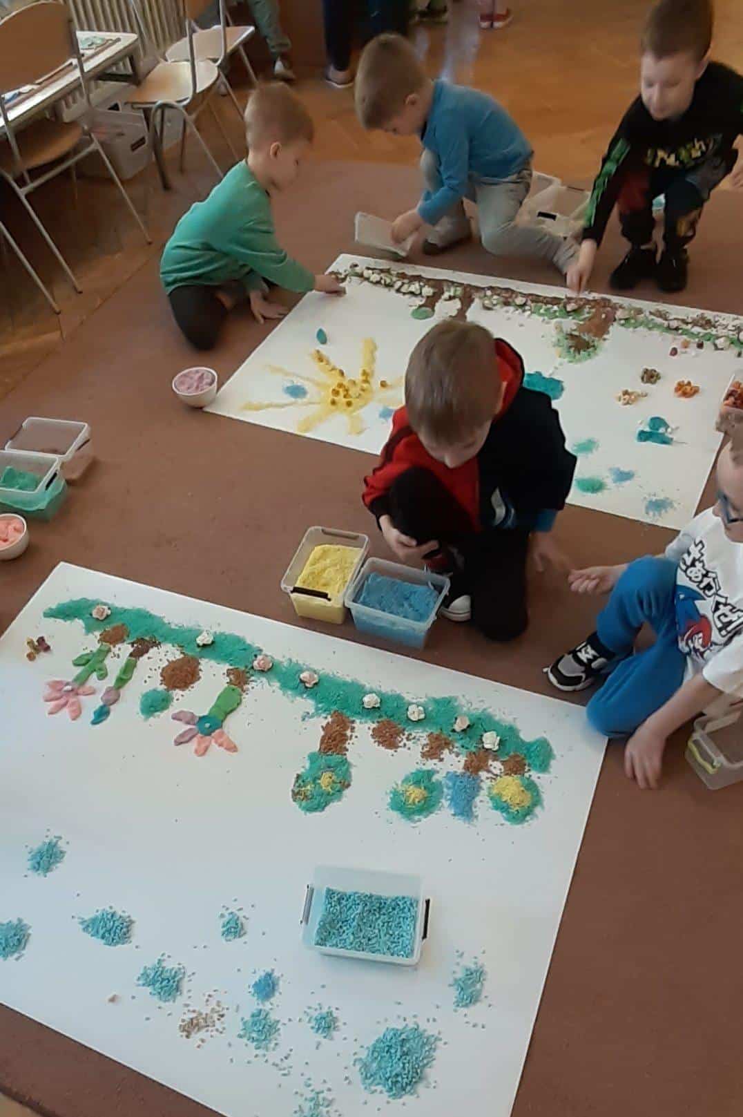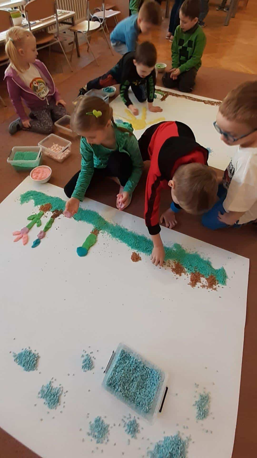 Kreatywne powitanie wiosny z wykorzystaniem kamyczków, makaronu, barwionego ryżu, kaszy i ciastoliny. Dzieci rozwijając swoją kreatywność stworzyły piękny obraz wiosny. Brawo!