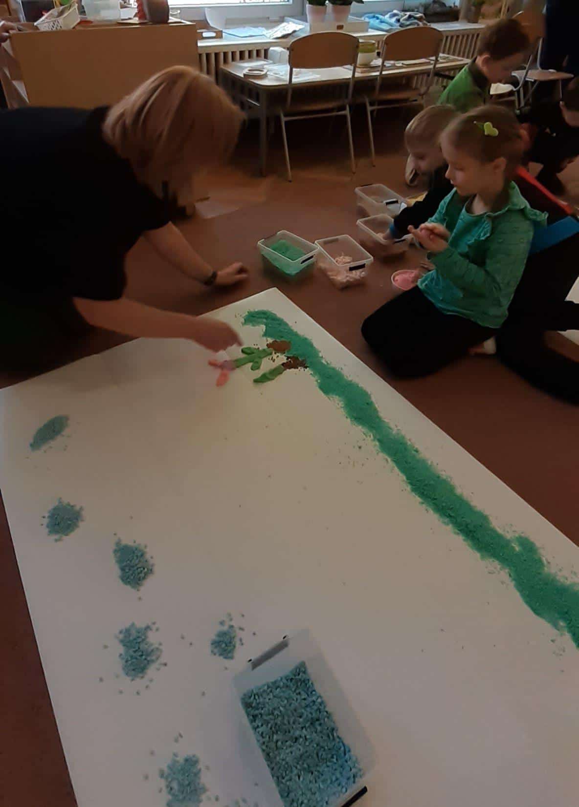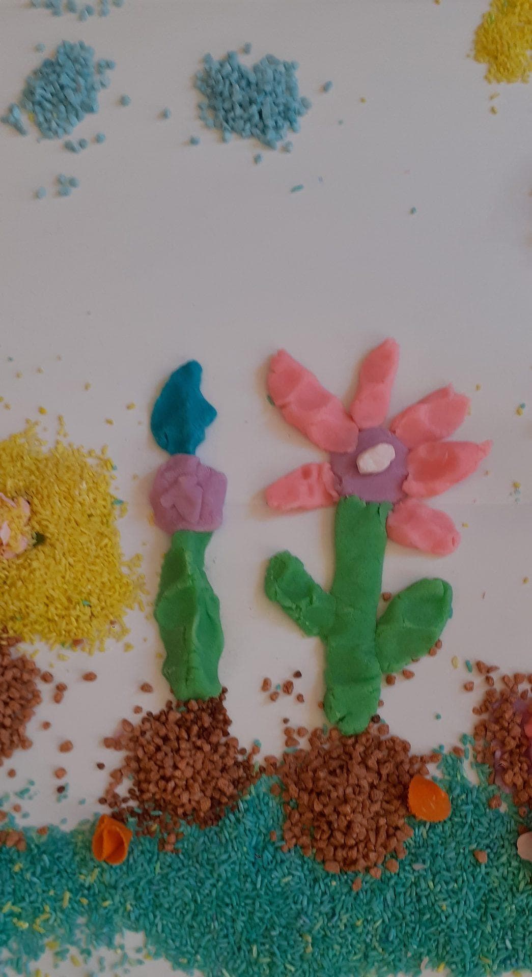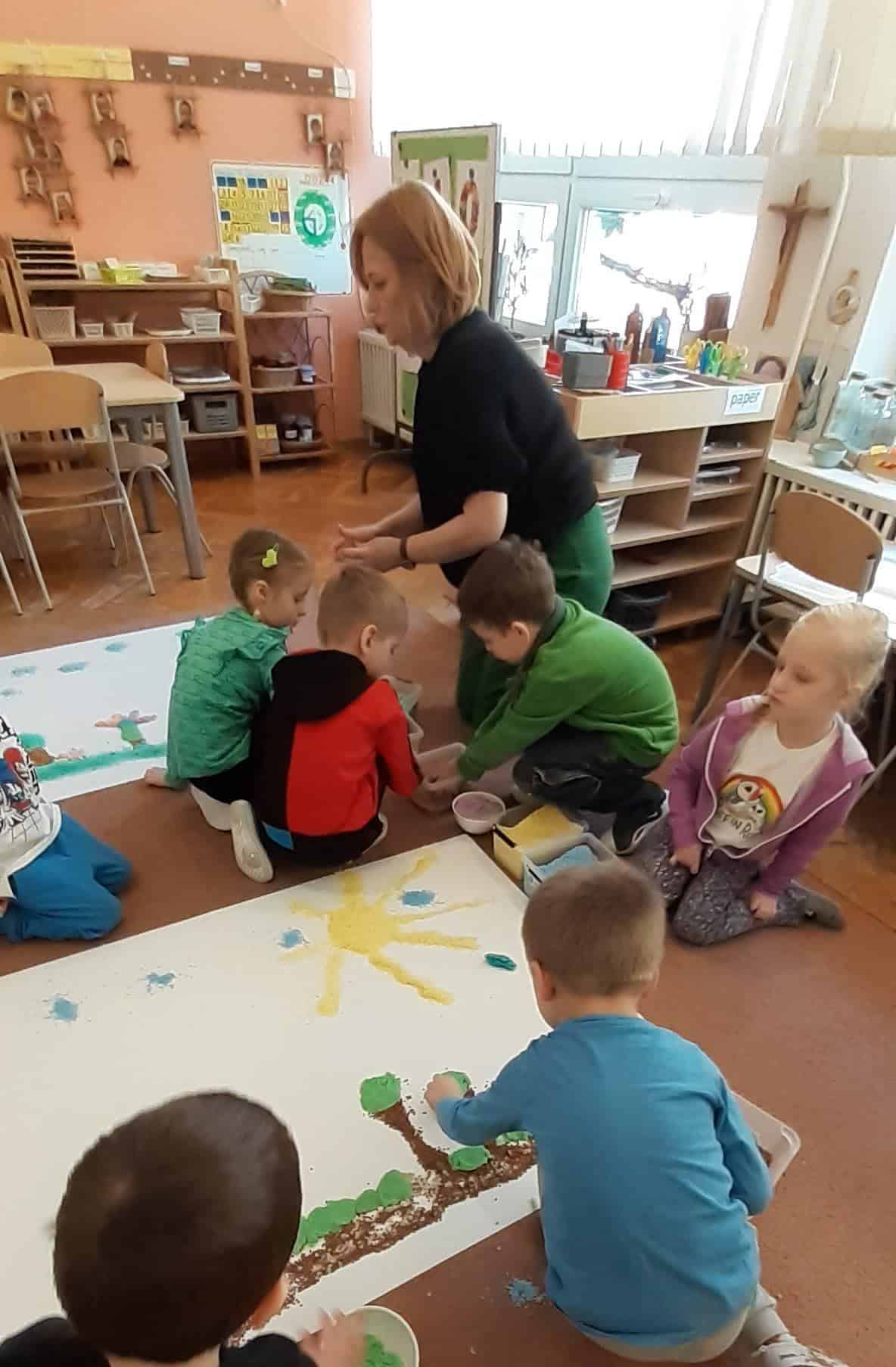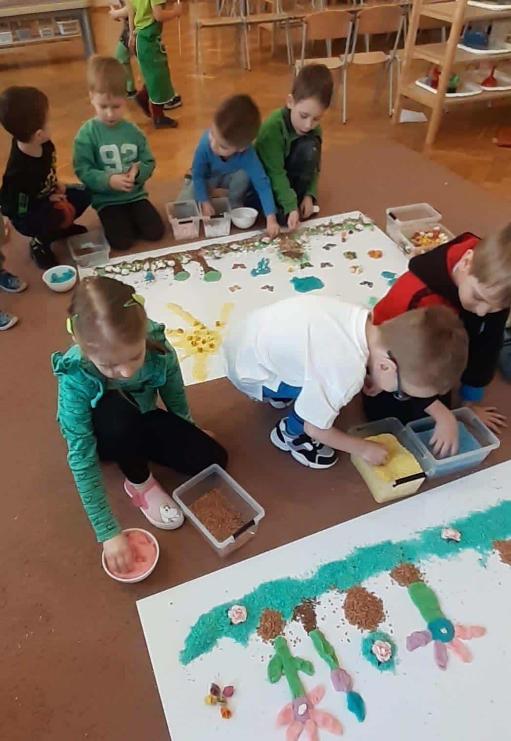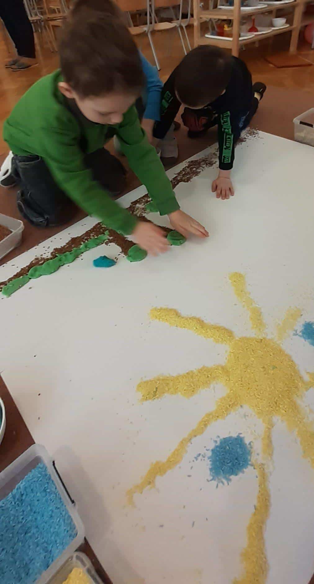 Kreatywne powitanie wiosny z wykorzystaniem kamyczków, makaronu, barwionego ryżu, kaszy i ciastoliny. Dzieci rozwijając swoją kreatywność stworzyły piękny obraz wiosny. Brawo!