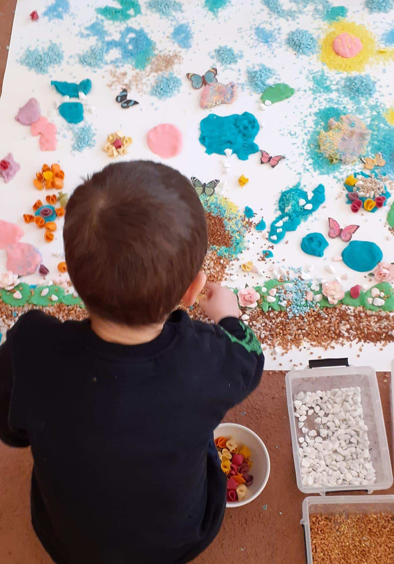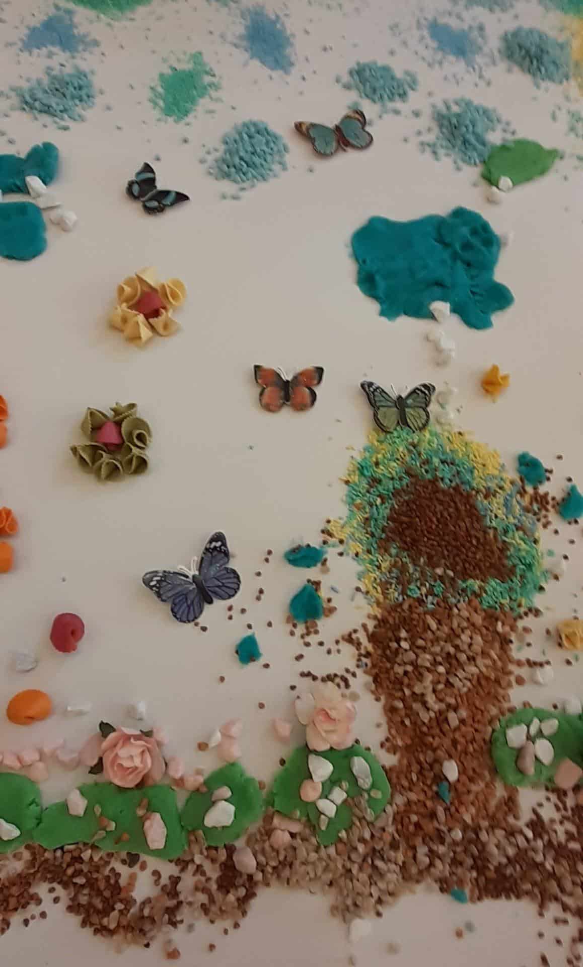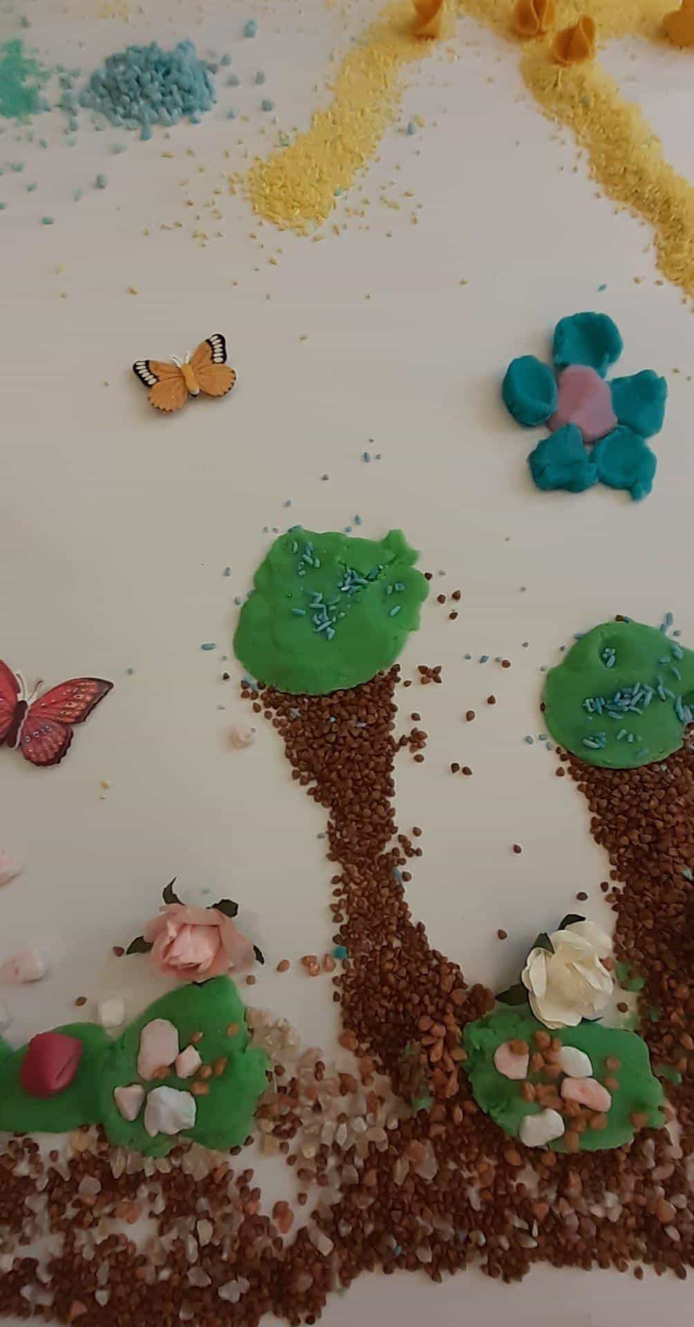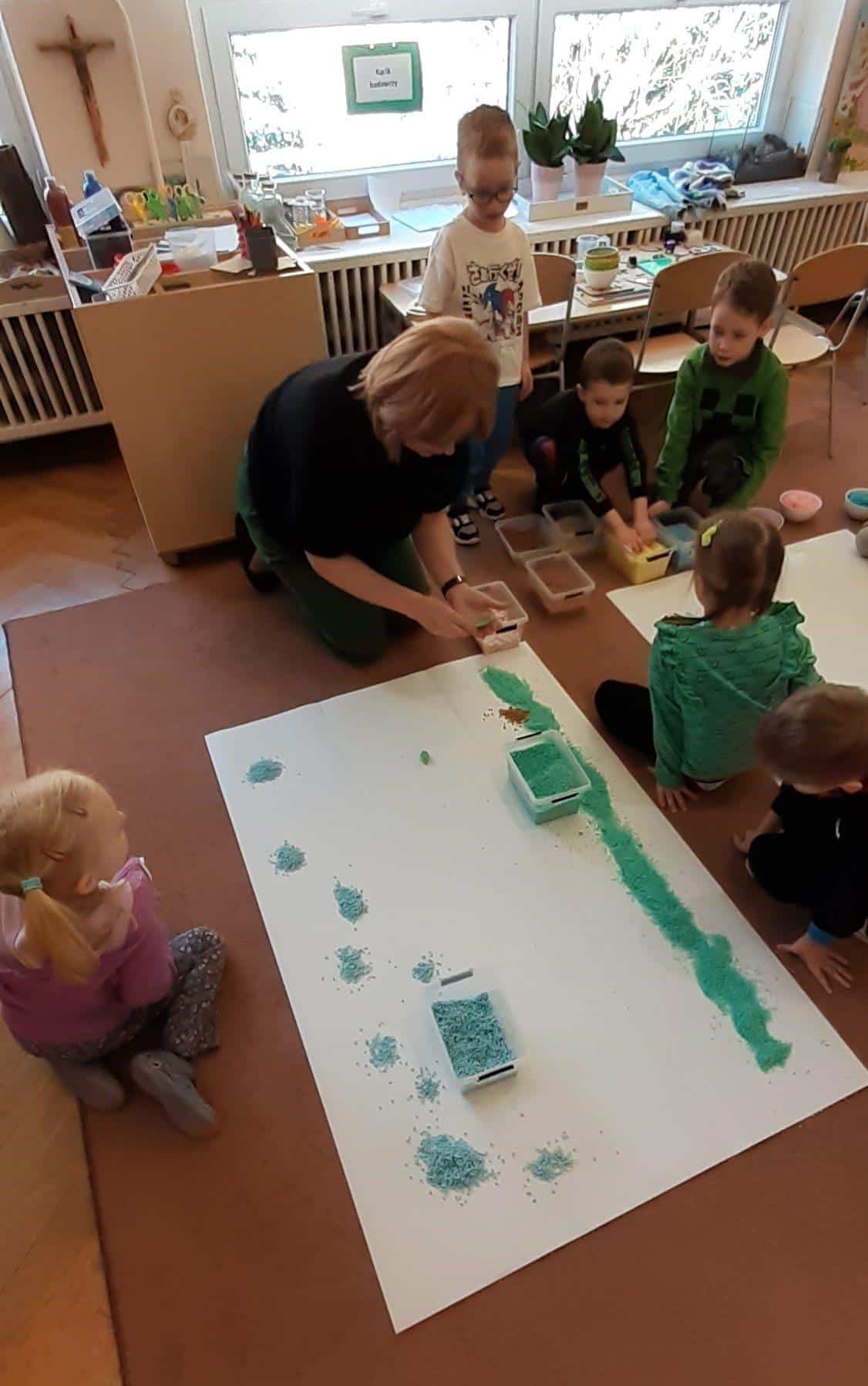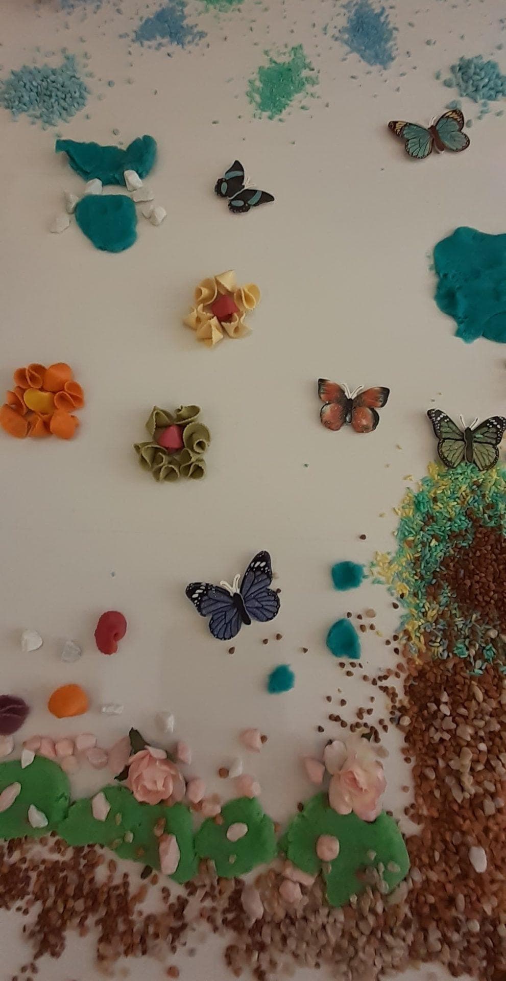 Kreatywne powitanie wiosny z wykorzystaniem kamyczków, makaronu, barwionego ryżu, kaszy i ciastoliny. Dzieci rozwijając swoją kreatywność stworzyły piękny obraz wiosny. Brawo!