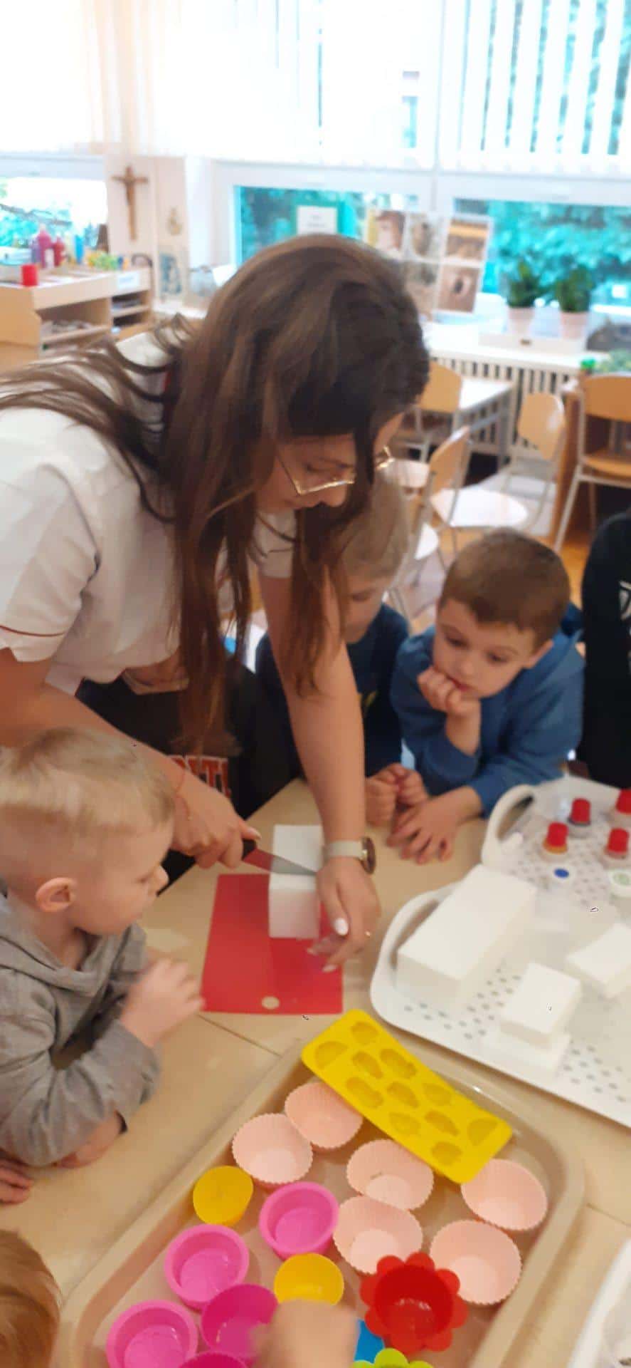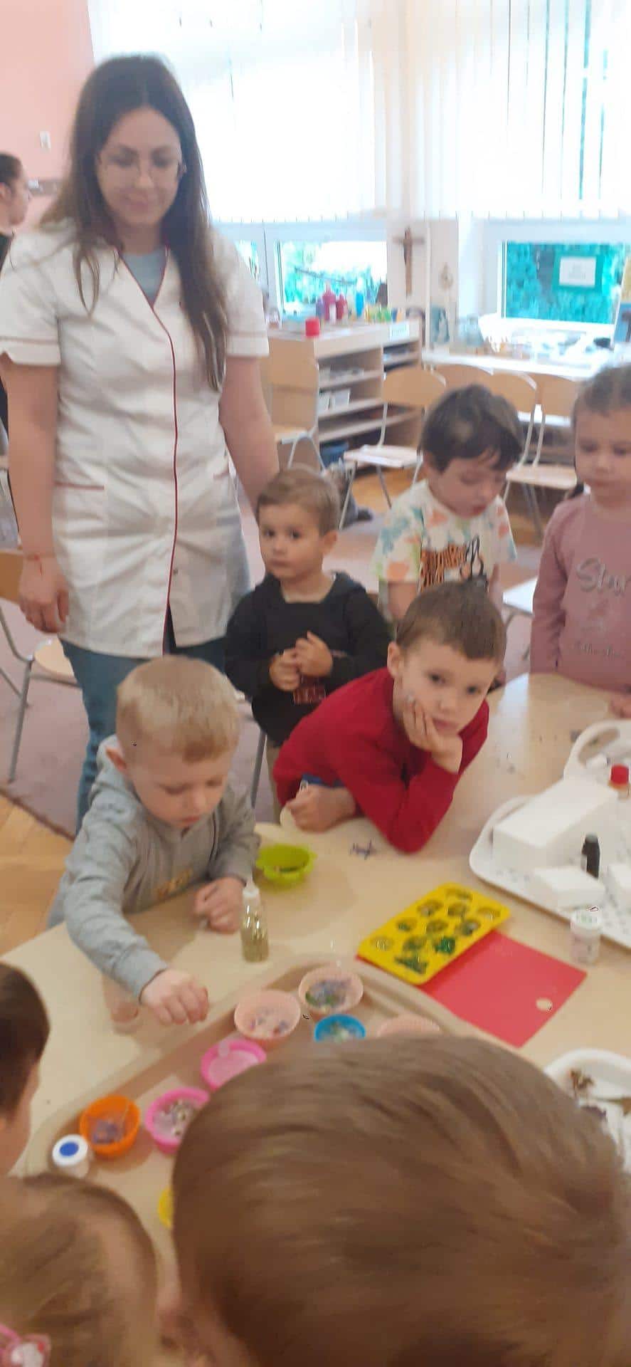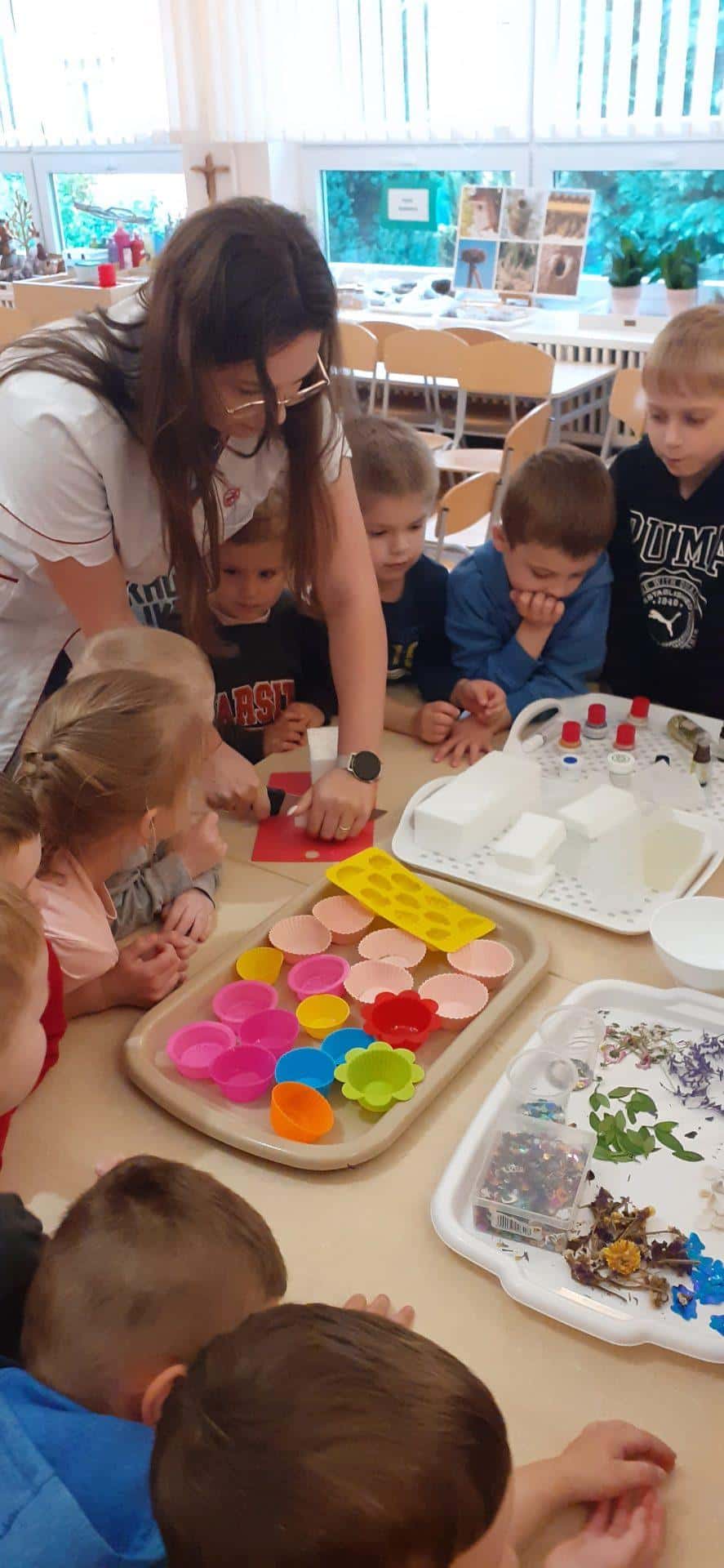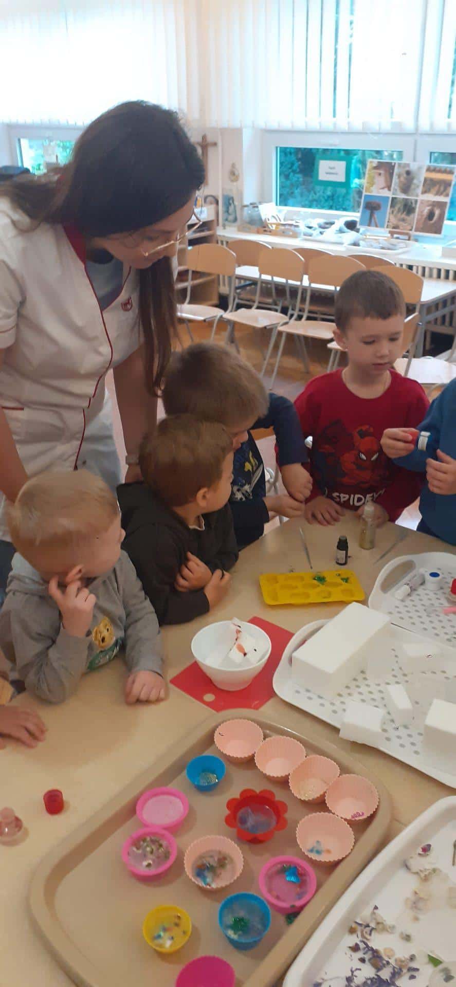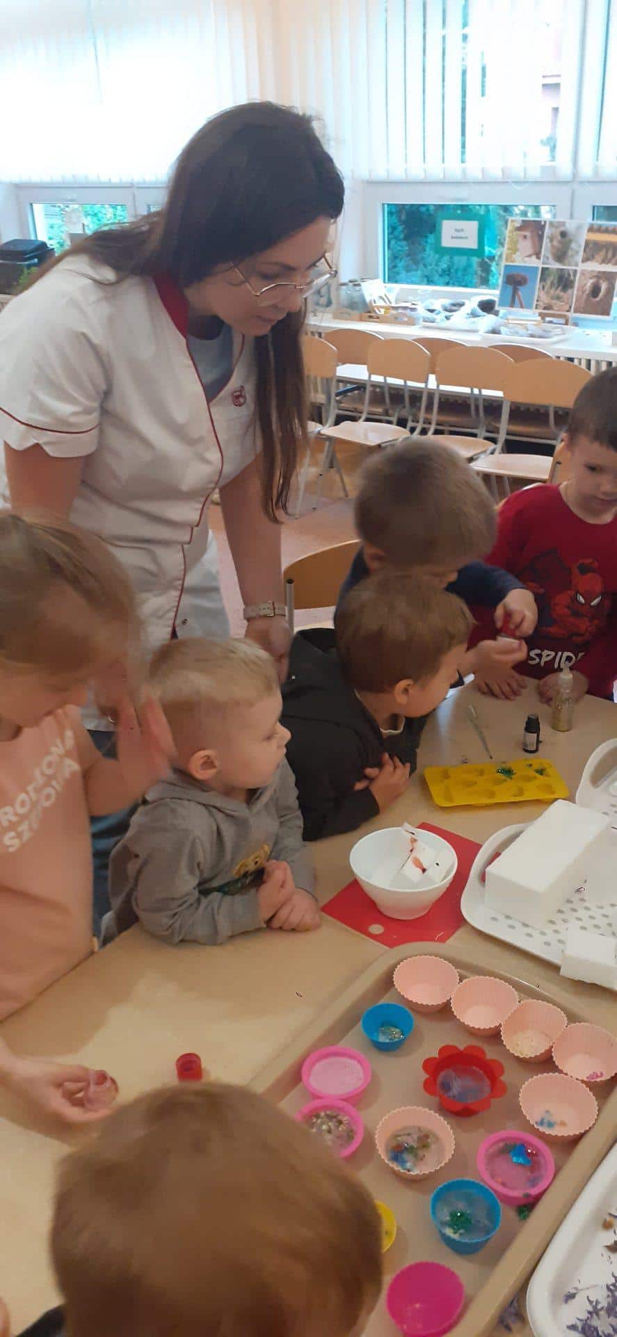 Pani Paulina, mama Julka pracująca na co dzień w drogerii kosmetycznej opowiedziała dzieciom o swojej pracy w ramach realizacji programu preorientacji zawodowej przedszkolaków, a także przeprowadziła warsztaty, podczas których powstały kolorowe, pachnące mydełka. Dziękujemy !!!