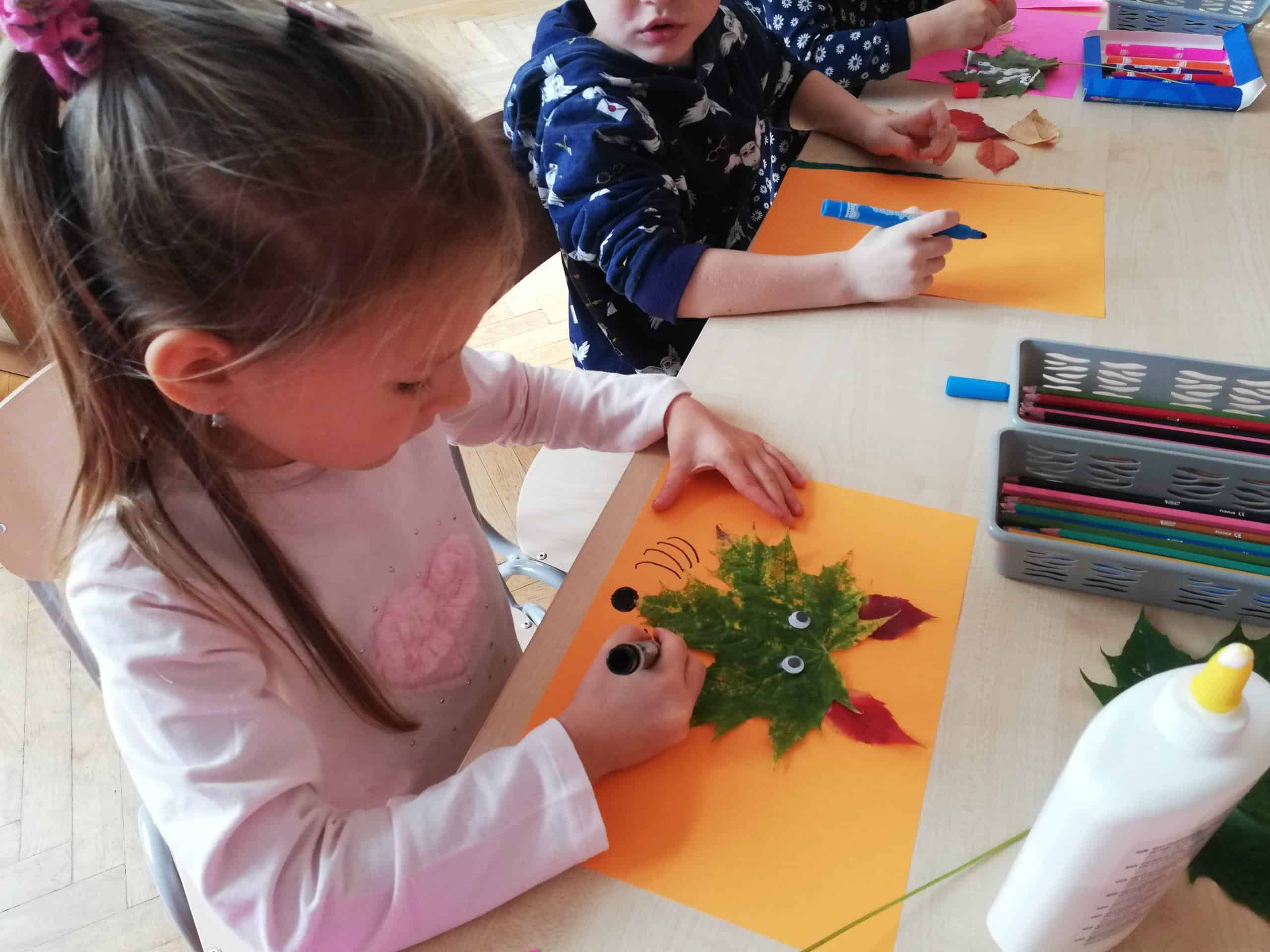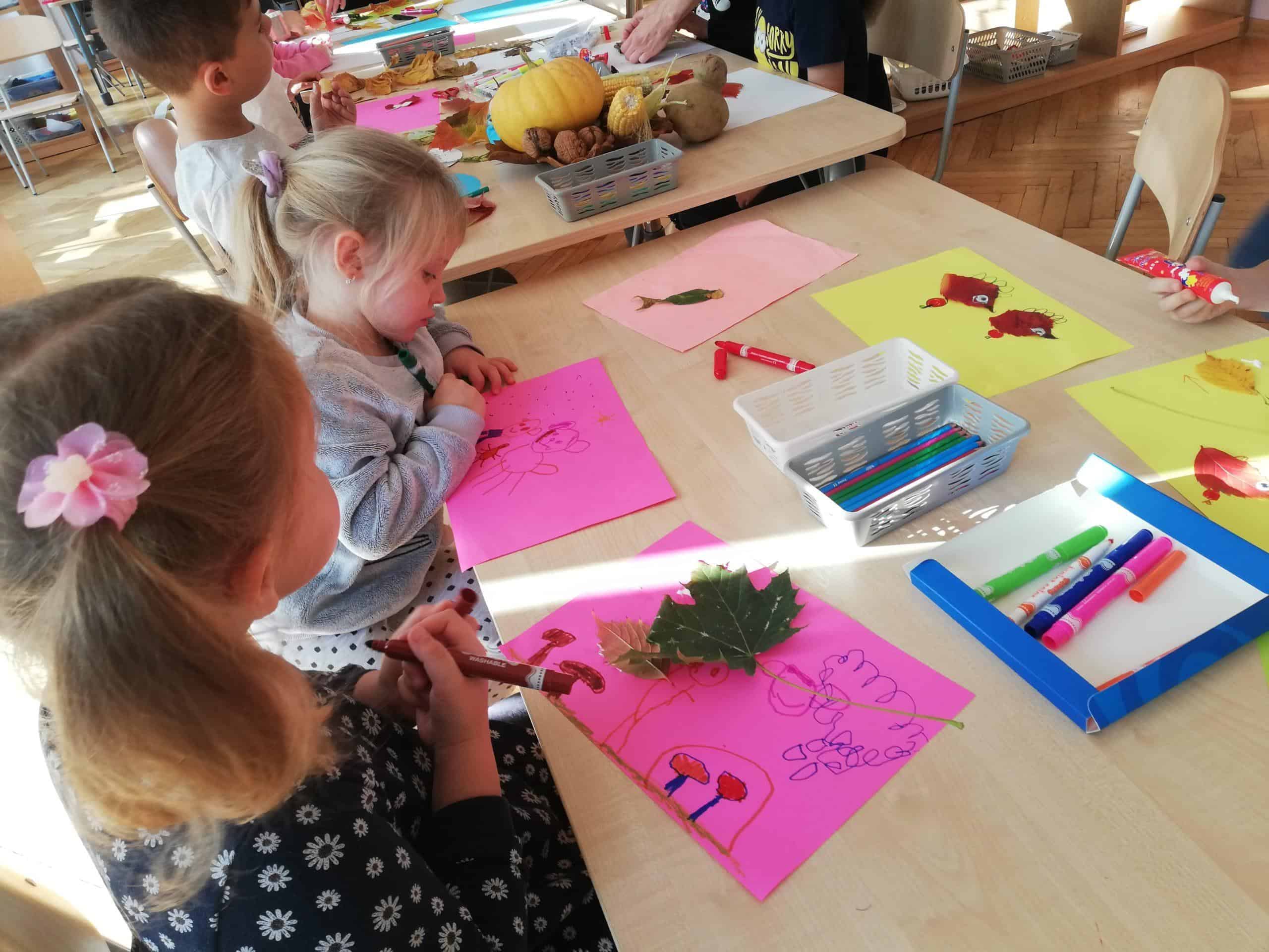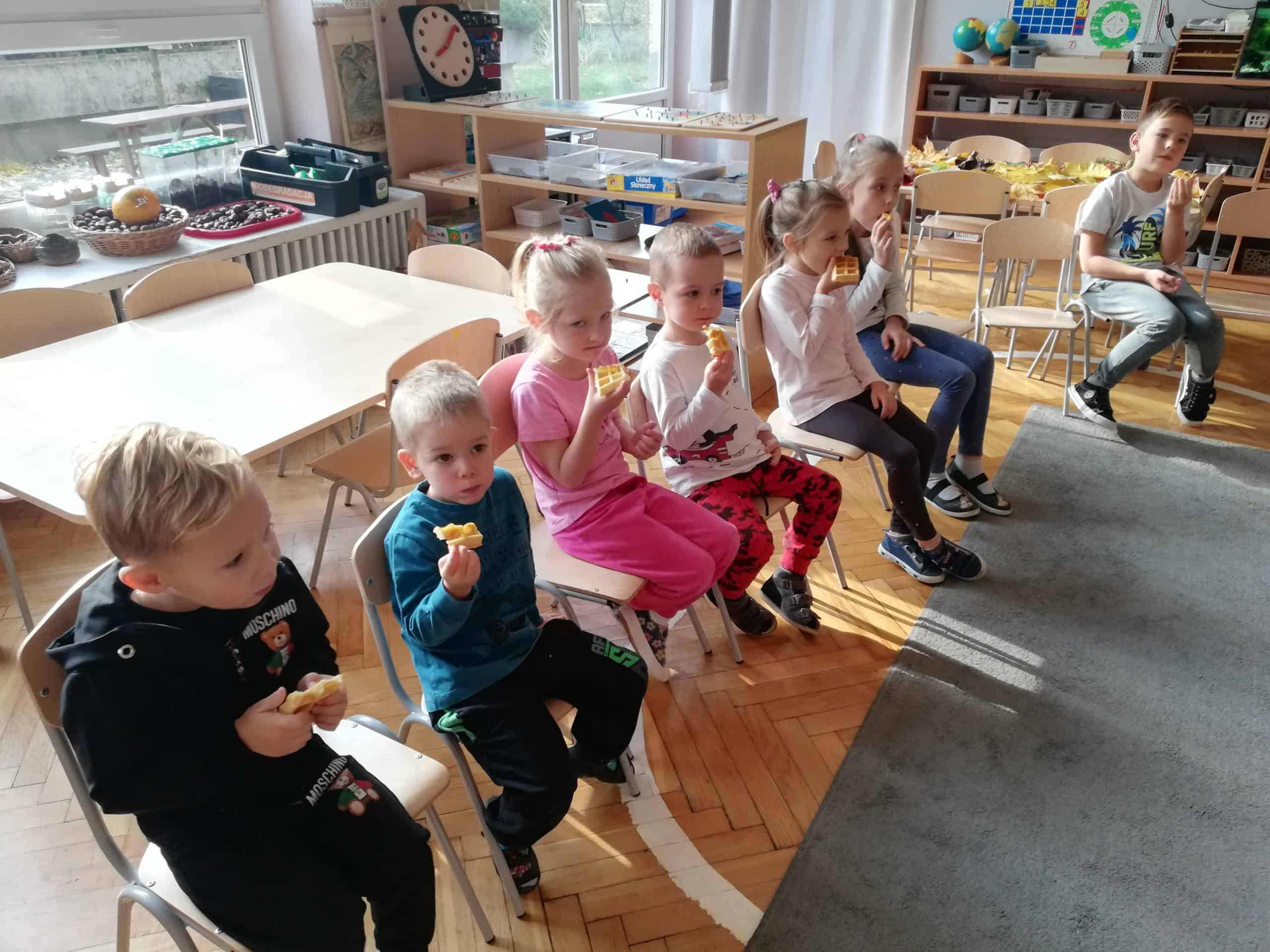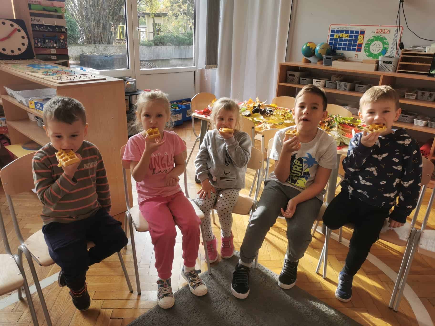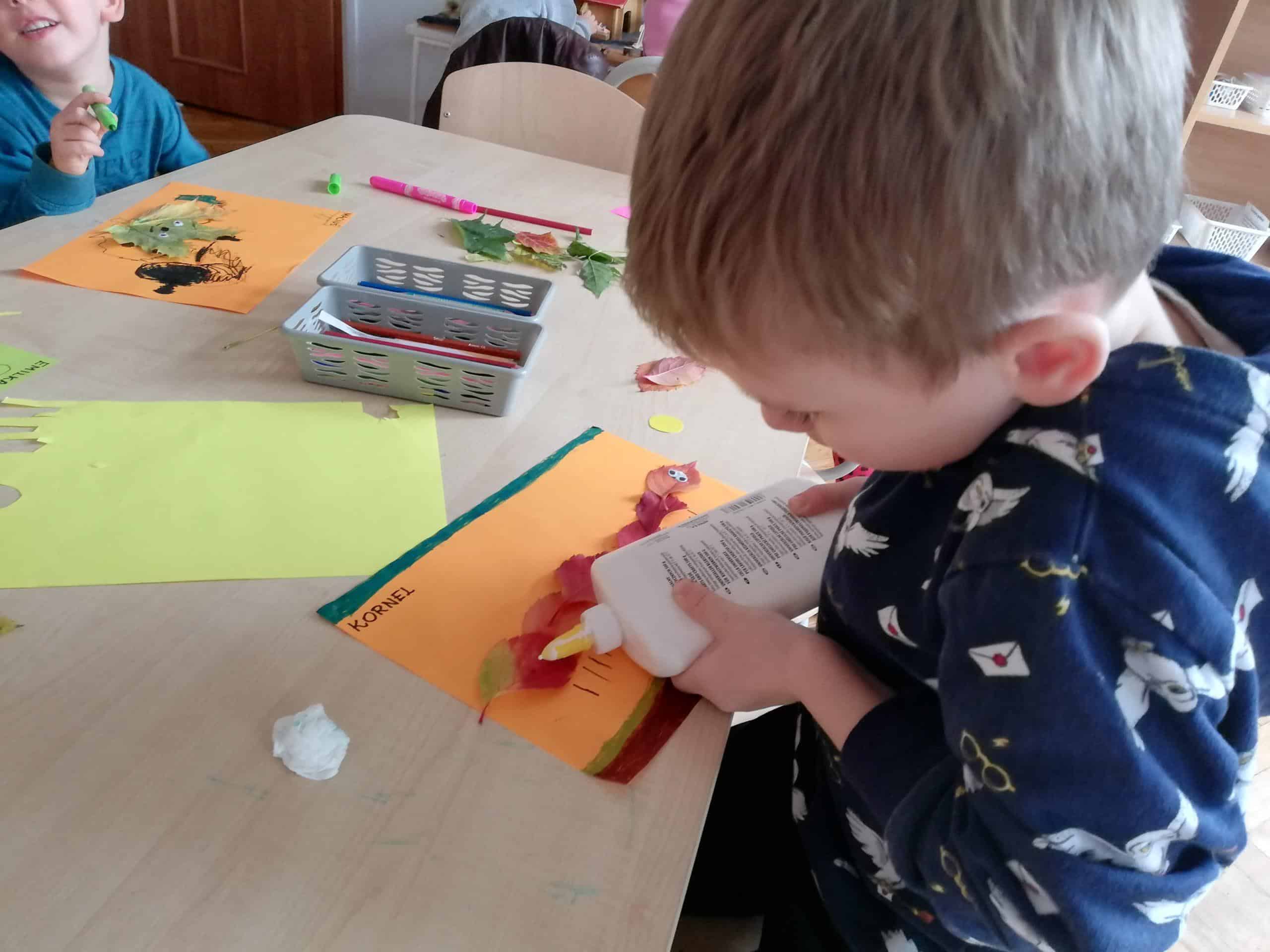 Dżemy te nie były słodzone cukrem, tylko naturalnym miodem. Były zatem przepyszne i bardzo zdrowe. Pani Madzia zaprosiła wszystkich do degustacji. Przyniosła z domu świeżutko upieczone gofry, które w sali tylko podpiekła, żeby były ciepłe. Dzieci podchodziły do stolika i niczym w budce z goframi zamawiały gofra z wybranym dżemem. Asystentką Pani Madzia była Ninka, która smarowała gofry dżemem. Wszyscy z ogromnym apetytem zajadali się tymi pysznościami. Niektórzy nawet ustawiali się w kolejce po repetę. Gdy brzuszki były pełne mamusia Ninki zaproponowała aktywność plastyczno-techniczną z wykorzystaniem pięknych, różnorodnych jesiennych liści. Przygotowaliśmy stanowisko pracy i przystąpiliśmy do działania. Powstały piękne i twórcze prace, które możemy podziwiać na naszej grupowej gazetce w holu.