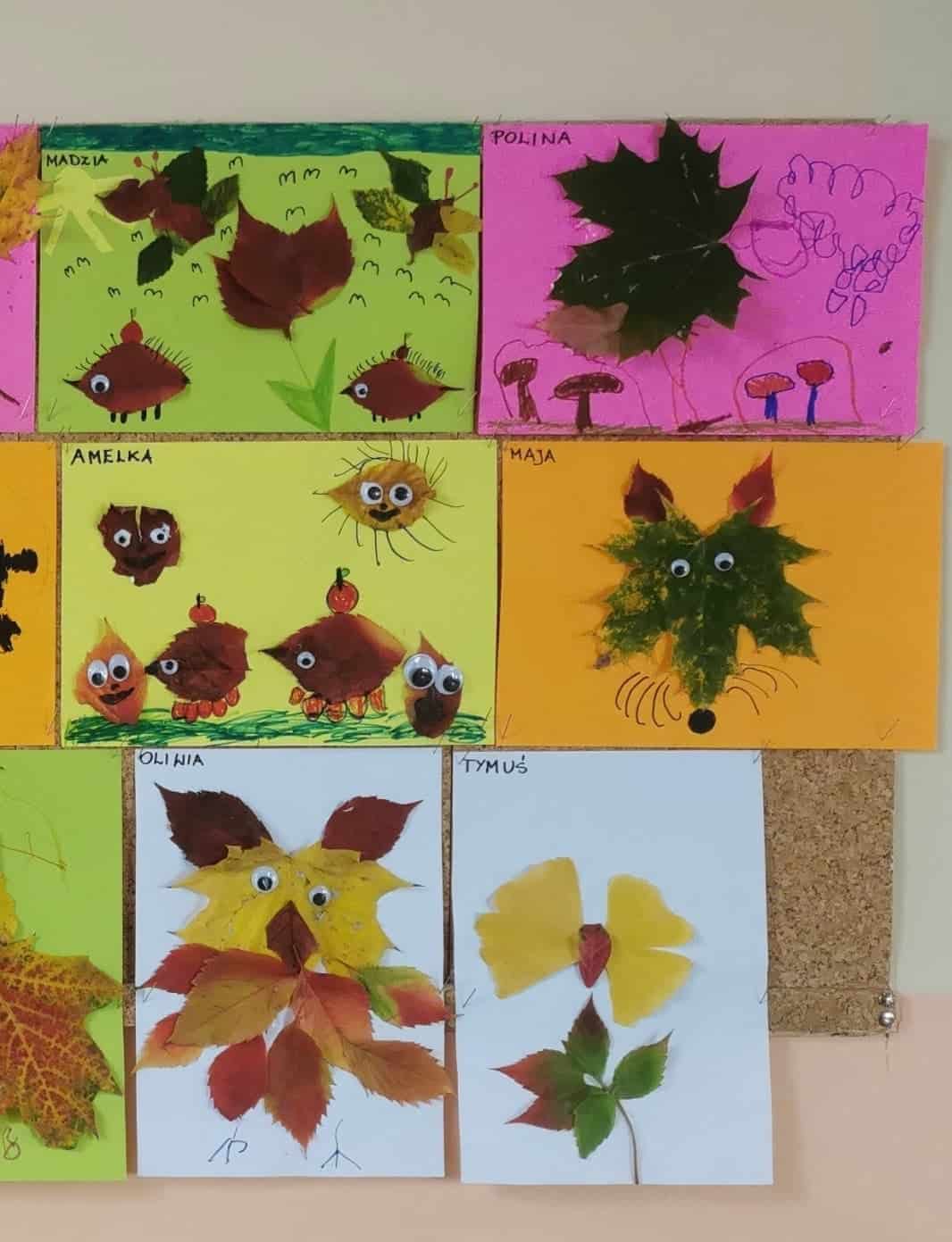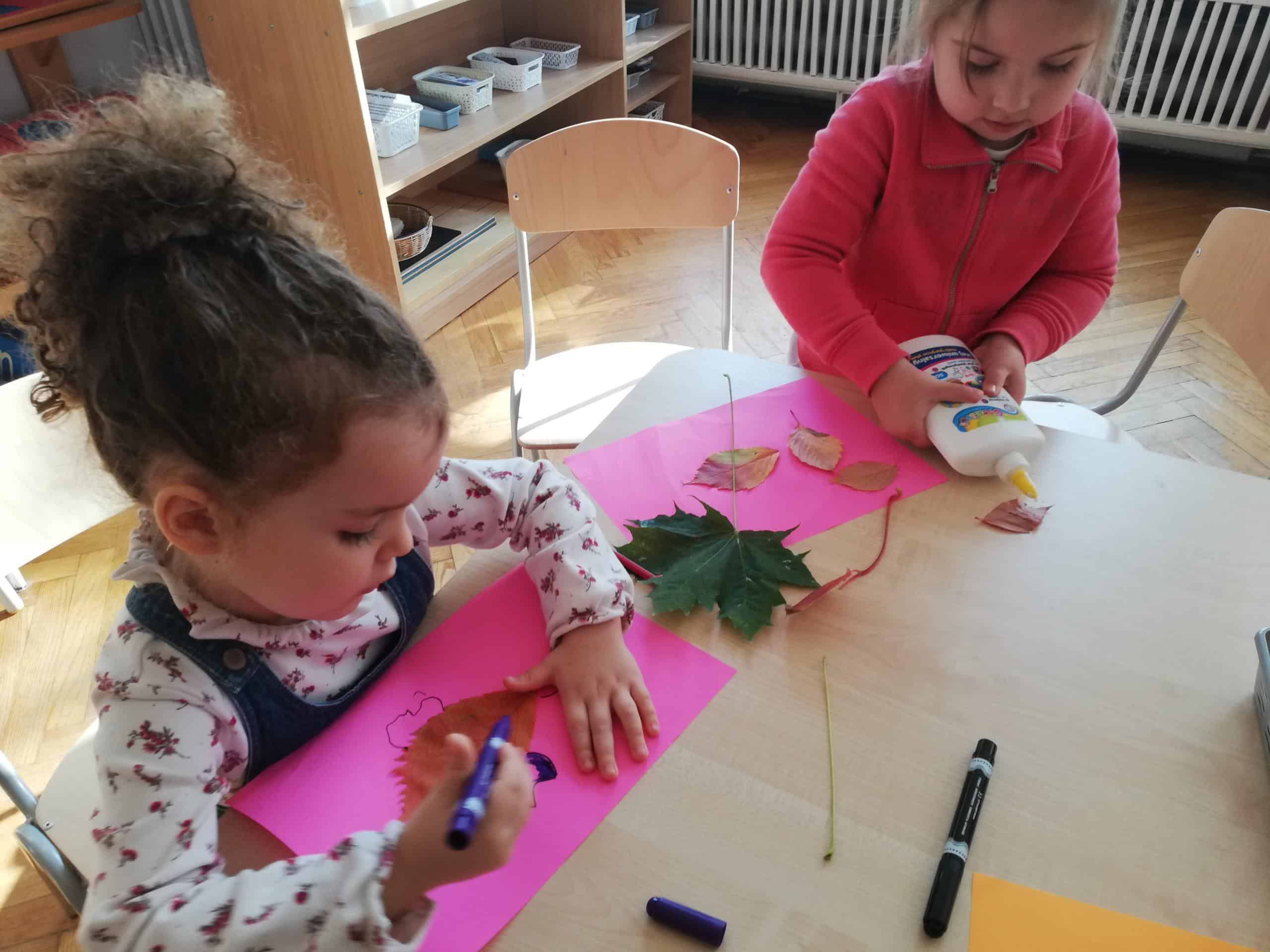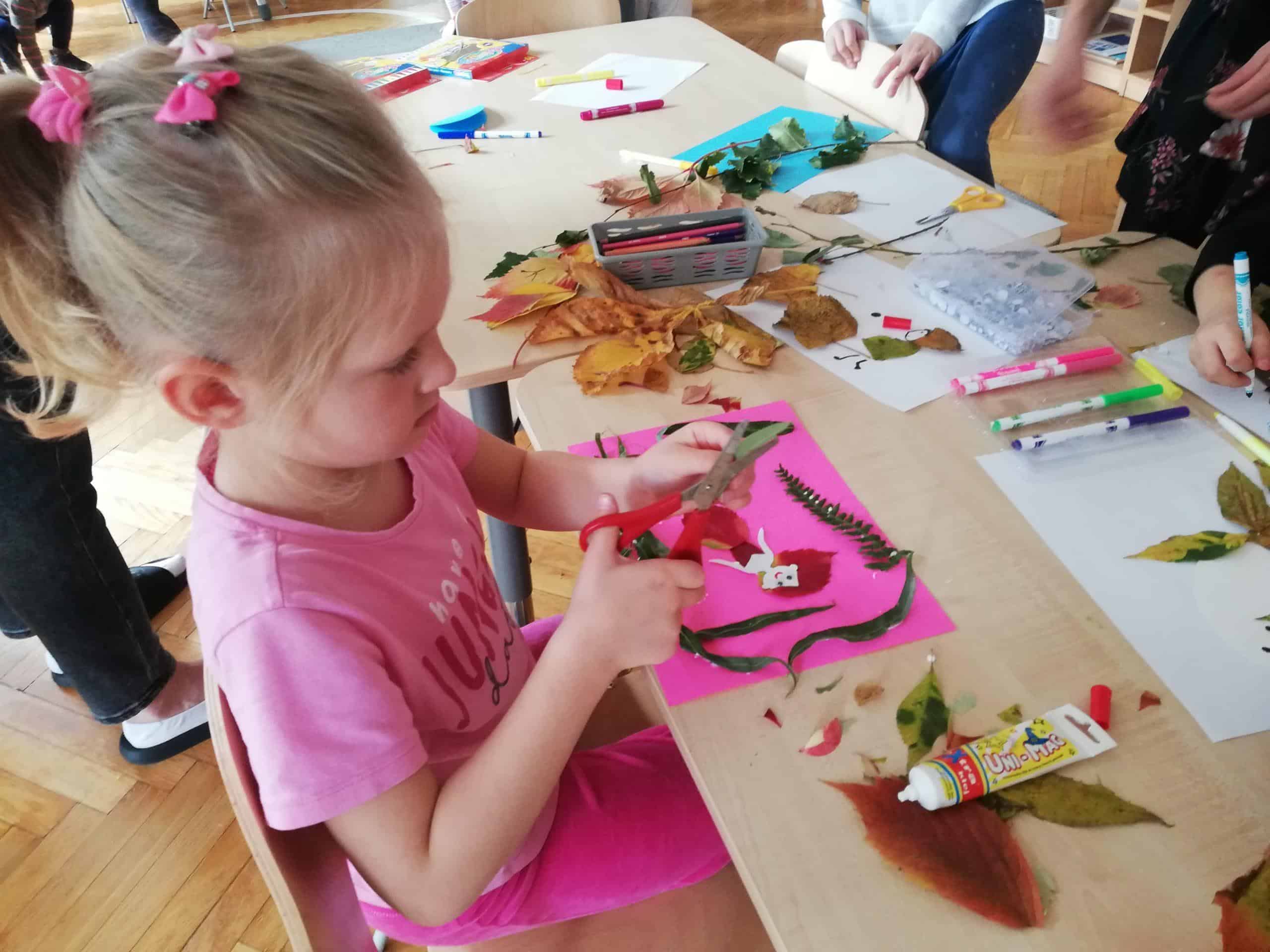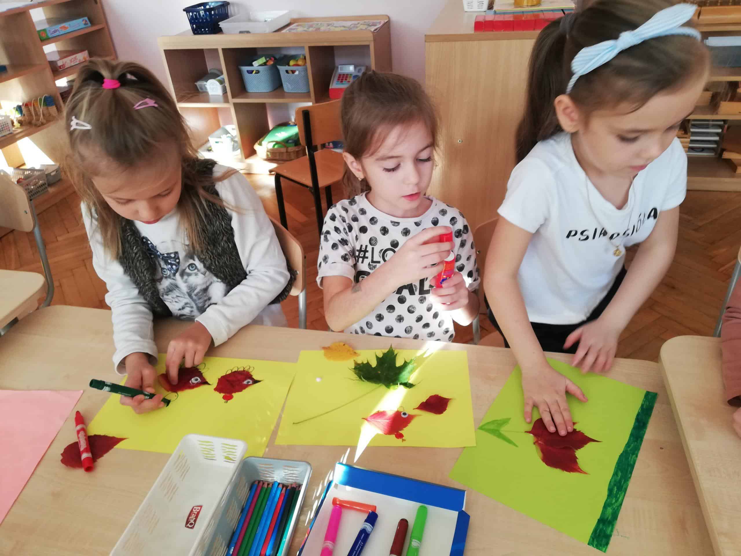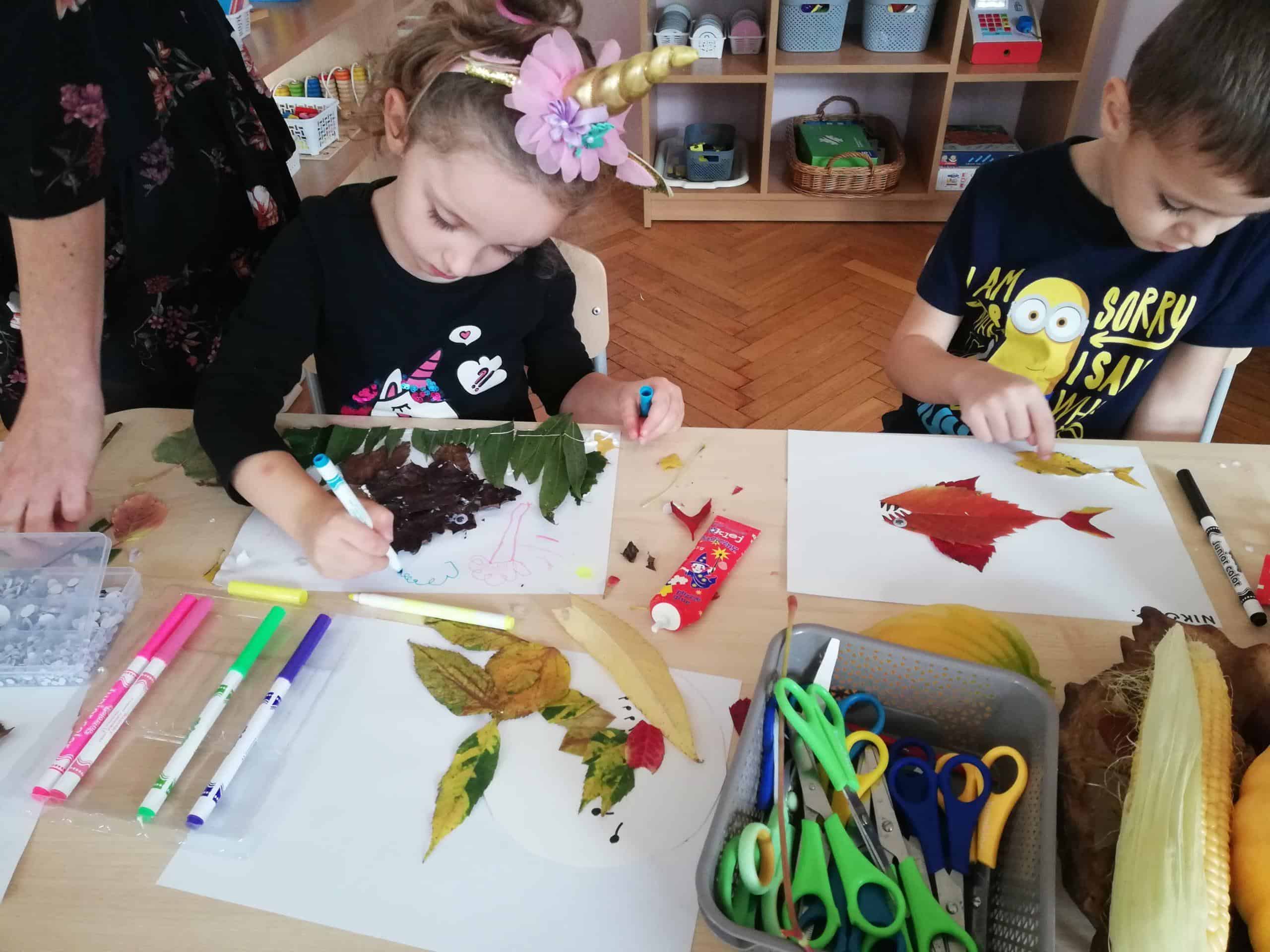 Dżemy te nie były słodzone cukrem, tylko naturalnym miodem. Były zatem przepyszne i bardzo zdrowe. Pani Madzia zaprosiła wszystkich do degustacji. Przyniosła z domu świeżutko upieczone gofry, które w sali tylko podpiekła, żeby były ciepłe. Dzieci podchodziły do stolika i niczym w budce z goframi zamawiały gofra z wybranym dżemem. Asystentką Pani Madzia była Ninka, która smarowała gofry dżemem. Wszyscy z ogromnym apetytem zajadali się tymi pysznościami. Niektórzy nawet ustawiali się w kolejce po repetę. Gdy brzuszki były pełne mamusia Ninki zaproponowała aktywność plastyczno-techniczną z wykorzystaniem pięknych, różnorodnych jesiennych liści. Przygotowaliśmy stanowisko pracy i przystąpiliśmy do działania. Powstały piękne i twórcze prace, które możemy podziwiać na naszej grupowej gazetce w holu.