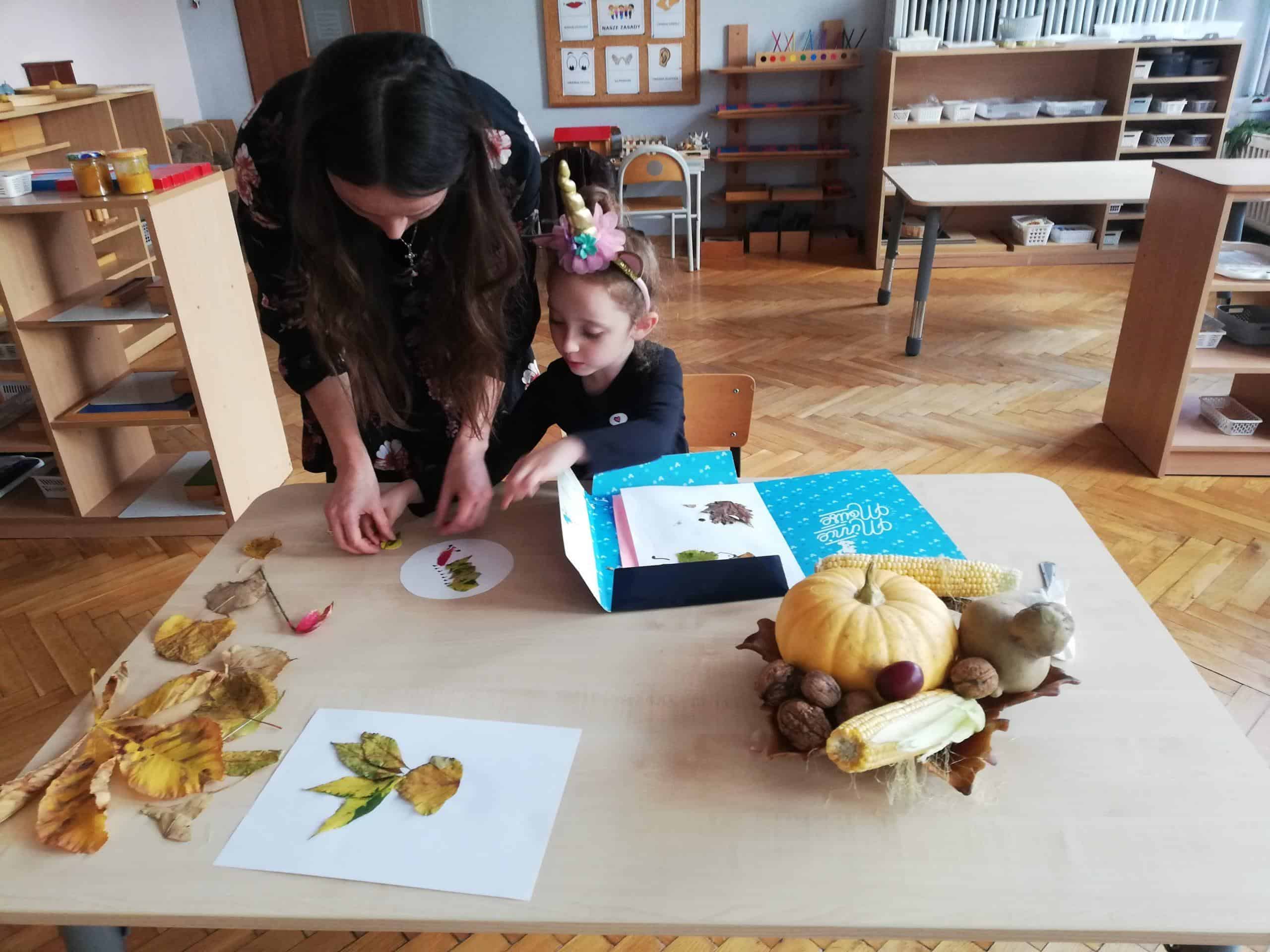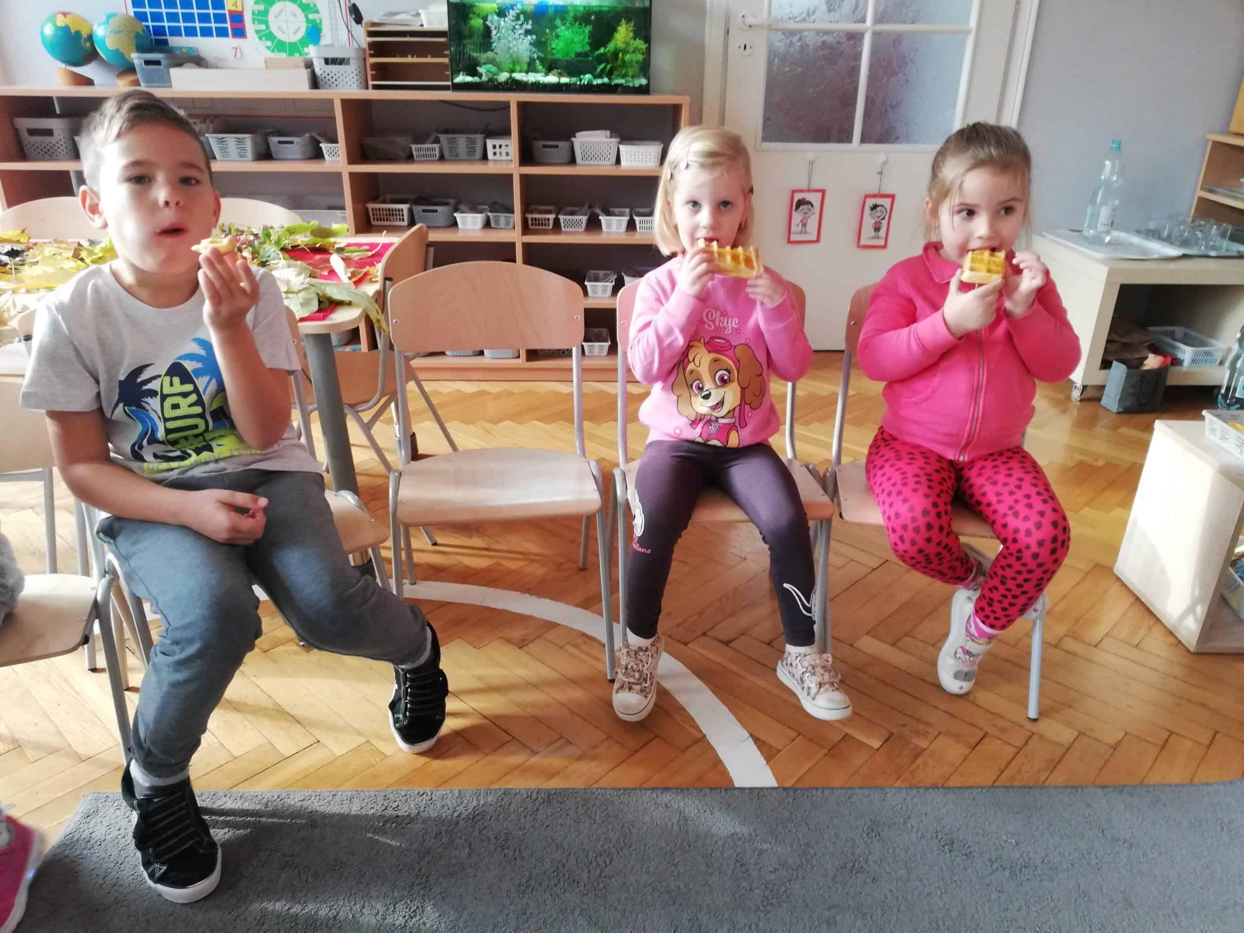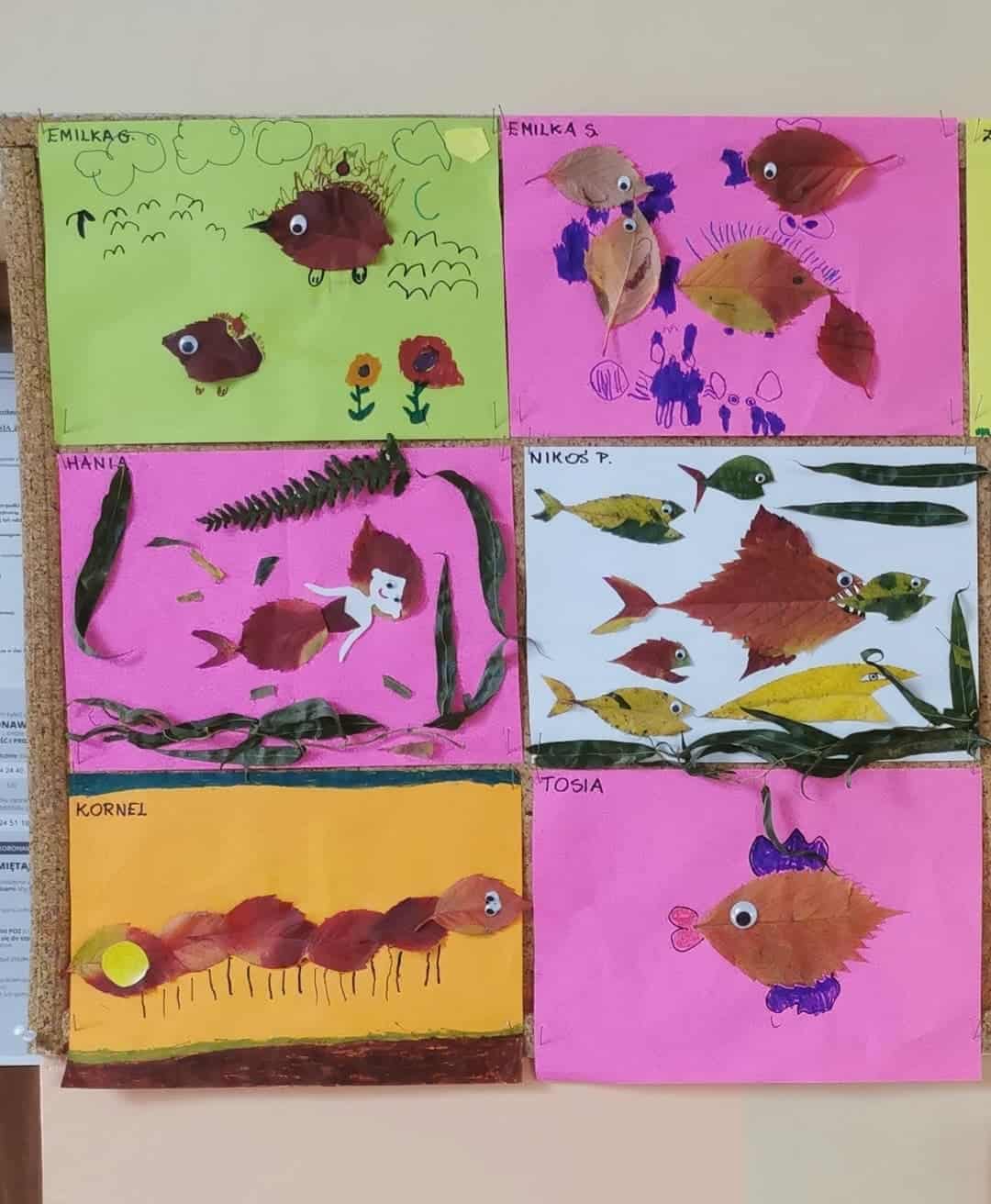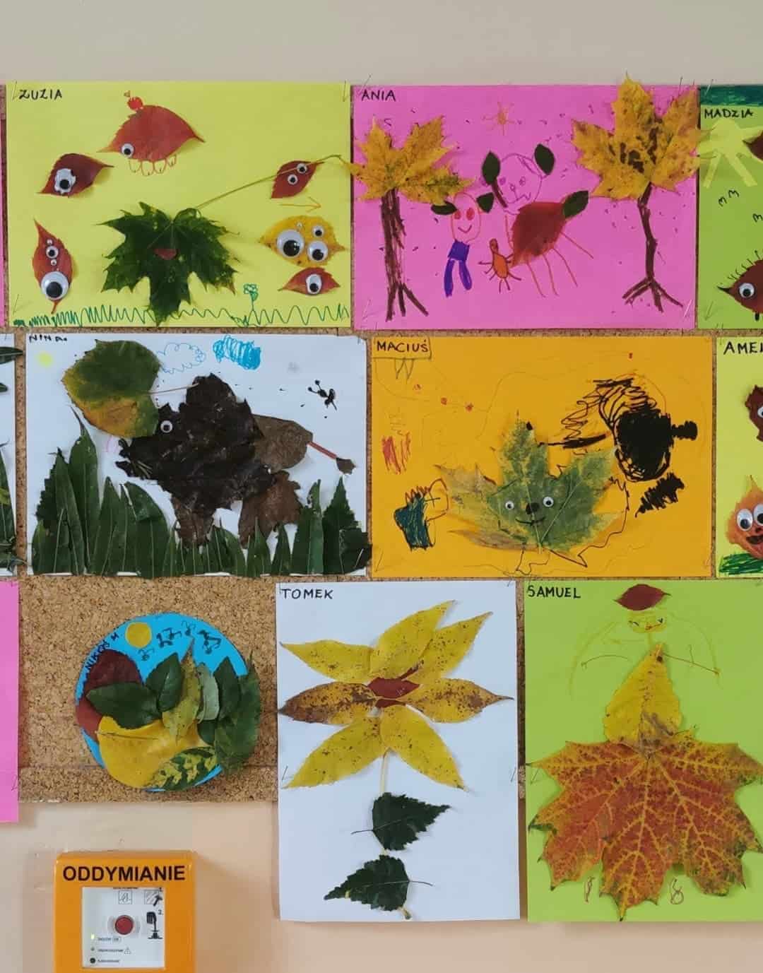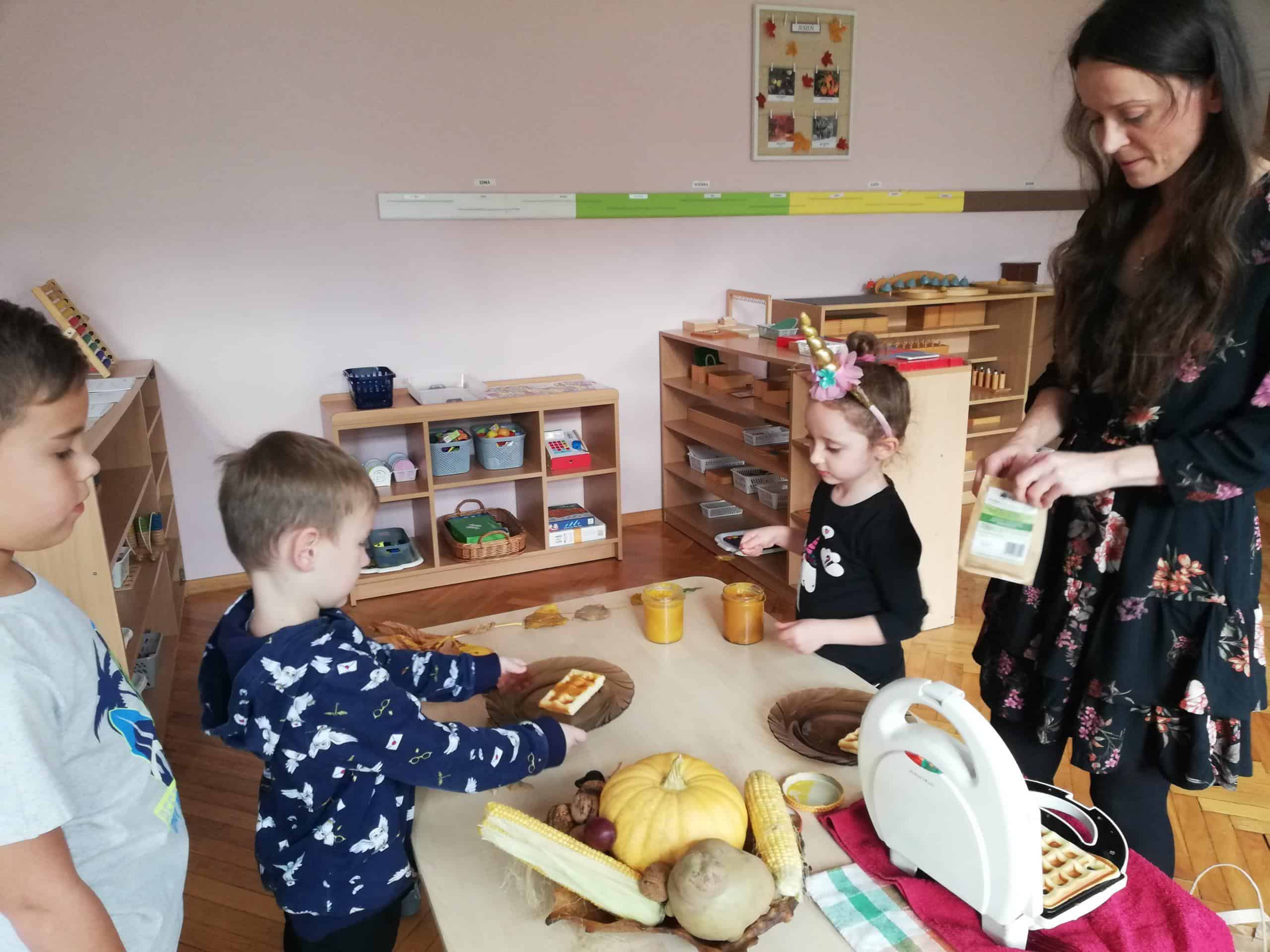 Dżemy te nie były słodzone cukrem, tylko naturalnym miodem. Były zatem przepyszne i bardzo zdrowe. Pani Madzia zaprosiła wszystkich do degustacji. Przyniosła z domu świeżutko upieczone gofry, które w sali tylko podpiekła, żeby były ciepłe. Dzieci podchodziły do stolika i niczym w budce z goframi zamawiały gofra z wybranym dżemem. Asystentką Pani Madzia była Ninka, która smarowała gofry dżemem. Wszyscy z ogromnym apetytem zajadali się tymi pysznościami. Niektórzy nawet ustawiali się w kolejce po repetę. Gdy brzuszki były pełne mamusia Ninki zaproponowała aktywność plastyczno-techniczną z wykorzystaniem pięknych, różnorodnych jesiennych liści. Przygotowaliśmy stanowisko pracy i przystąpiliśmy do działania. Powstały piękne i twórcze prace, które możemy podziwiać na naszej grupowej gazetce w holu.