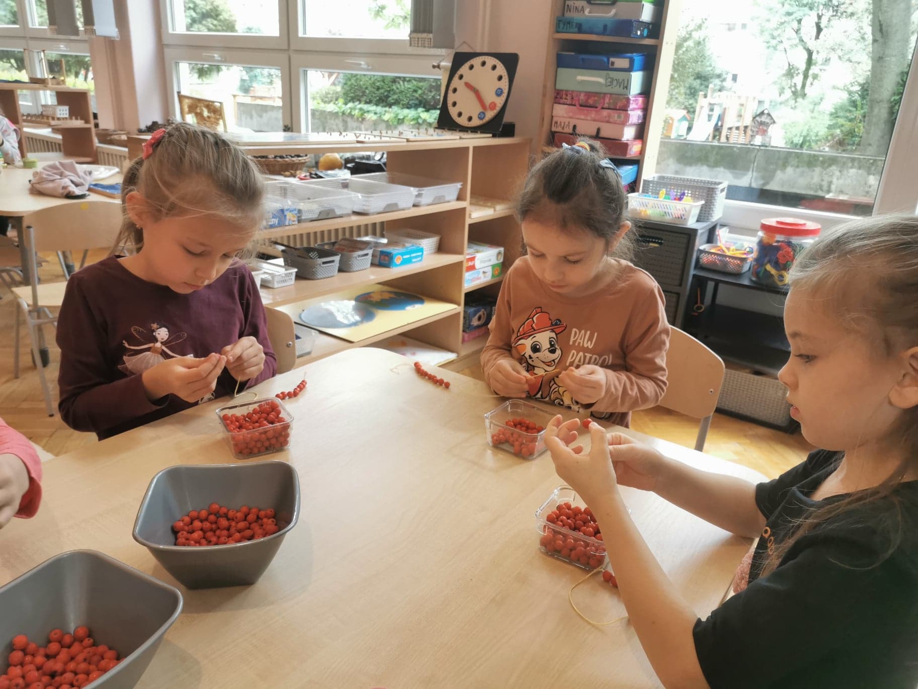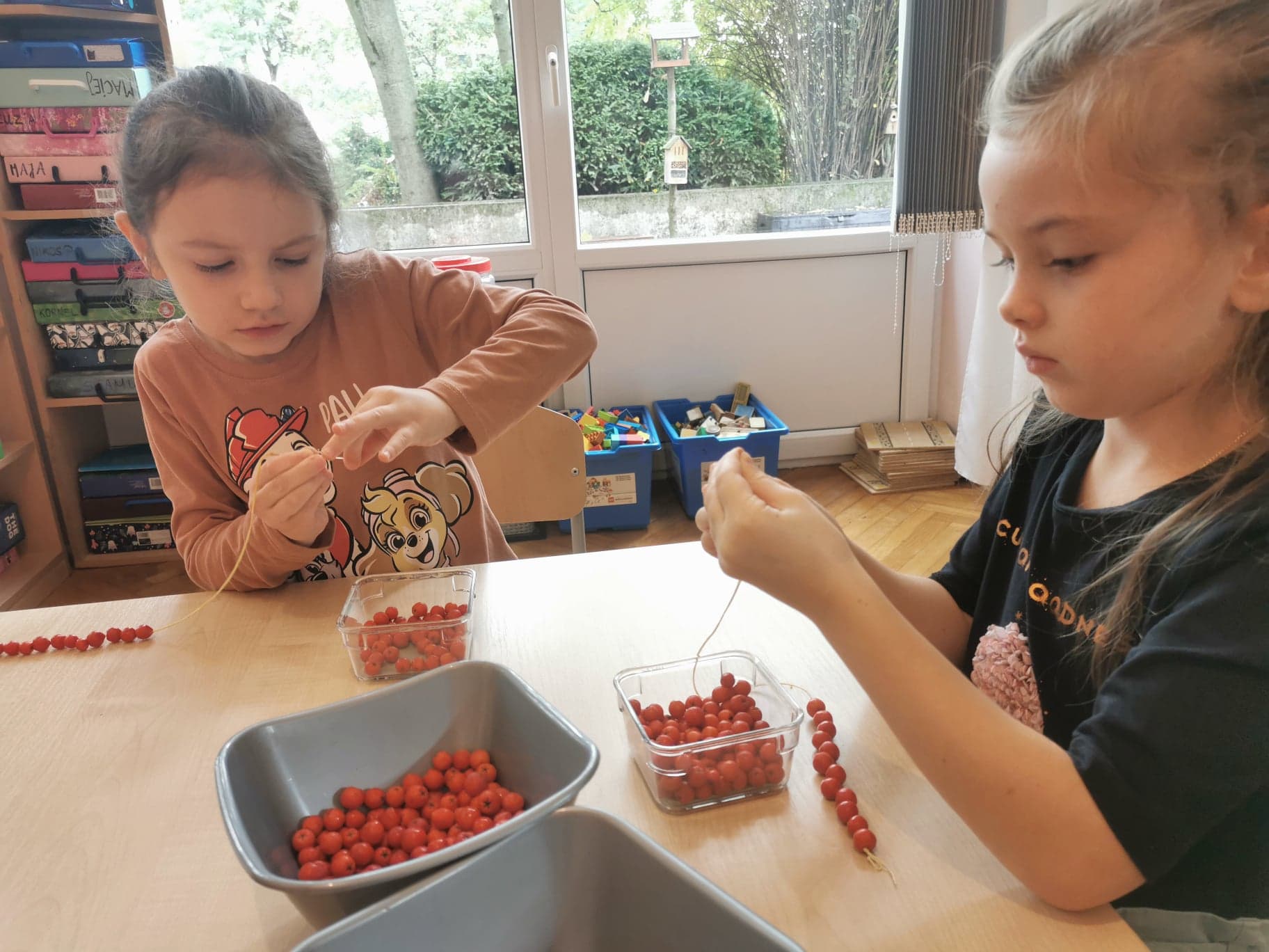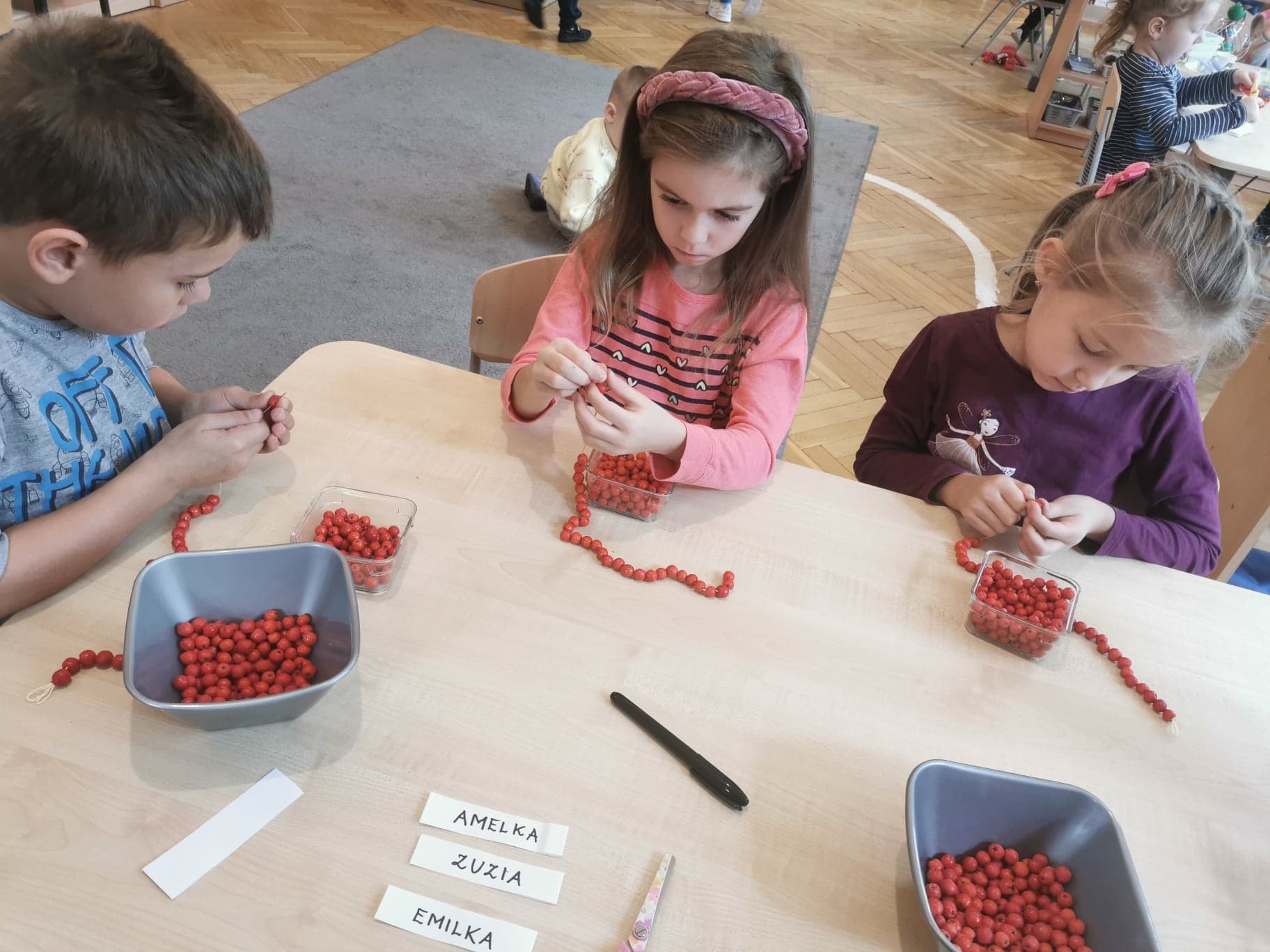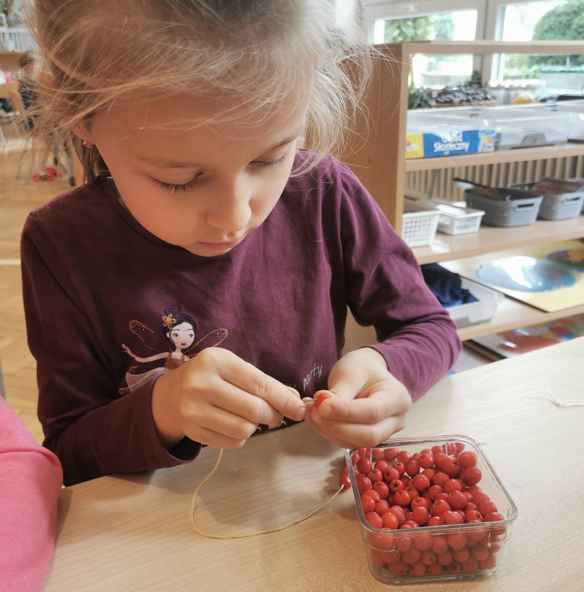 Gdy wyglądamy przez okna naszej sali, uśmiecha się do nas czerwona jarzębina 🙂 Postanowiłam wykorzystać jej piękne korale. Pan Zbyszek zerwał nam kilka gałązek. Przedszkolaki dokładnie obserwowały liście i owoce jarzębiny. Następnie oberwały czerwone kuleczki, z których 6 latki miały nawlekać korale.