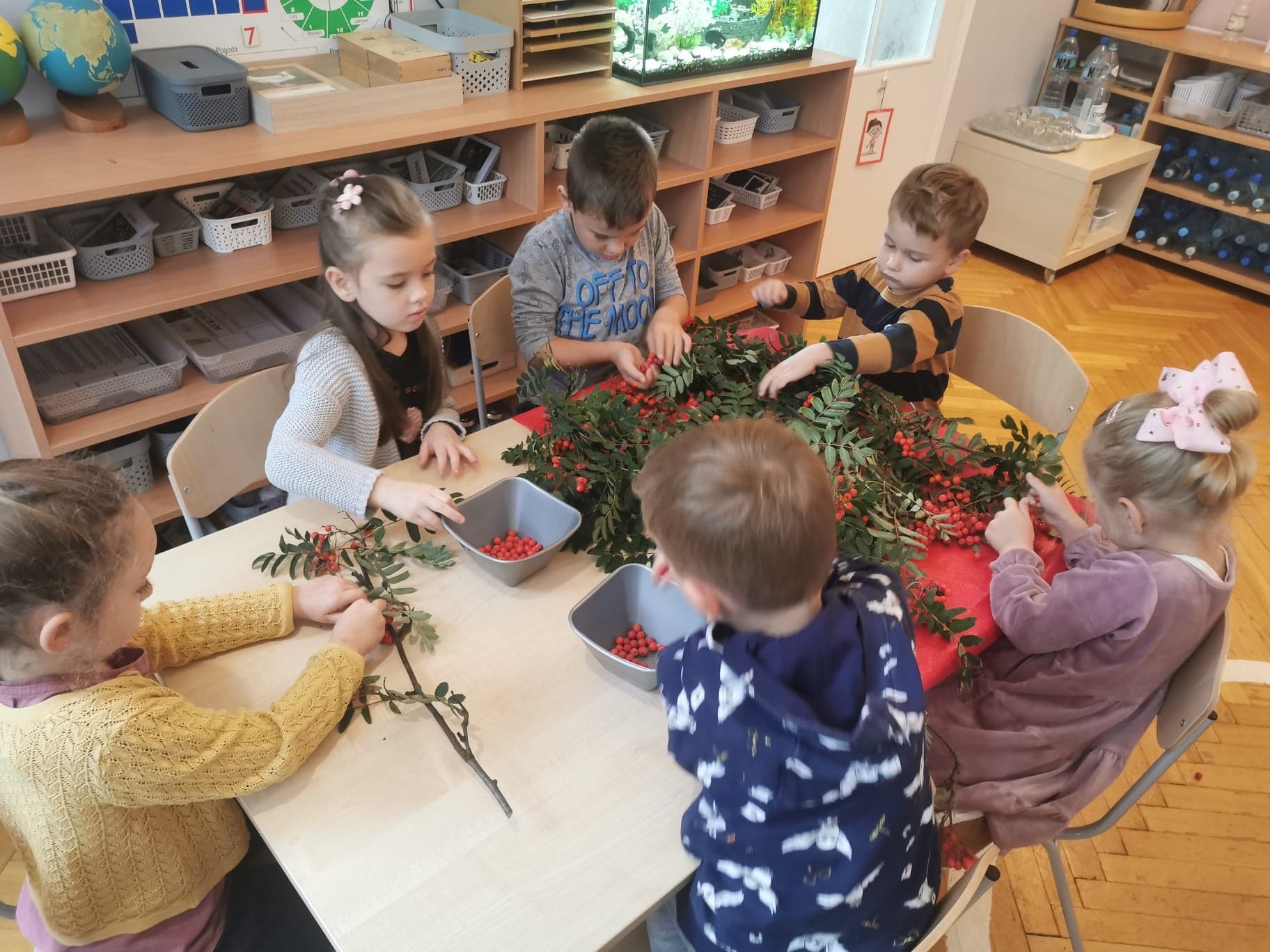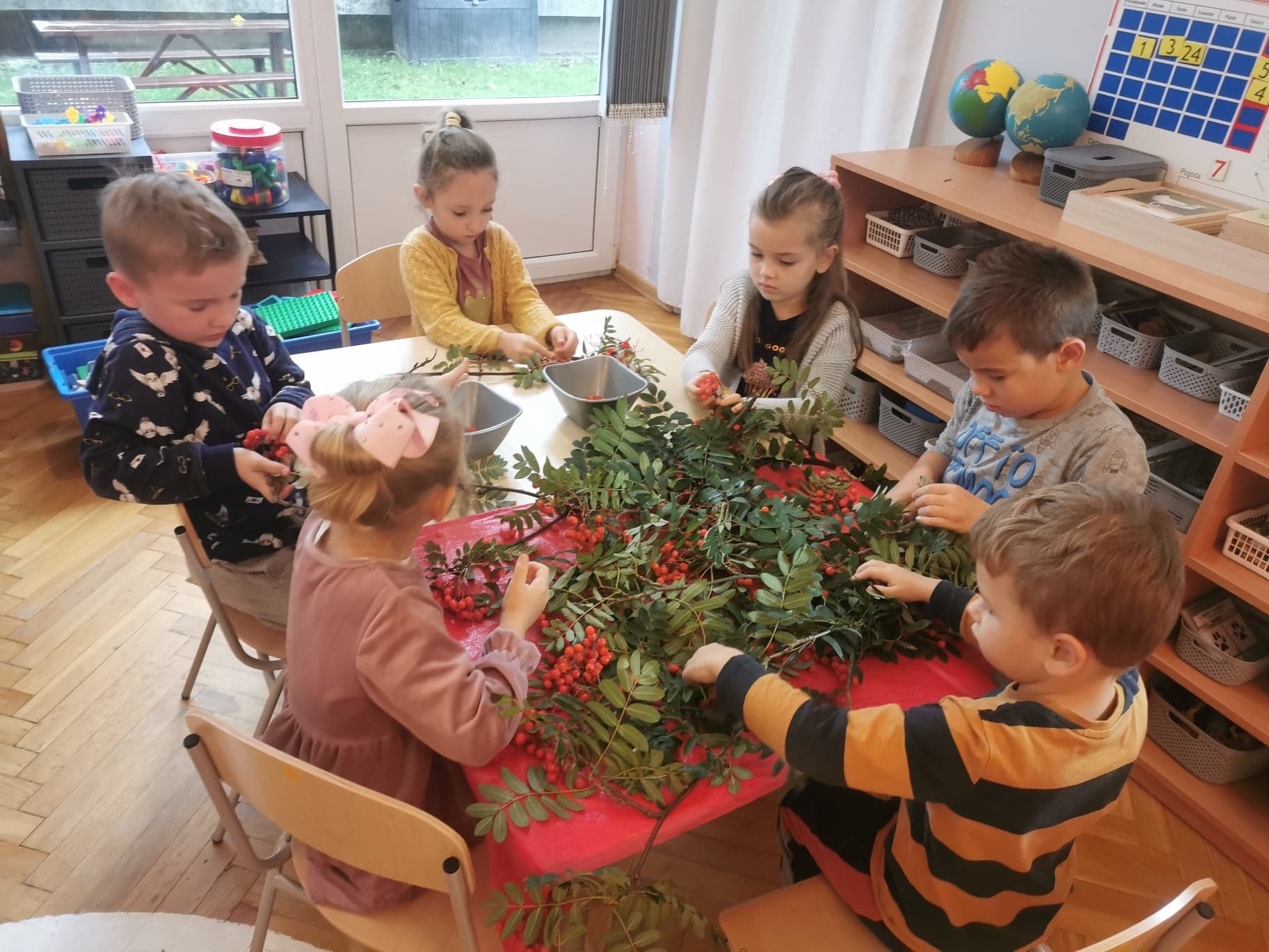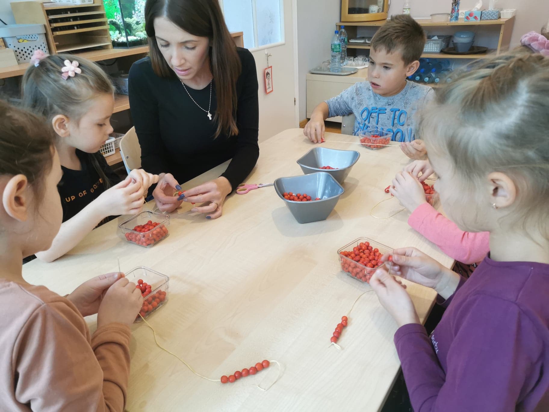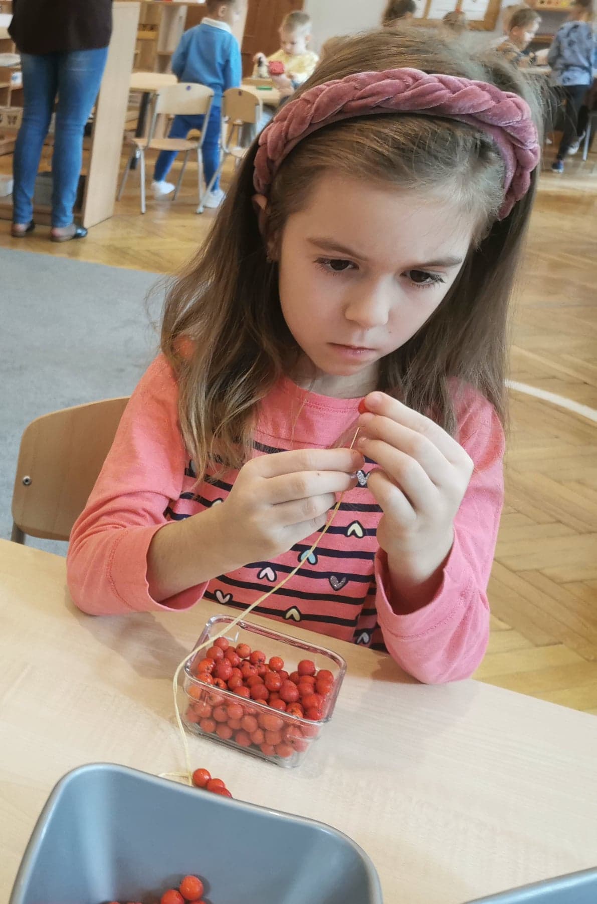 Gdy wyglądamy przez okna naszej sali, uśmiecha się do nas czerwona jarzębina 🙂 Postanowiłam wykorzystać jej piękne korale. Pan Zbyszek zerwał nam kilka gałązek. Przedszkolaki dokładnie obserwowały liście i owoce jarzębiny. Następnie oberwały czerwone kuleczki, z których 6 latki miały nawlekać korale.