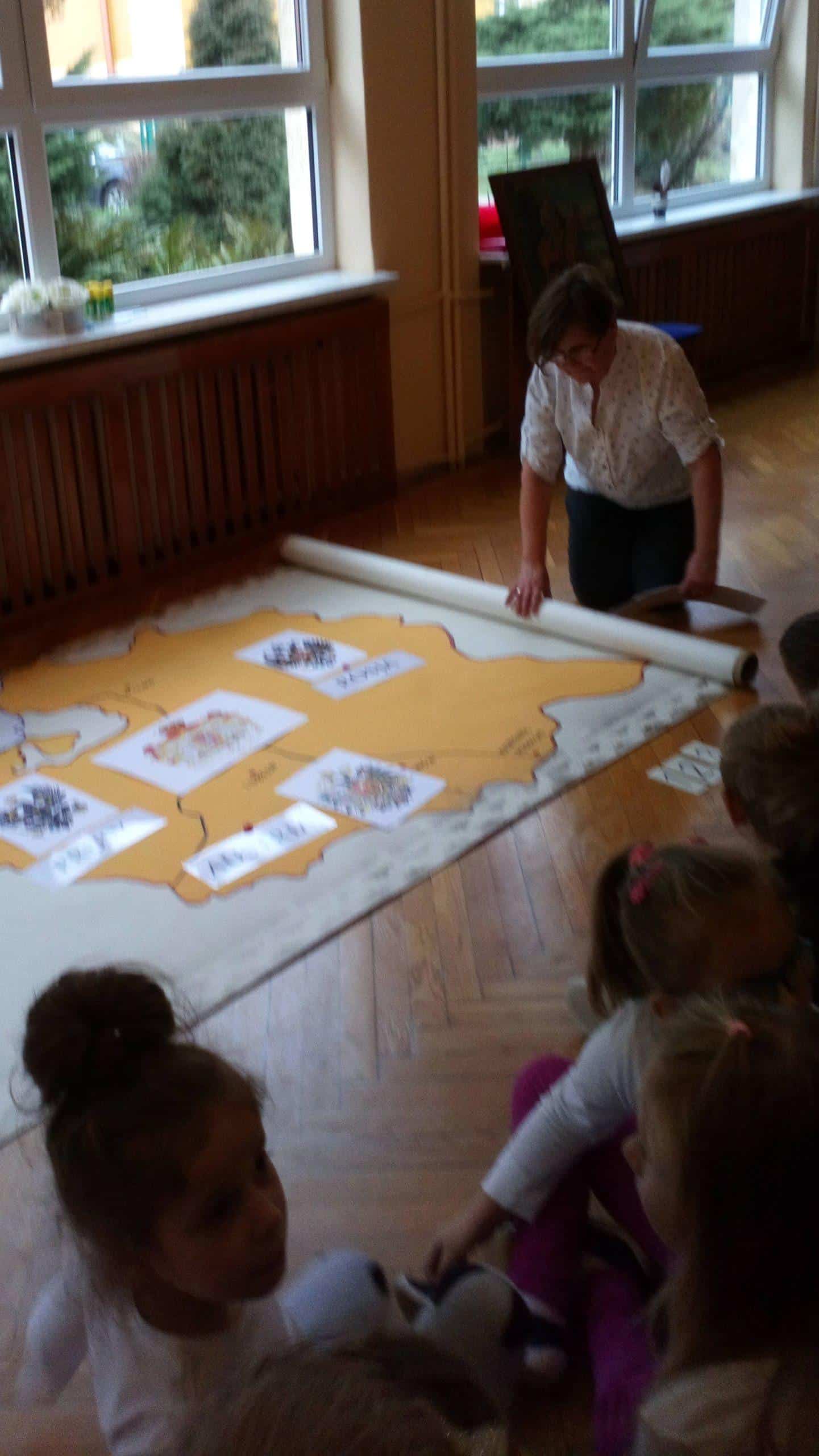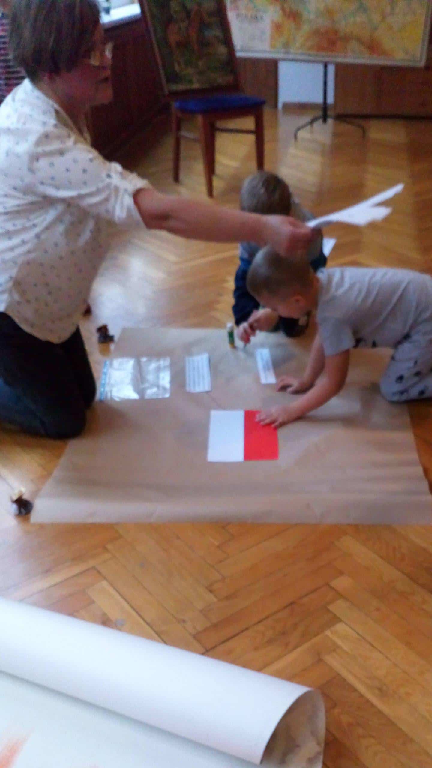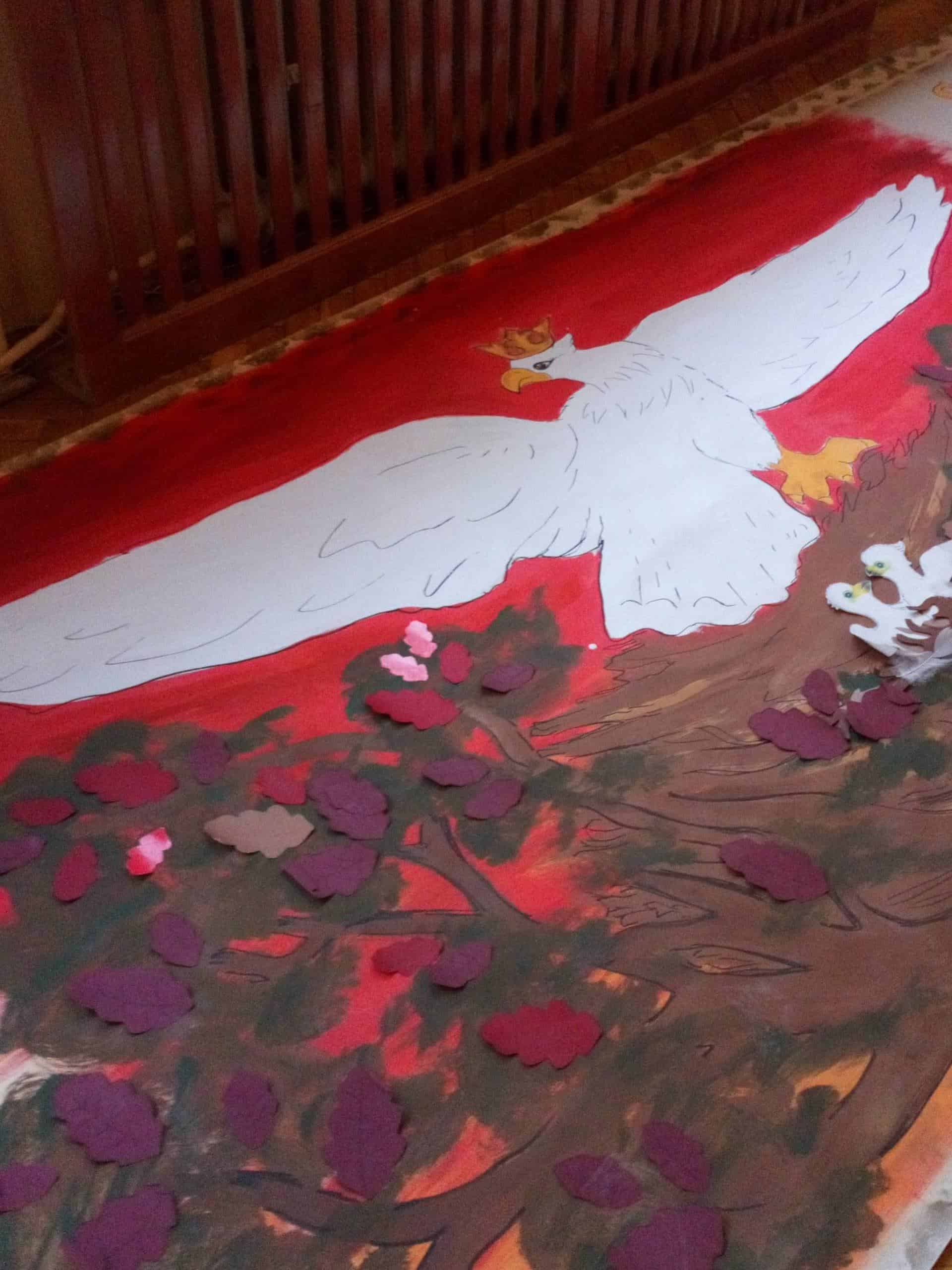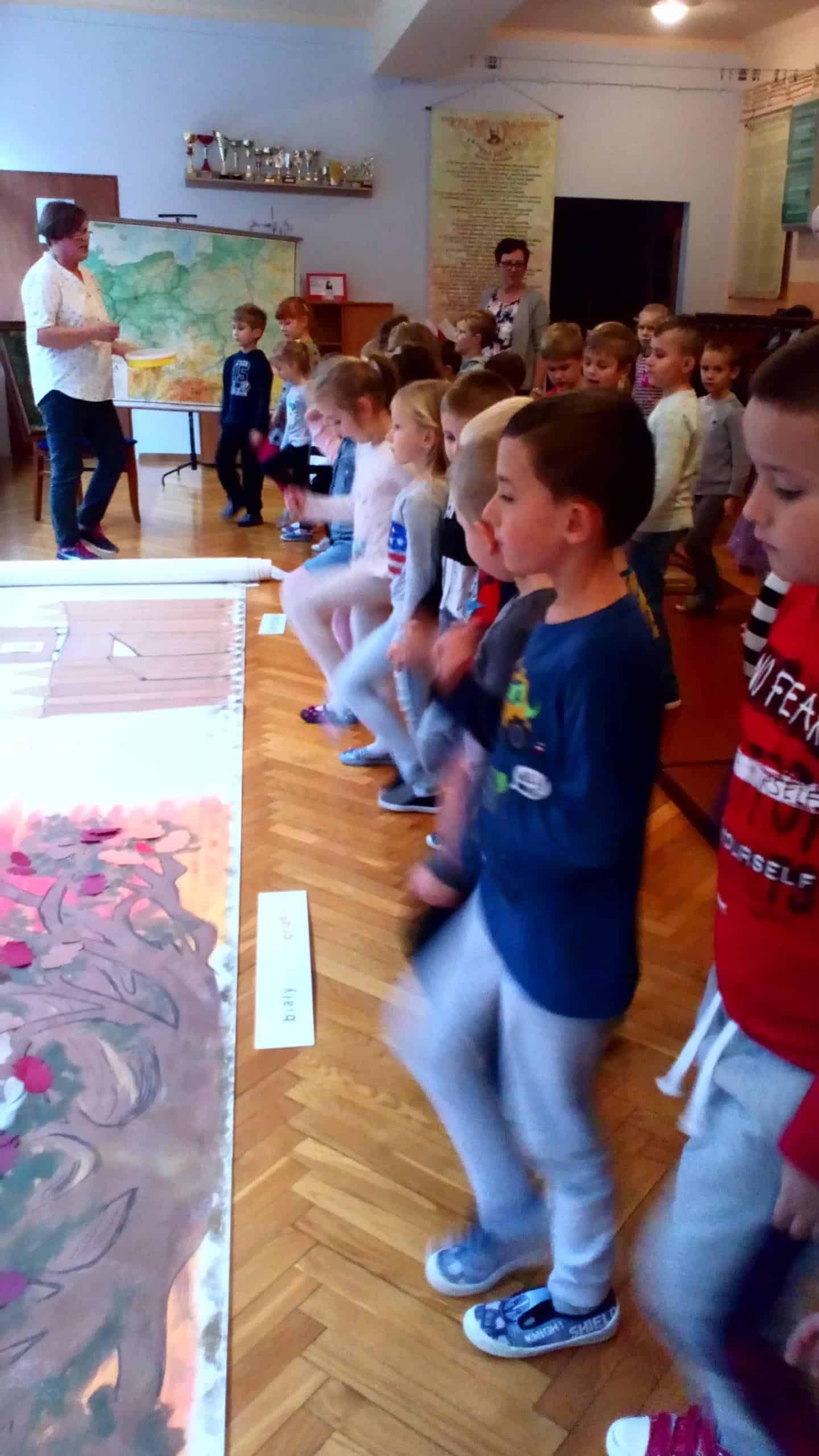 15 listopada, w ramach projektu edukacyjnego „Piękna nasza Polska cała”, dzieci z naszego przedszkola miały niezwykłą przyjemność, po raz kolejny, przeżyć wydarzenia związane z setną rocznica odzyskania przez Polskę nieodległości. Gościem, dzięki któremu mogliśmy jeszcze raz przenieść się w odległe zakamarki historii naszego kraju była Pani Krystyna Szczygło, nauczycielka historii w szkole podstawowej, która odwiedziła nasze przedszkole, aby podzielić się z nami swoją wiedzą i w obrazowy sposób przedstawić nam dzieje państwa polskiego. Wstępem do naszej lekcji warsztatowej była podróż pociągiem po Polsce. Pociąg utworzyły same dzieci, które poruszając się jeden za drugim „odwiedzały” najważniejsze miasta naszego kraju. Gdy pociąg dotarł już na stację końcową, przenieśliśmy się w zamierzchłe czasy, aby jeszcze raz posłuchać barwnie ukazanej legendy o powstaniu państwa polskiego. Pani Krystyna, w bardzo twórczy i ekspresywny sposób, przekazywała dzieciom wiedzę zapraszając je do wspólnej pracy. Nie zabrakło także informacji o symbolach narodowych – szacunku do nich i godnym traktowaniu. Dzieci tworzyły wspólnie mapę mentalną odnoszącą się do zagadnień związanych z flagą Polski. Maszerowaliśmy do znanych utworów patriotycznych a uwieńczeniem naszych warsztatów była przestrzenna praca plastyczna – orzeł biały wykonany z papierowych rolek oraz odrysów własnych dłoni. Na sam koniec, Pani Krystyna, podarowała wszystkim ręcznie robione liście dębu z symbolicznym napisem „100 lat Niepodległej”.