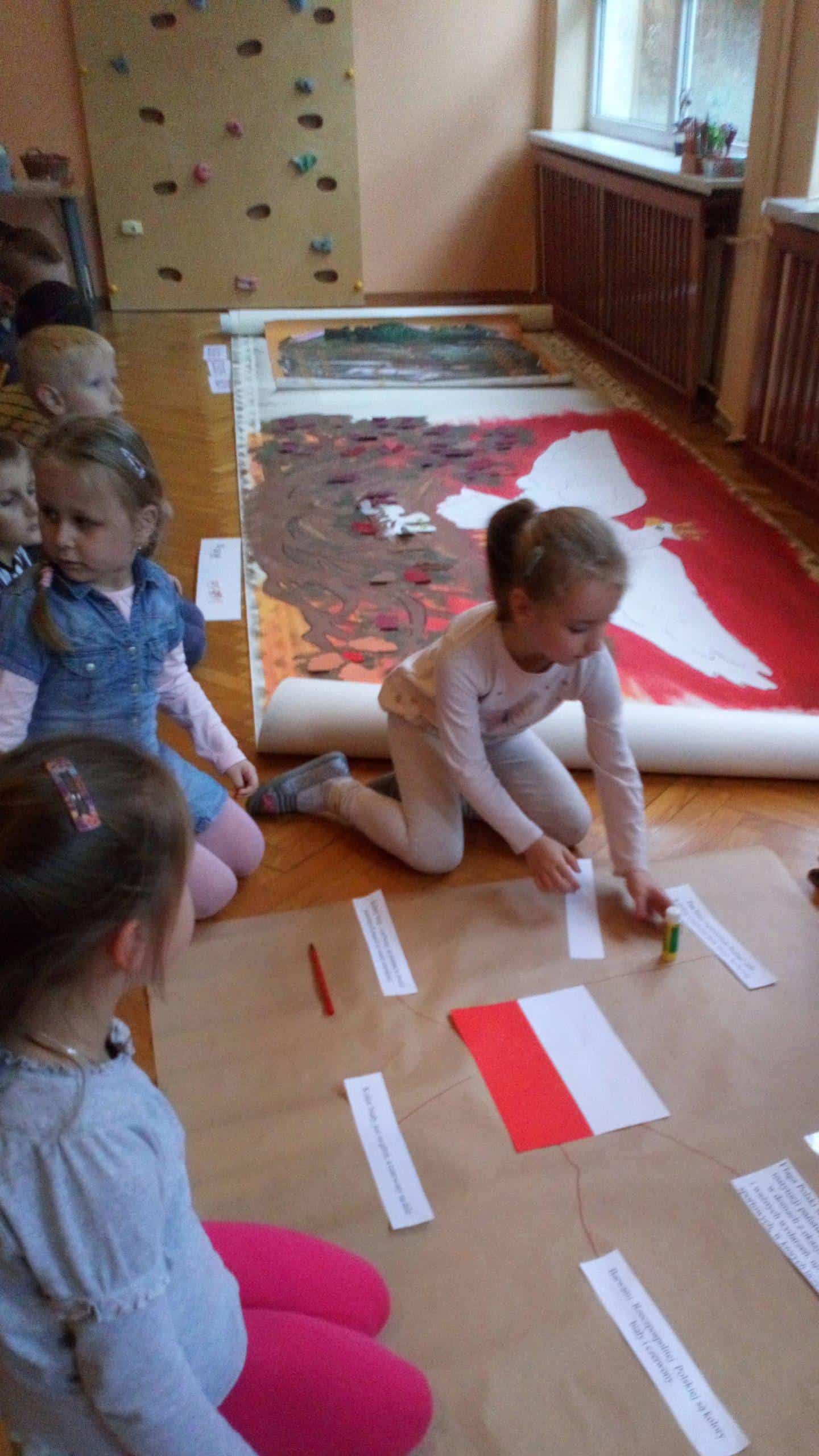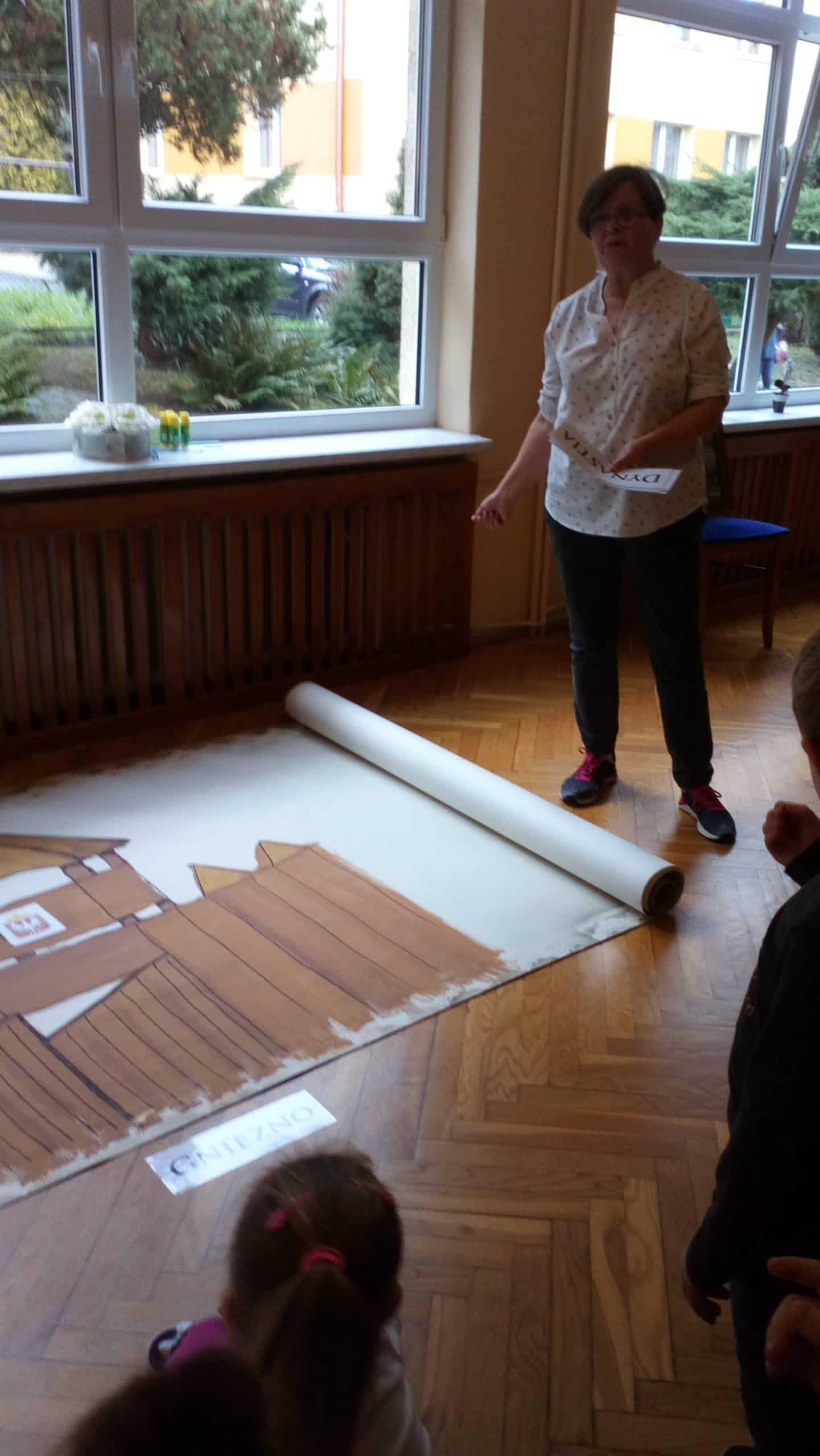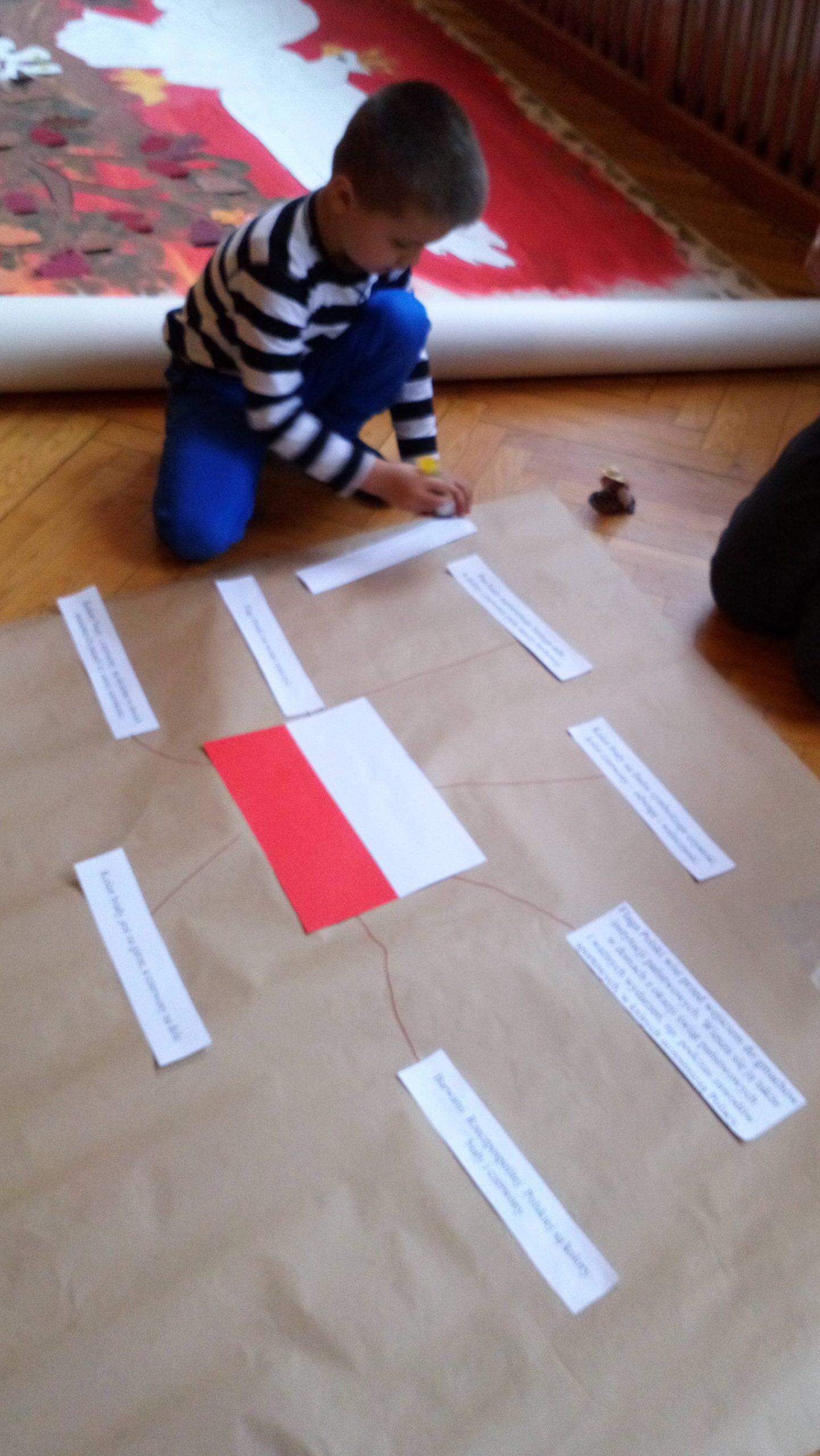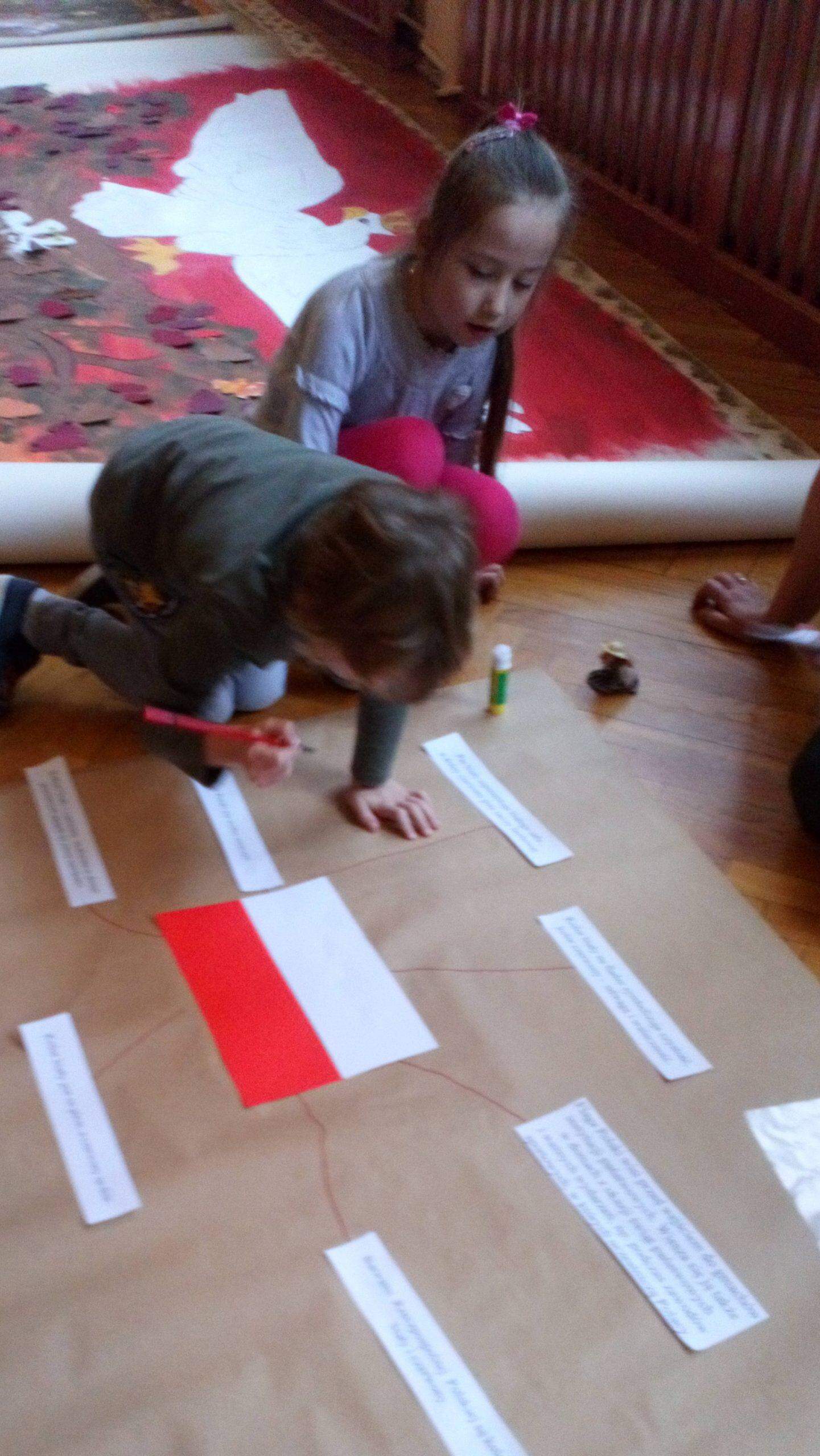 15 listopada, w ramach projektu edukacyjnego „Piękna nasza Polska cała”, dzieci z naszego przedszkola miały niezwykłą przyjemność, po raz kolejny, przeżyć wydarzenia związane z setną rocznica odzyskania przez Polskę nieodległości. Gościem, dzięki któremu mogliśmy jeszcze raz przenieść się w odległe zakamarki historii naszego kraju była Pani Krystyna Szczygło, nauczycielka historii w szkole podstawowej, która odwiedziła nasze przedszkole, aby podzielić się z nami swoją wiedzą i w obrazowy sposób przedstawić nam dzieje państwa polskiego. Wstępem do naszej lekcji warsztatowej była podróż pociągiem po Polsce. Pociąg utworzyły same dzieci, które poruszając się jeden za drugim „odwiedzały” najważniejsze miasta naszego kraju. Gdy pociąg dotarł już na stację końcową, przenieśliśmy się w zamierzchłe czasy, aby jeszcze raz posłuchać barwnie ukazanej legendy o powstaniu państwa polskiego. Pani Krystyna, w bardzo twórczy i ekspresywny sposób, przekazywała dzieciom wiedzę zapraszając je do wspólnej pracy. Nie zabrakło także informacji o symbolach narodowych – szacunku do nich i godnym traktowaniu. Dzieci tworzyły wspólnie mapę mentalną odnoszącą się do zagadnień związanych z flagą Polski. Maszerowaliśmy do znanych utworów patriotycznych a uwieńczeniem naszych warsztatów była przestrzenna praca plastyczna – orzeł biały wykonany z papierowych rolek oraz odrysów własnych dłoni. Na sam koniec, Pani Krystyna, podarowała wszystkim ręcznie robione liście dębu z symbolicznym napisem „100 lat Niepodległej”.